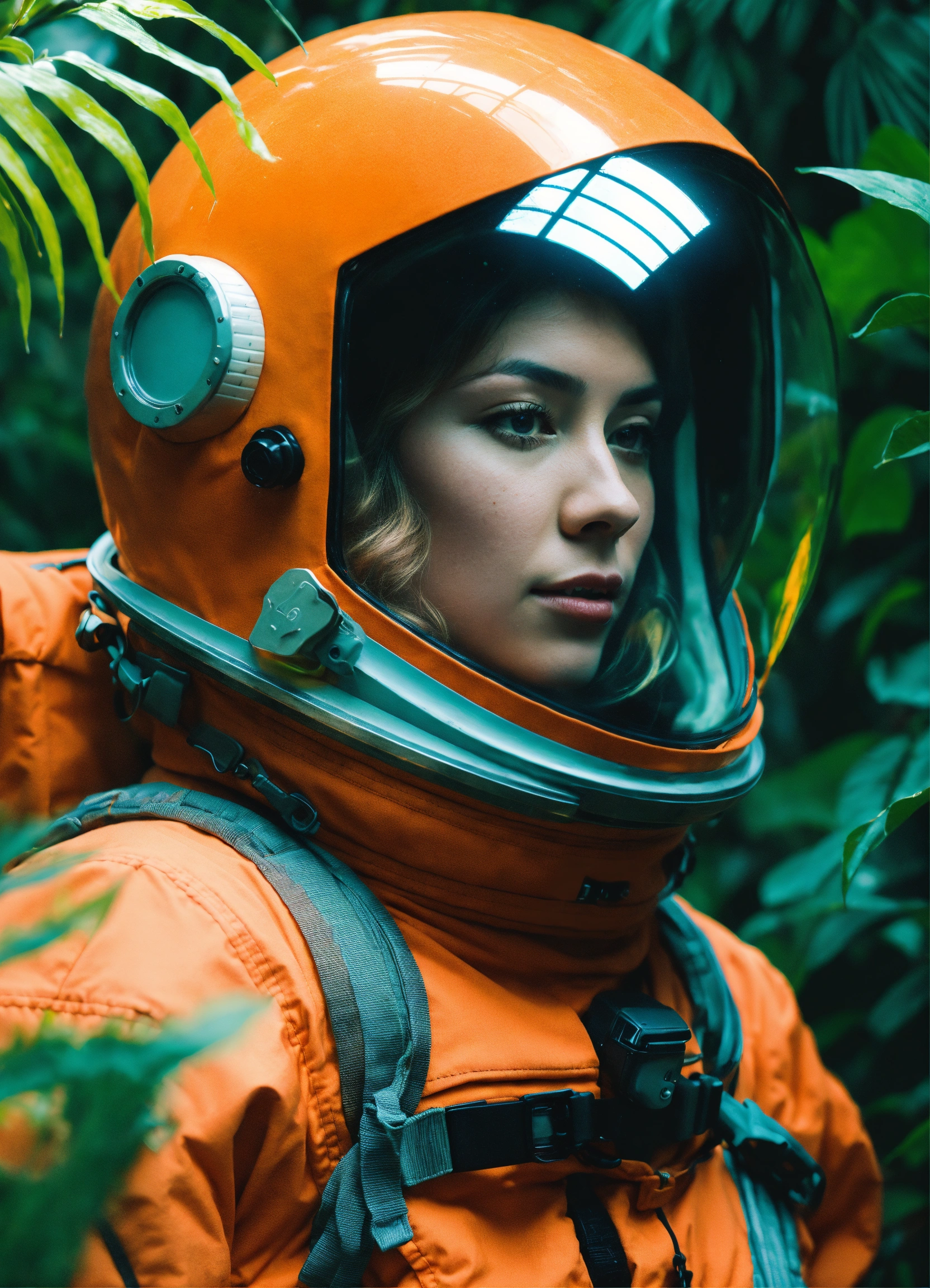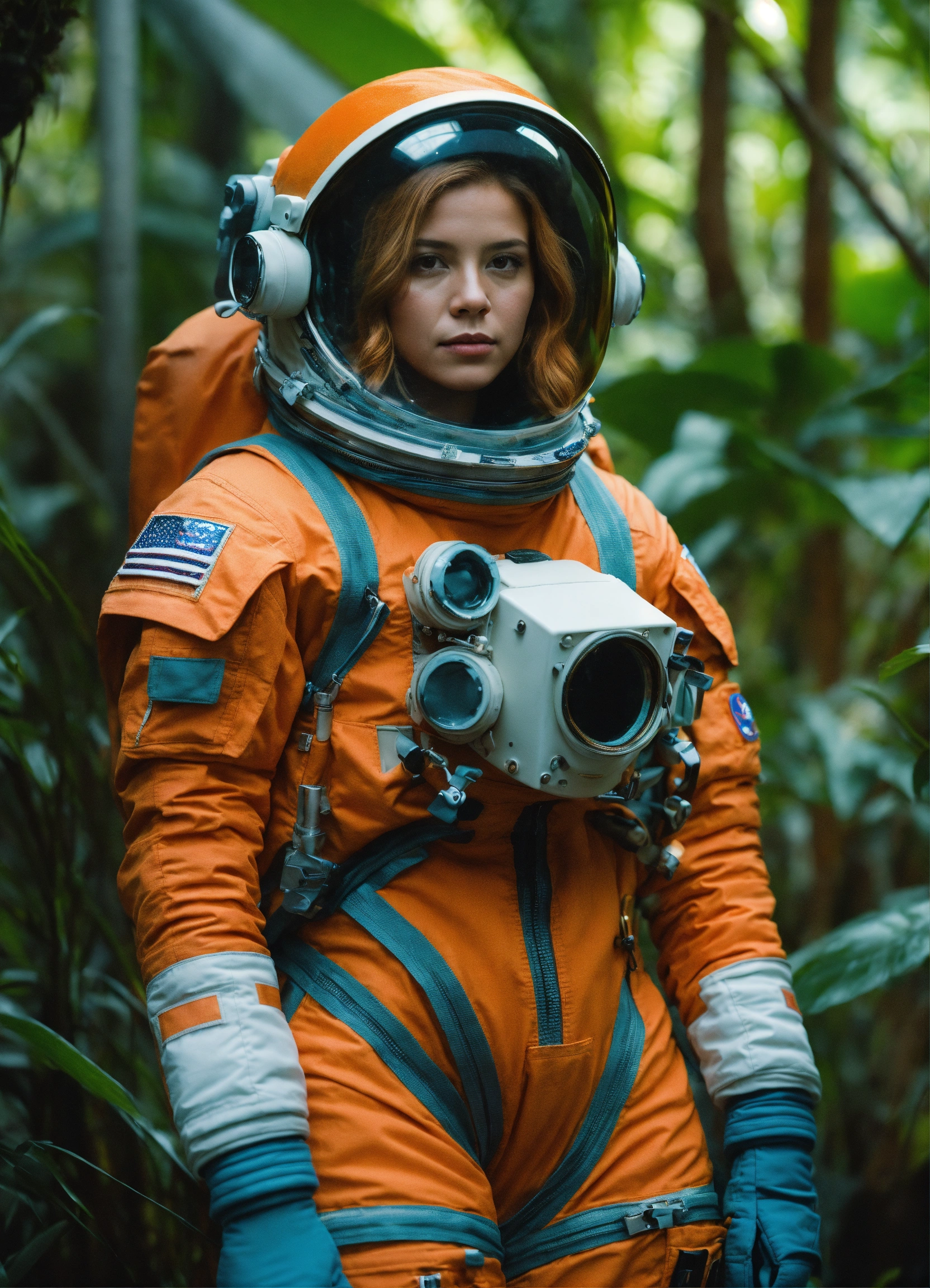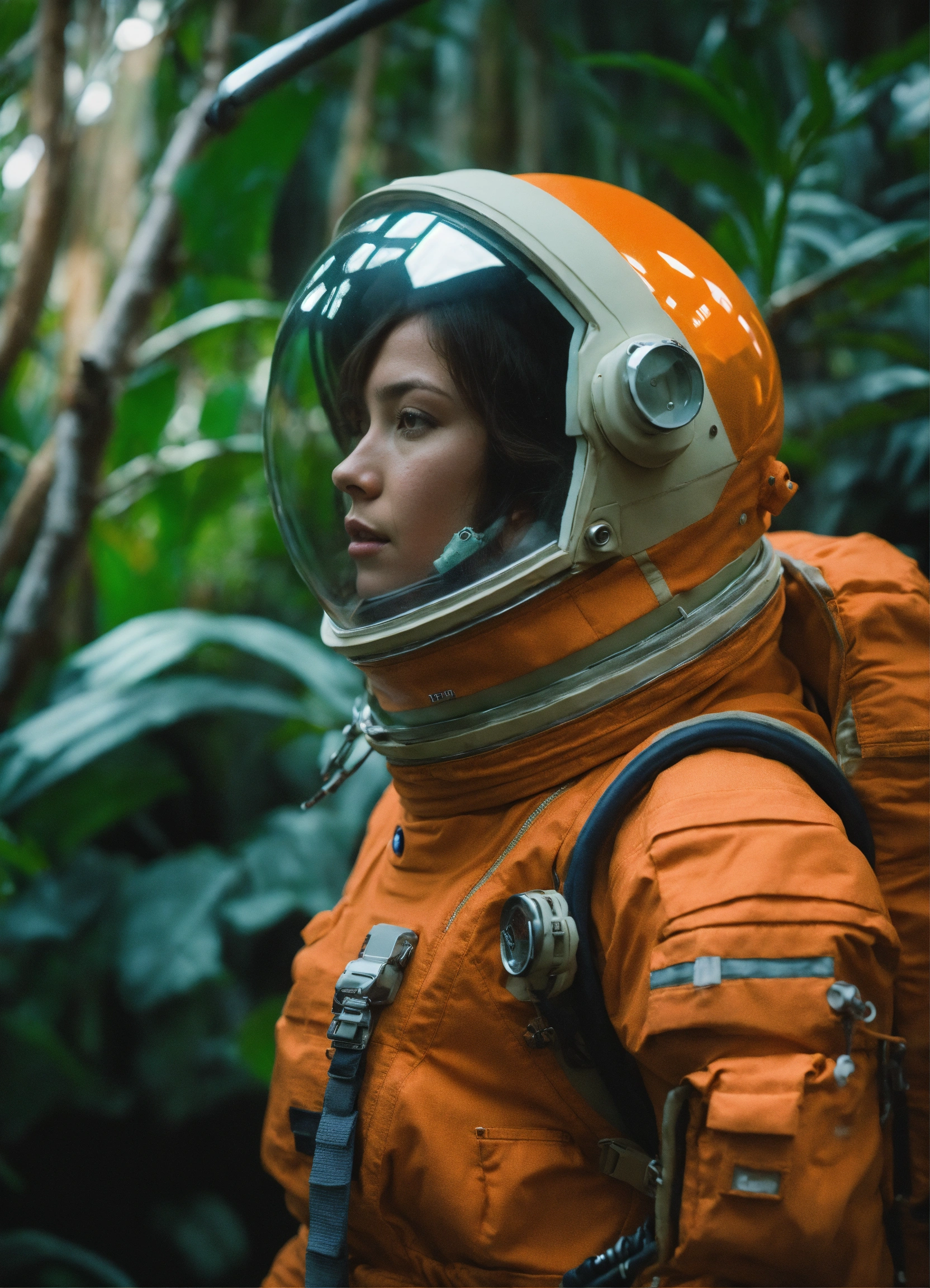 Medium-full shot, muted photo portrait titled "lone female astronaut in a jungle", tangerine sci-fi space suit, muted palette, detailed, 8k, reflections