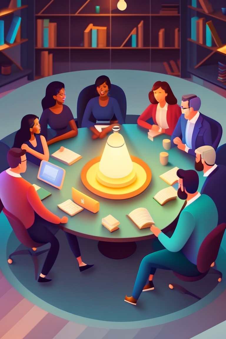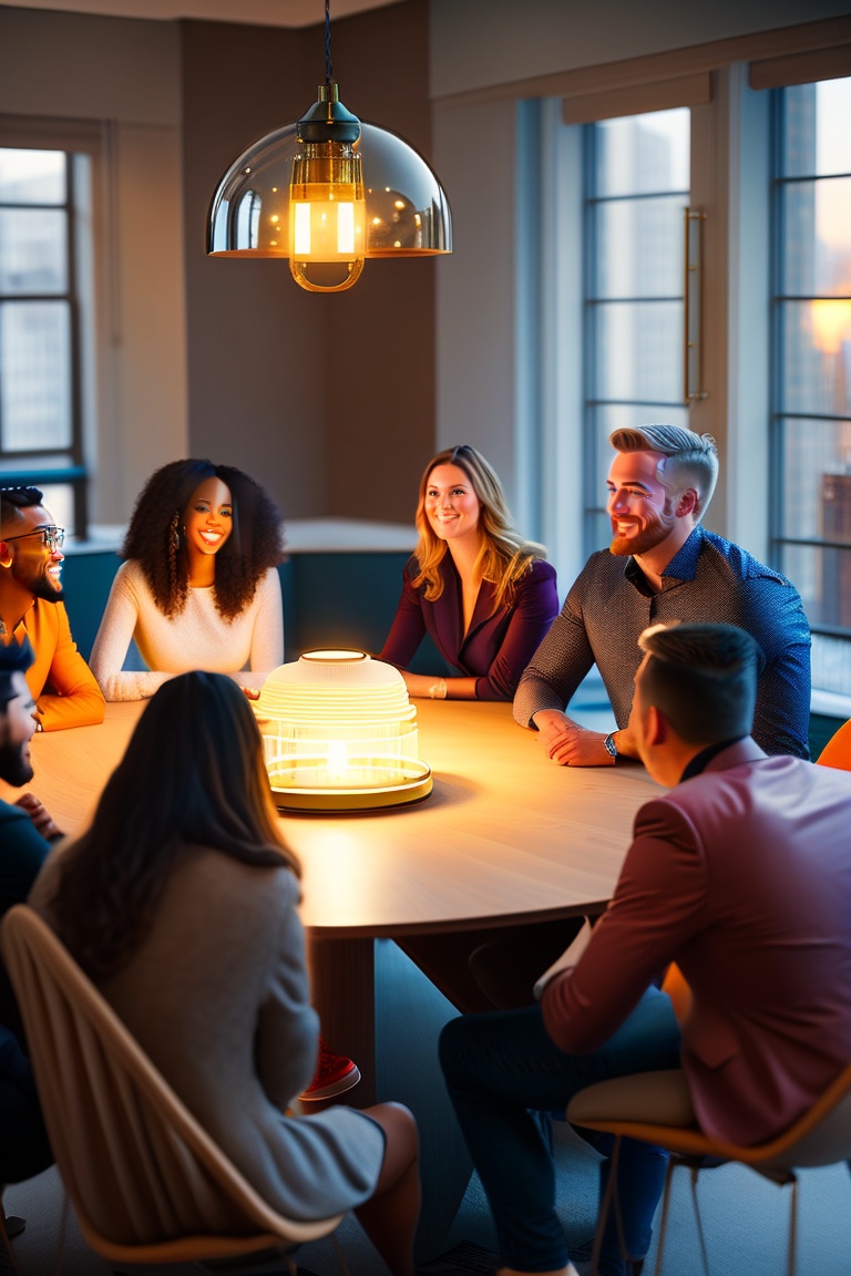 A diverse group of people gathered around a large table in a brightly lit room, their faces illuminated by the light of their ideas.