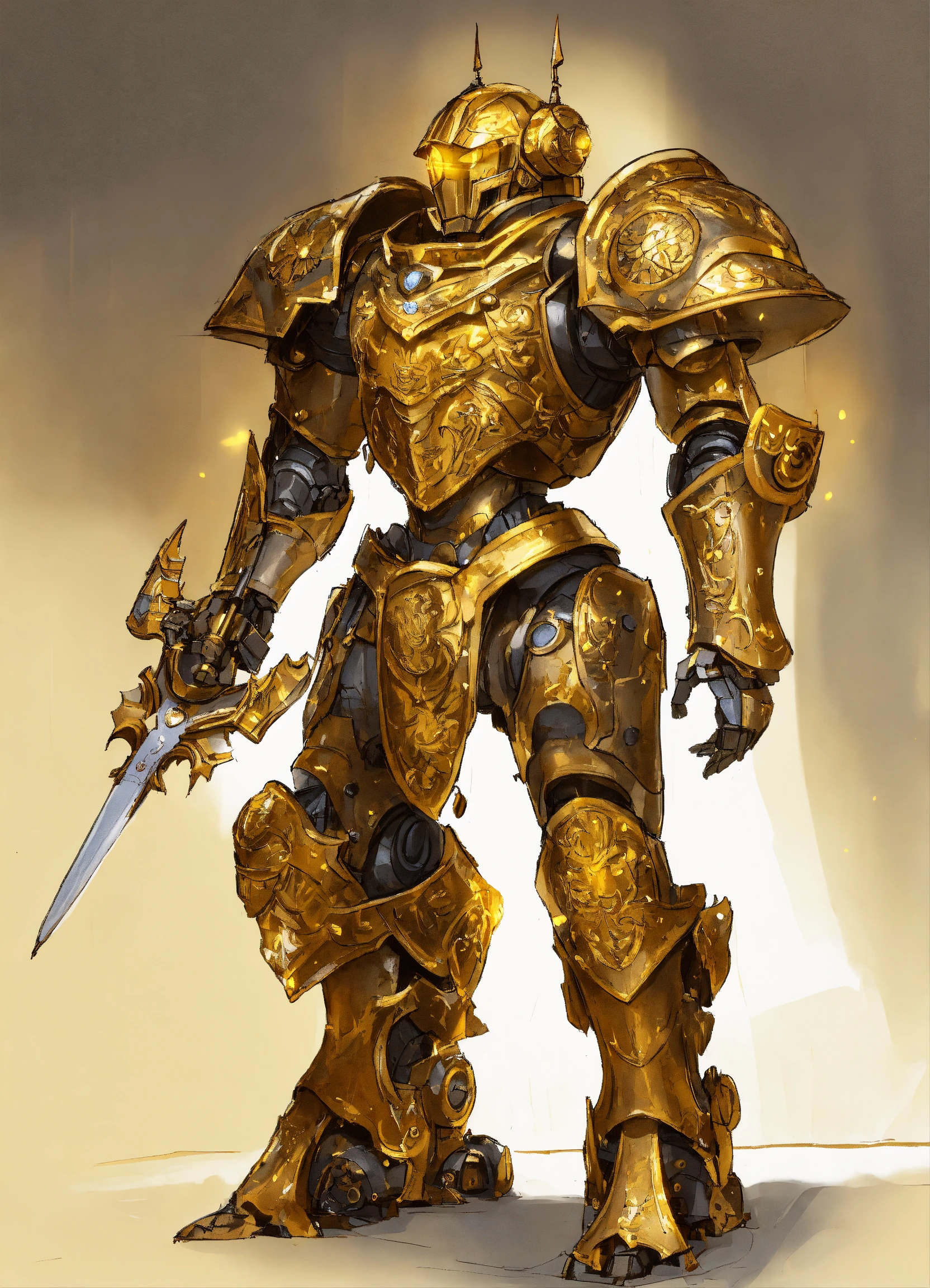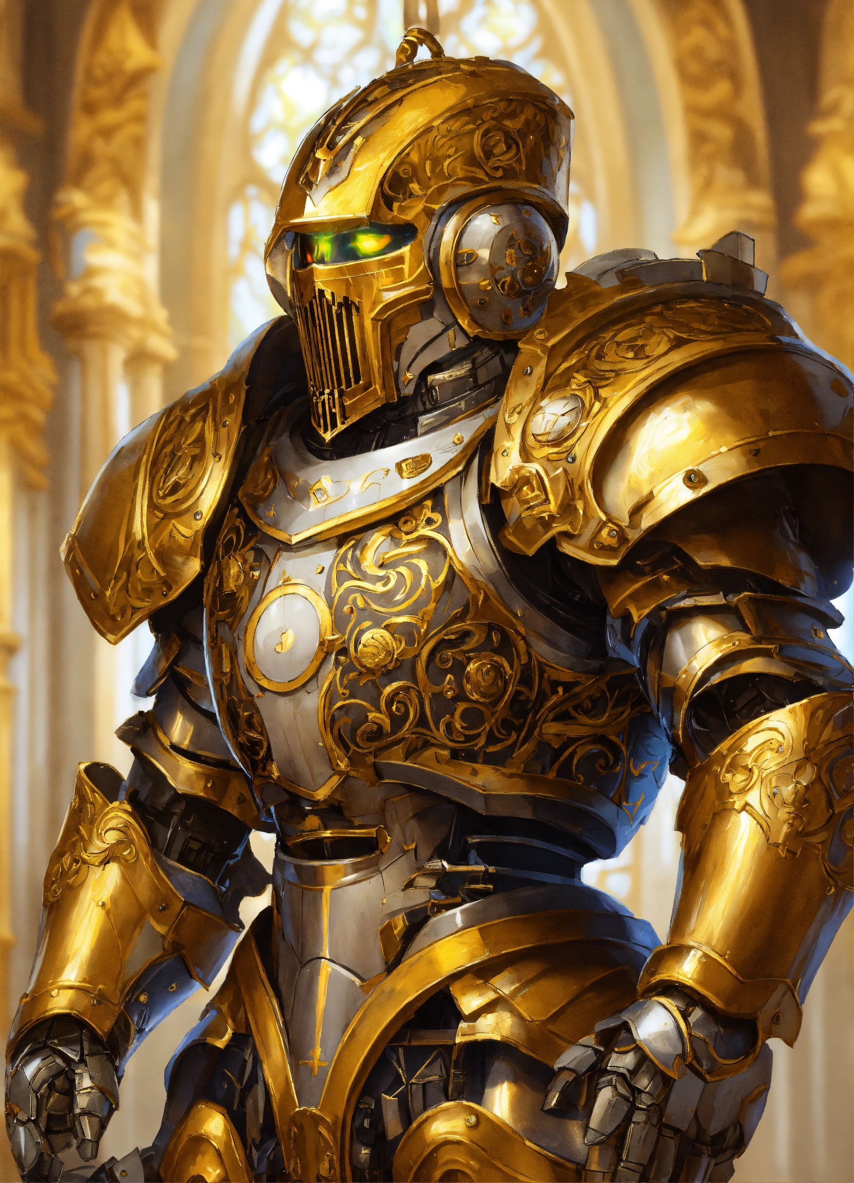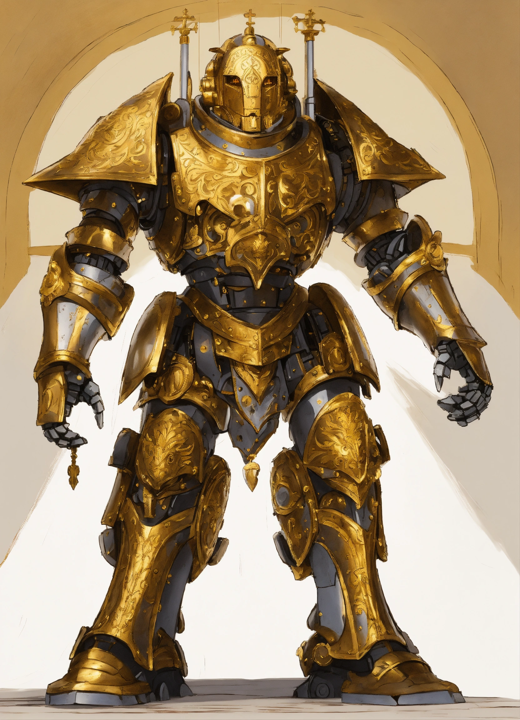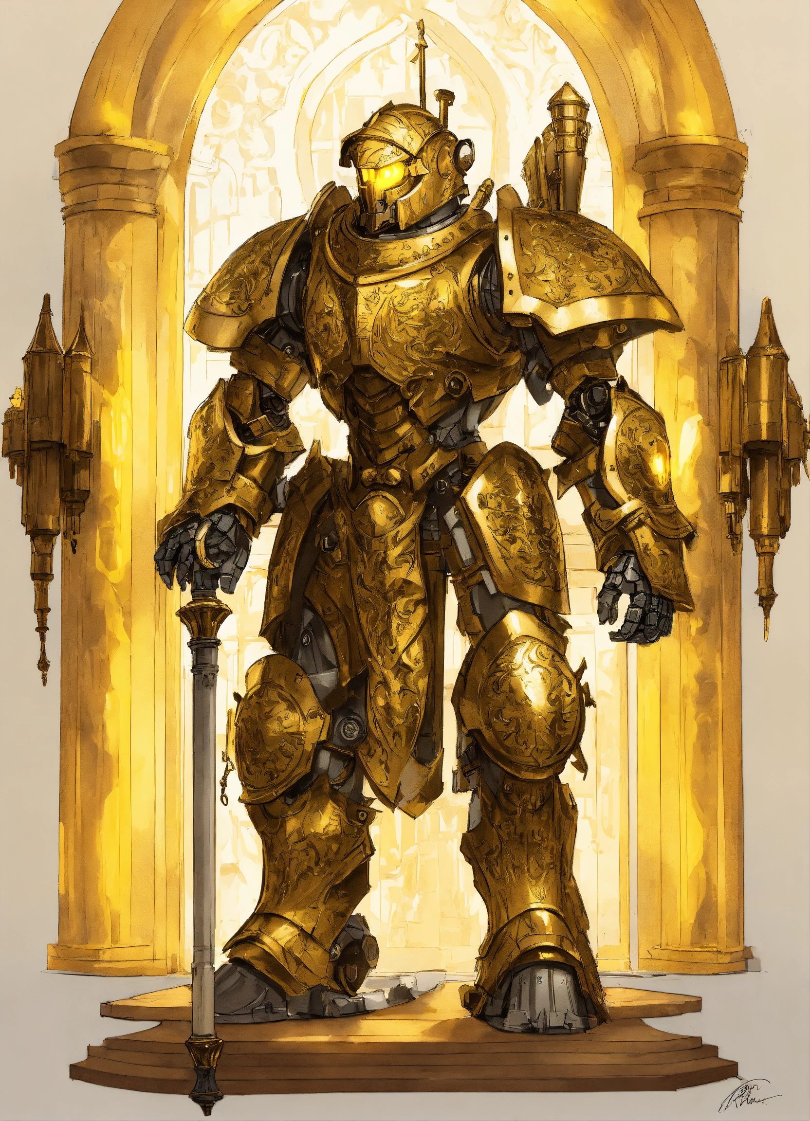 Drawing of a gilded and elaborately decorated steel armored warforged robot warrior with wooden accents holding a scroll, church organ built into his back, glowing yellow eyes, white background