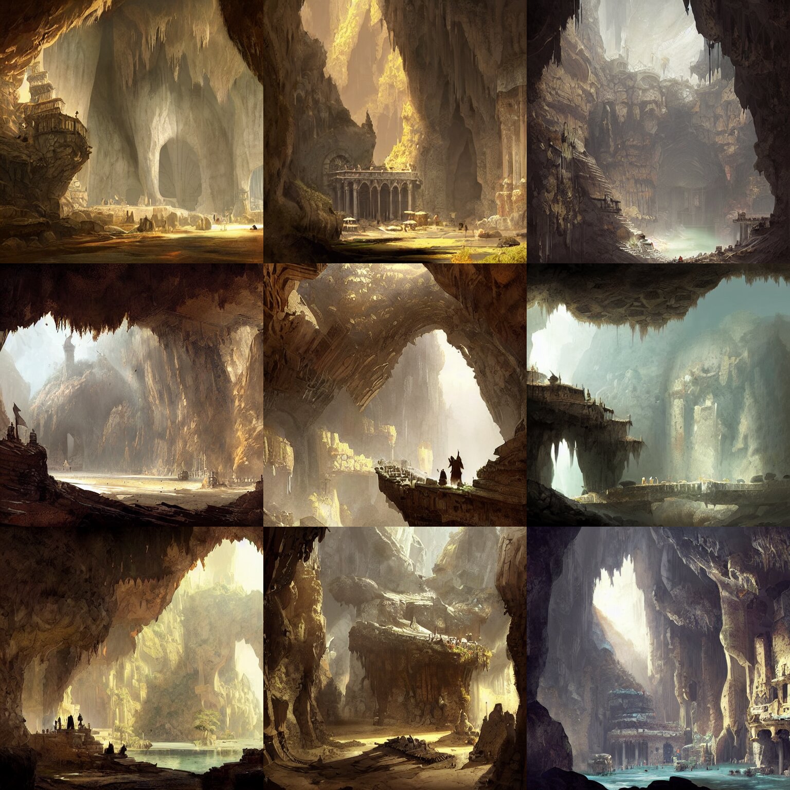 Small palace inside giant cave, elegant architecture, concept art, smooth, sharp focus, illustration, artwork by hubert robert