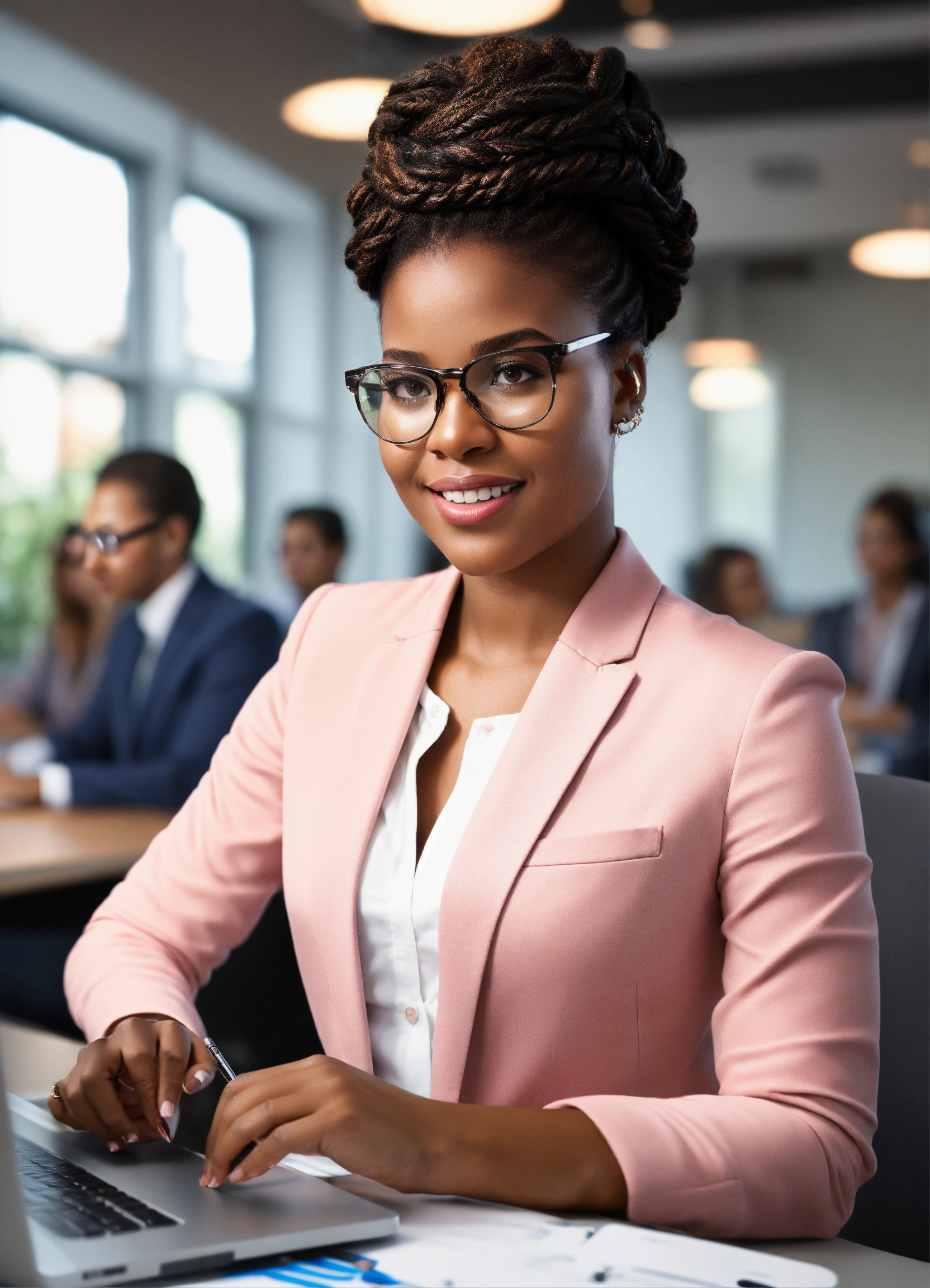 Create bright white background, photorealistic beautiful black woman, with a braided updo, wearing clear rim glasses, dressed in a blush pink blazer, white shirt and jeans standing behind a desk with a computer audience making a presentation--ar 32