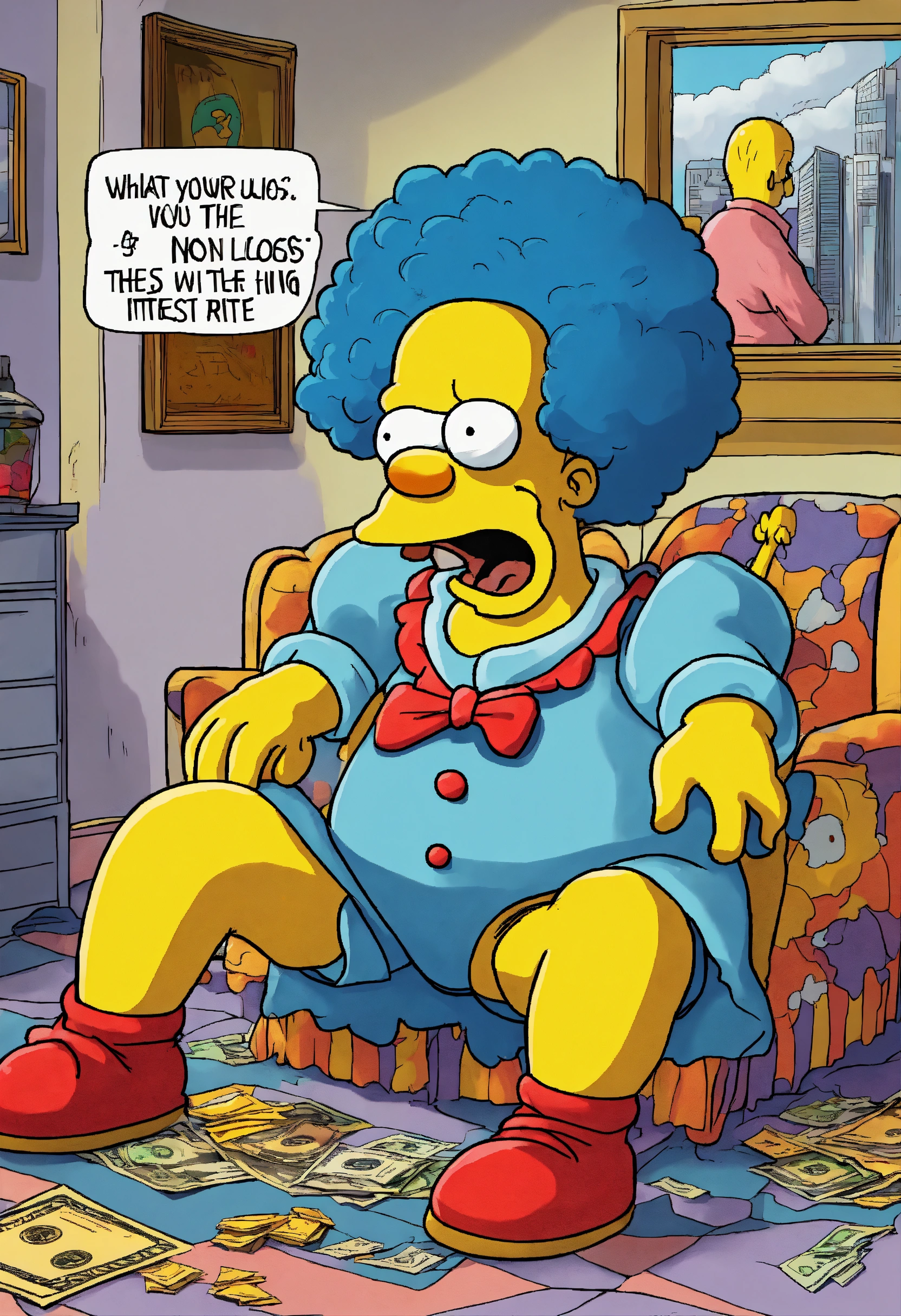 The clown in the blue wig asks what will happen in the us if the interest rate rises? tcartoon simpsons