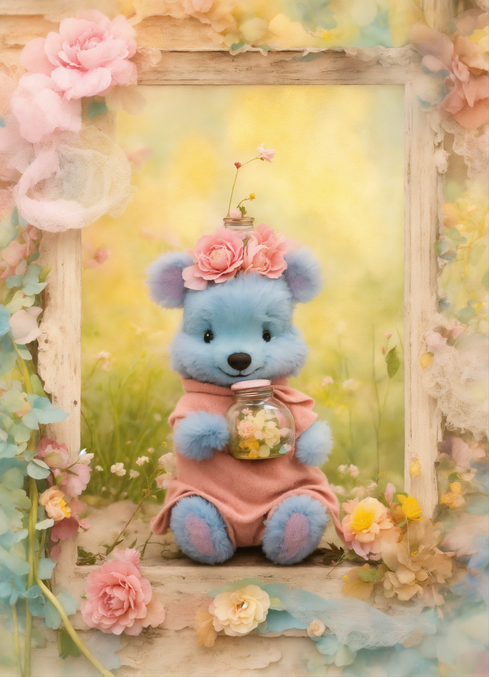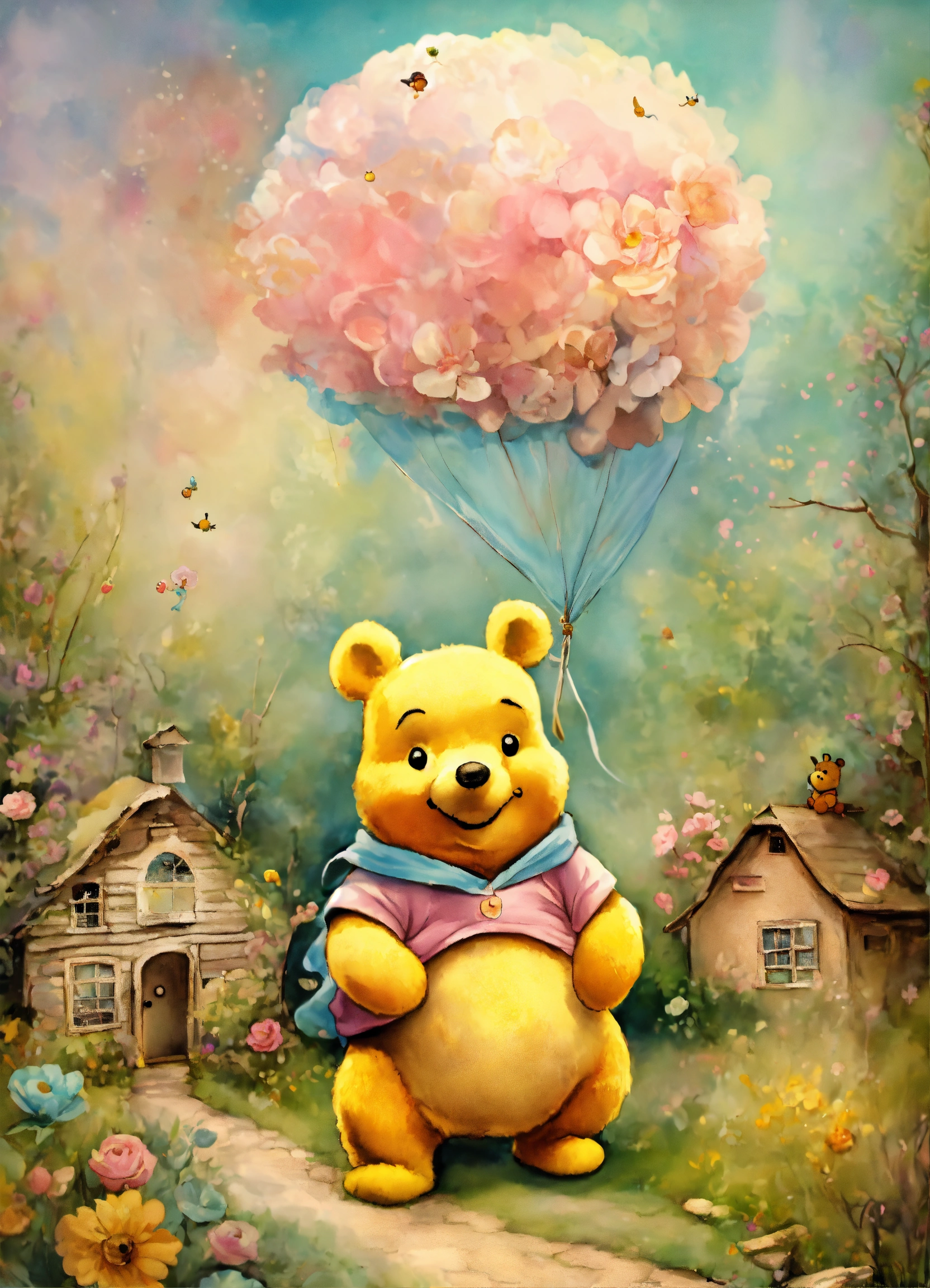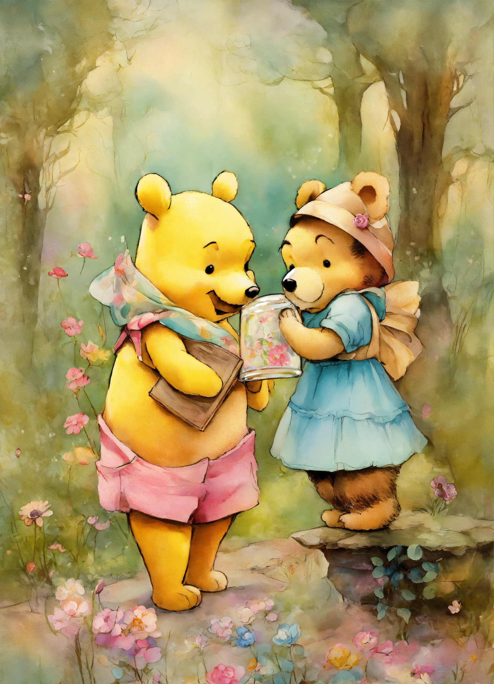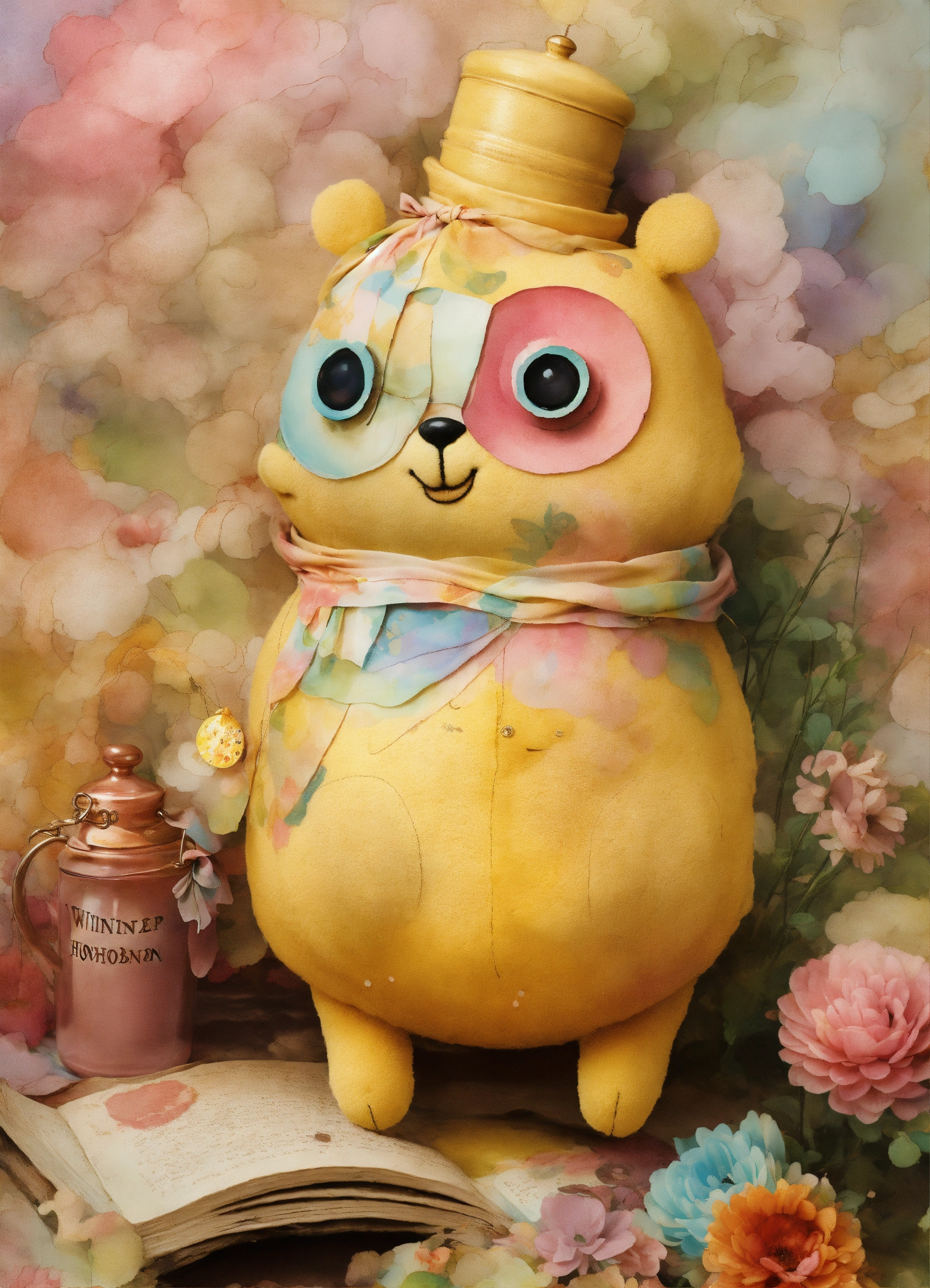 Shabby chic dreamy mist pastel junk journals whimsical cute quirky winnie-the-pooh style "winnie-the-pooh and honeyjar" with big eyes in odd clothings, tamara laporte style, swirling magical fairytale abstract art style