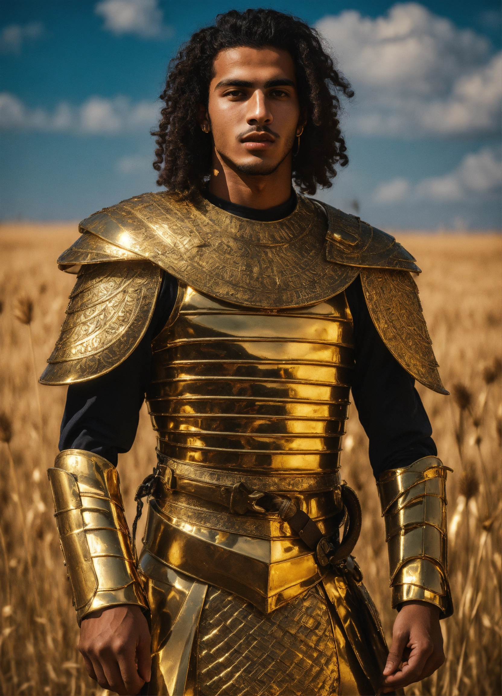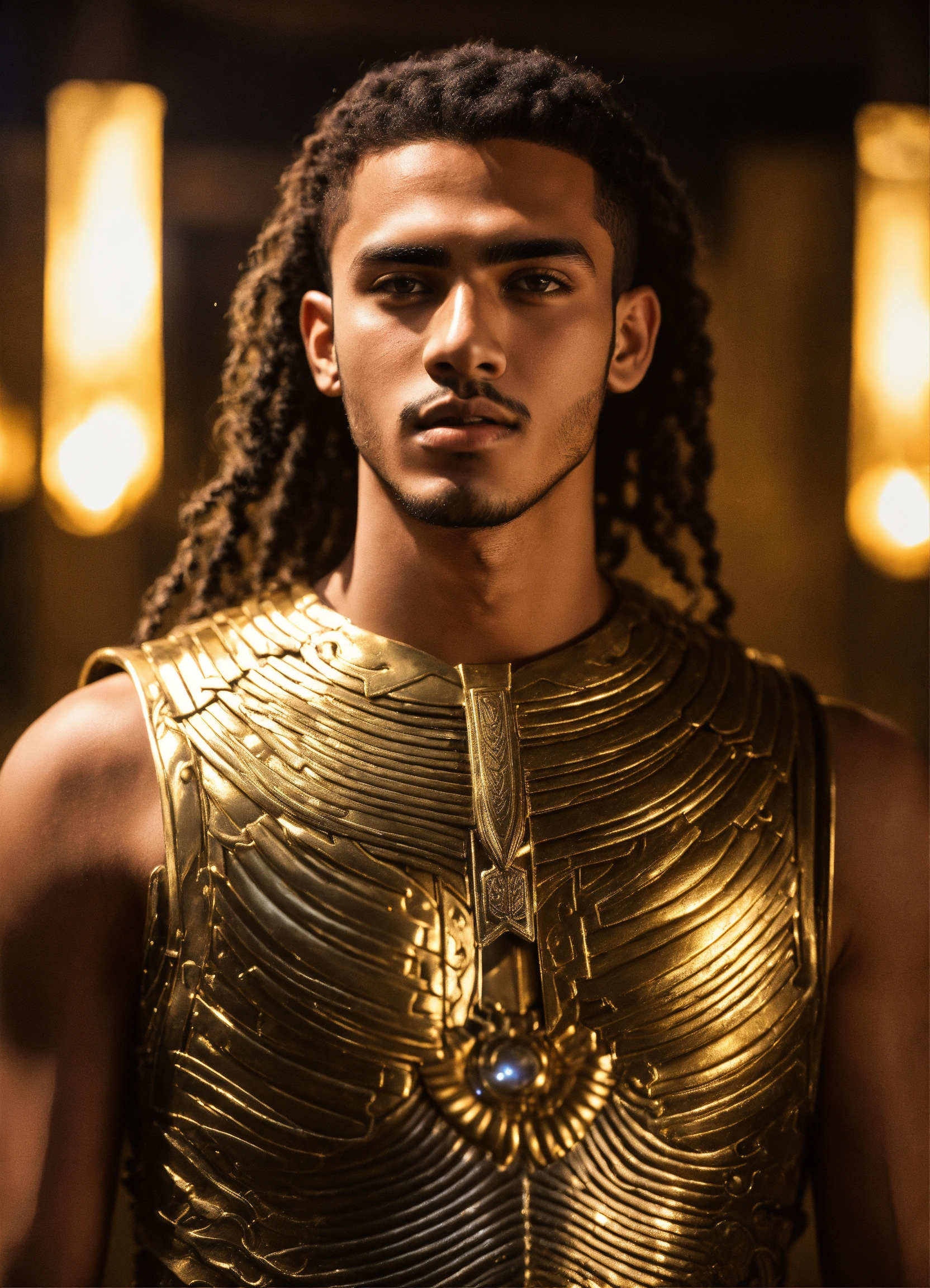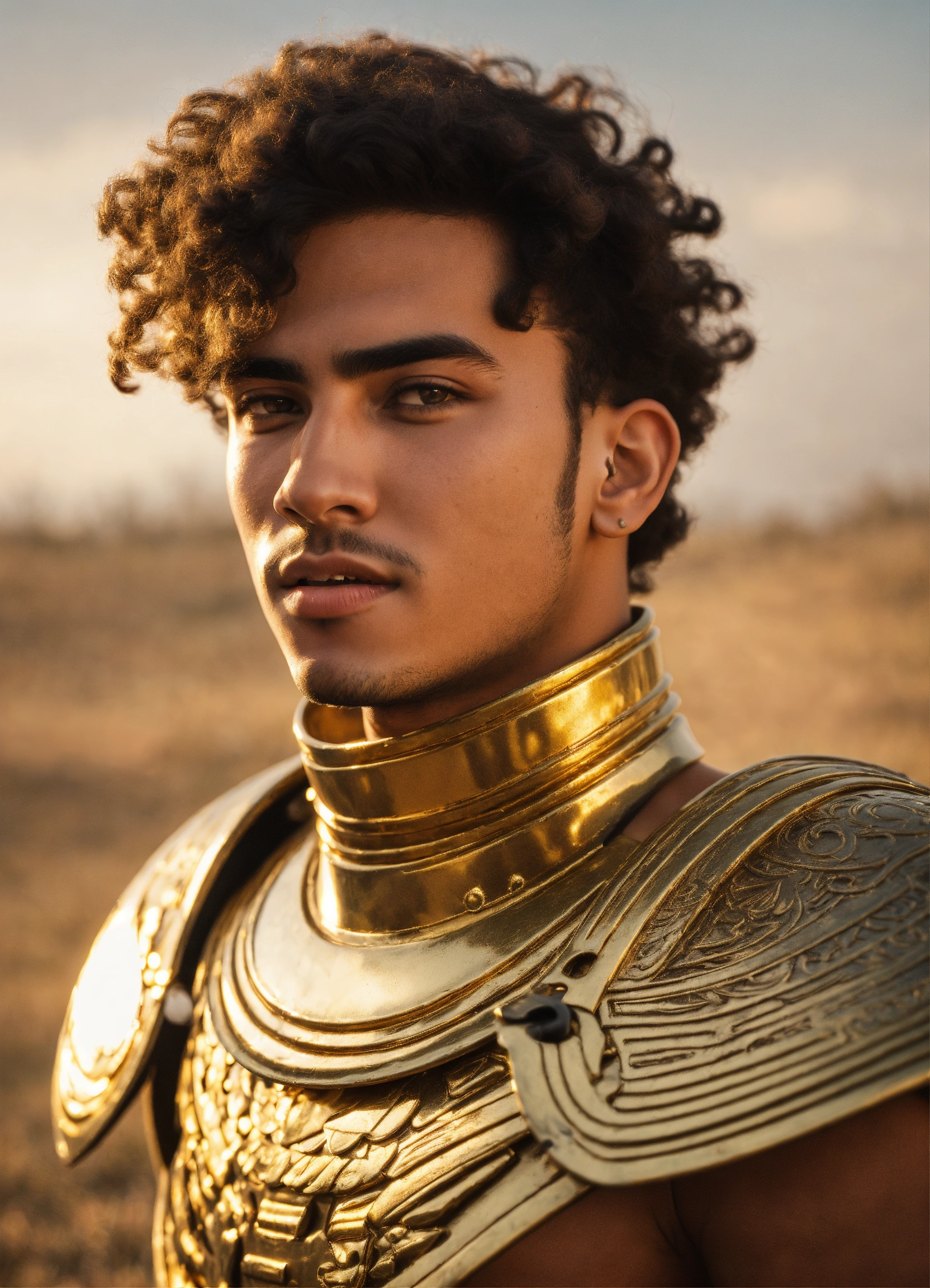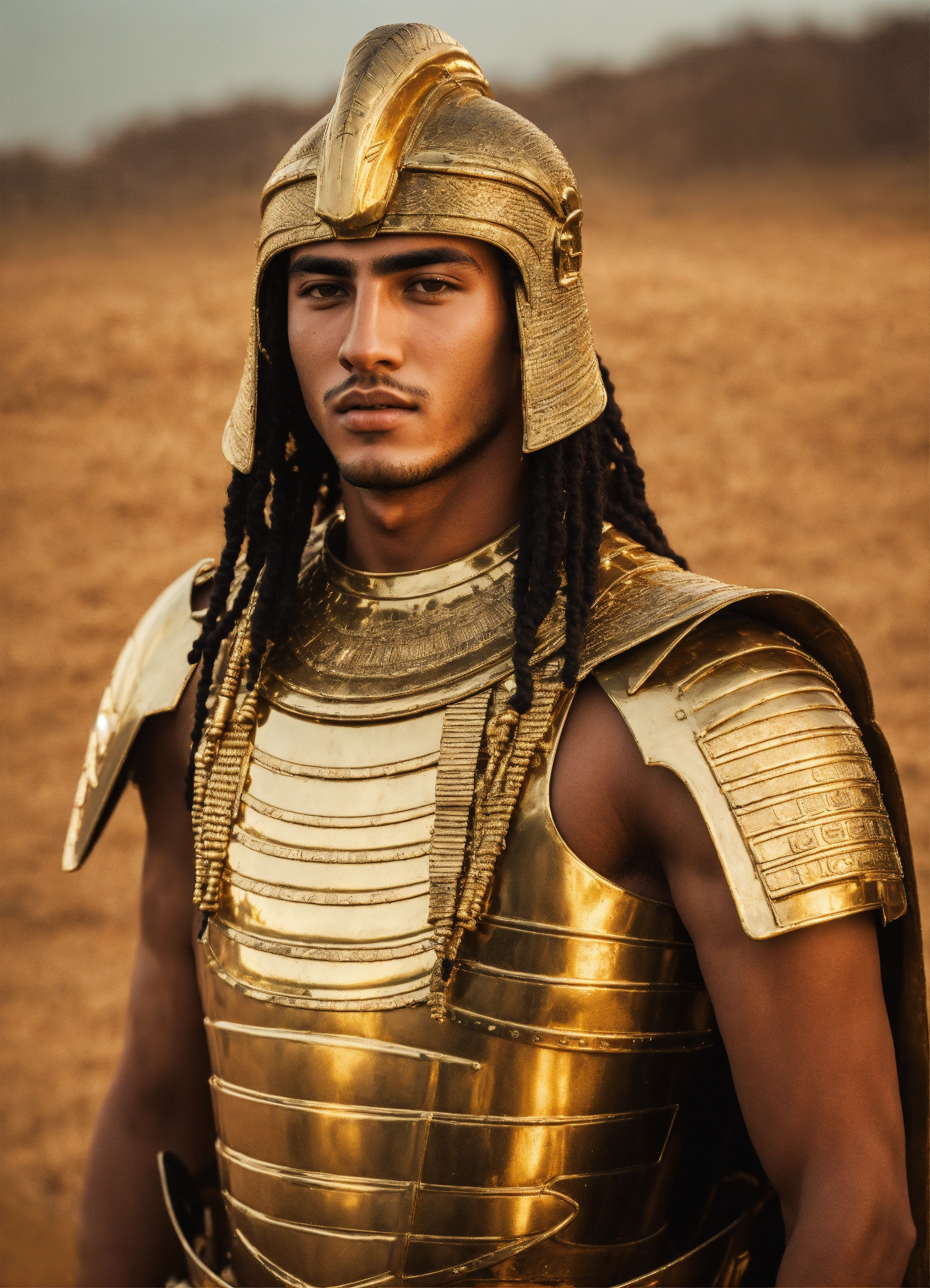 Handsome 20-year-old egyptian male with long neat loc’s, smooth skin, full lips, dressed in gold battle armor, in field, confident demeanor
