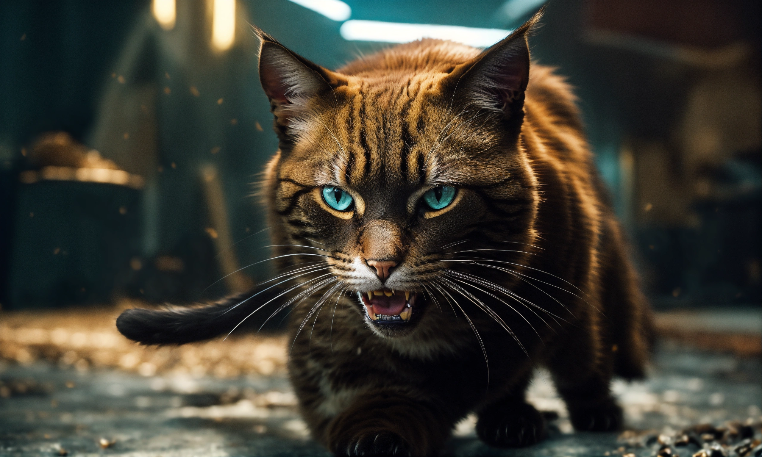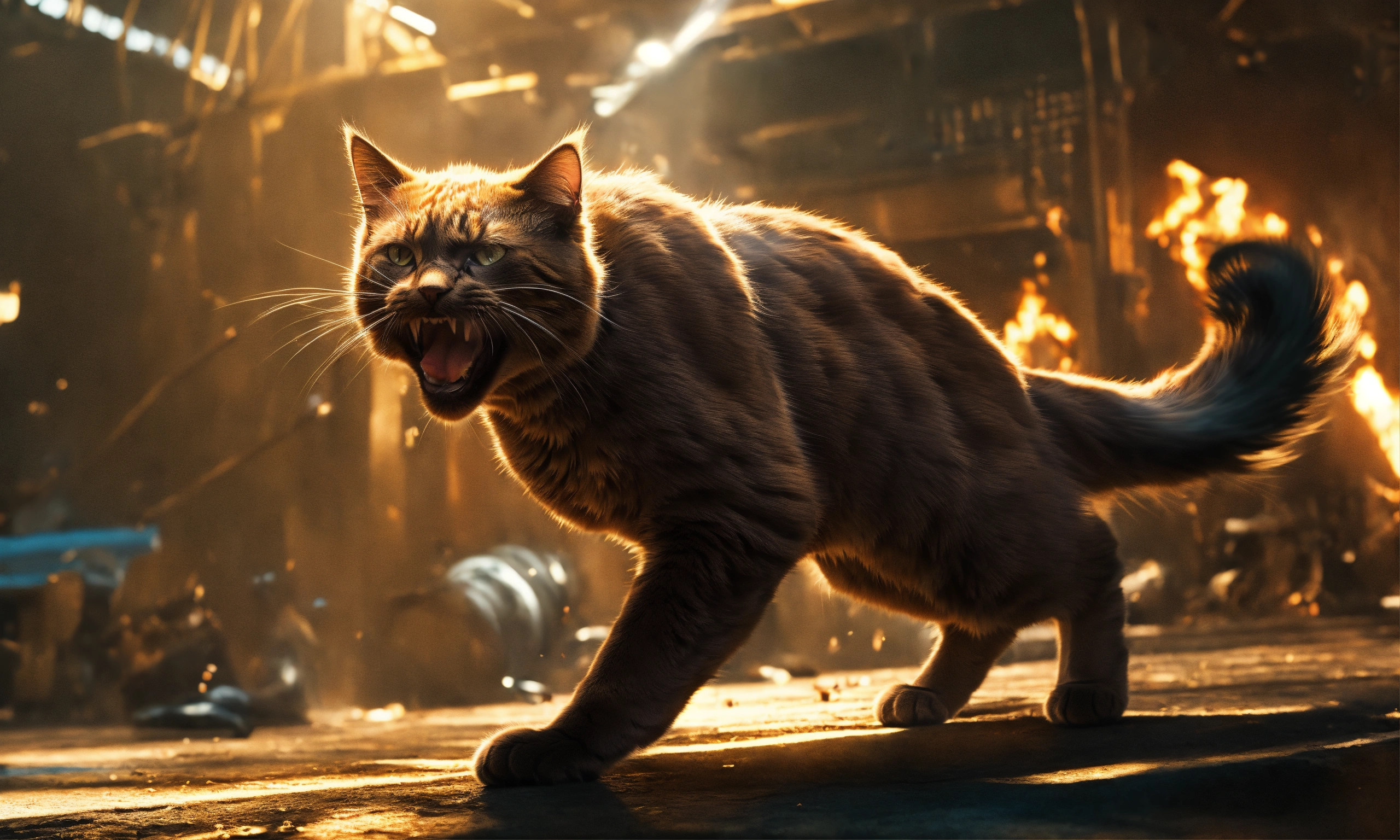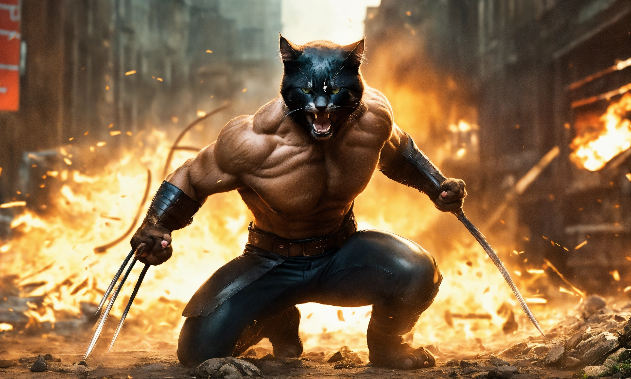 Produce me an image of cat wolverine in fighting action, movie image. ensure high resolution, 8k image, realistic.
