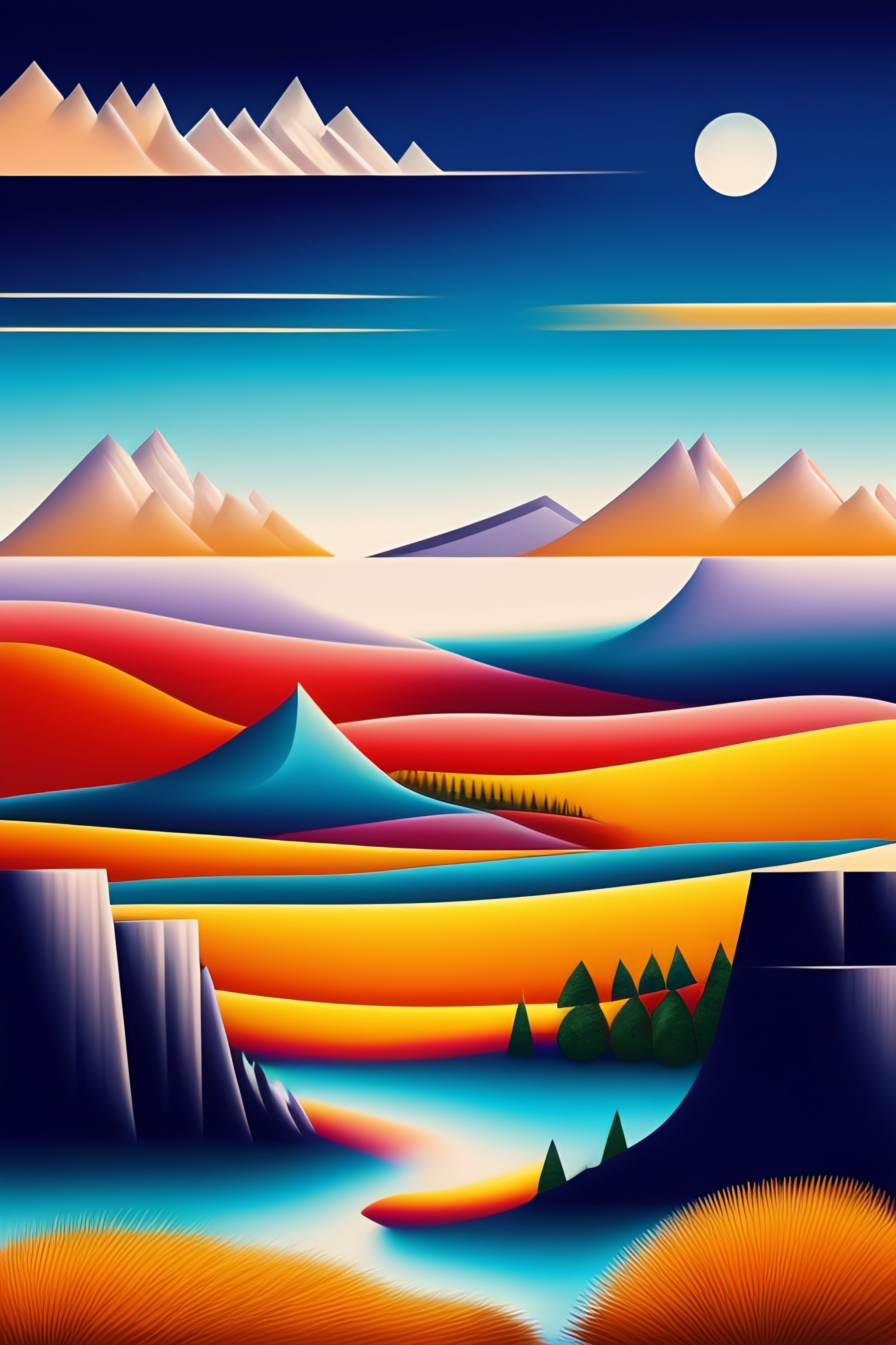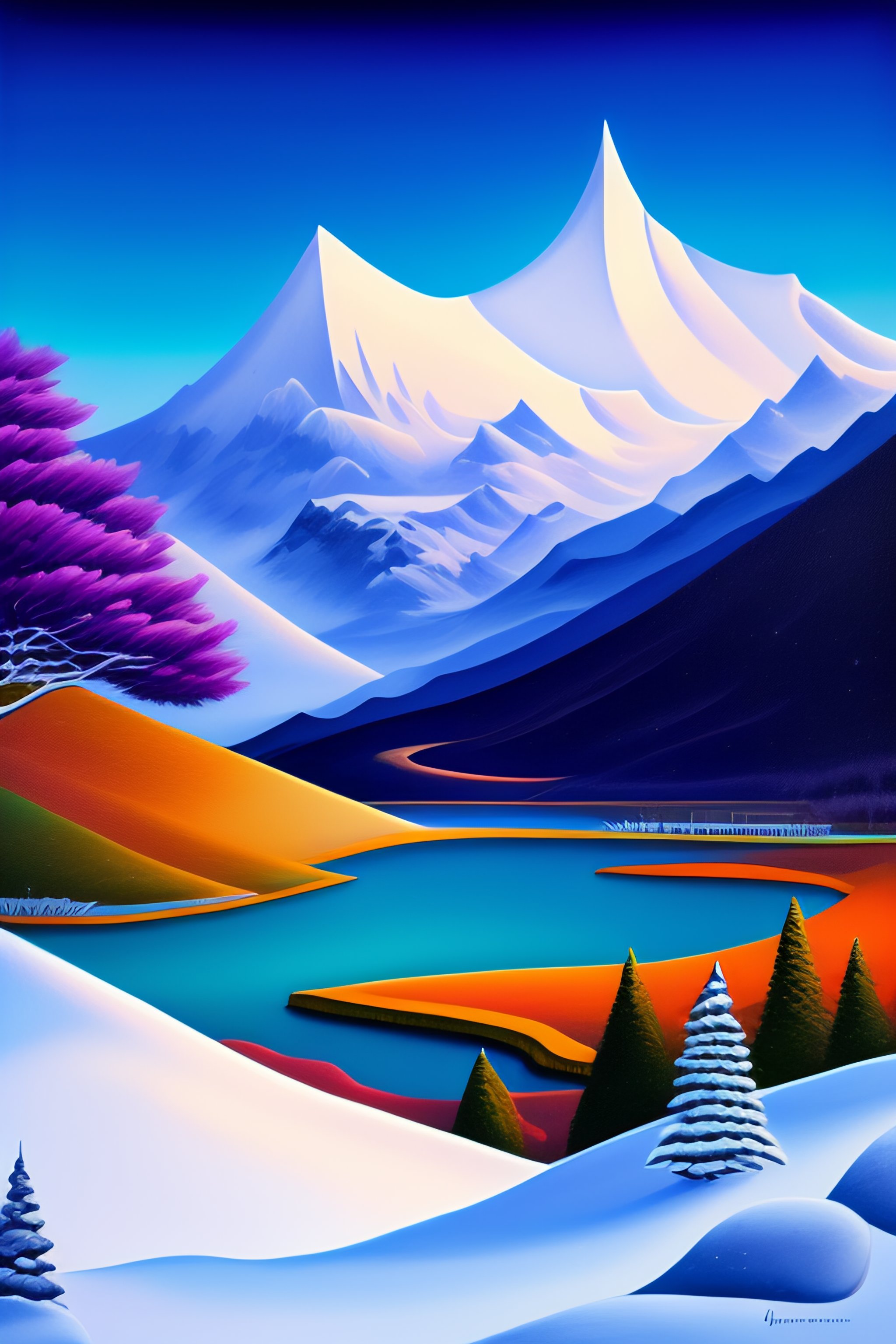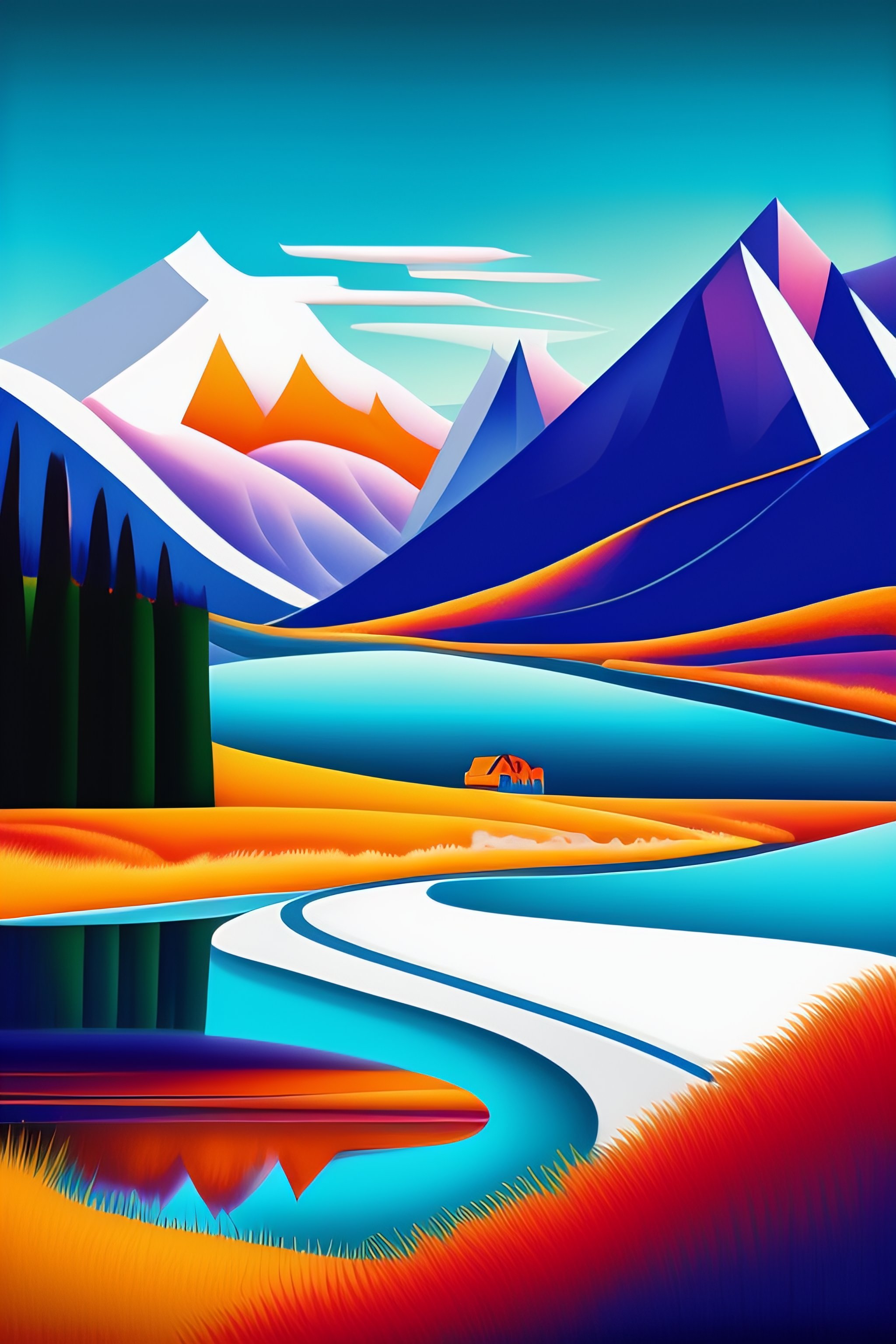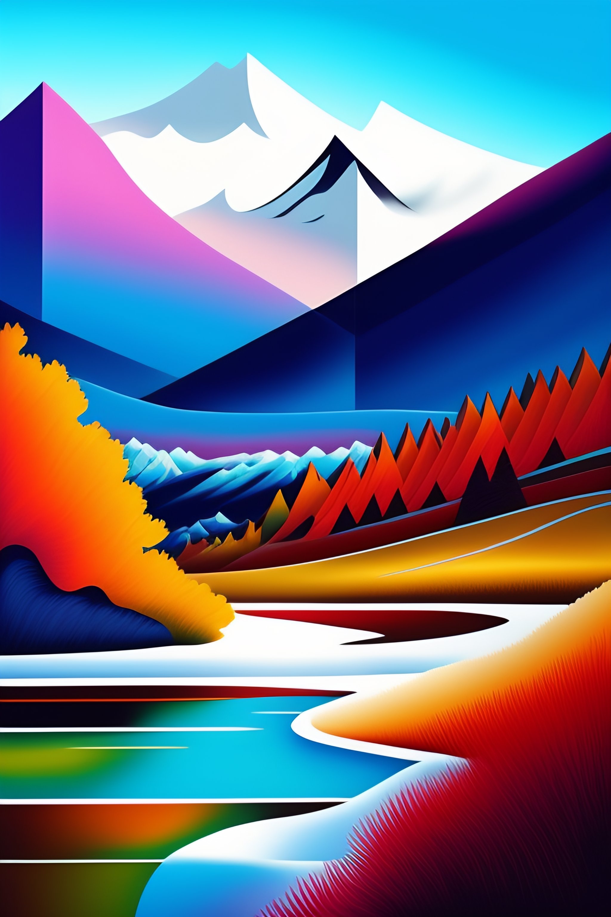Imagen cubista abstracta y surrealista en forma de paisaje con montañas y lago con nieve