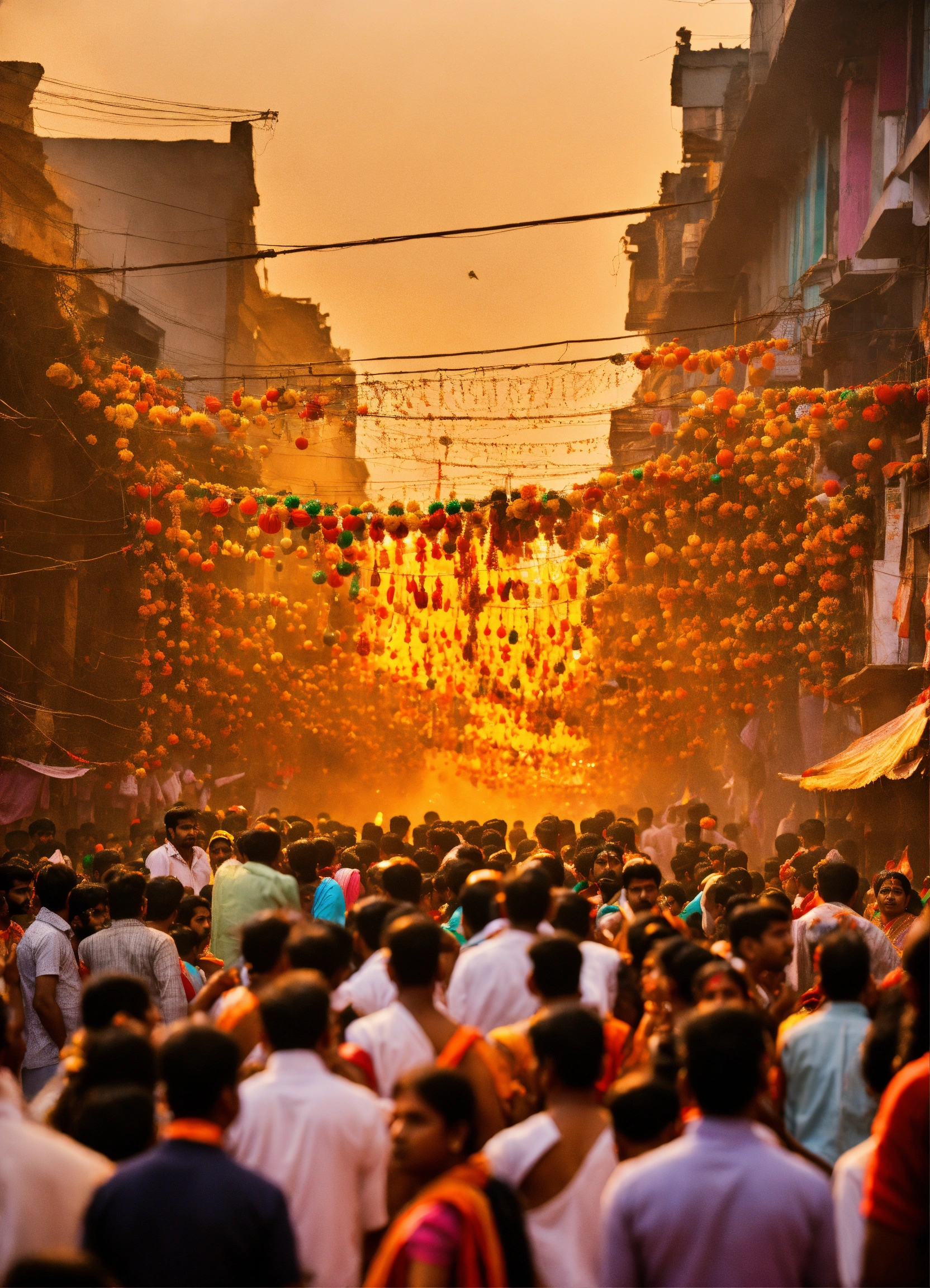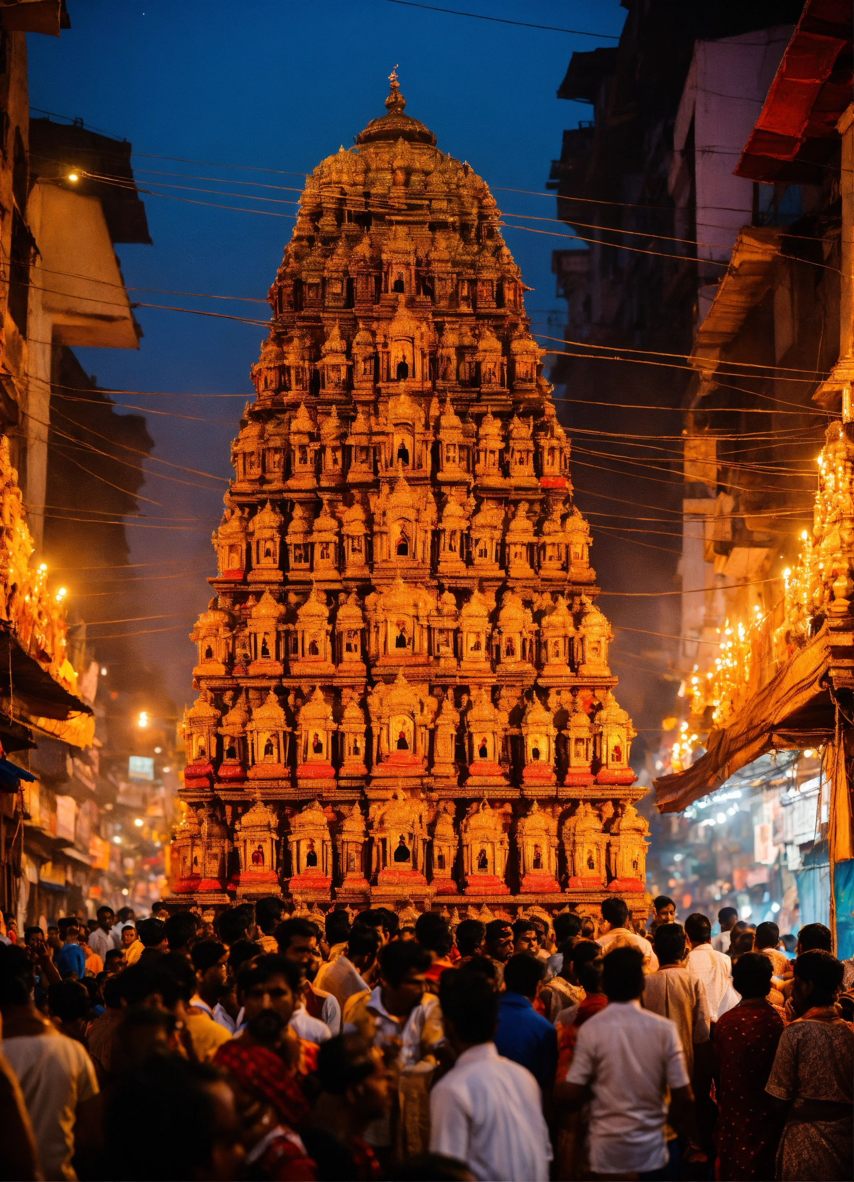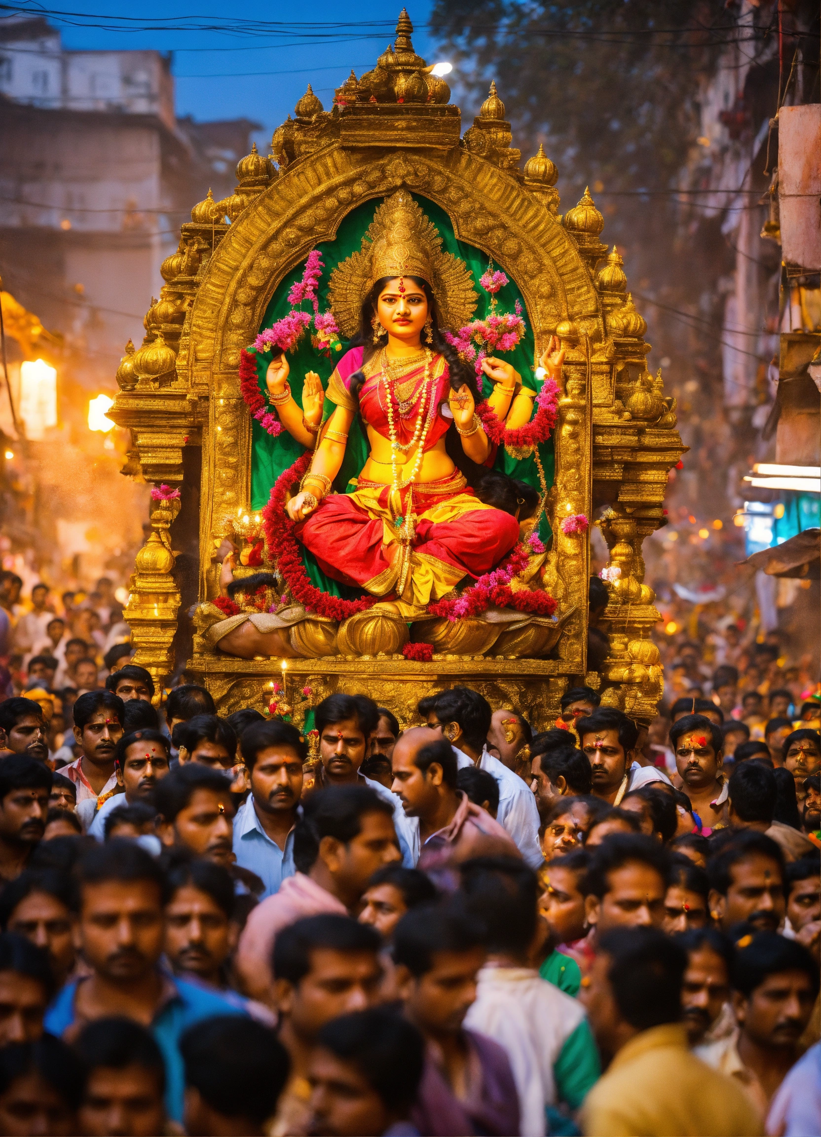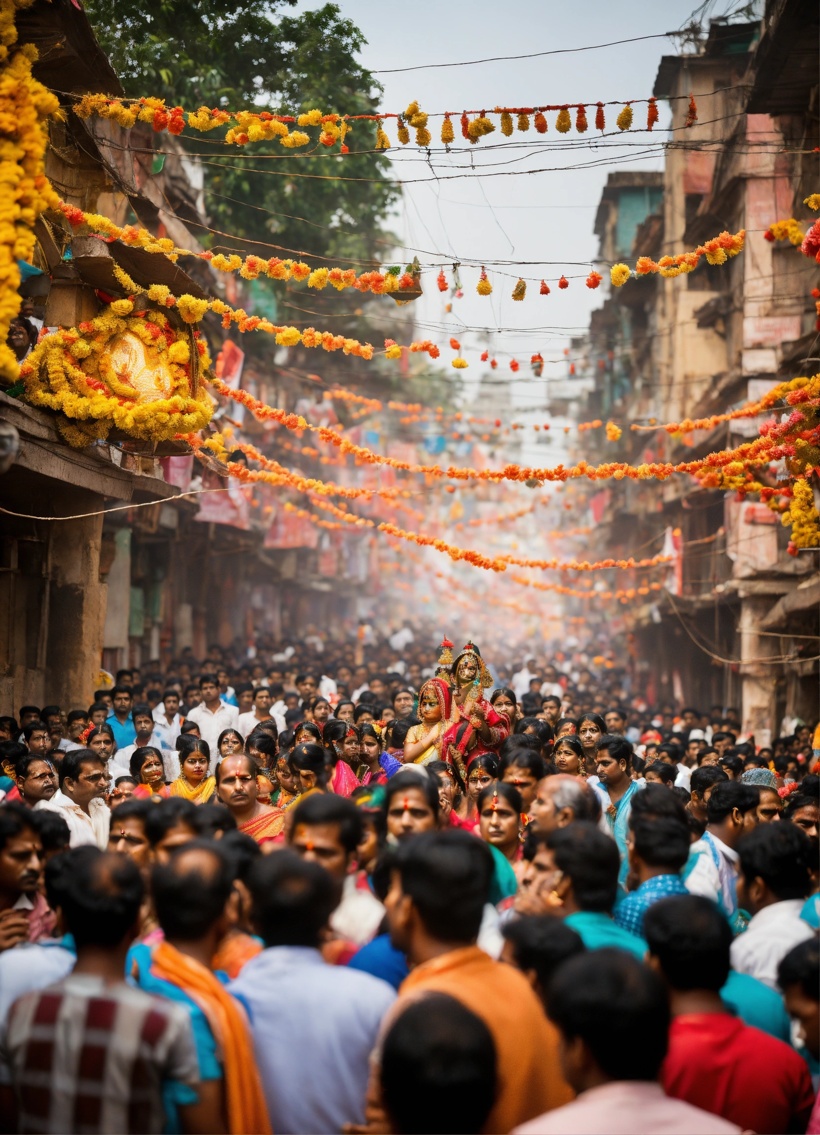 Durga puja on a crowded street with festive crowds chanting, praying, and an electric and energetic atmosphere.