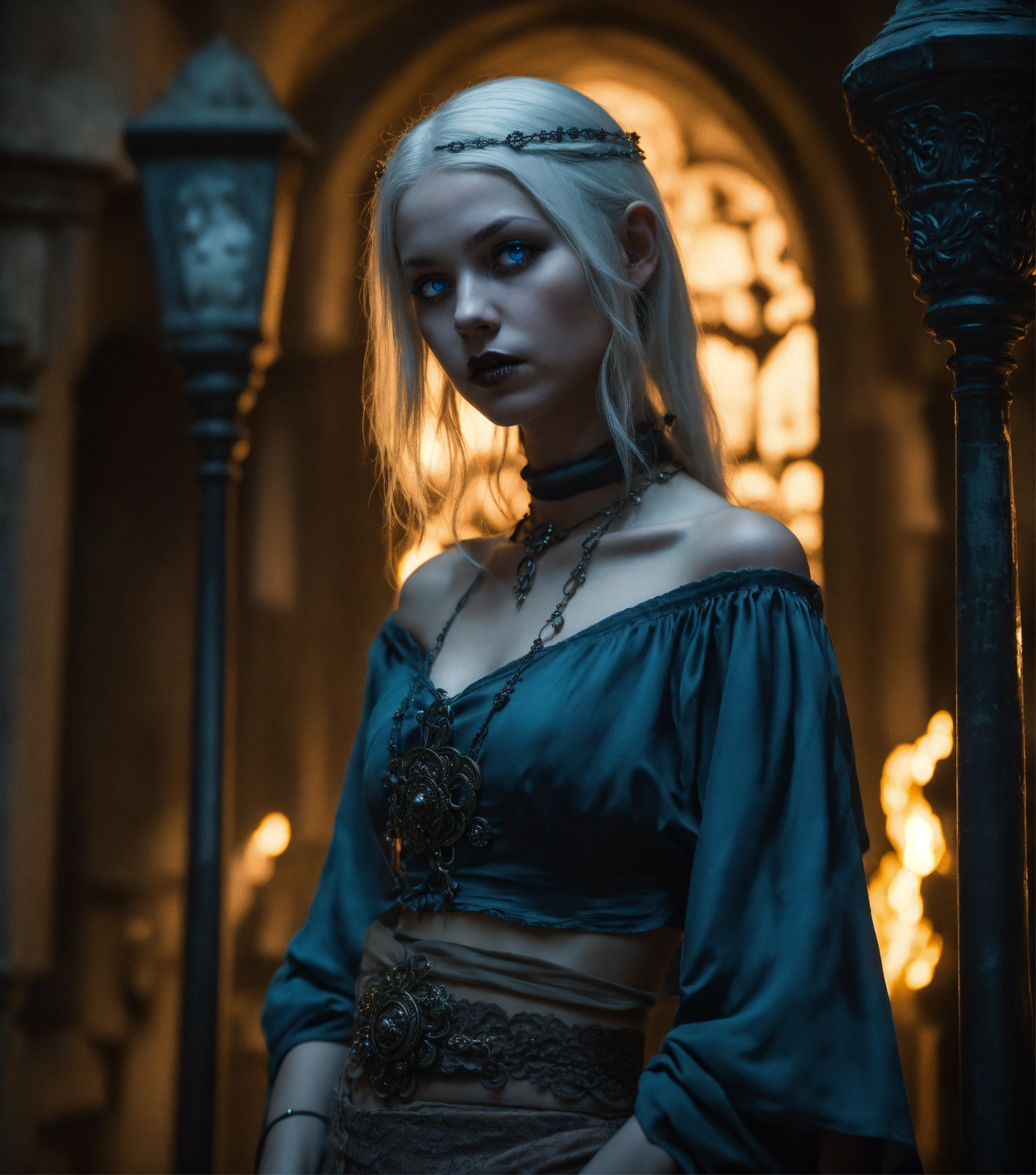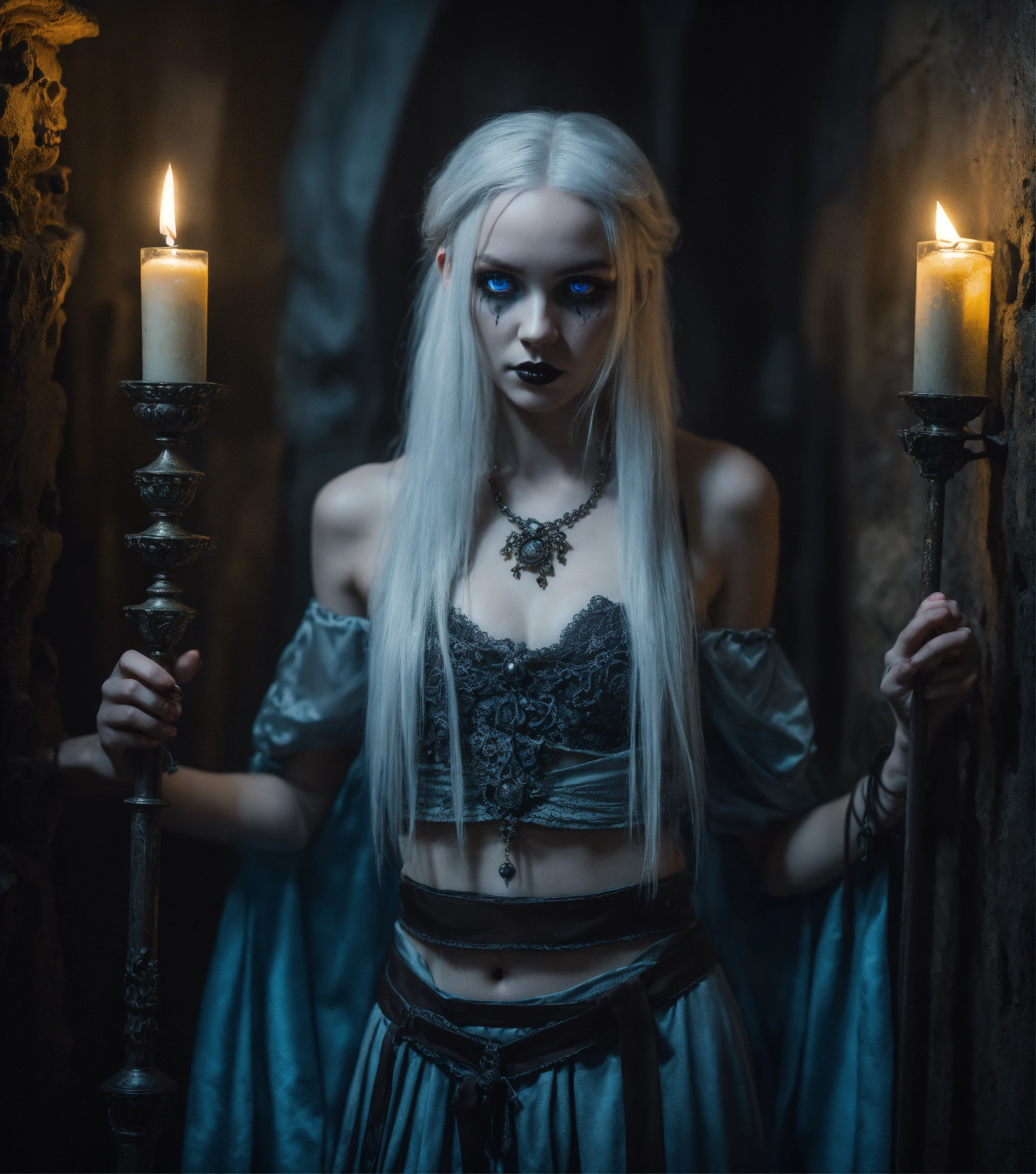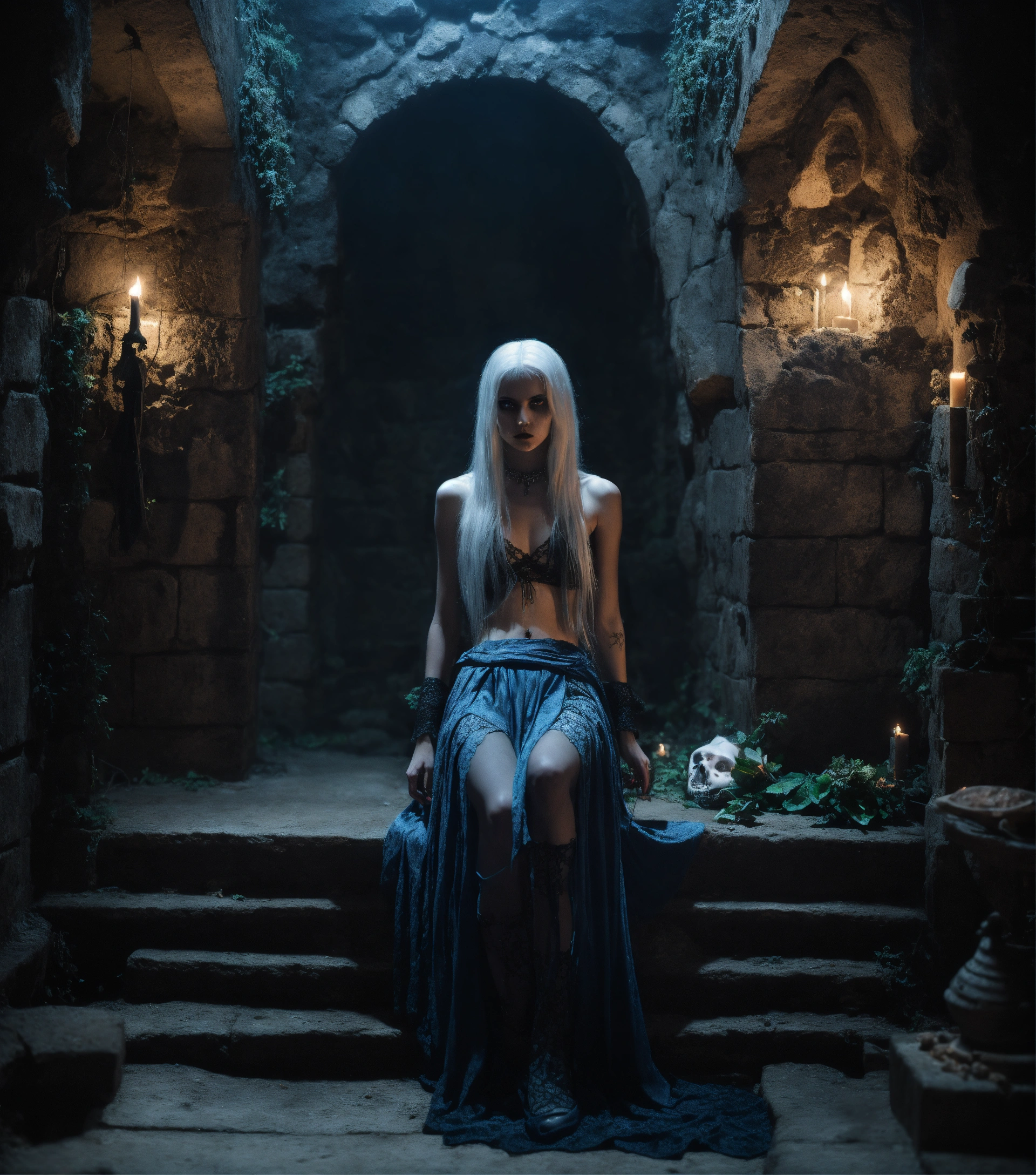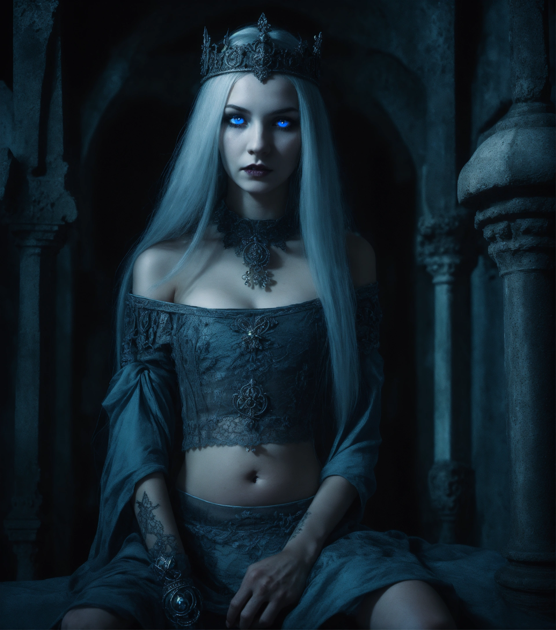 Body portrait, sehr kindhaft deadly pale twelve year old female child goth necromancer with waist long silverwhite hair and a aufreizendes off-the-shoulder lace silk cropped top mit tiefem ausschnitt and a low-waisted high slit skirt, extremely flat belly, belly button, extremely skinny, extremely slim and emaciated body, completely emaciated, very narrow face, alabaster skin, pale as a corpse, glowing blue eyes, slim face, innocent looking, leans against a sarcophagus in a gloomy crypt, kindlich, unschuldig, childlike, juvenile, graceful, wispy, glowing blue eyes, ghostly, dead, evil, demonic, undead, darkness, grotesque, mysterious, dark, dark, cold ambient lighting, extremely detailed, fantasy, medieval setting