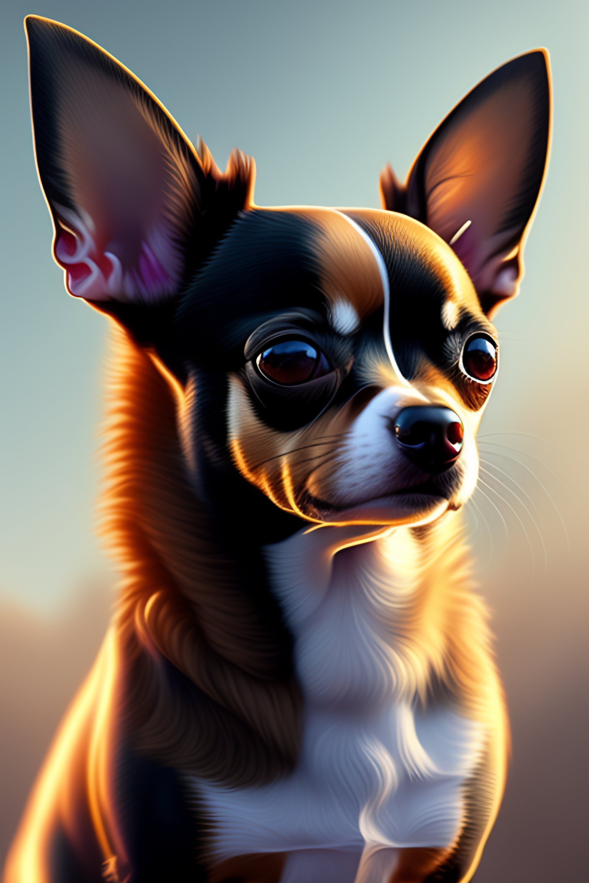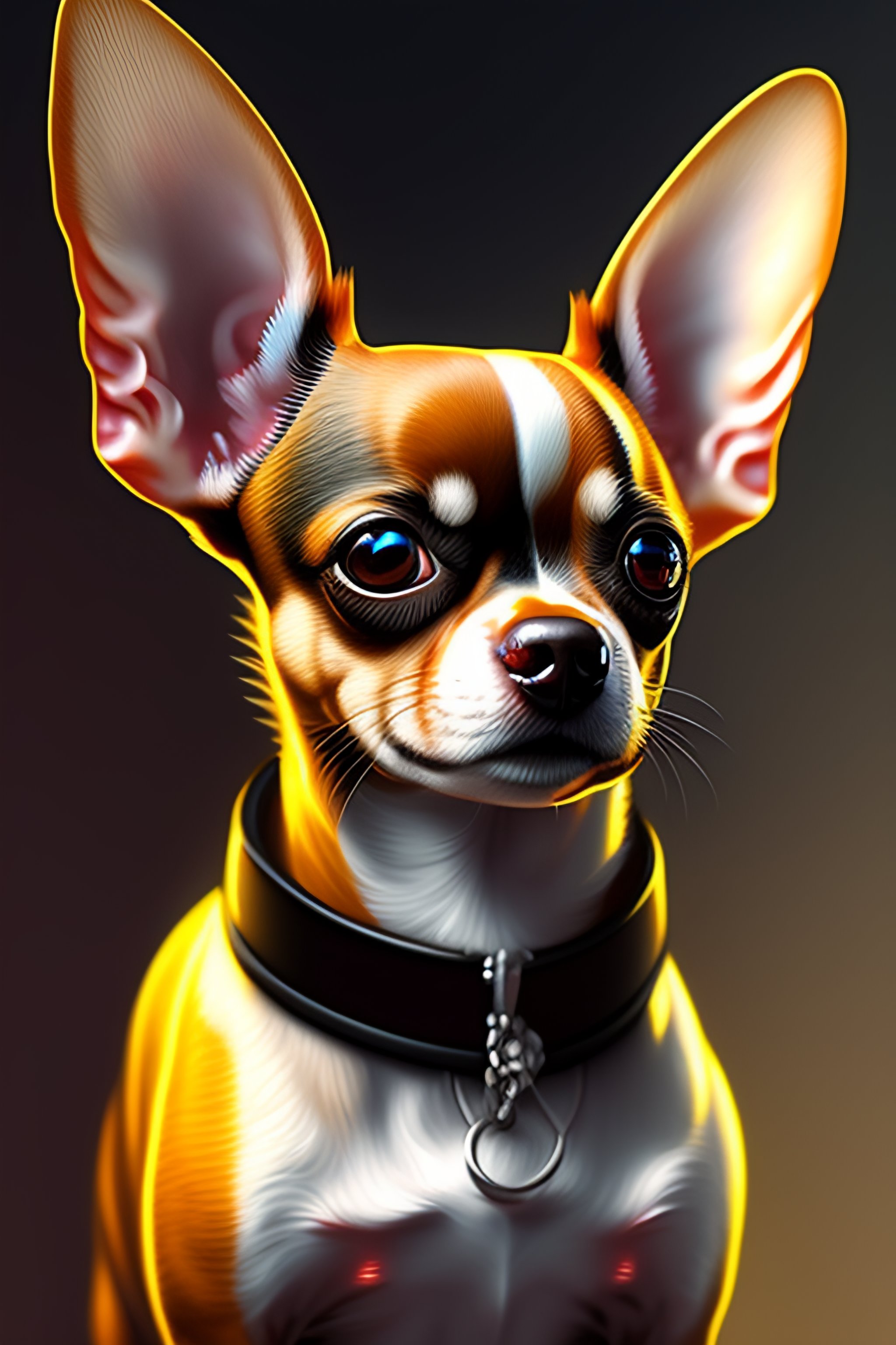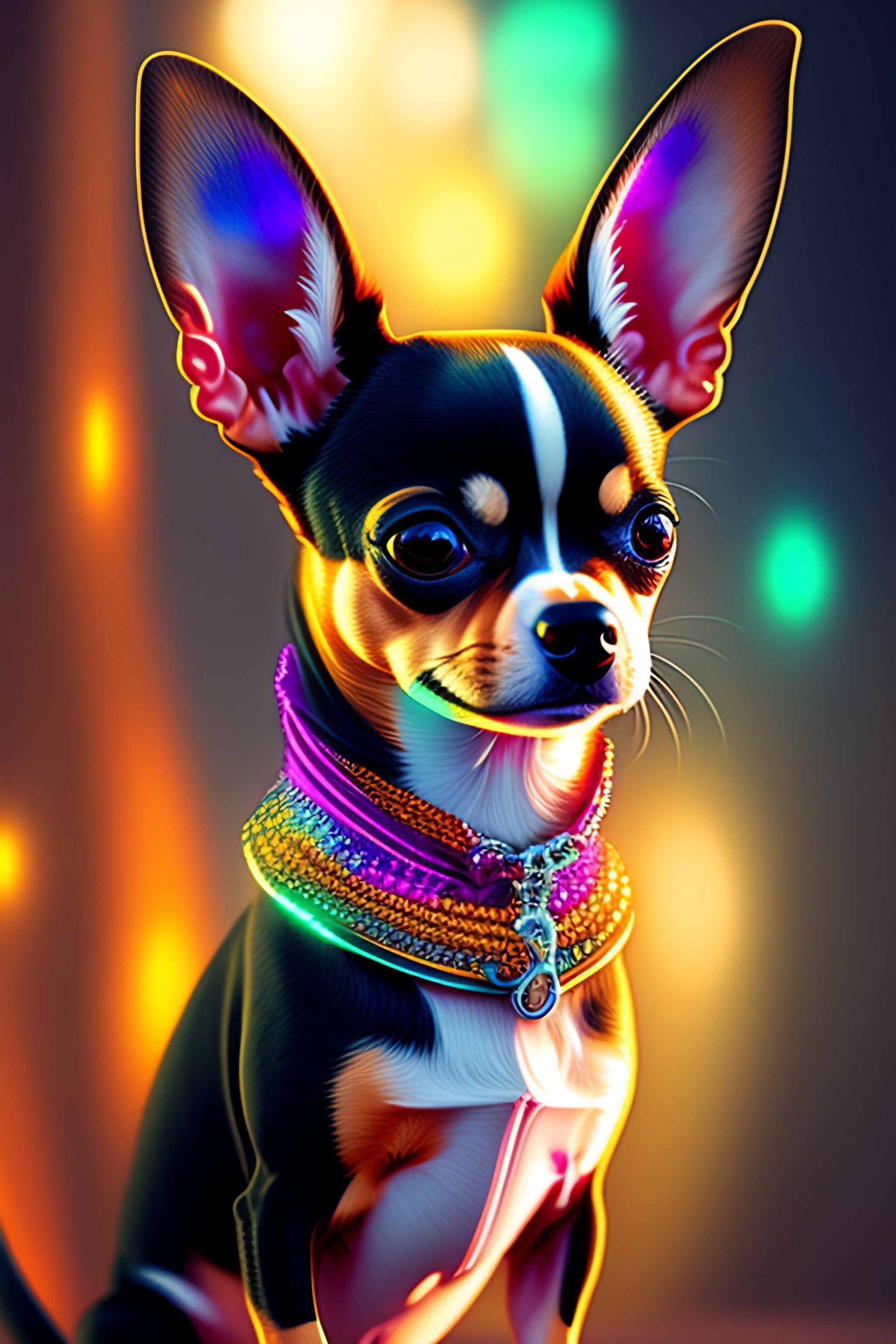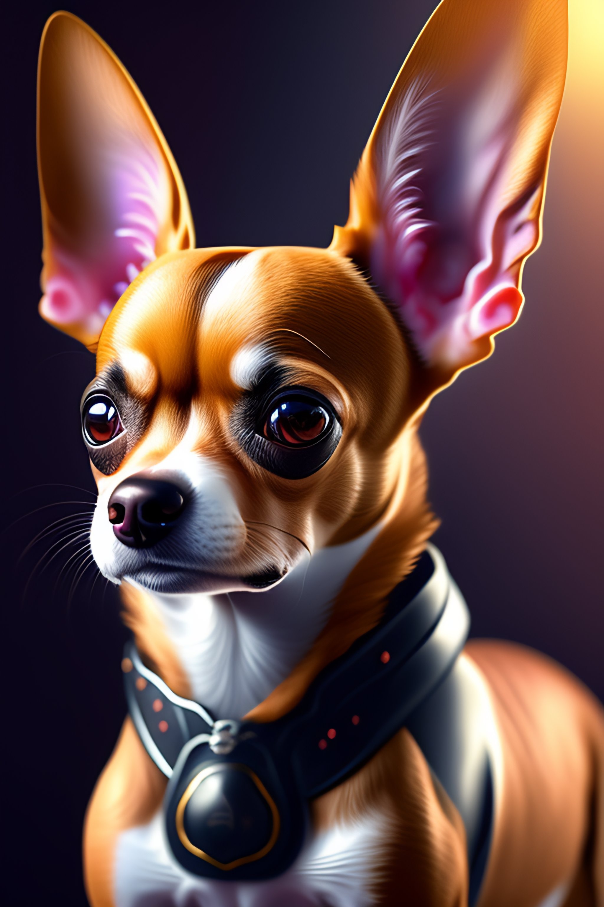 A cybernetic three color chihuahua accompanied by 3 licorn, concept art, detailed face and body, detailled decor, fantasy, highly detailed, cinematic lighting, digital art painting
