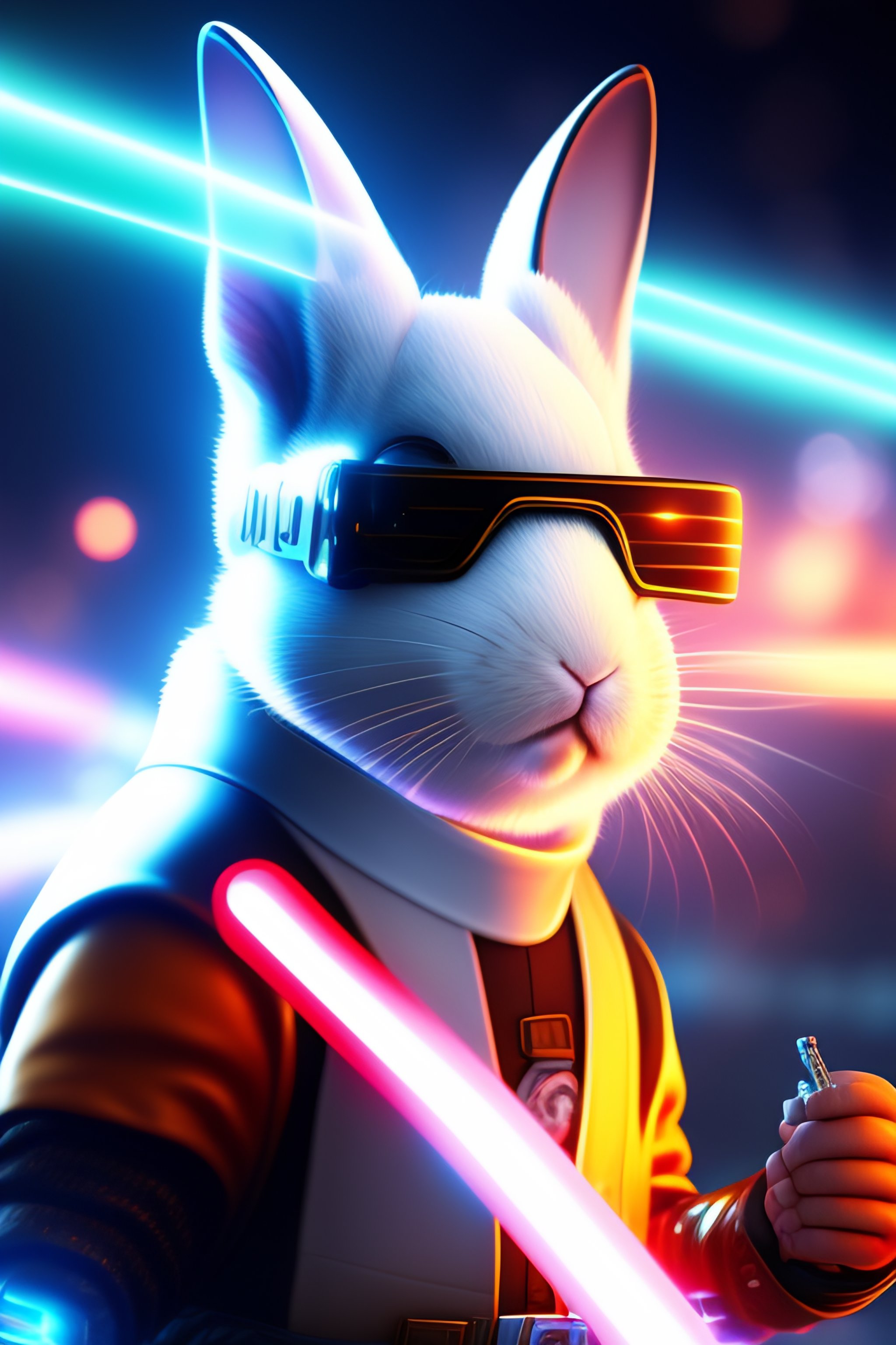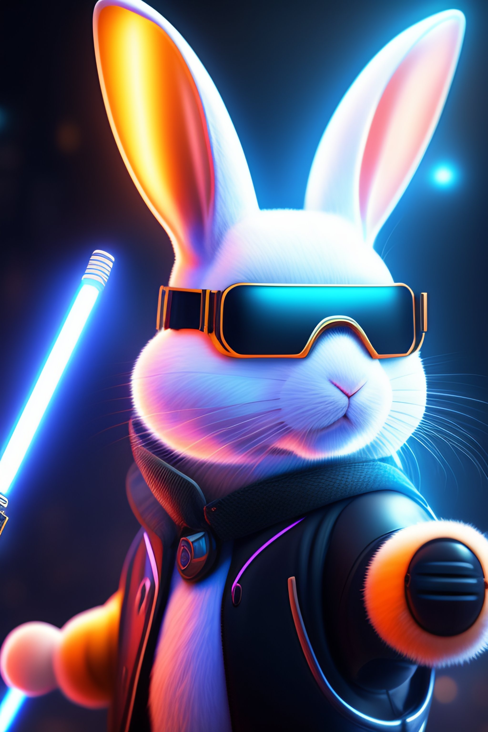 White rabbit cartoon in virtual world of tron with light saber in hand and using bomber style eye glasses
