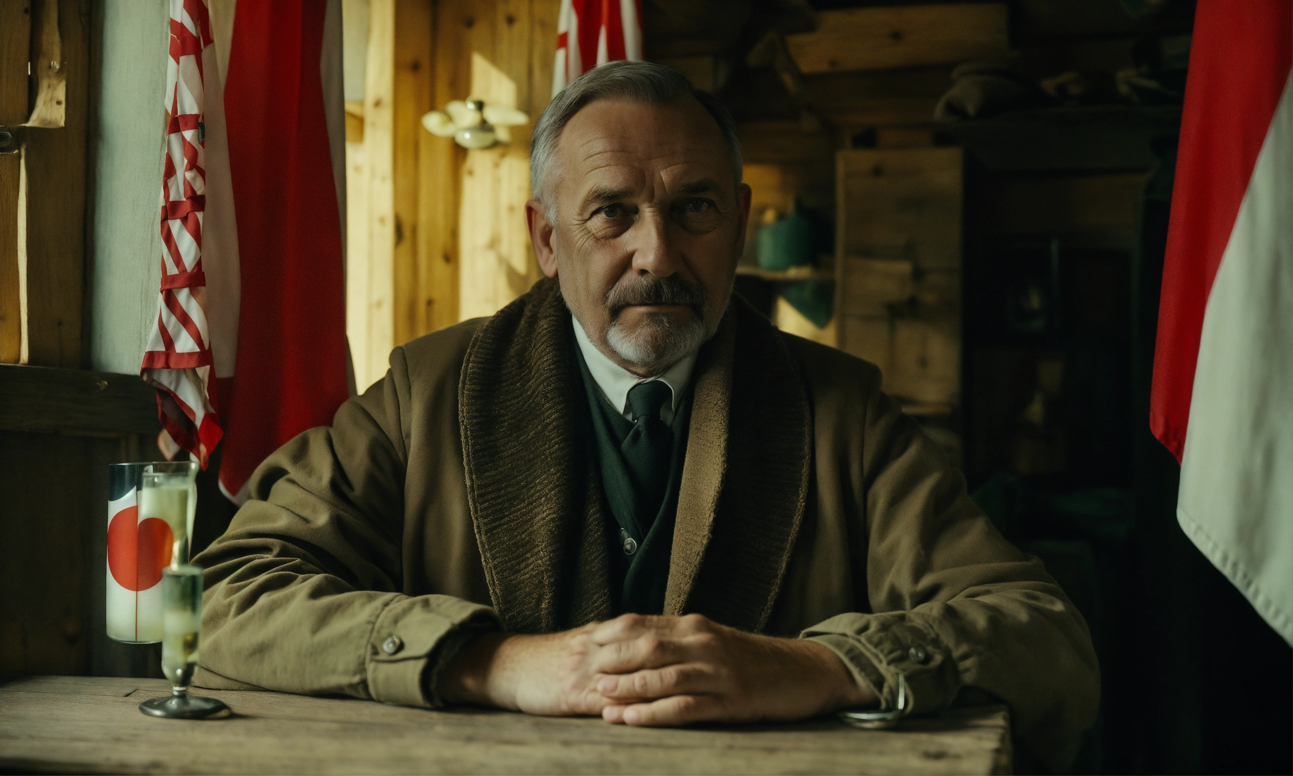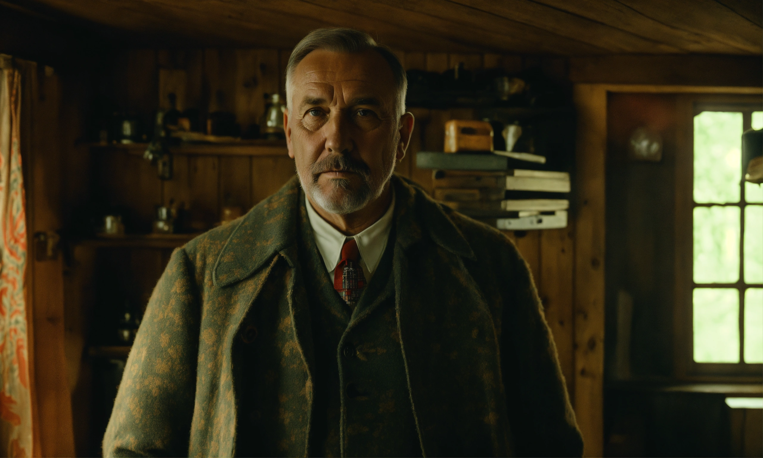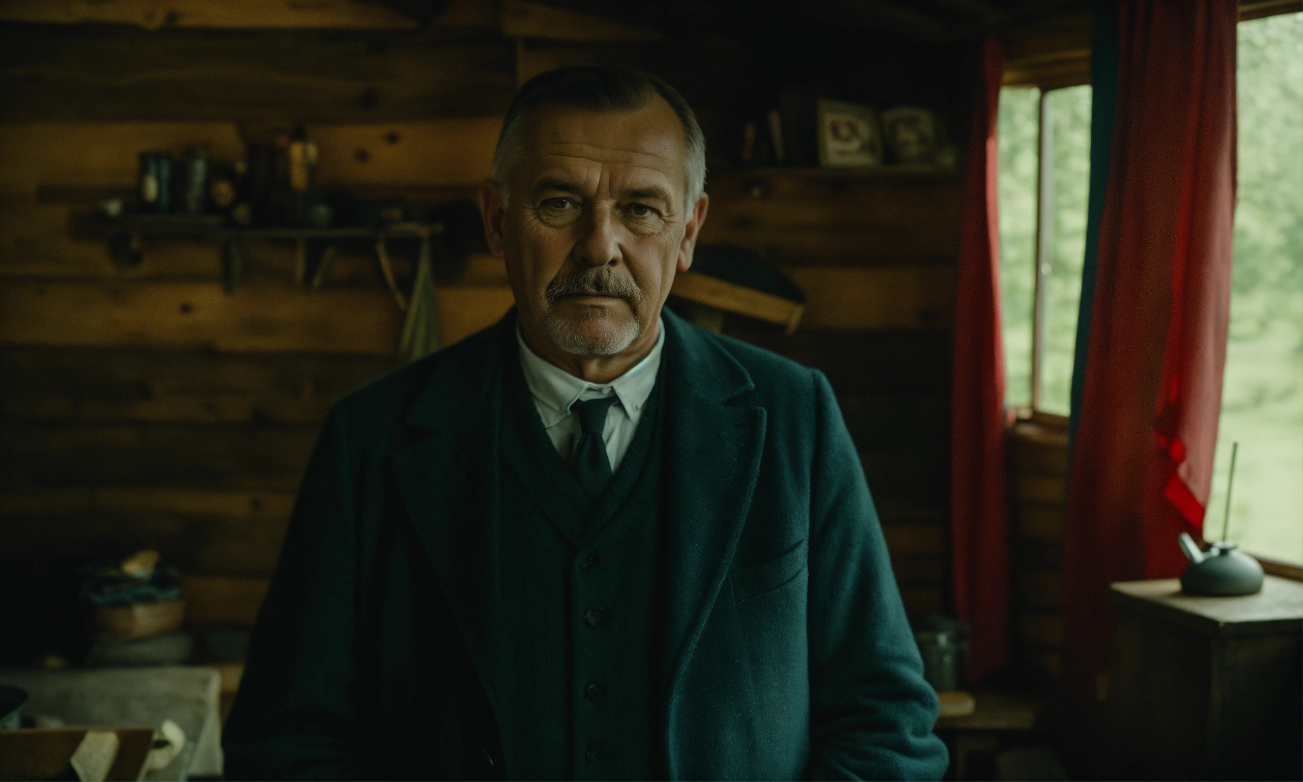 Retro warszawa 1920-1930, middle-aged man, inside a cozy cabin, looks at the camera at half height, short hair. poland flag