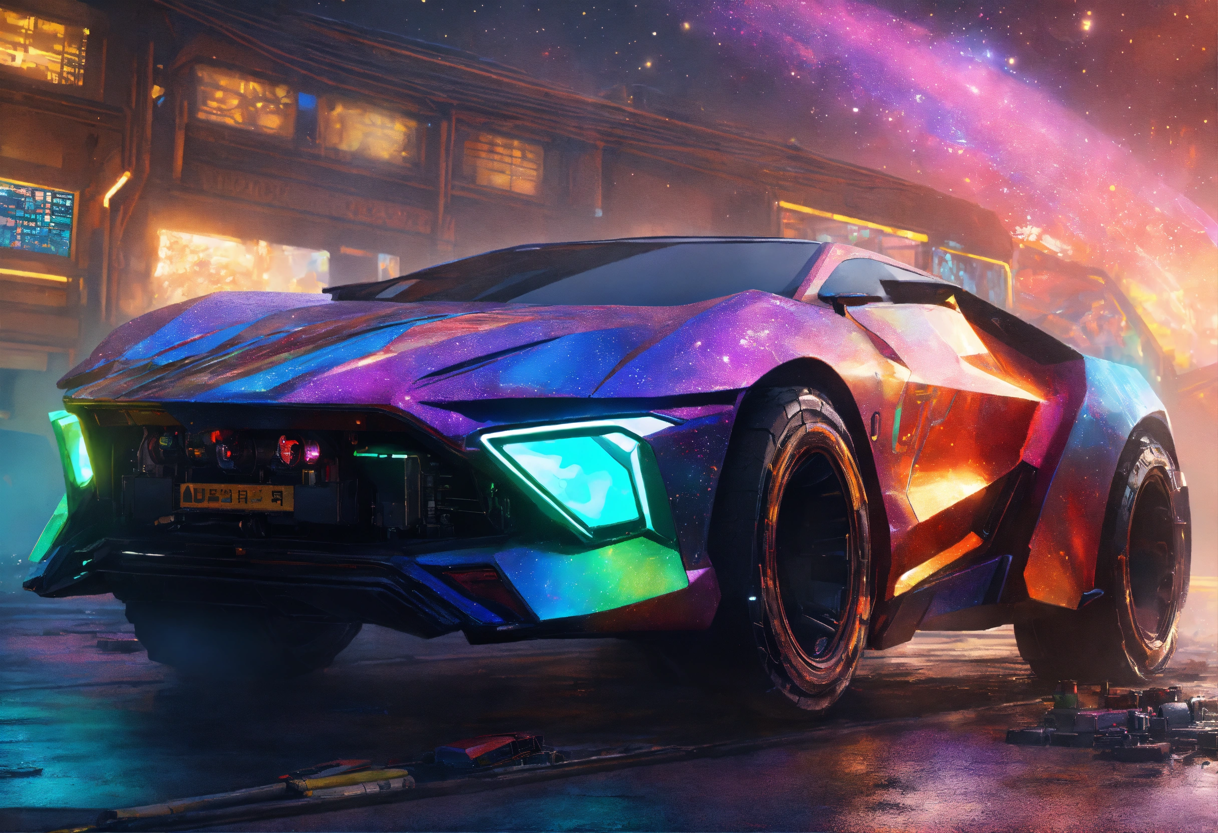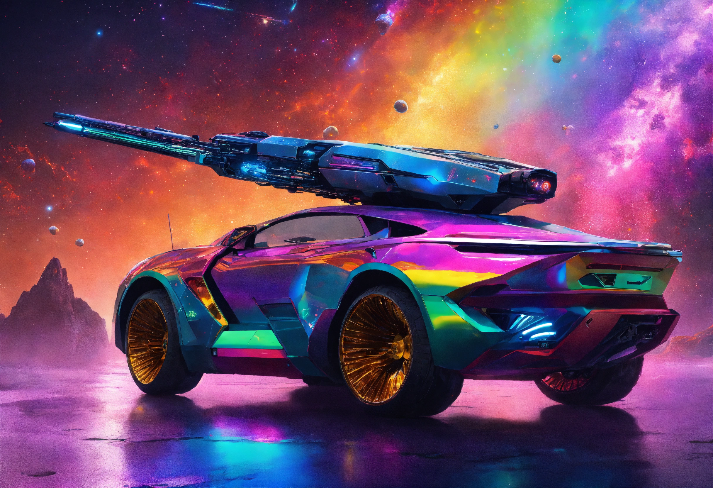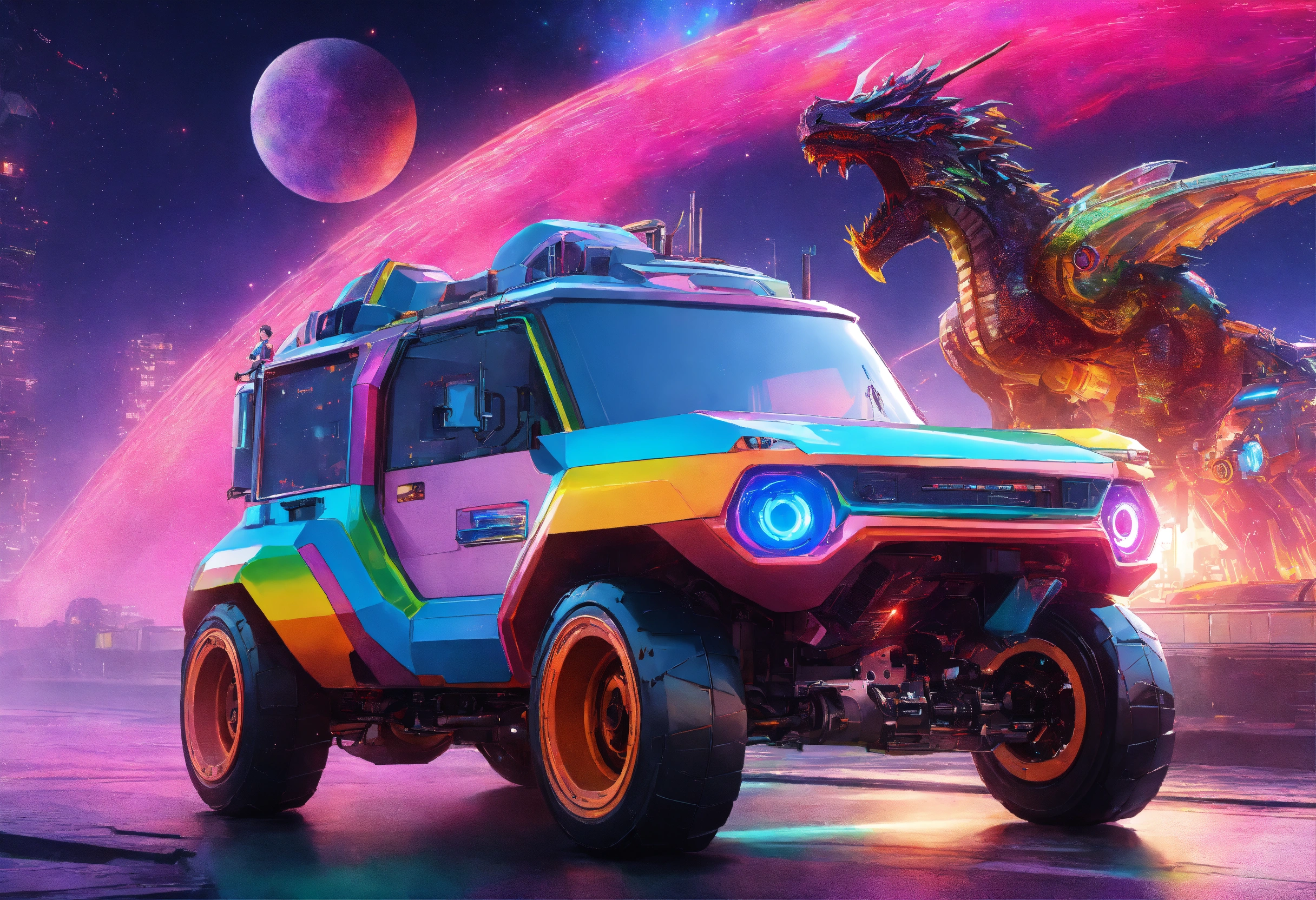 A future locomotive in the galaxy and a mechanical, cyberpunk dragon, rainbow-colored car body, 8k, masterpiece