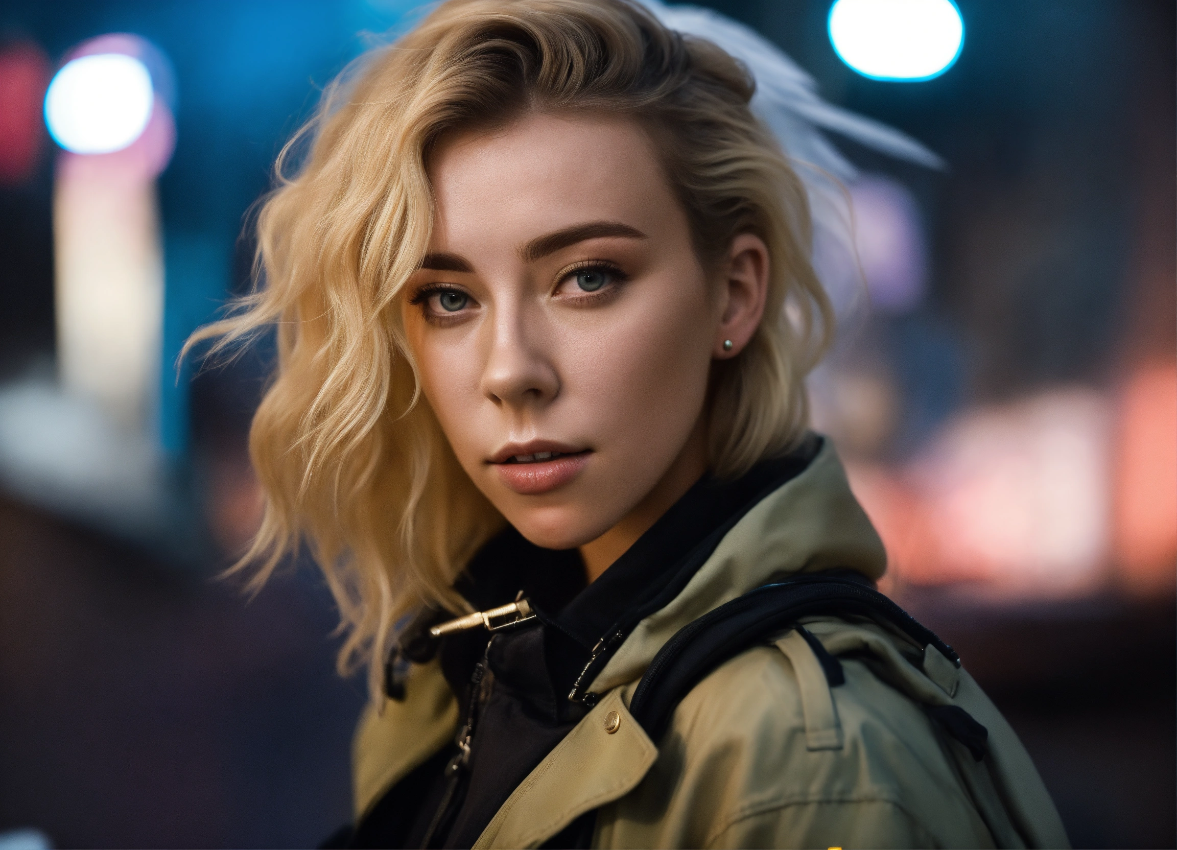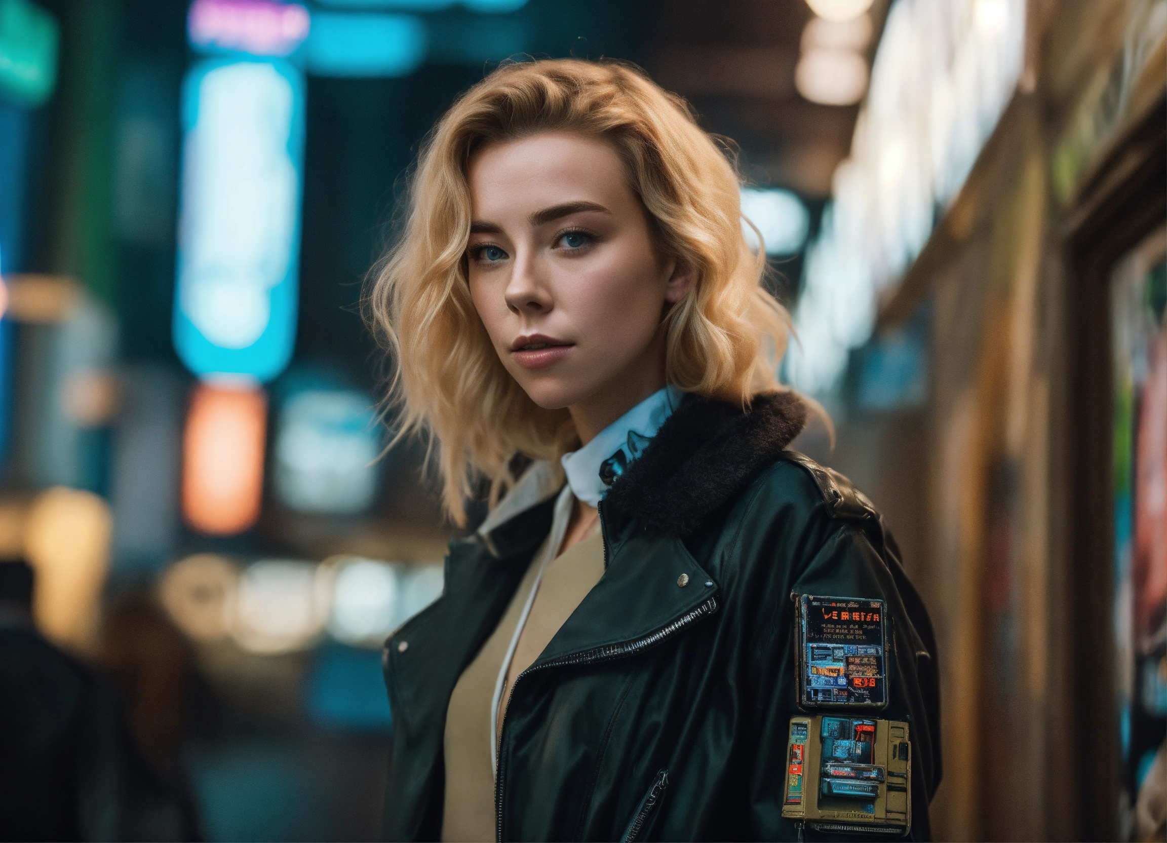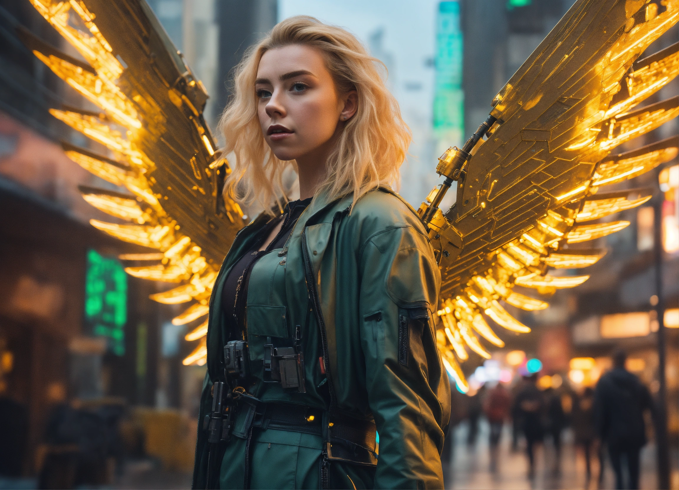 Text full body top view real life photo of a women looking aroused at the camera she looks a bit like vanessa kirby has blond hair 18 year old woman with big angelwing's wearing mechsuite in a cyberpunk like city