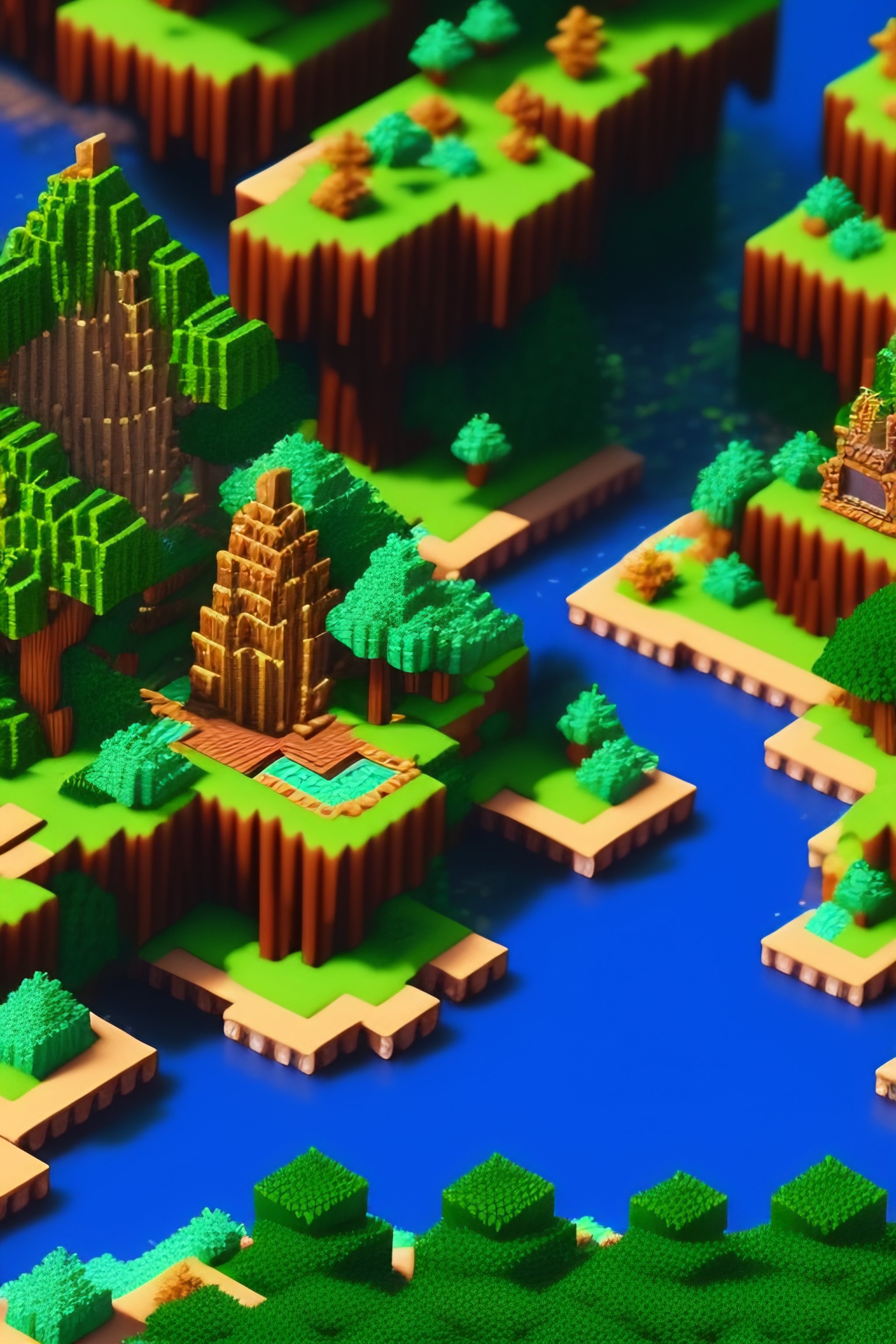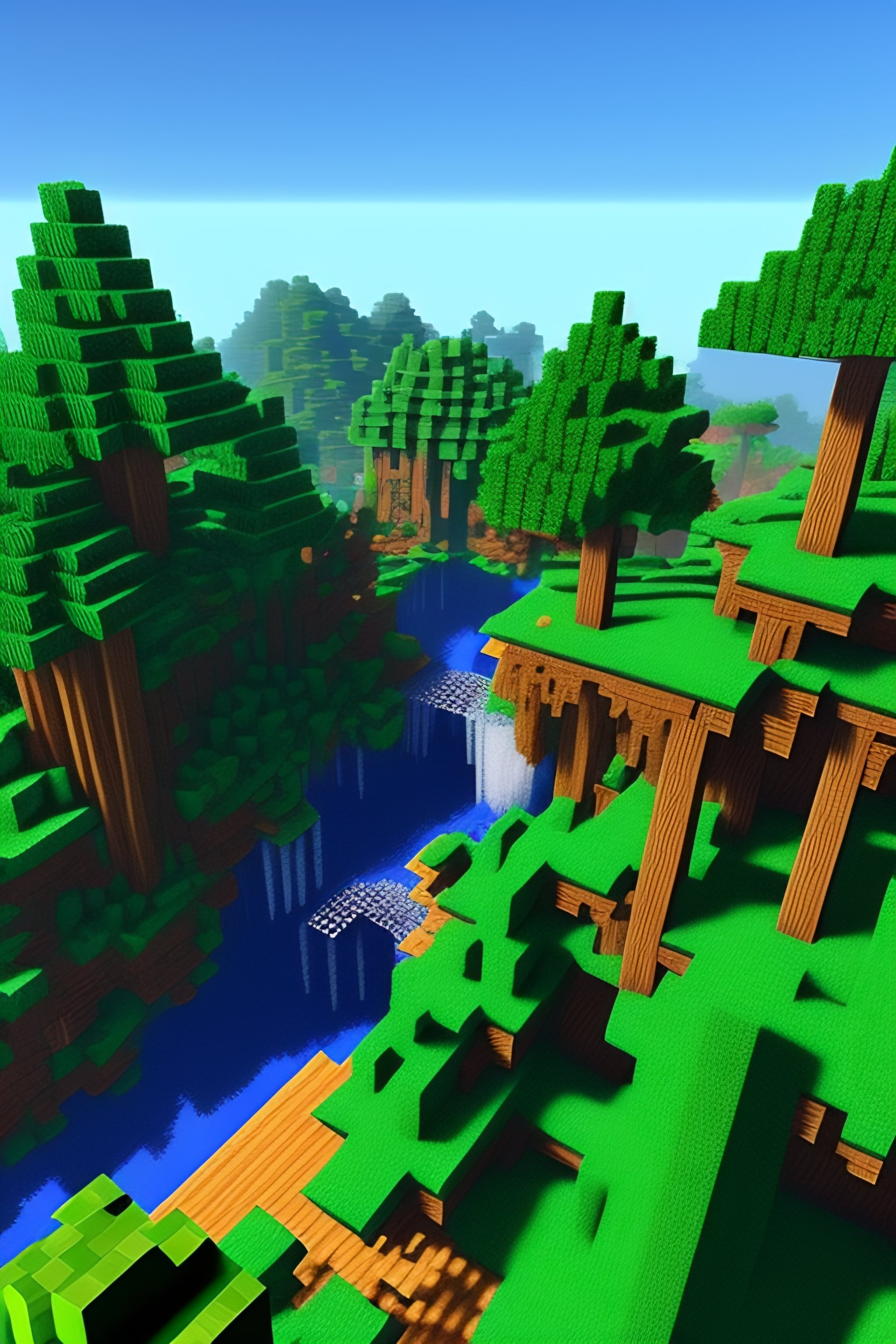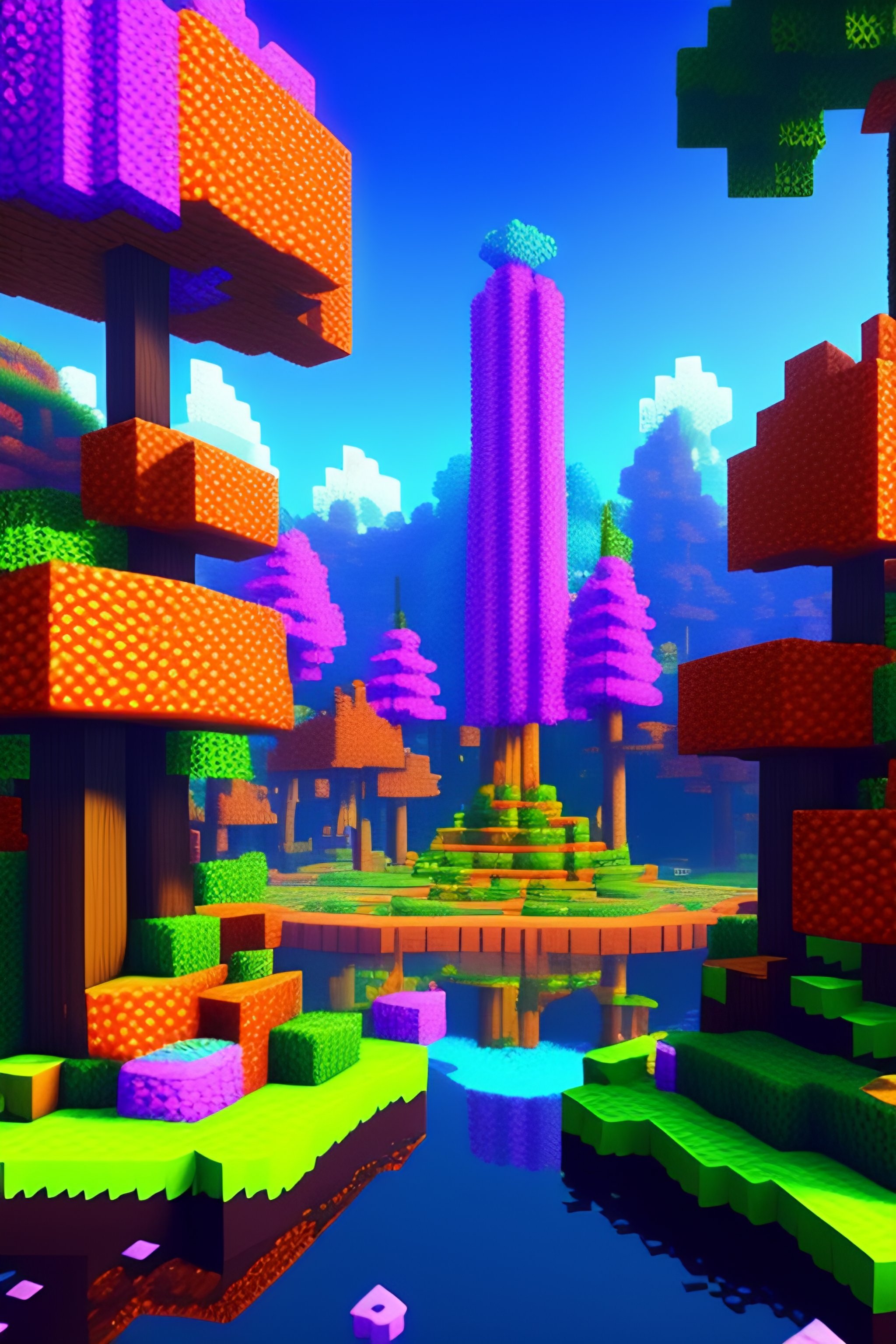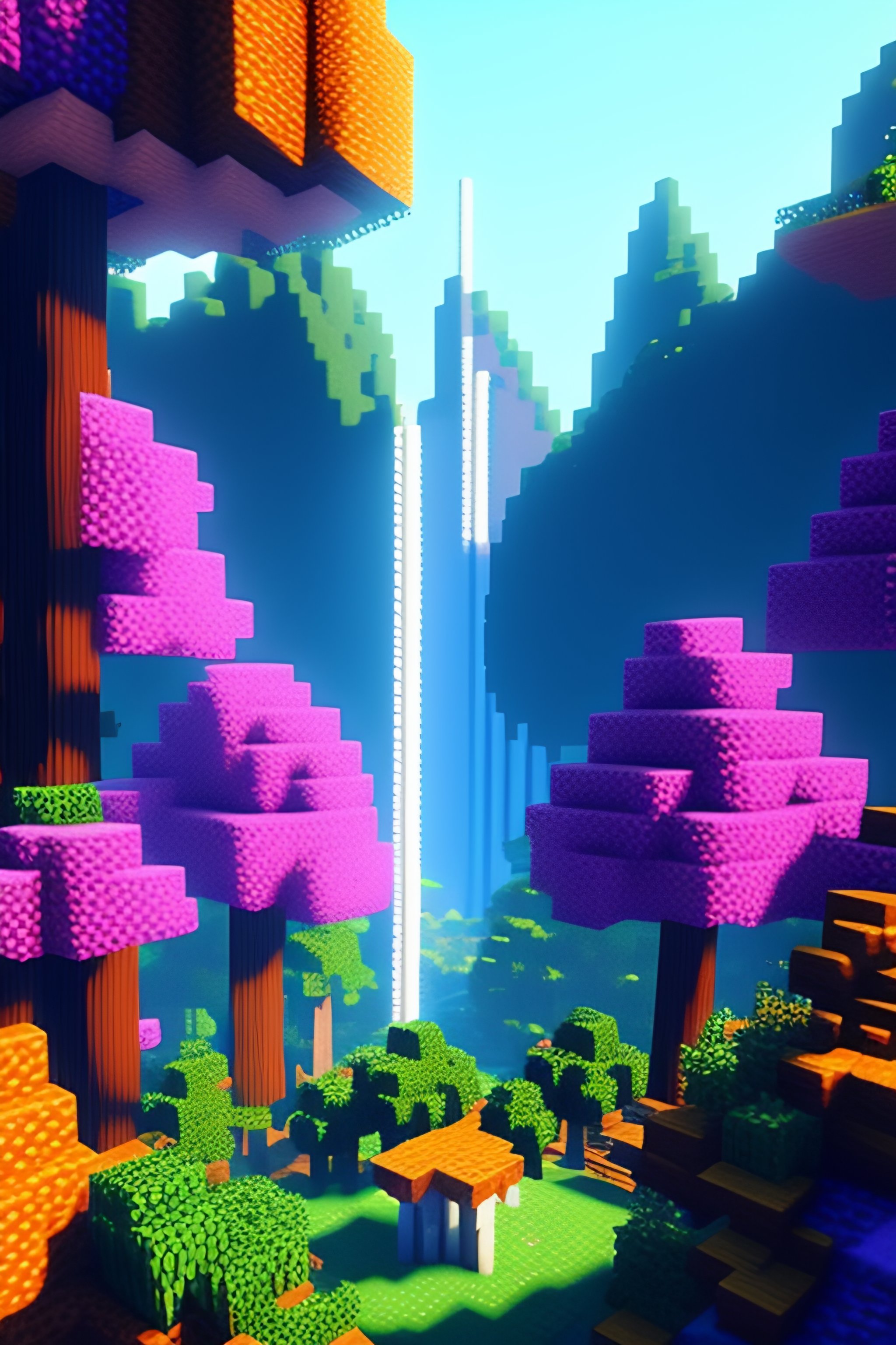 Mystical forest in minecraft, particles, rain, square, big mushrooms, hidden ancient city, minecraft village, different color trees, city, cave, water fall