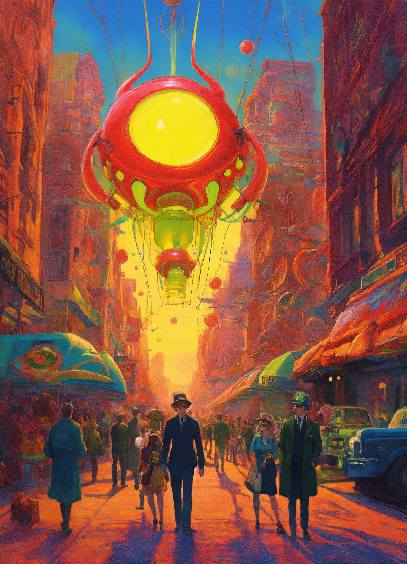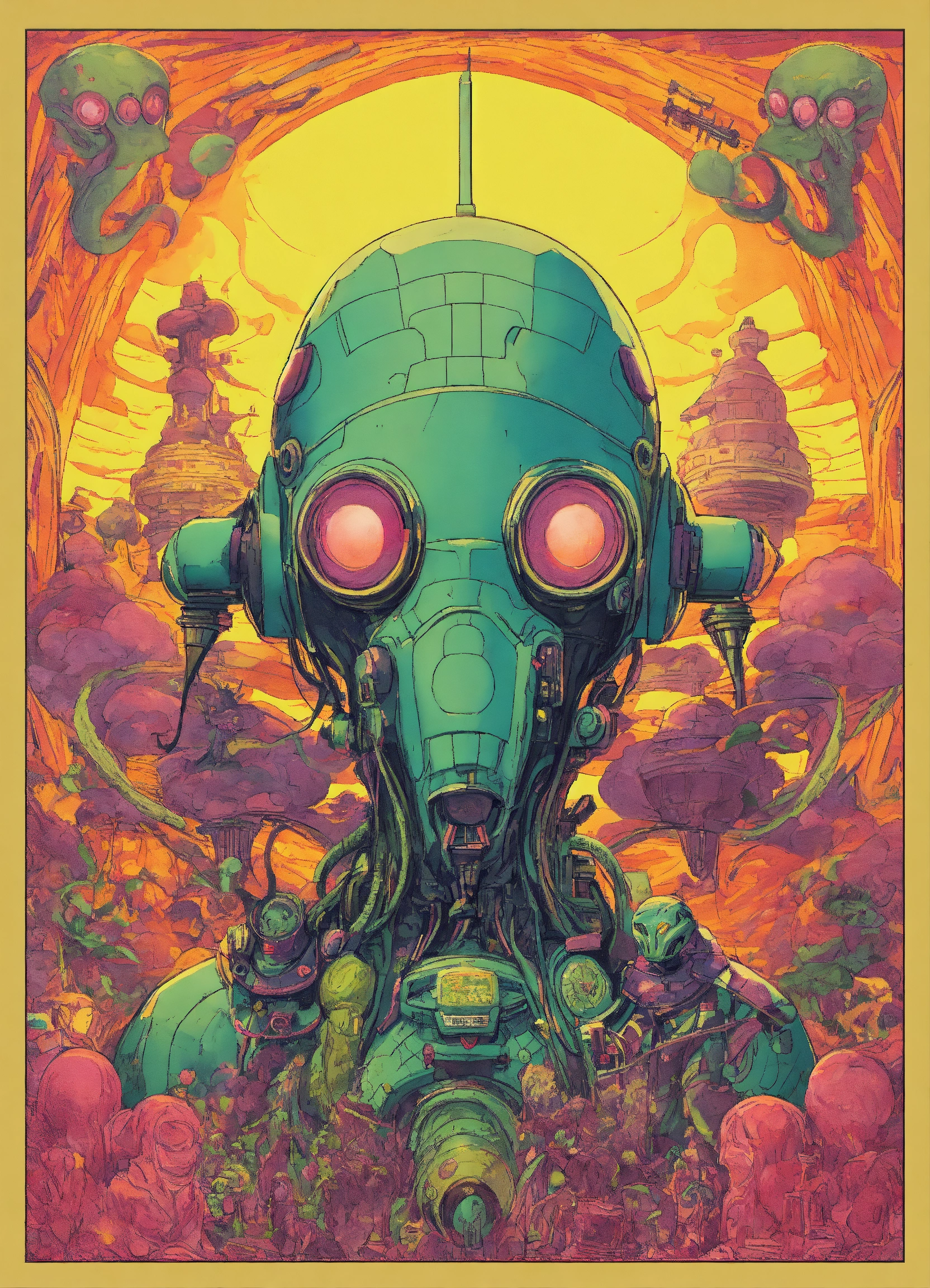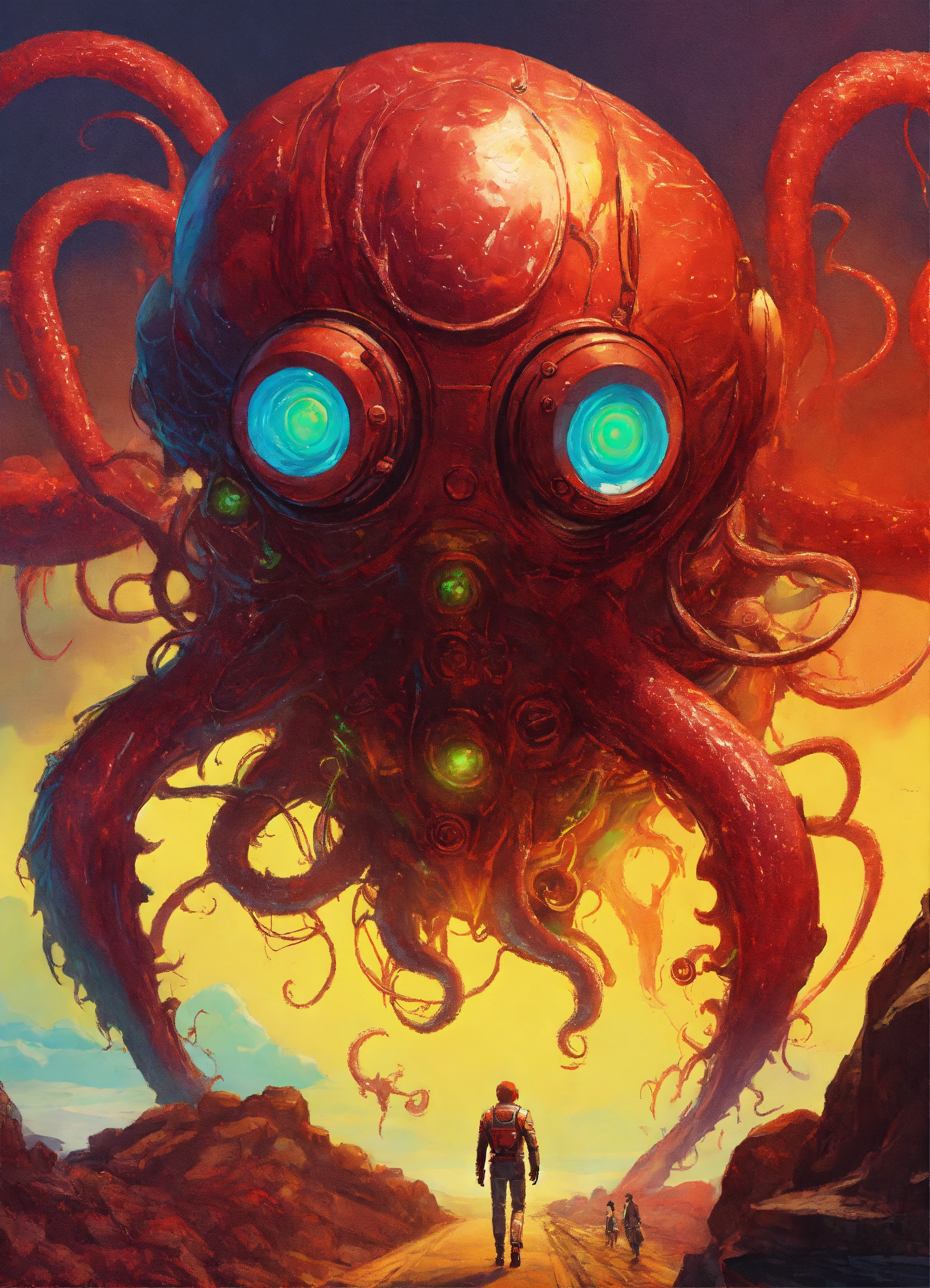 Lovecraftian aliens in ironman style, trending on art stations, chaotic lighting, optical illusions, german romanticism, flcl, 60s kitsch and psychedelia