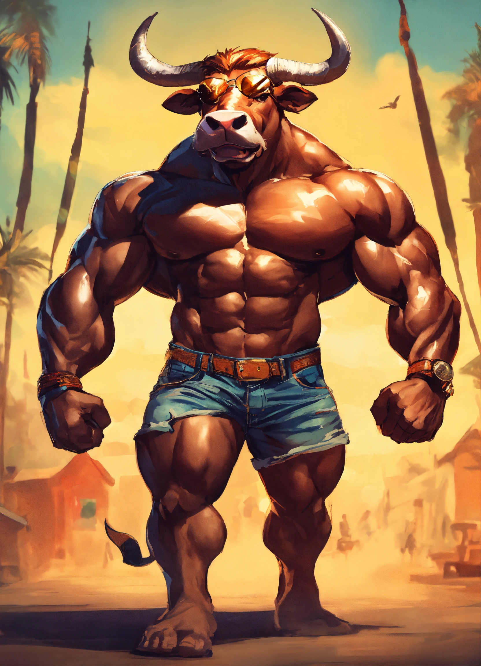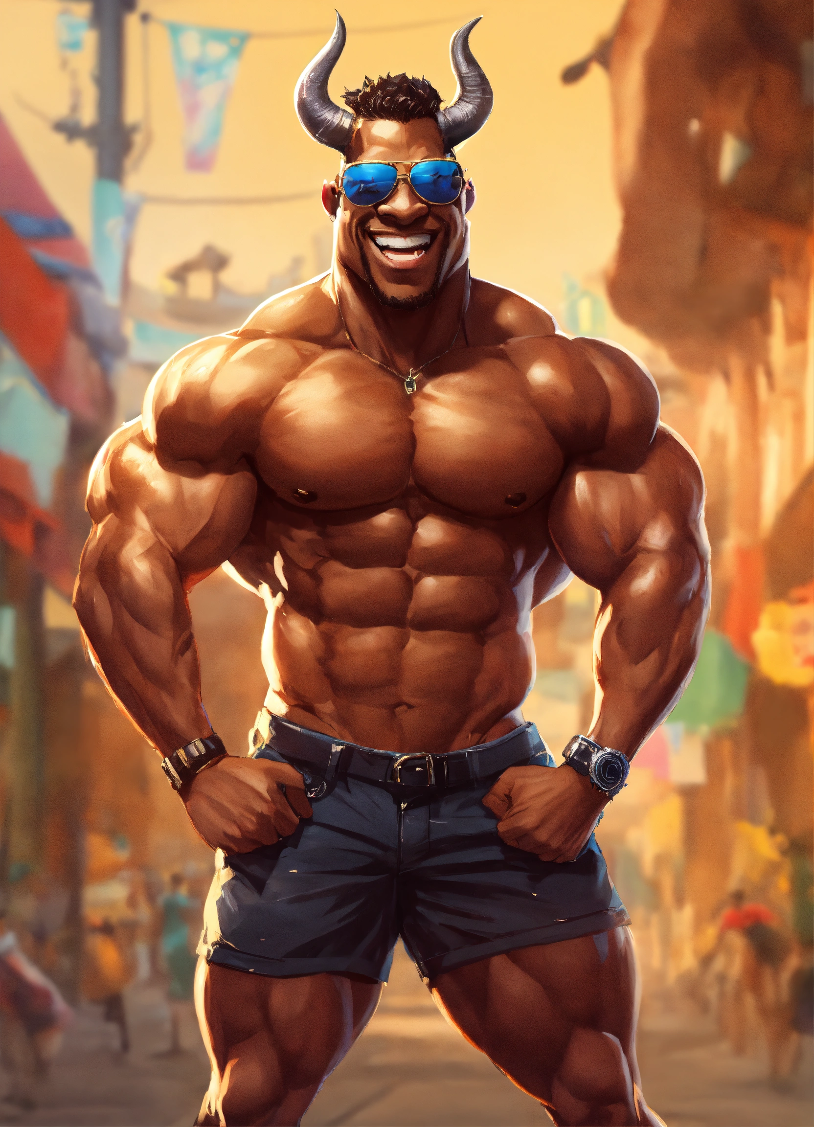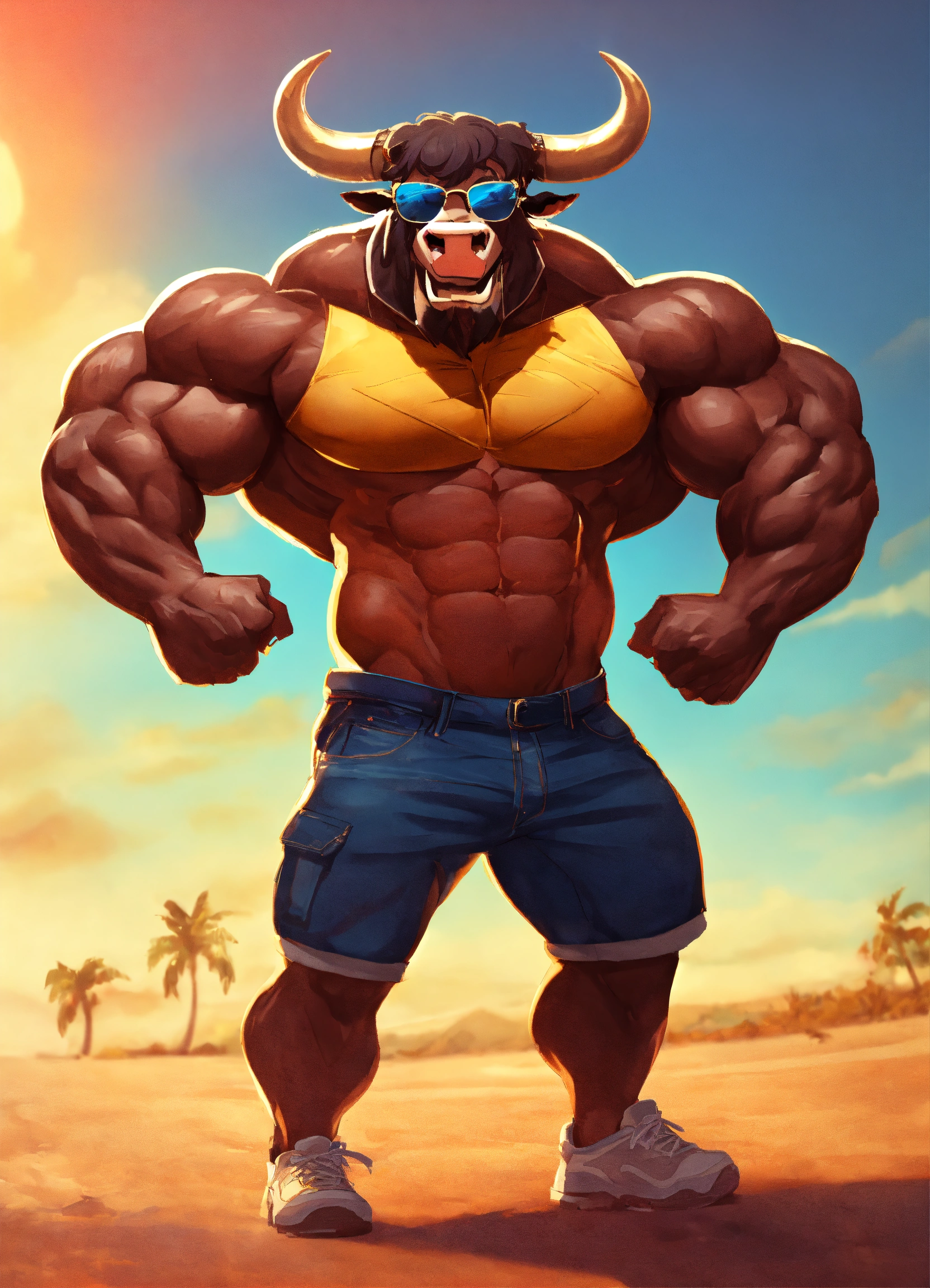 A riped bull with abs and shorts and sunglasses and a bigg smile that is flexing his biceps