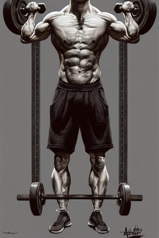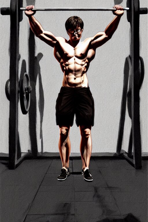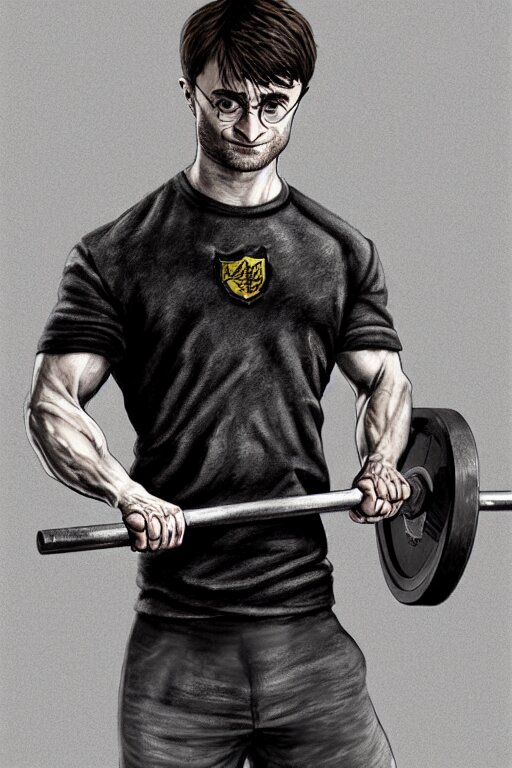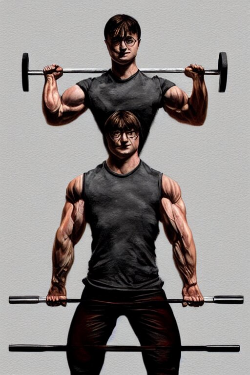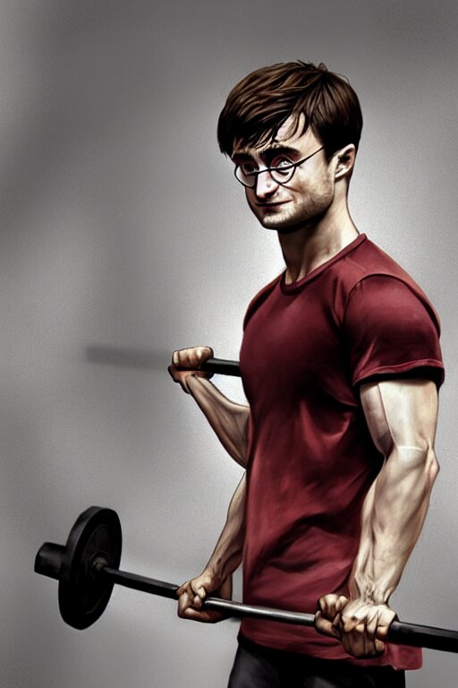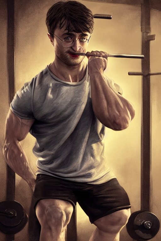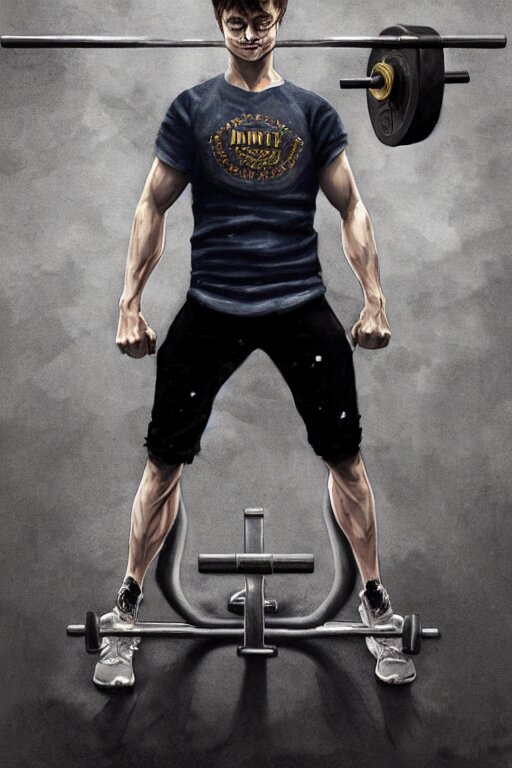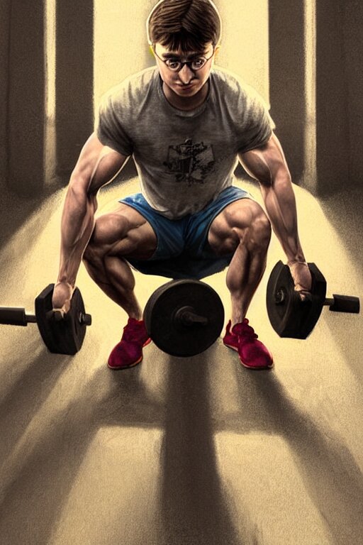 Highly detailed rendering of daniel radcliffe as harry potter doing barbell back squats, dingy workout gym, wearing a muscle tee shirt, muscular deep squats, symmetrical, highly detailed, digital painting, artstation, concept art, smooth, sharp focus, illustration, cinematic lighting, art by artgerm and greg rutkowski and alphonse mucha