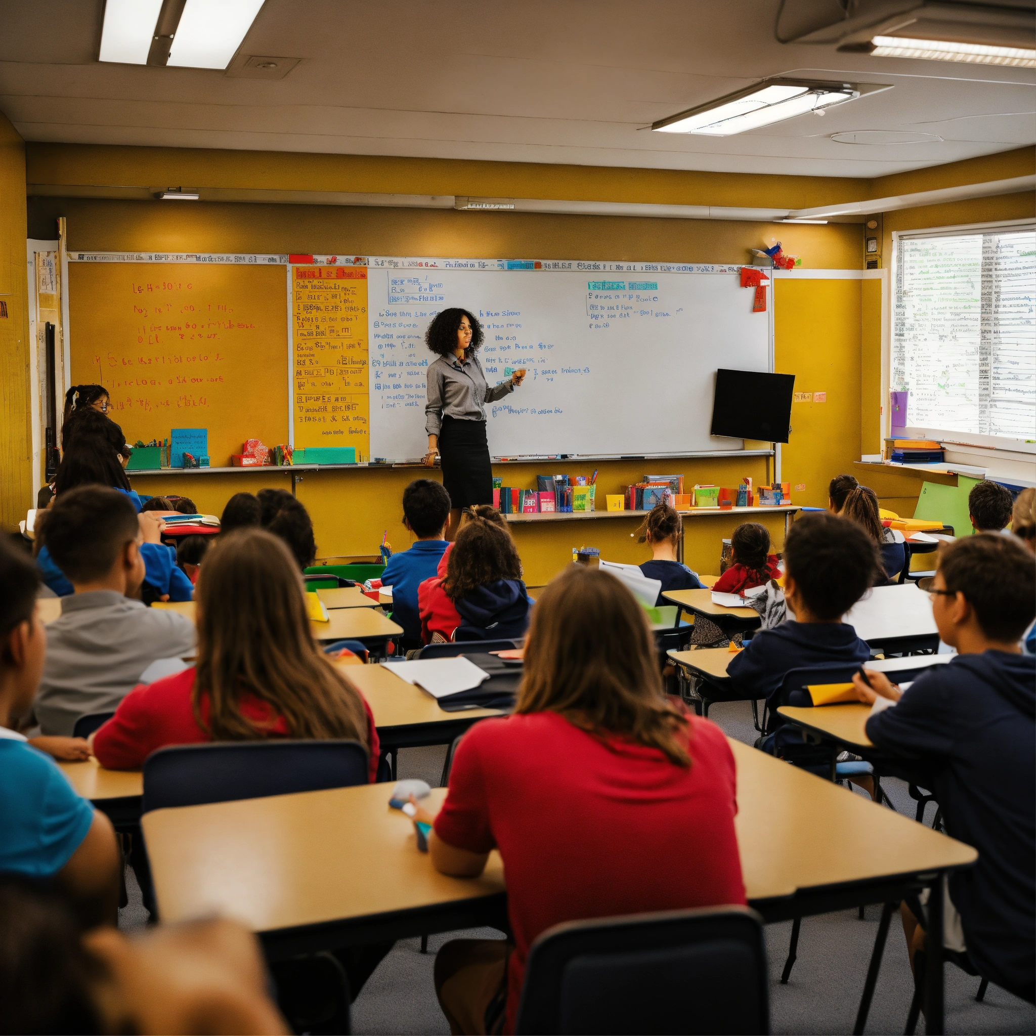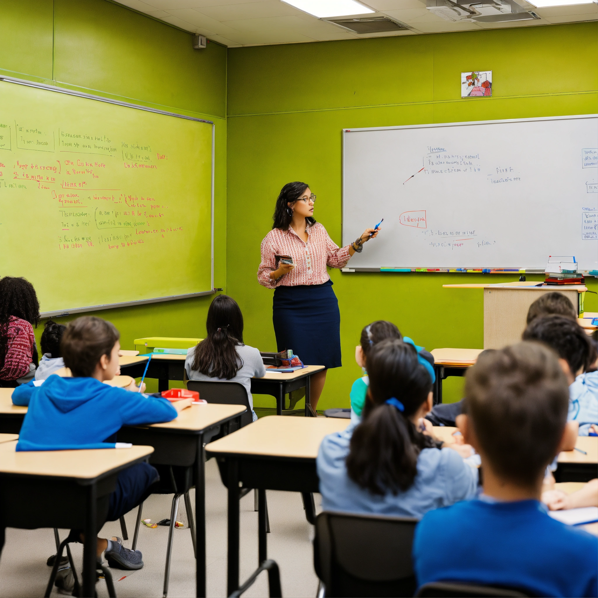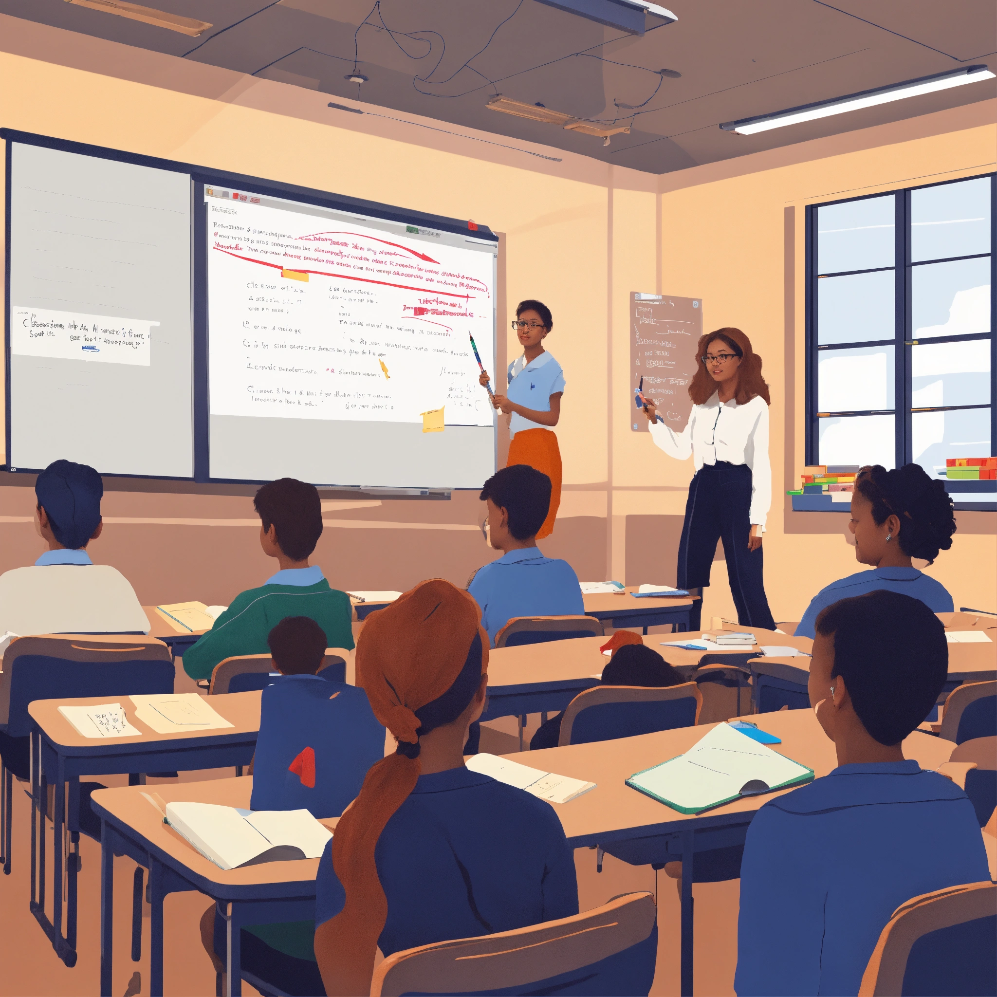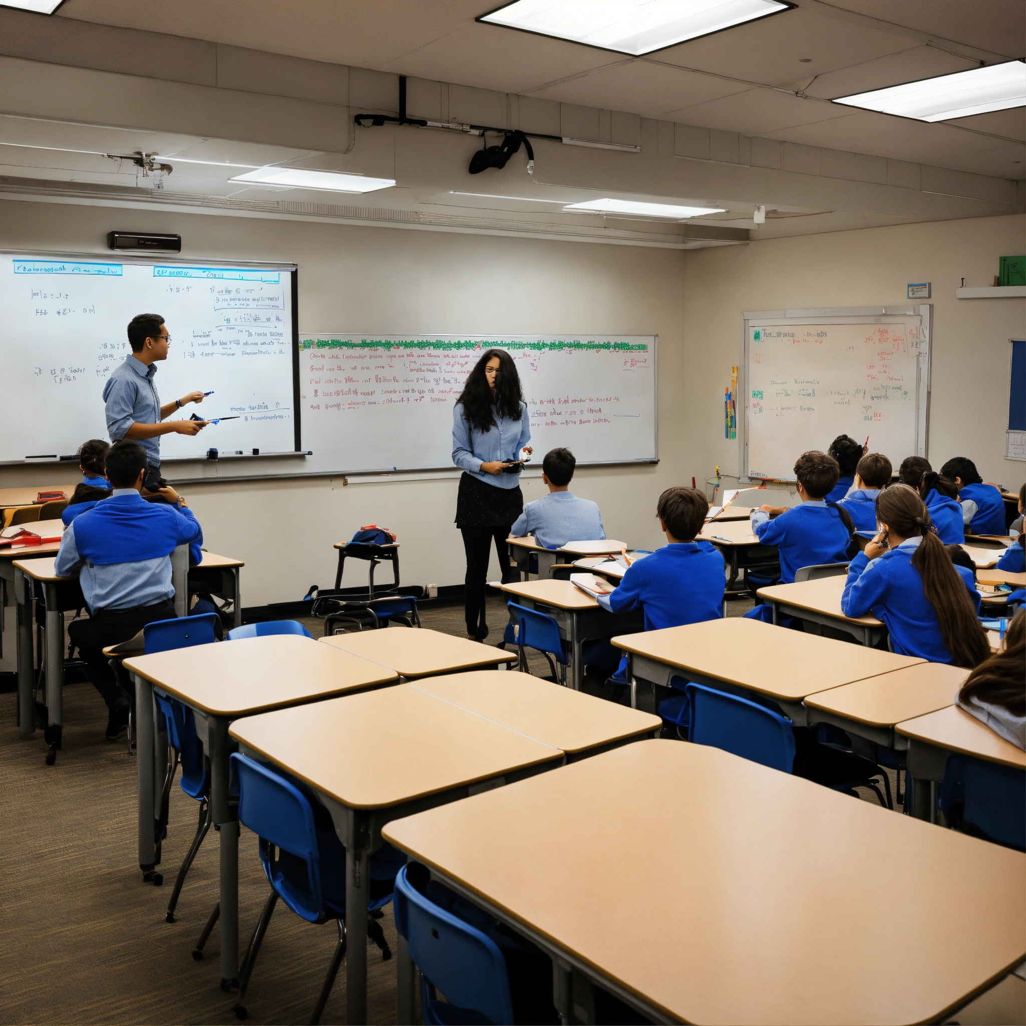 A photo of a classroom with a teacher lecturing in front of a whiteboard, the classroom is full of students taking notes, the teacher is using a pointer to illustrate a point
