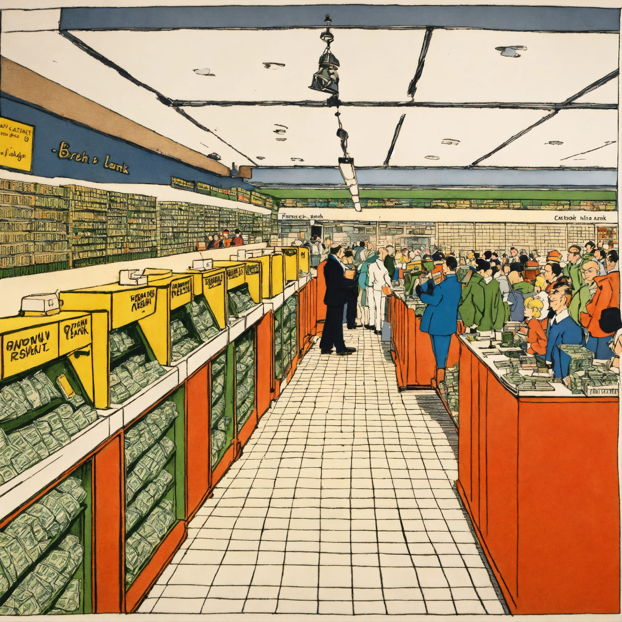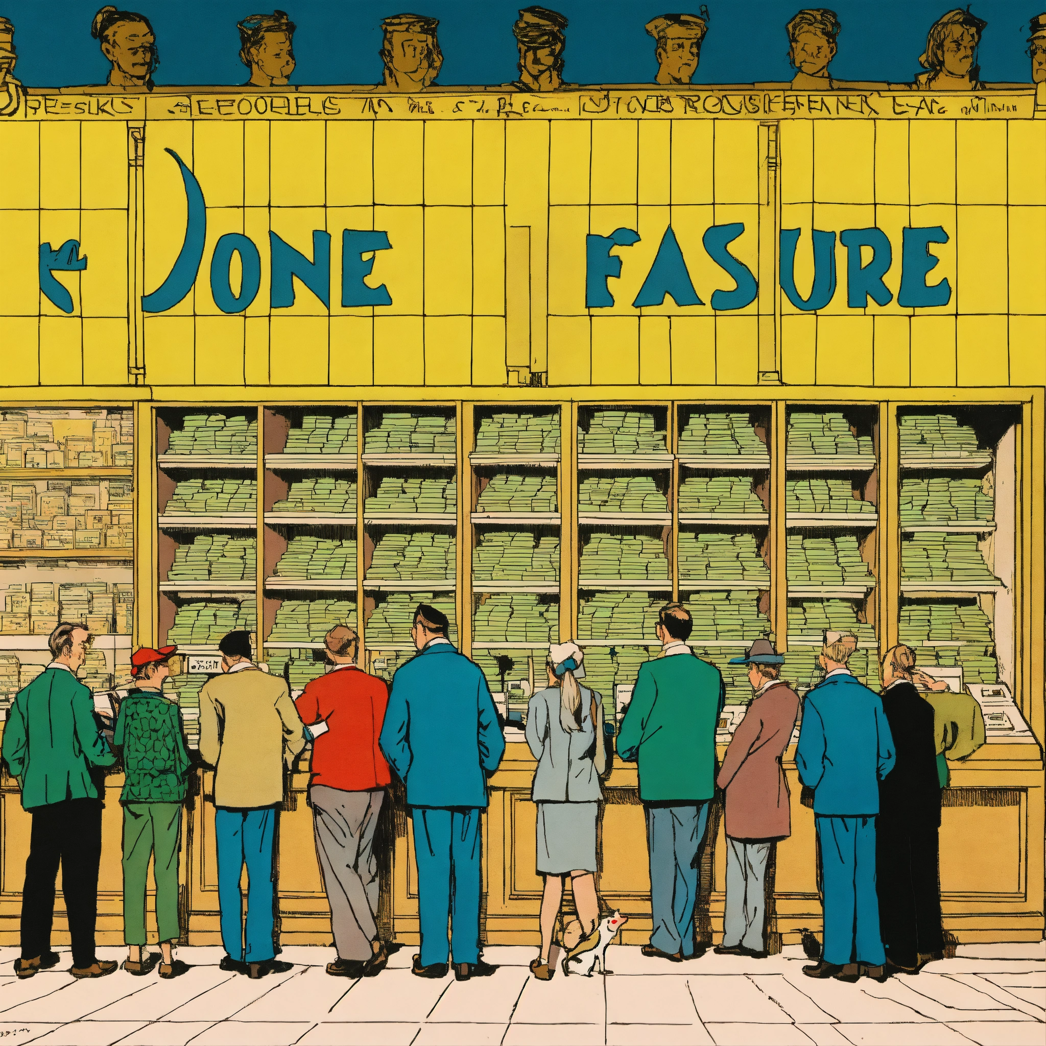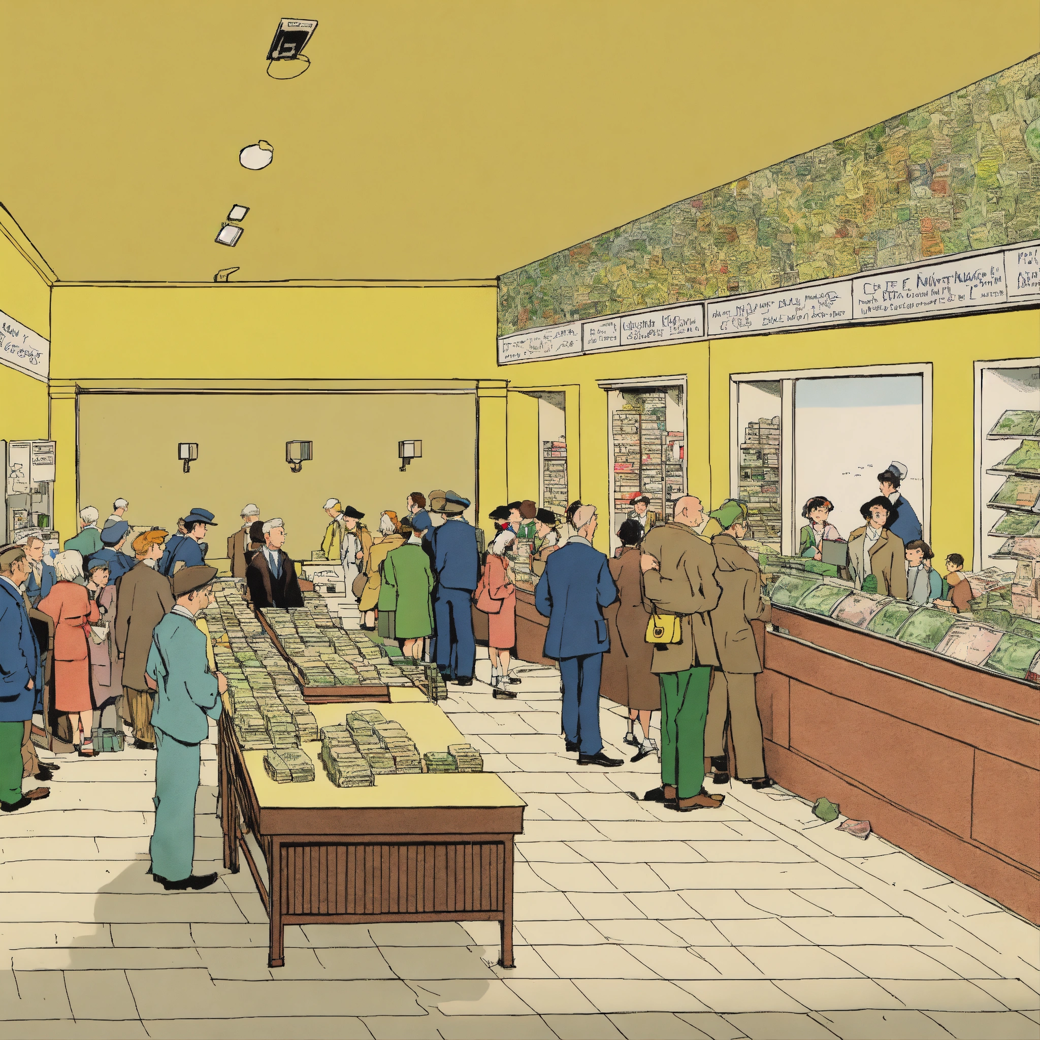 Pen and ink, illustrated by hergé, a very long line of people standing to the bank cashier, people holding stacks of money within the cashier room, background space and earth