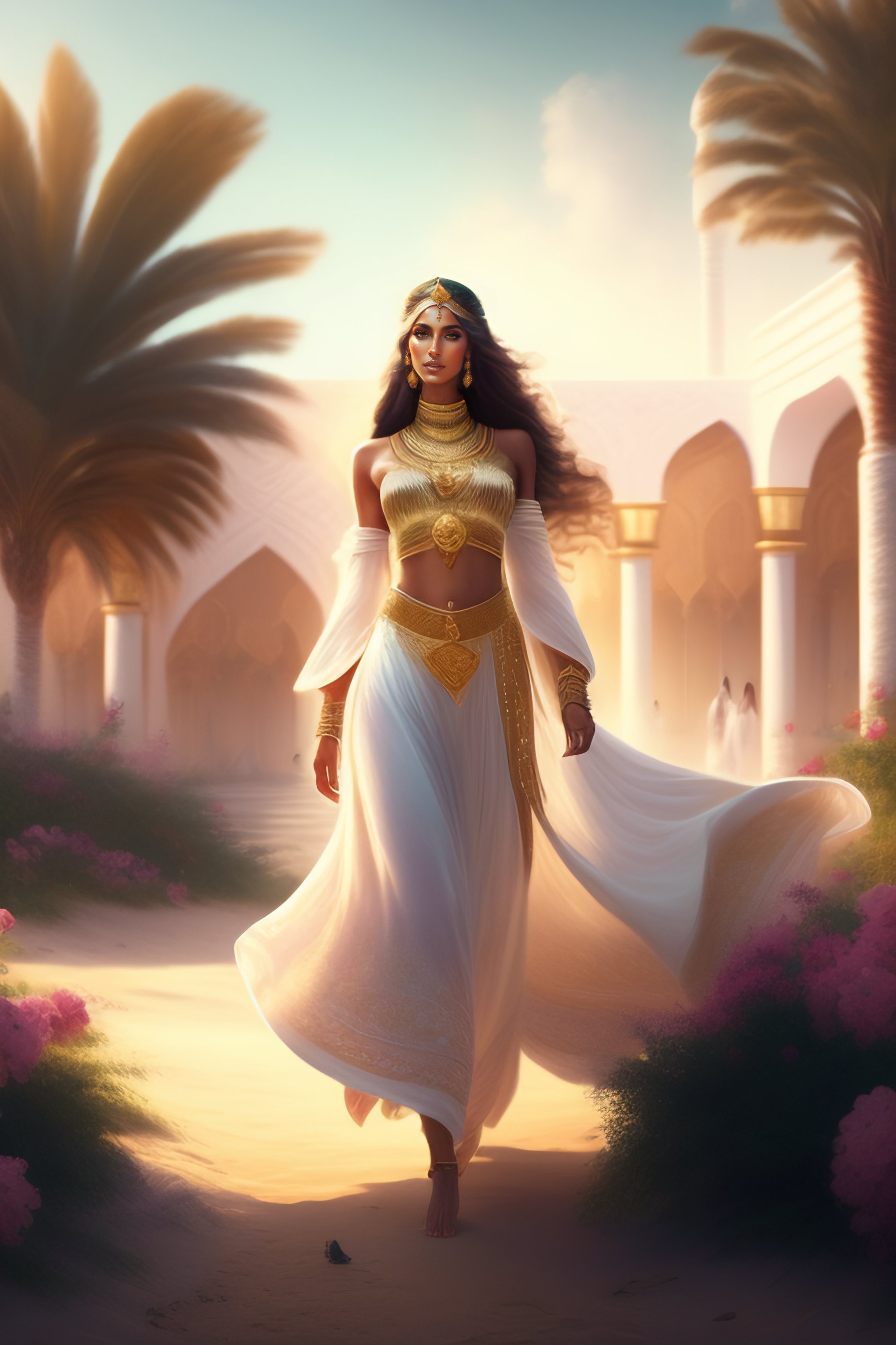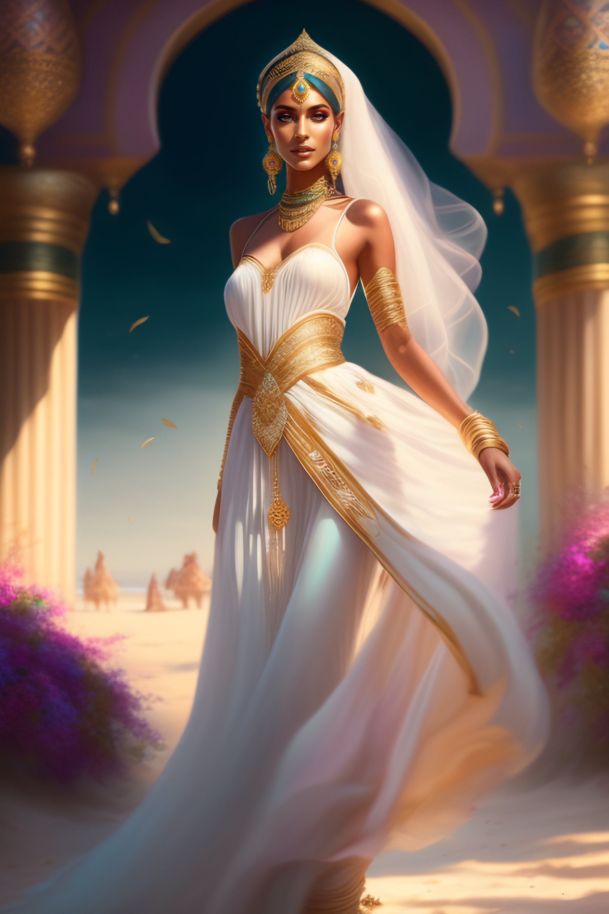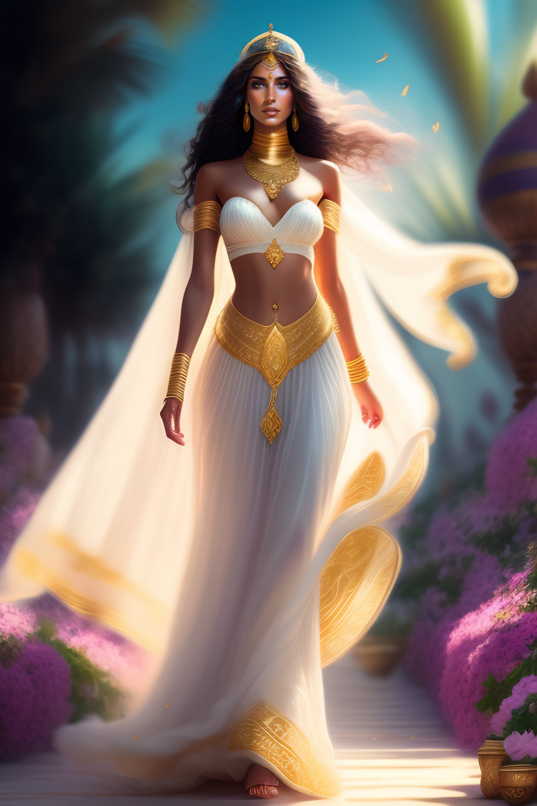 Beautiful arabian princess wearing white clothes and gold jewels dancing in palace near beach with greeneries and colorful flowers, full-body view, greg rutkowski, ultra detailed, volumetric lighting