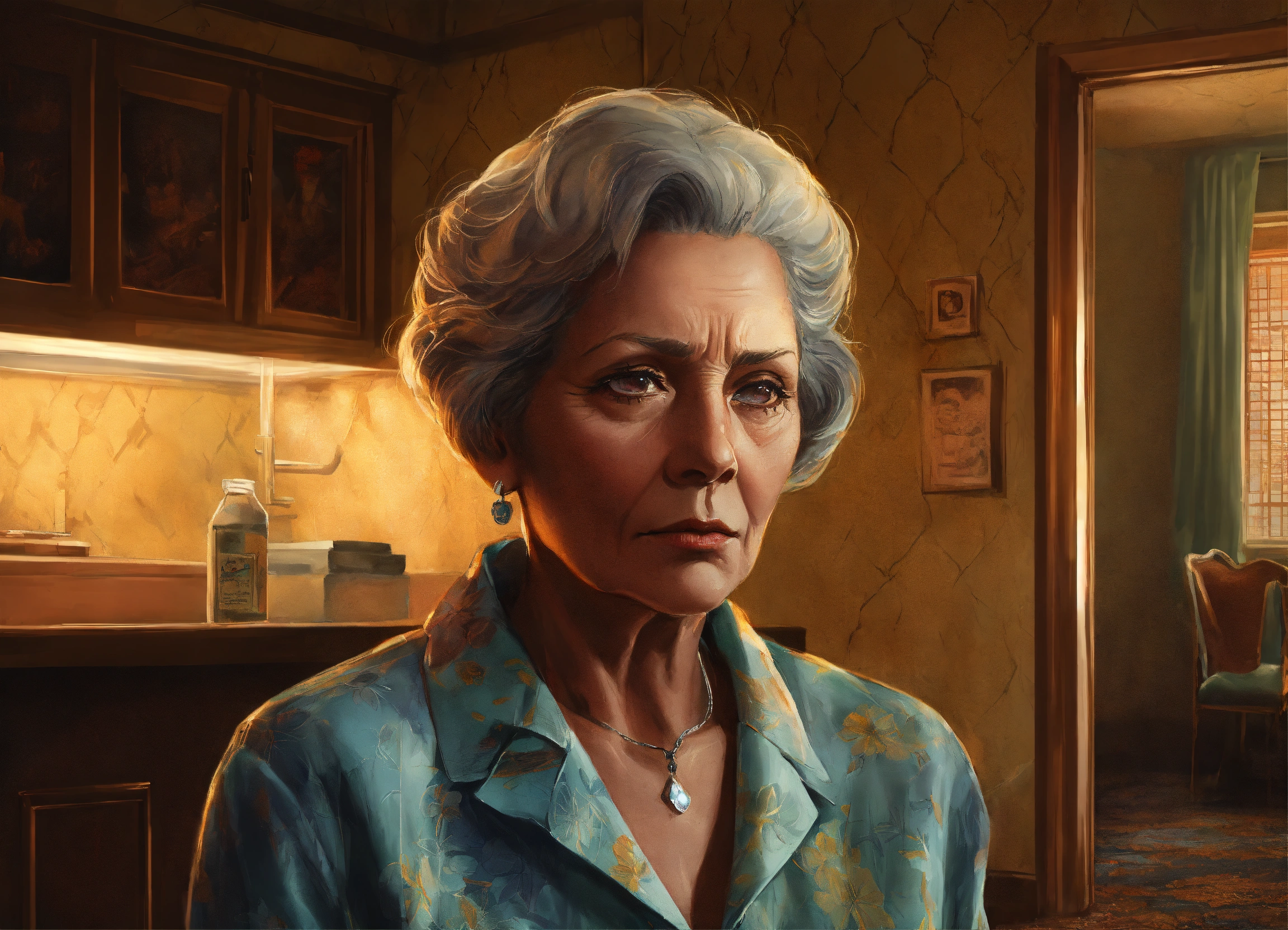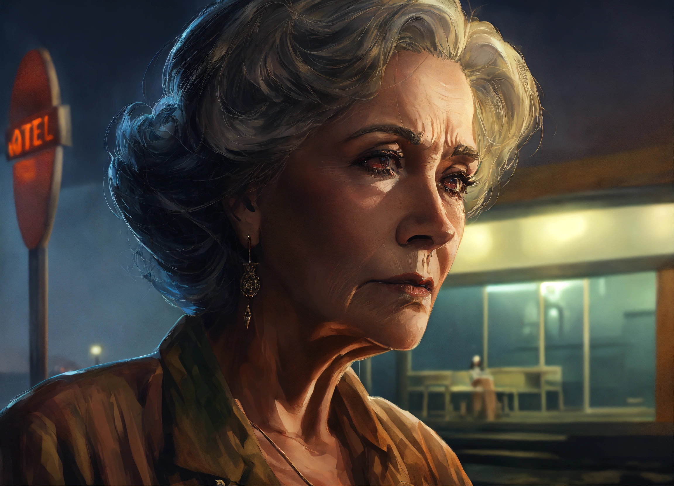Close up, highly detailed, defiant, dangerous, elder woman regenting a road motel on the gerency room after a counter, dark ambient, sorrow, sadness, concept art, design, digital painting, highly detailed, sharp focus, smooth, art by greg rutkowsky