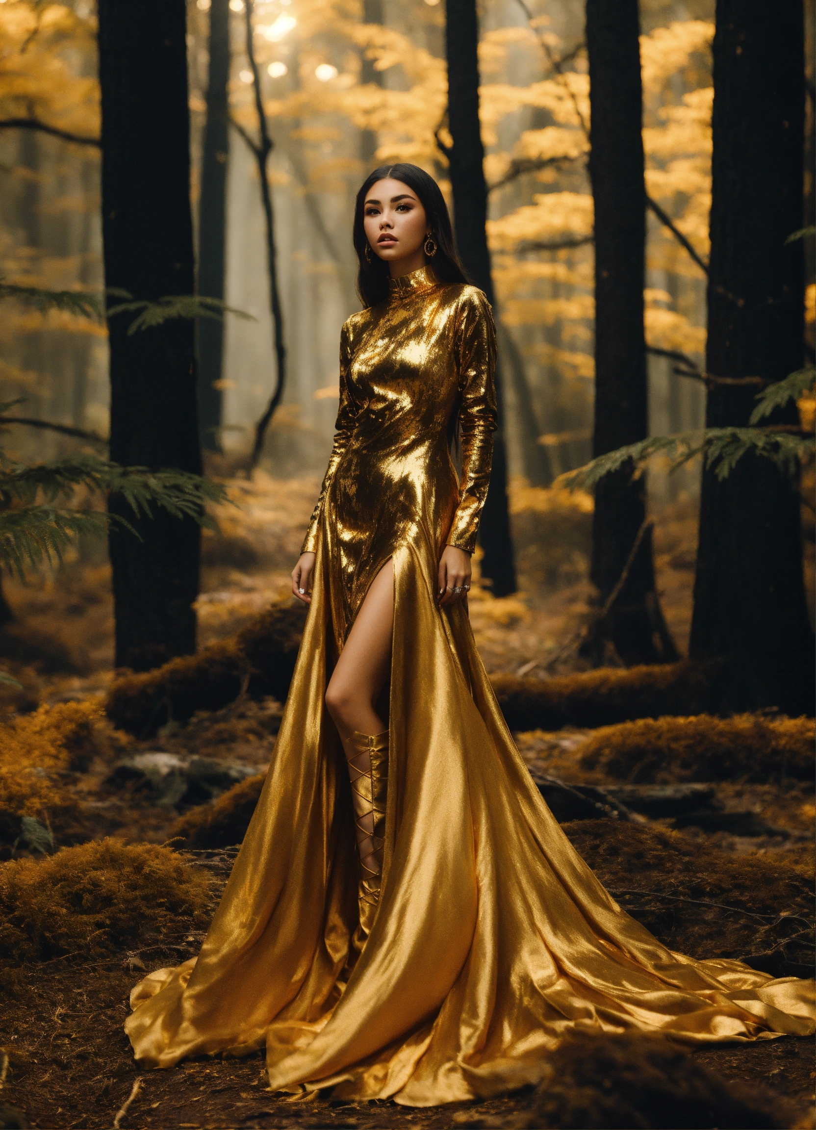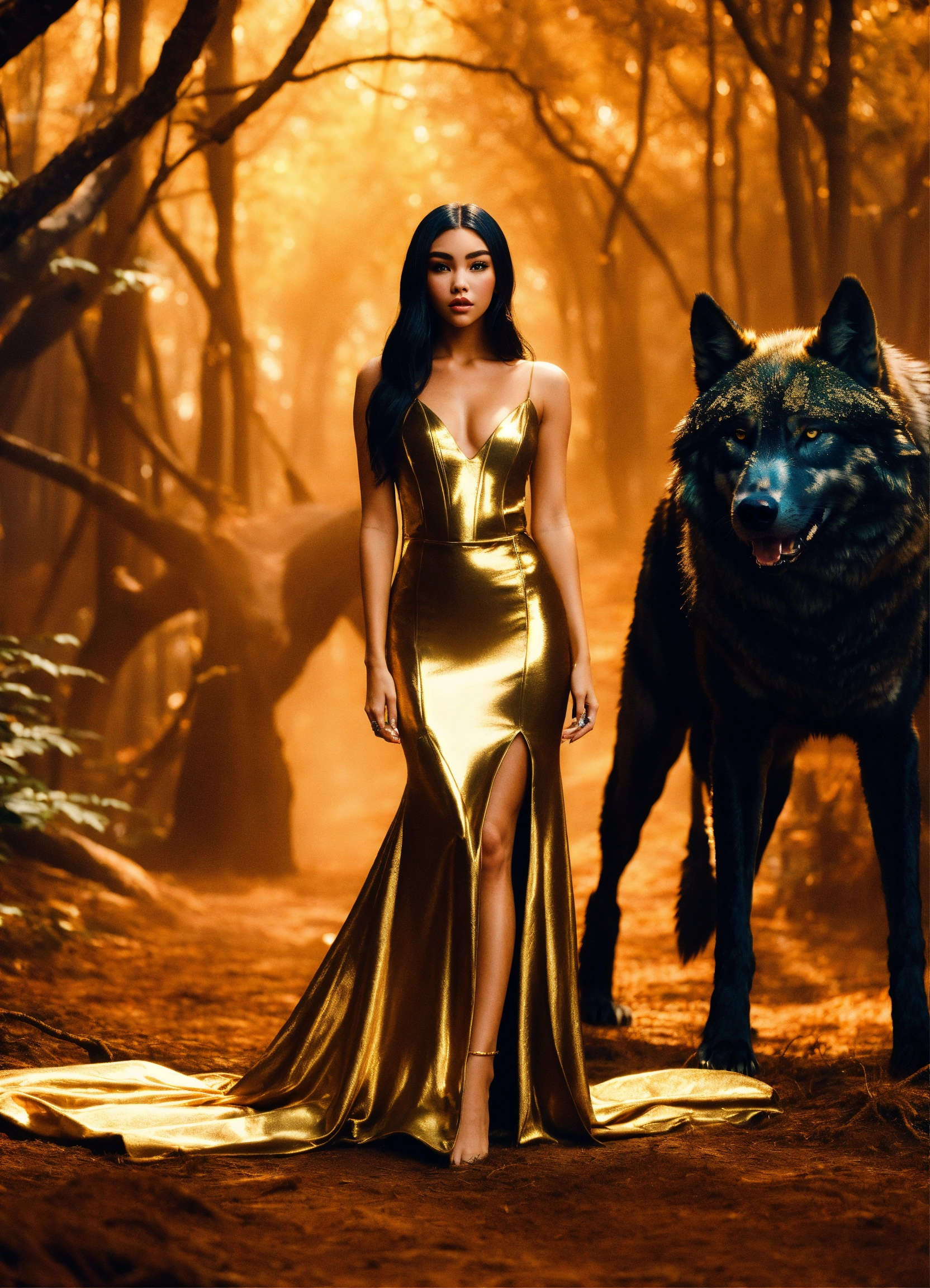 Madison beer in a beautiful gold dress, in a dark futuristic alien forest. a wolf with amber eyes watching her