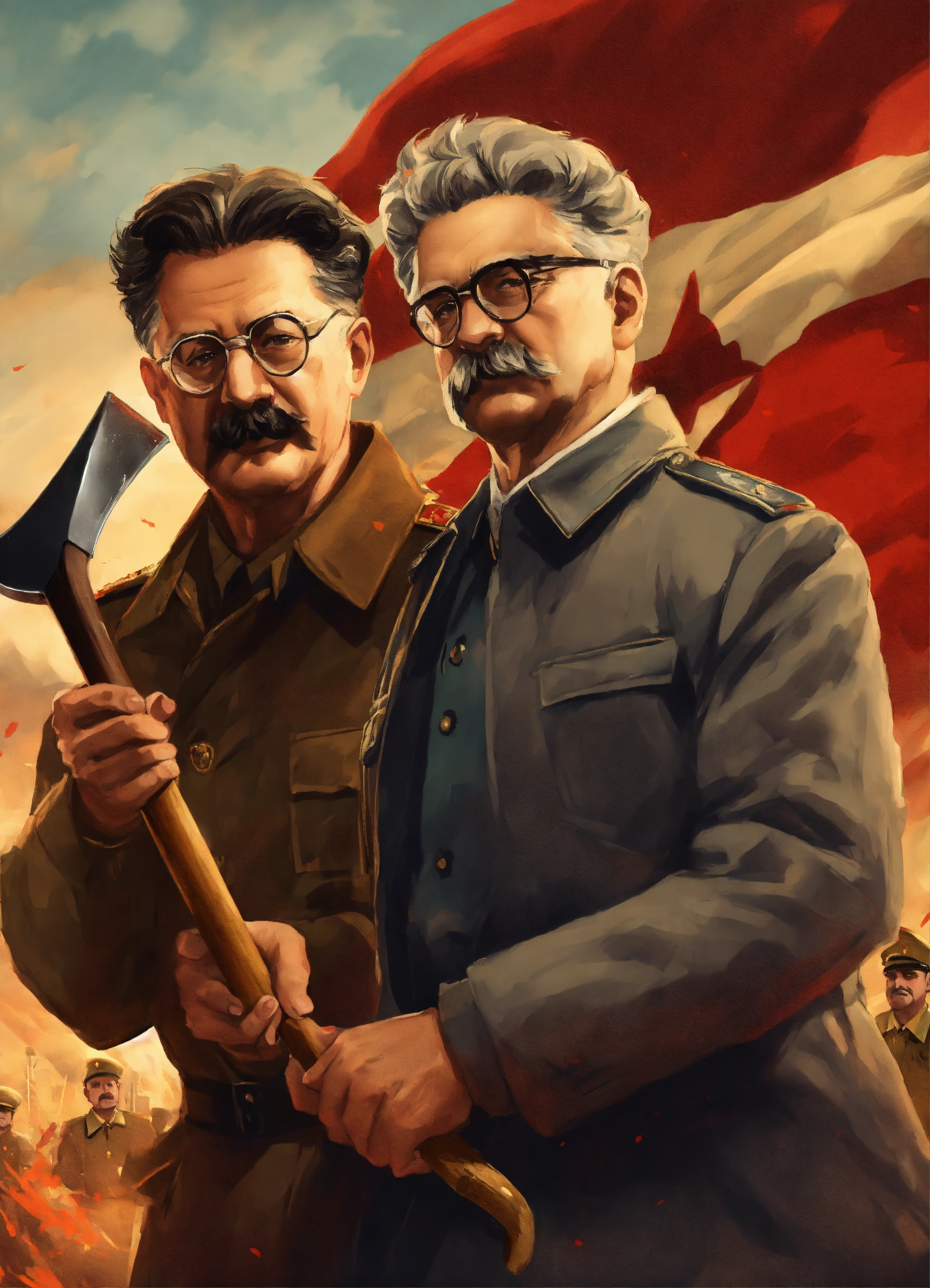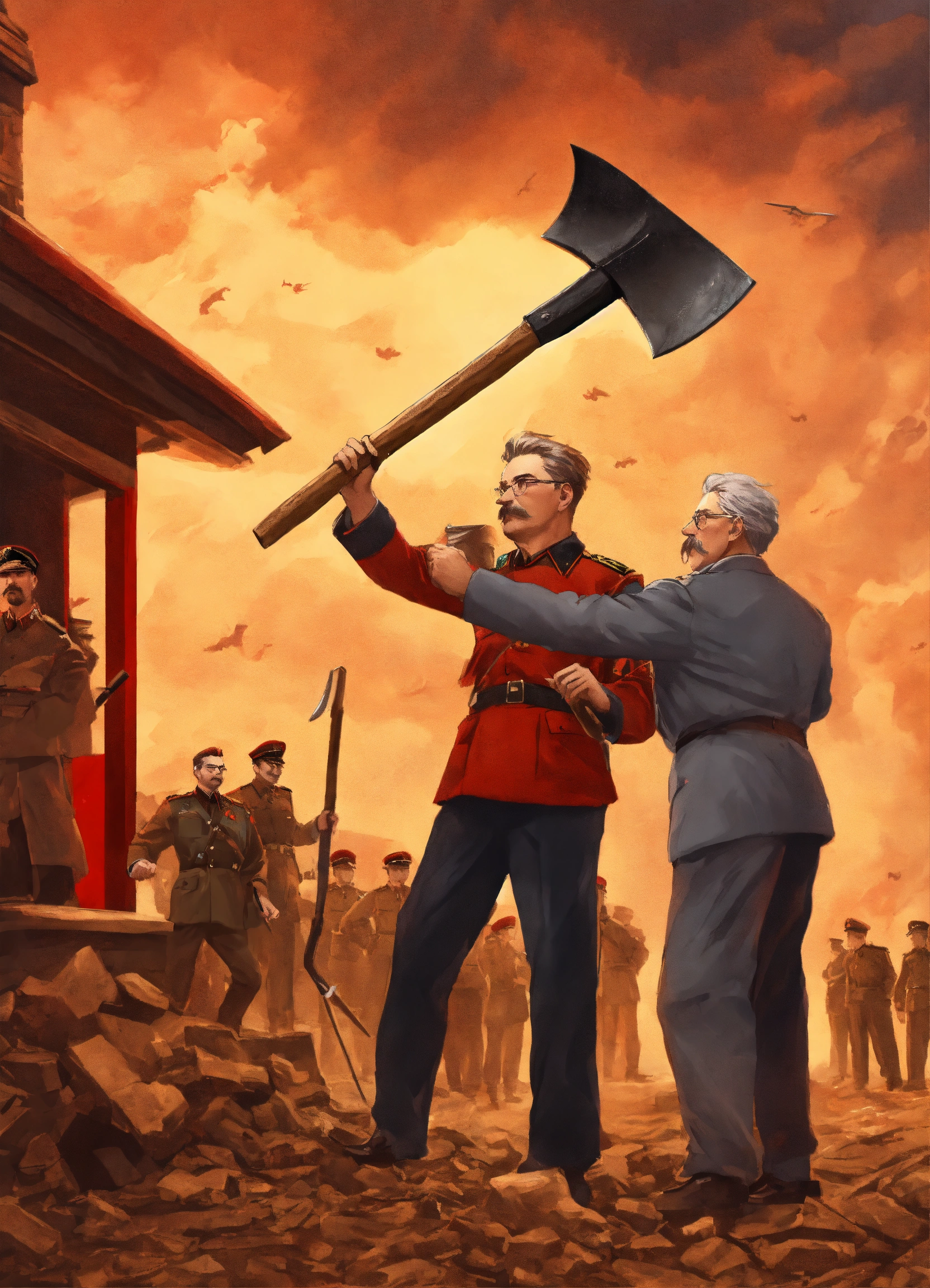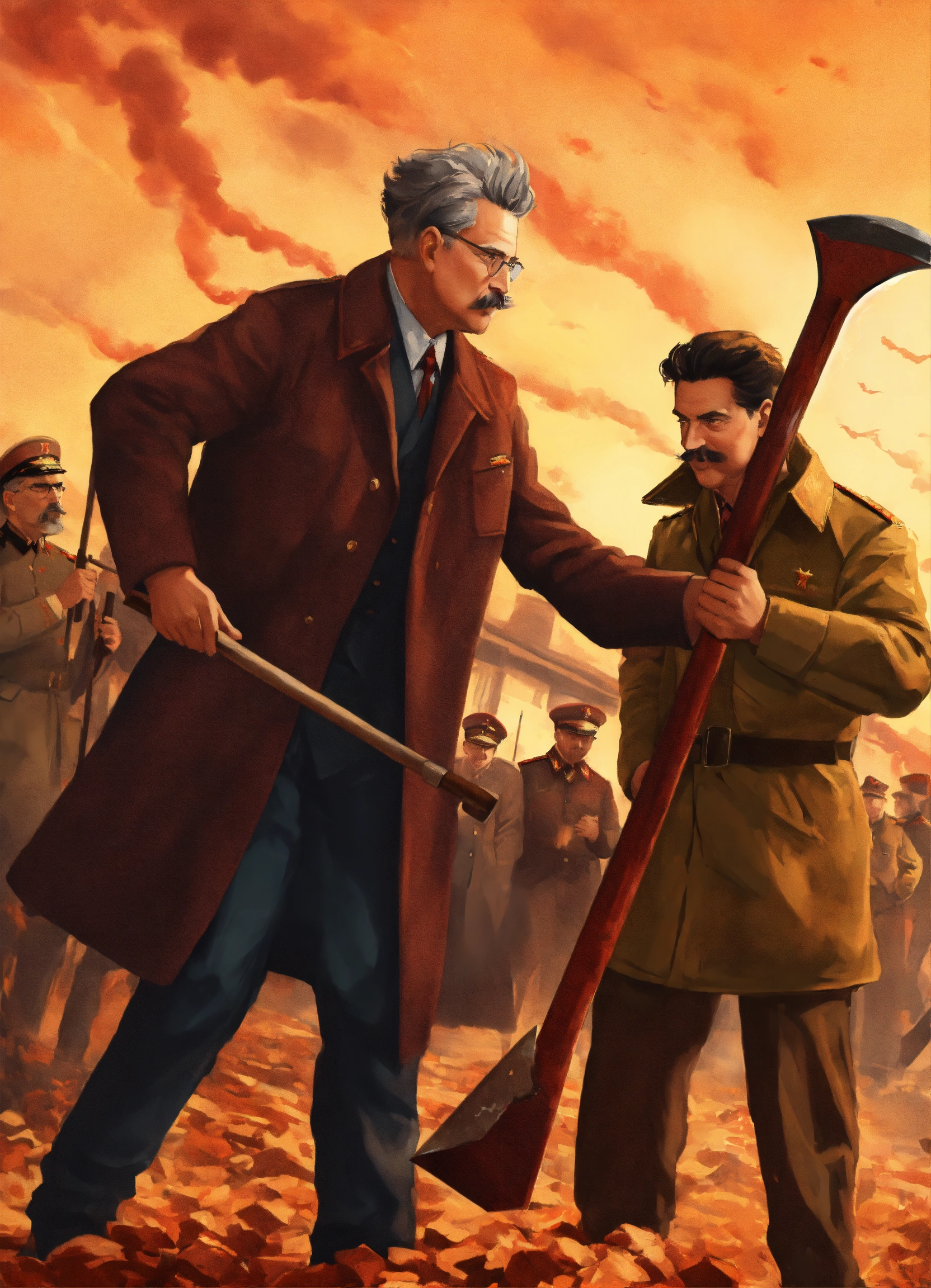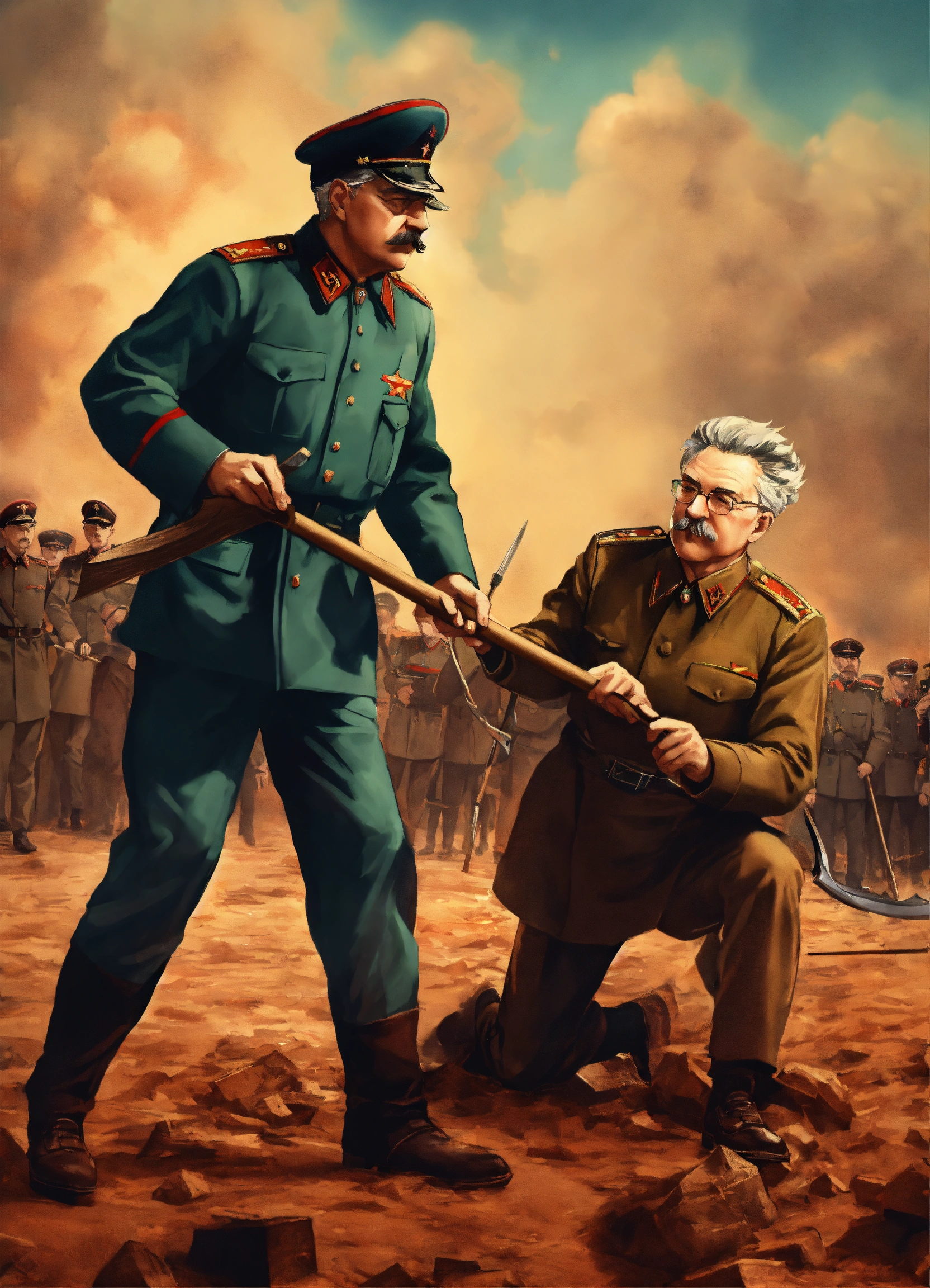 Illustration leon trotsky hitting josef stalin with a pickaxe