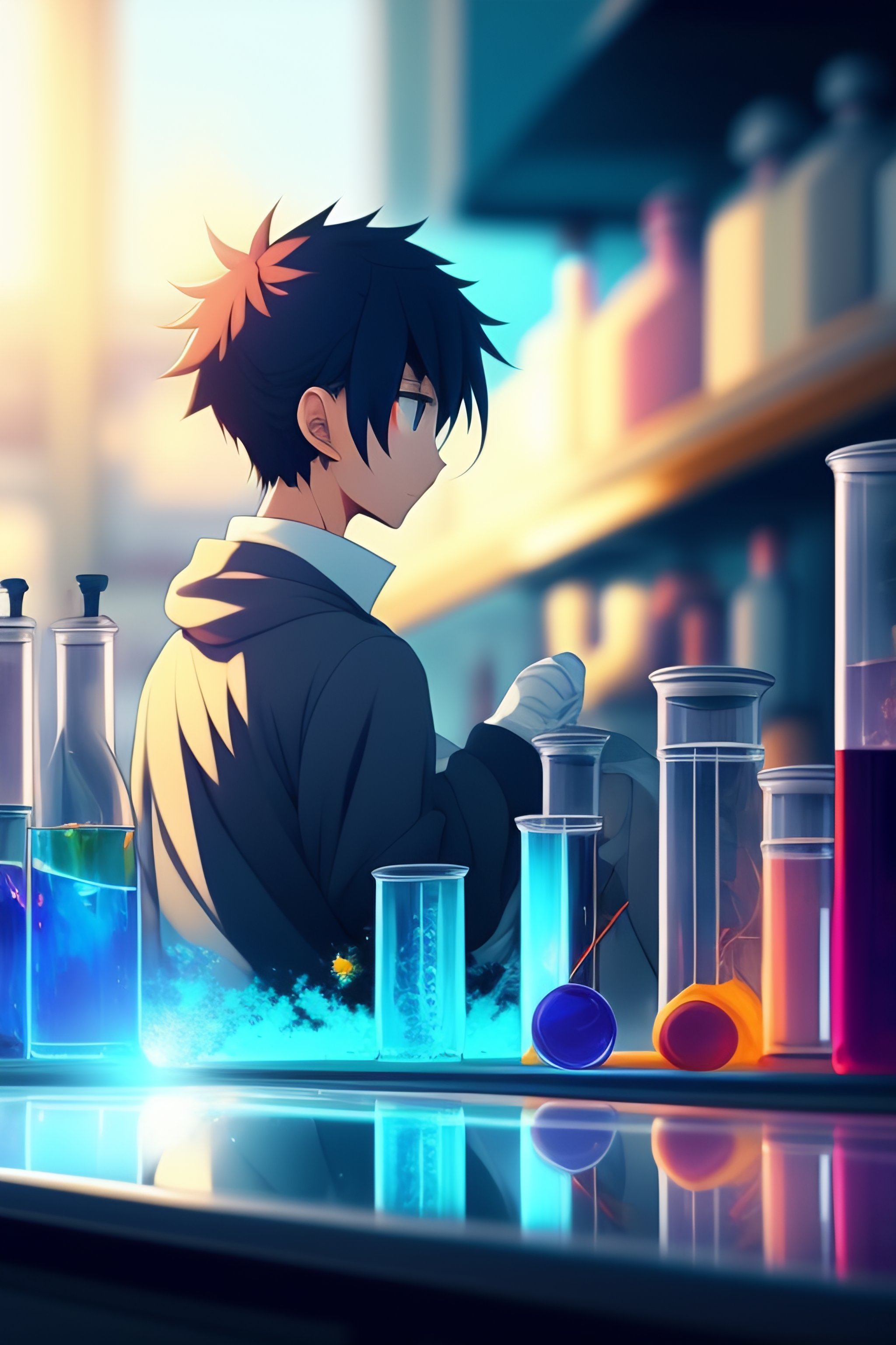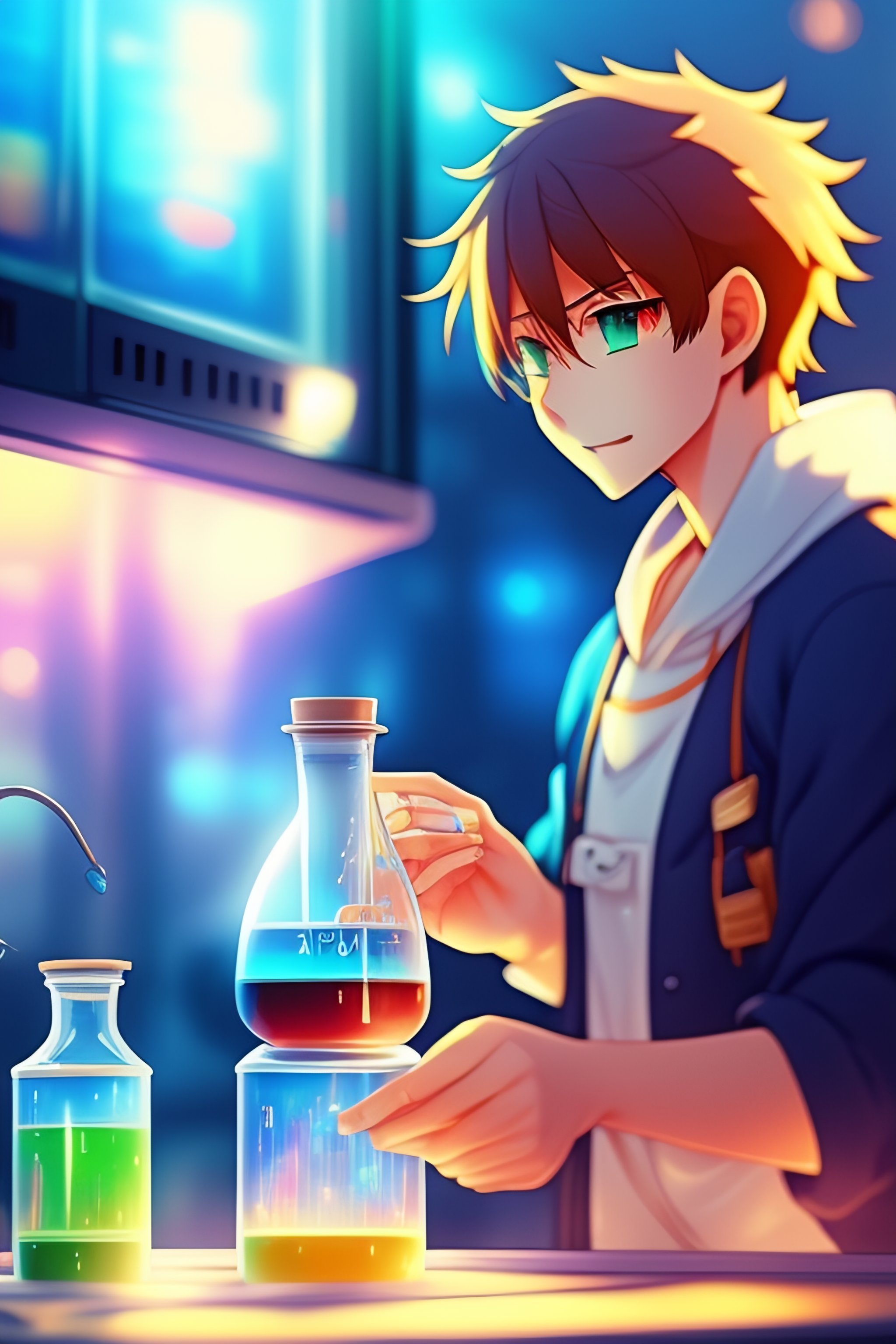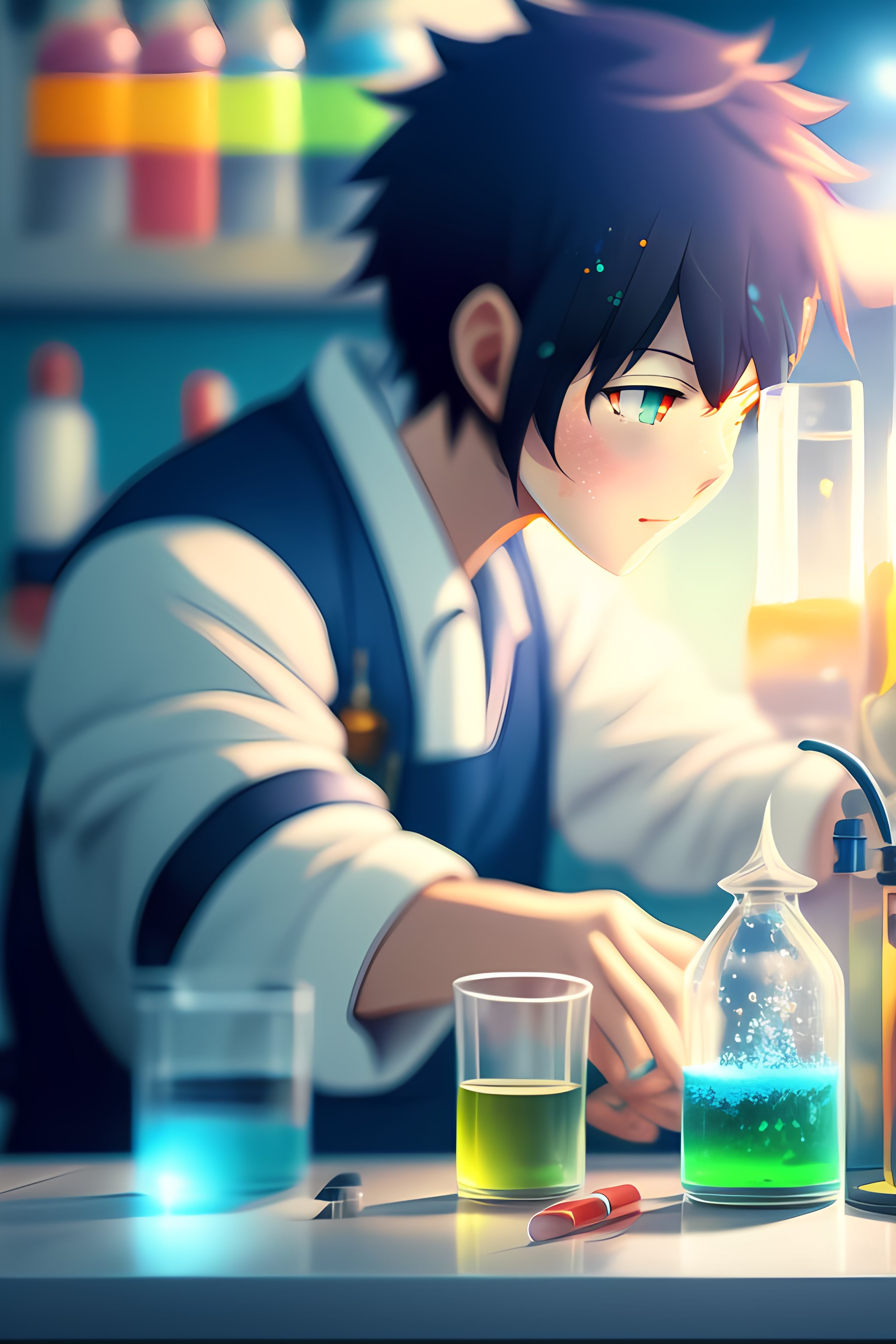 Anime boysmixing chemicals in a lab. pixiv, by makoto shinkai, fantastic, bokeh, animated, vivid colors