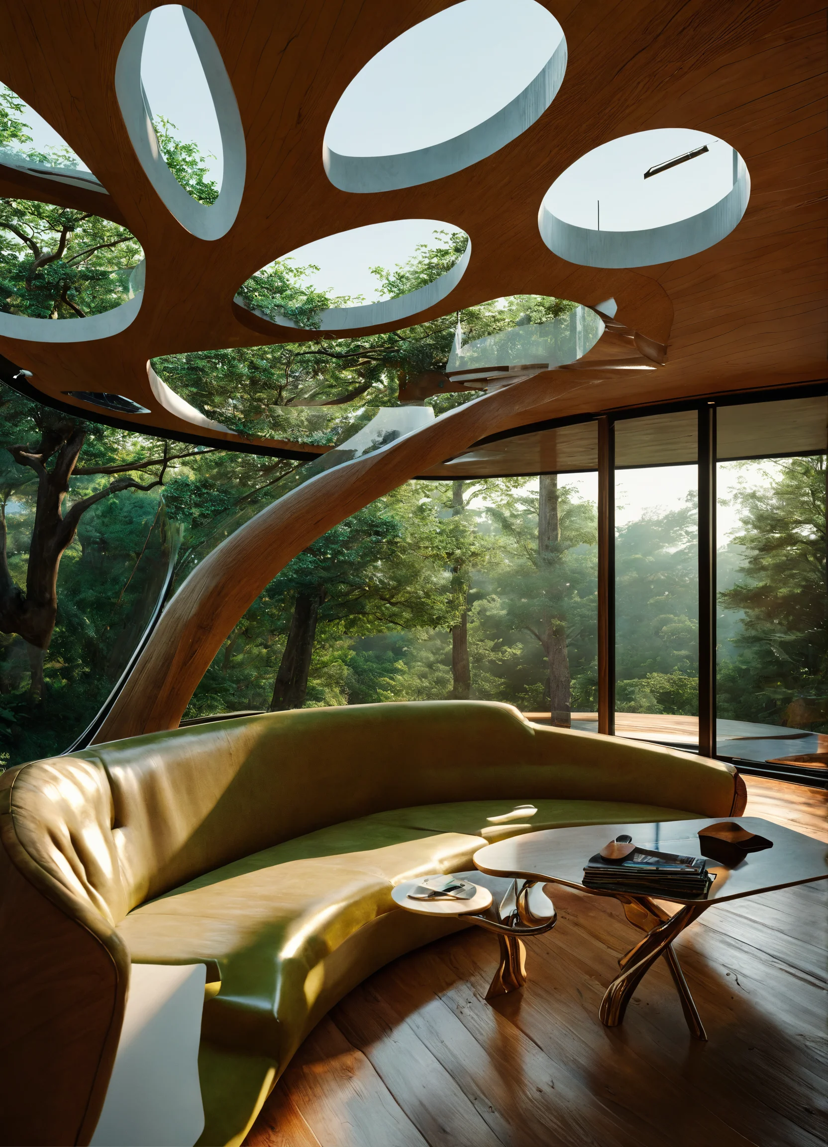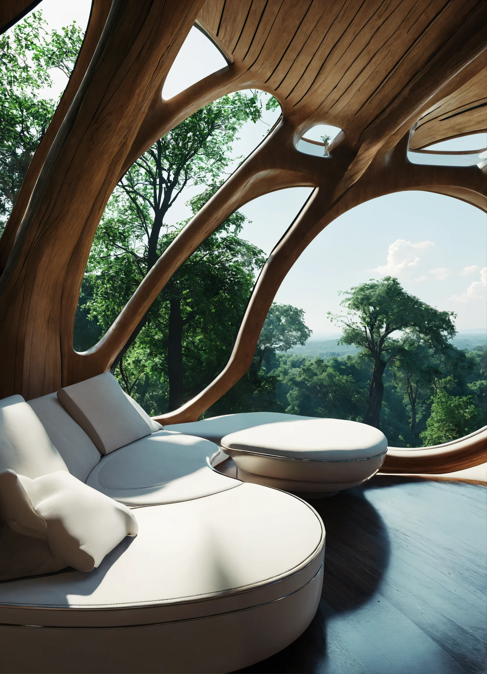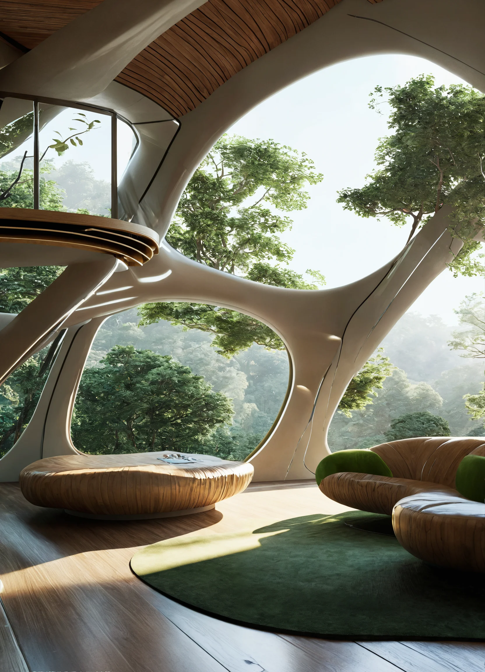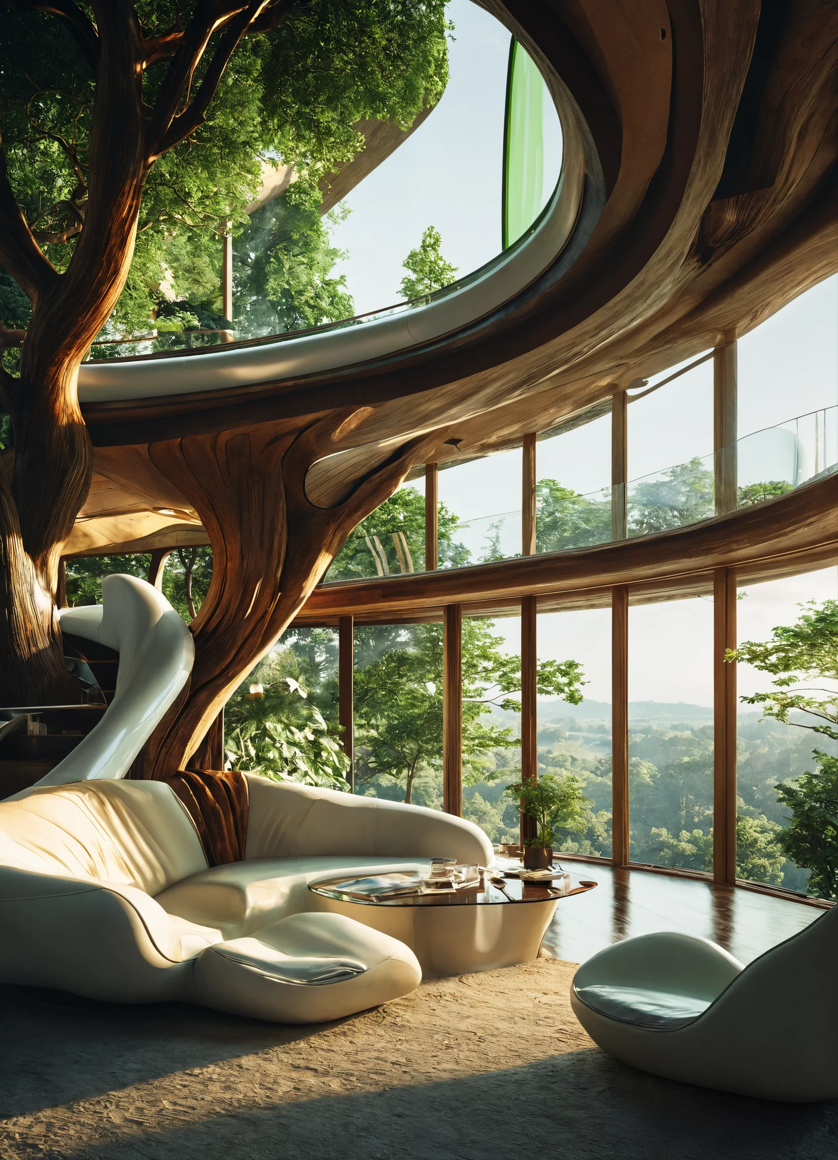 A beautiful interior design of an organic tree house with large windows overlooking the green landscape, in harmony with nature, designed in the style of zaha hadid and cofftraffic, using light wood and white colors, curved lines, futuristic furniture, organic shapes, architectural photography, highly detailed, hyper realistic, high resolution green trees. using a canon eos 5d with a 28.0mm lens, f/3.5 aperture, shutter speed 1/200s, iso 100 and natural light, hyper realistic photography, cinematic, cinema hyper detail, uhd, color correction, cinematic color --ar 85:128 --stylize 750