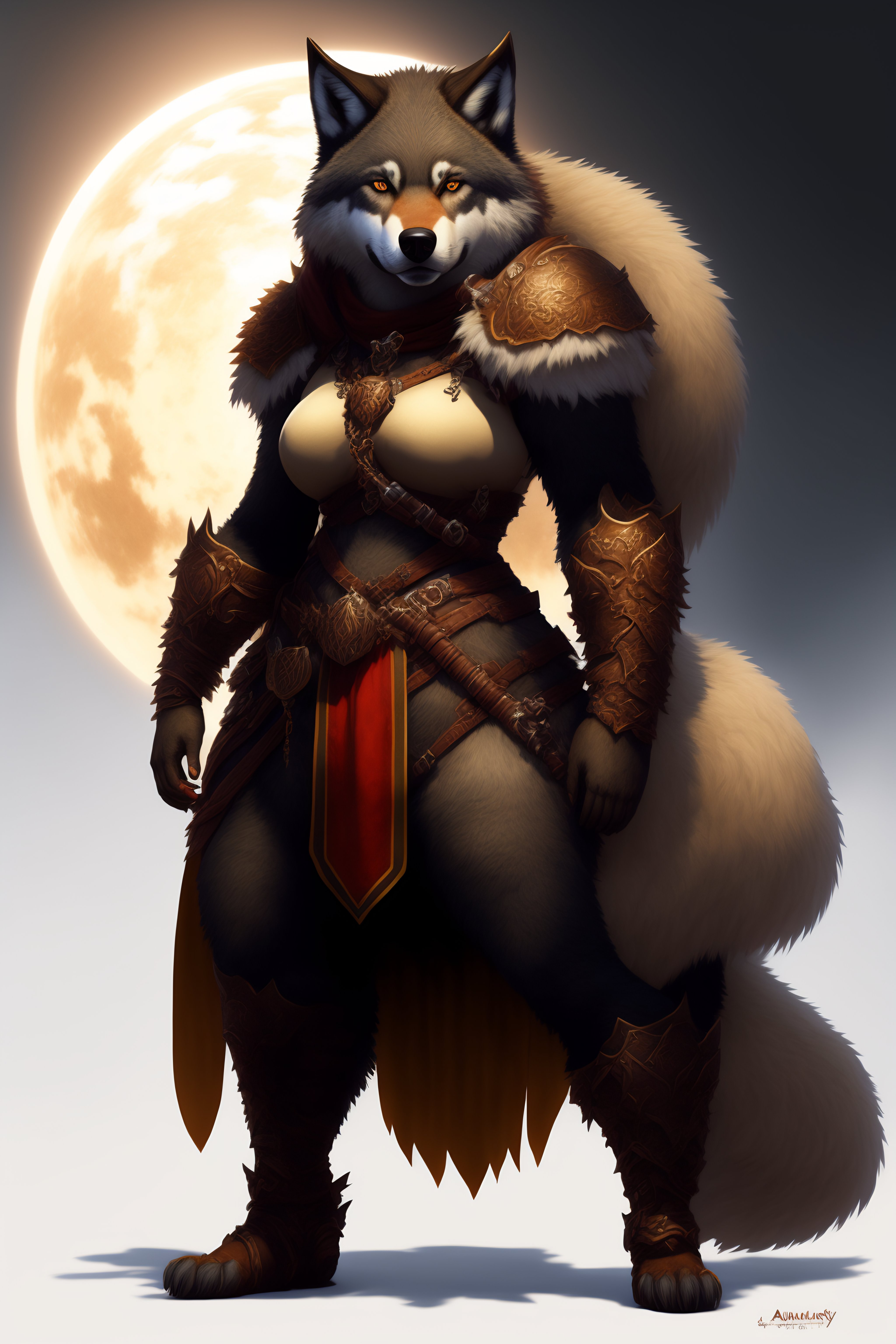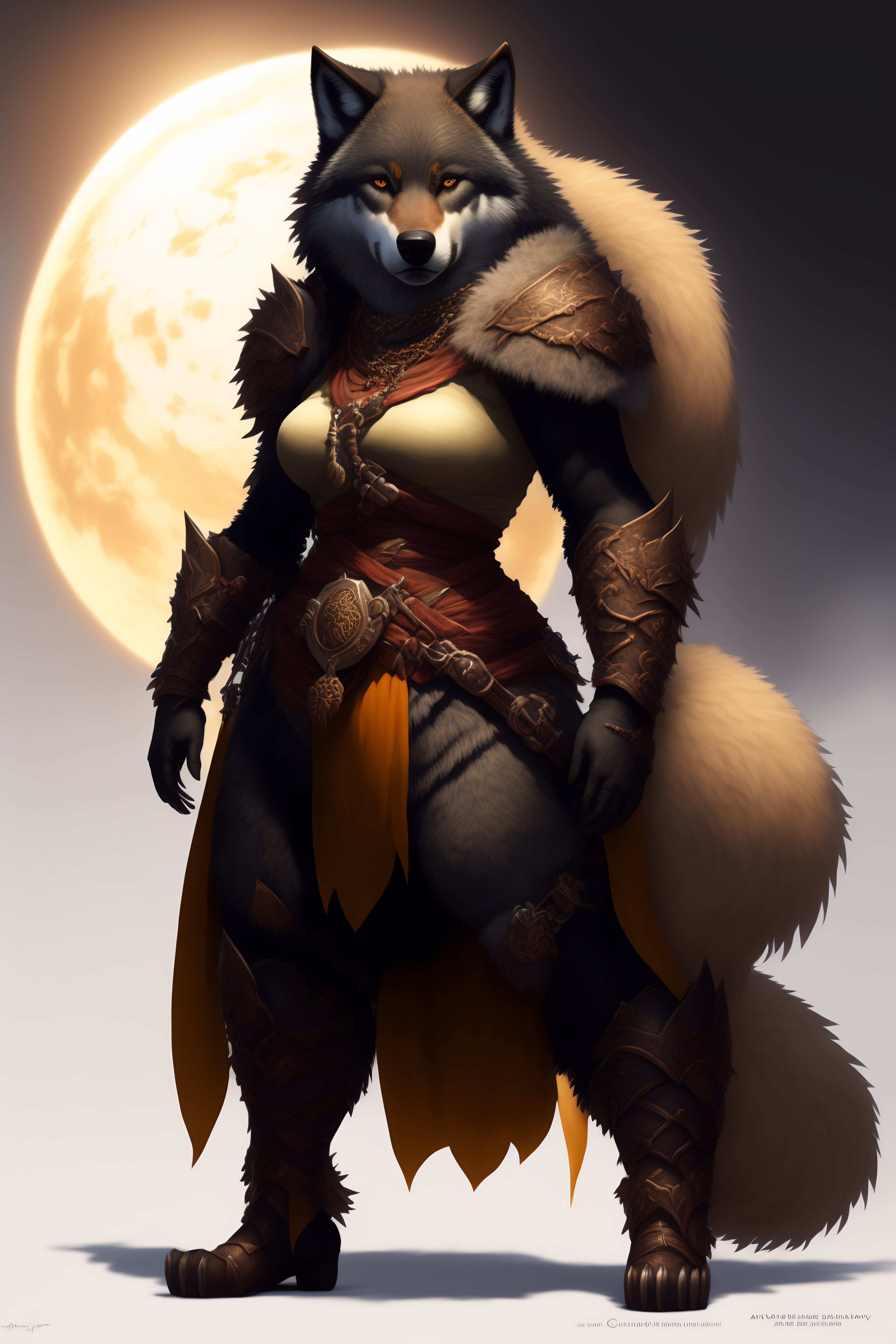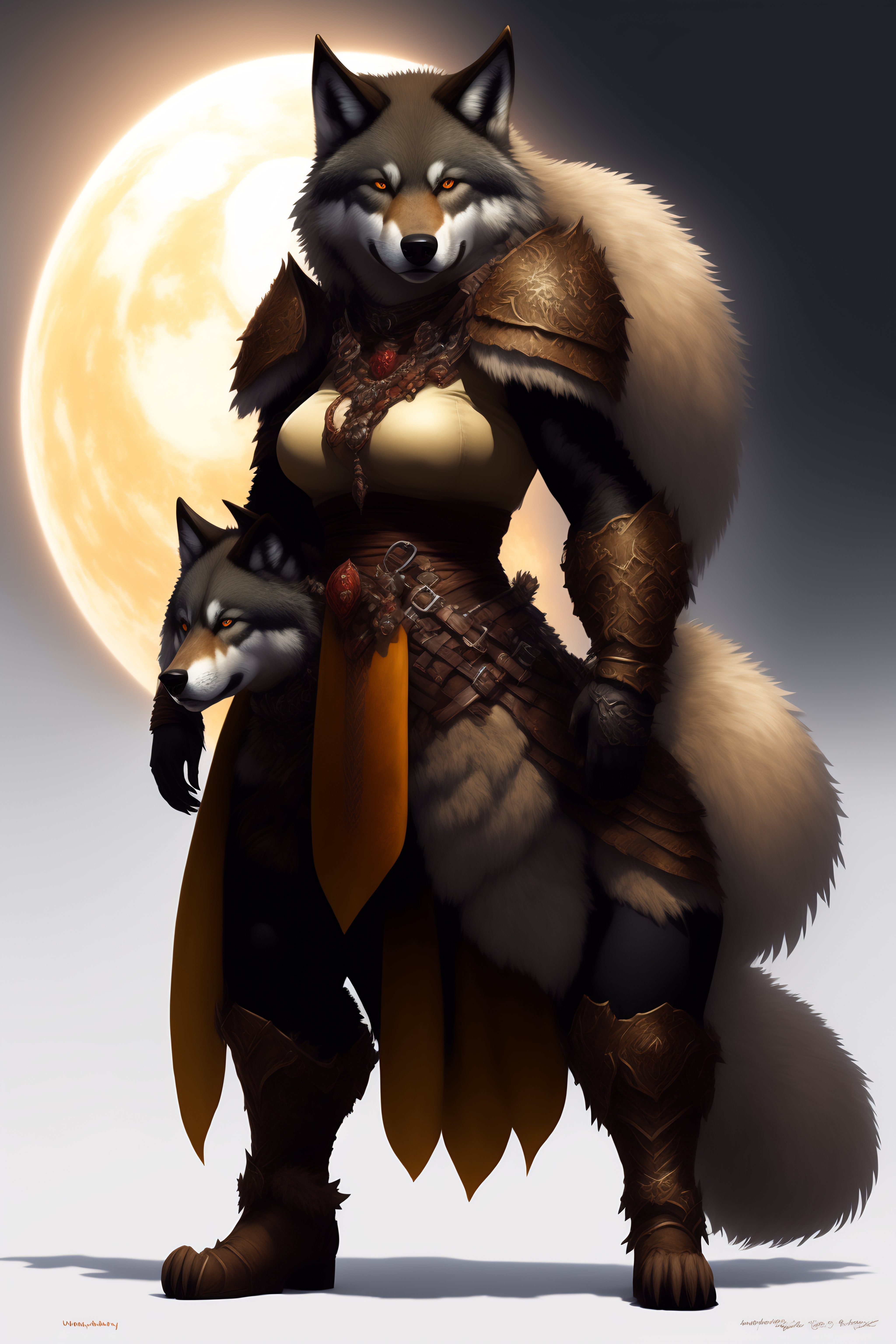 Wolf woman, anthro furry cute, plus size, wolf female warrior, werewolf, worgen, character design, fluffy, painted in the style of james gurney, concept art