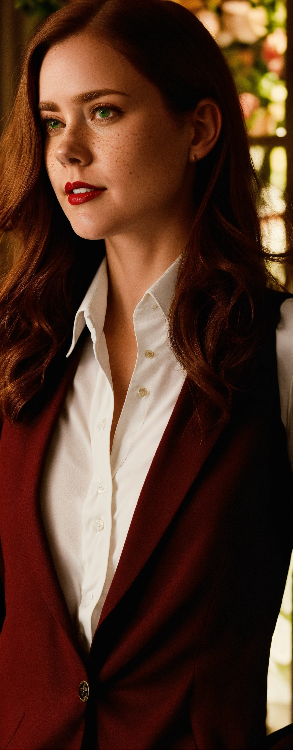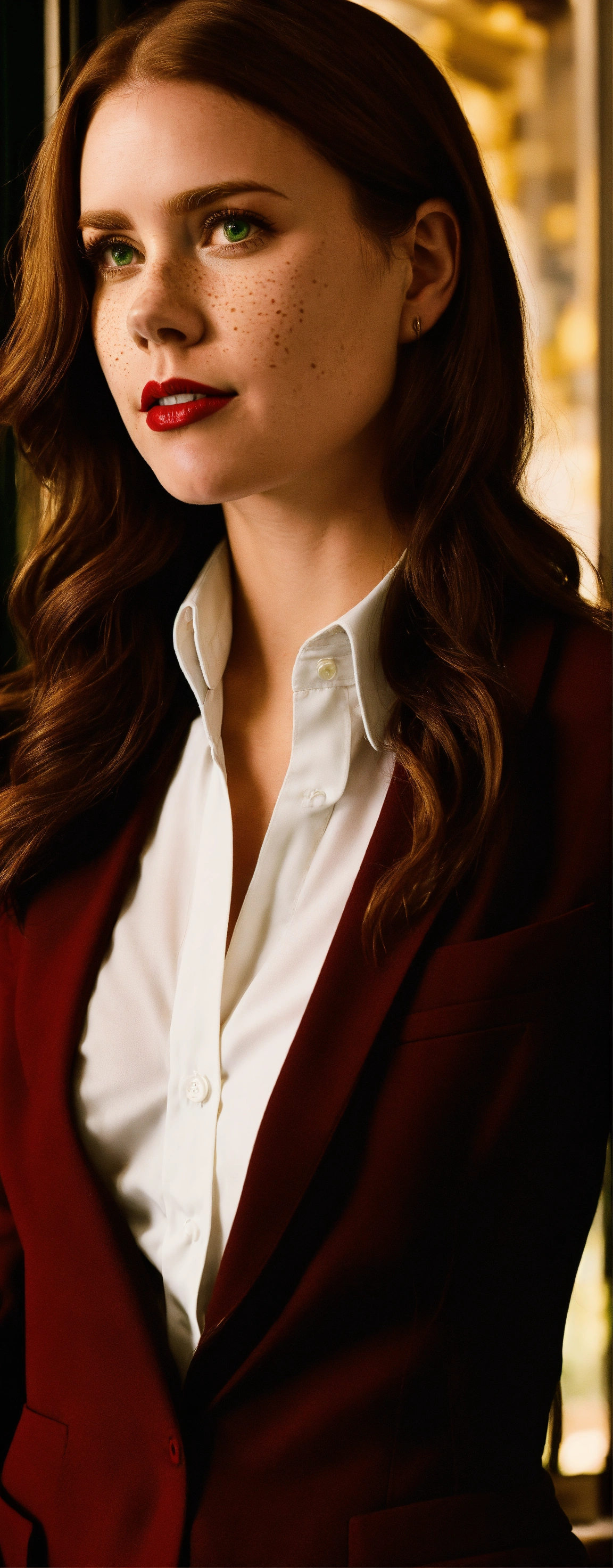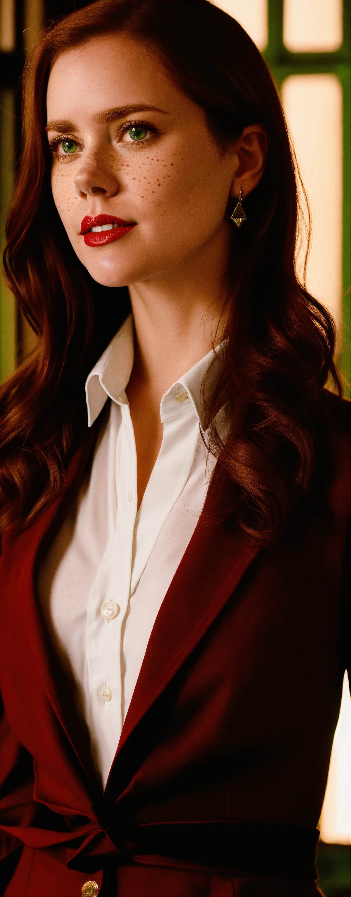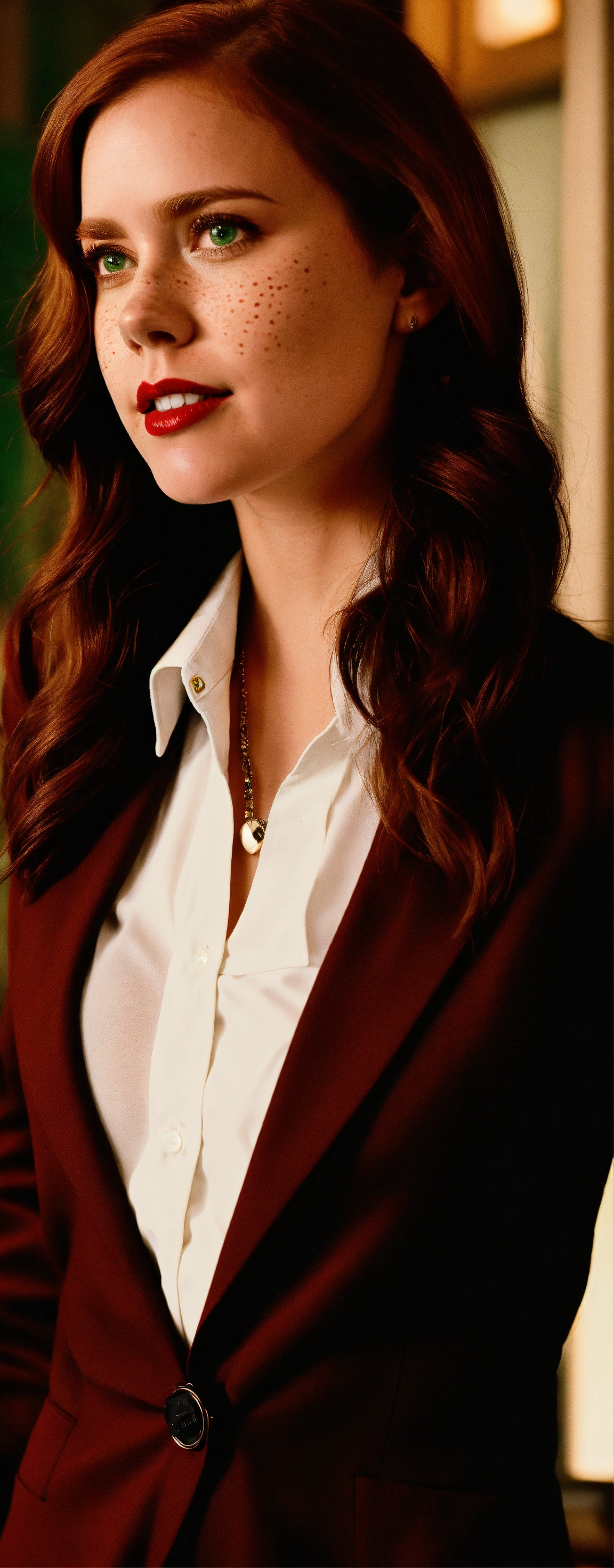 A amy adams photographic portrait of a 25 year old beautiful woman with neck lengthened, untied dark red hair, greater bust, tight shirt, wide bust, she has green eyes, freckles on her face and red lipstick, form-fitting, curve-hugging, snug, tailored, close-cut, sculpted, defined, pronounced curves, shapely, casual, relaxed, laid-back, undone, informal, nonchalant, easygoing, disheveled, carefree, unbuttoned, unstructured, effortless, she wears a black suit jacket with a white shirt and black tie. her head is triangle shaped, preppy, elite, well-dressed, polished, sophisticated, form-fitting shirt, stylish, prestigious, private school attire, layered, hosiery, affluent, knee-high socks, upscale, traditional