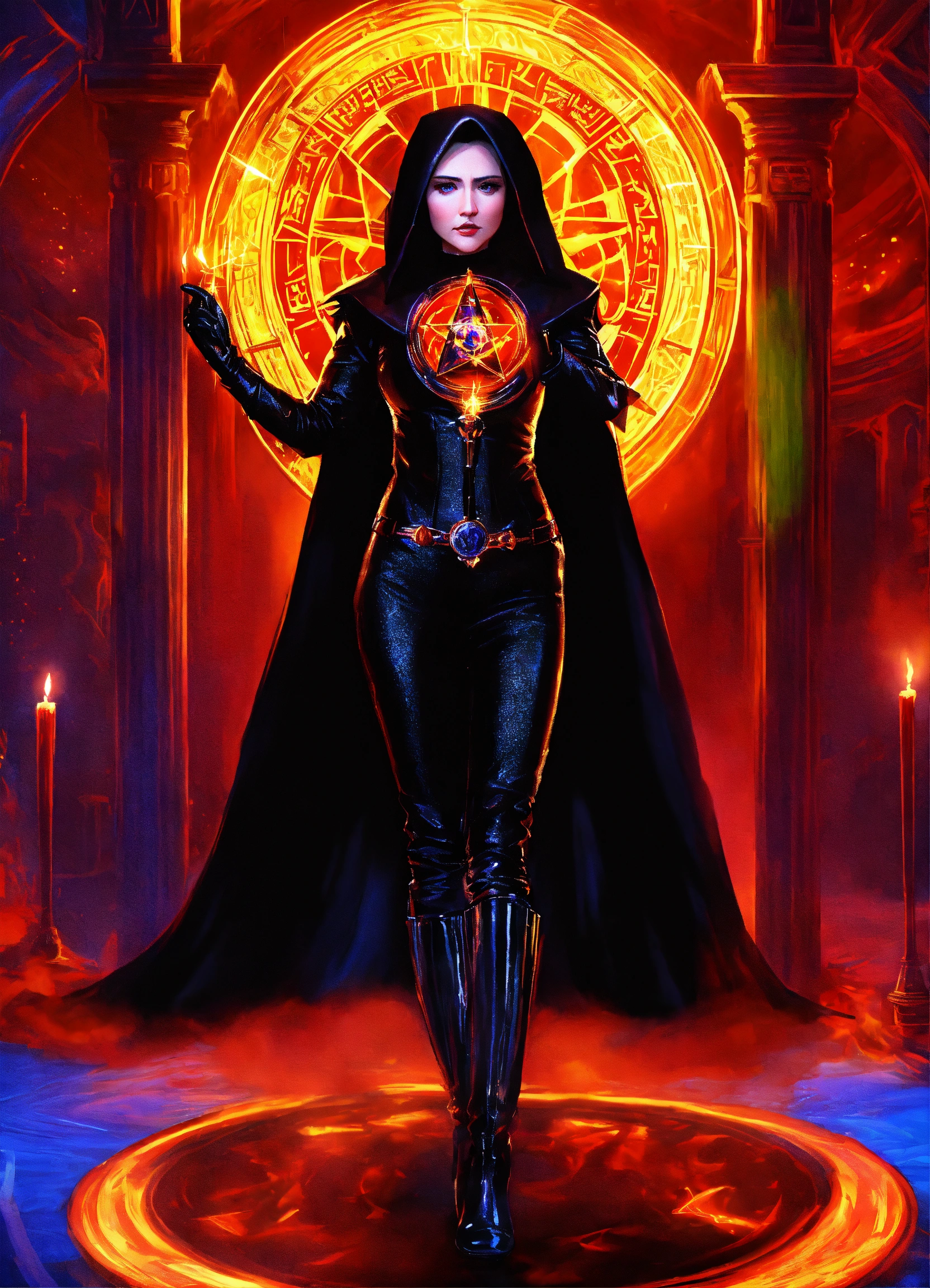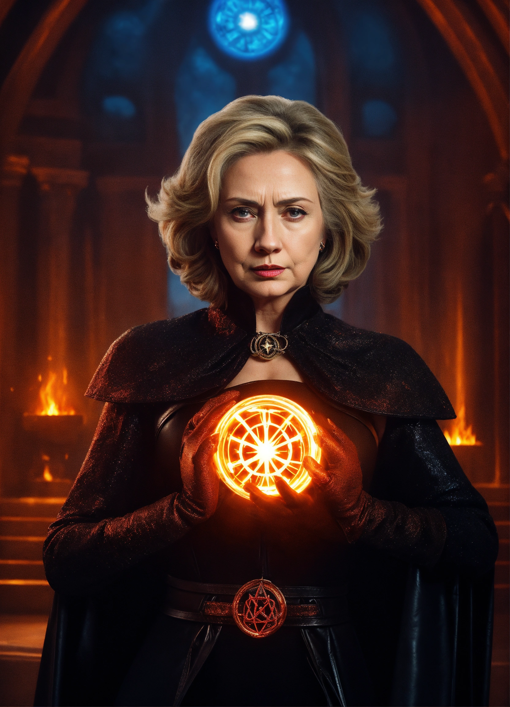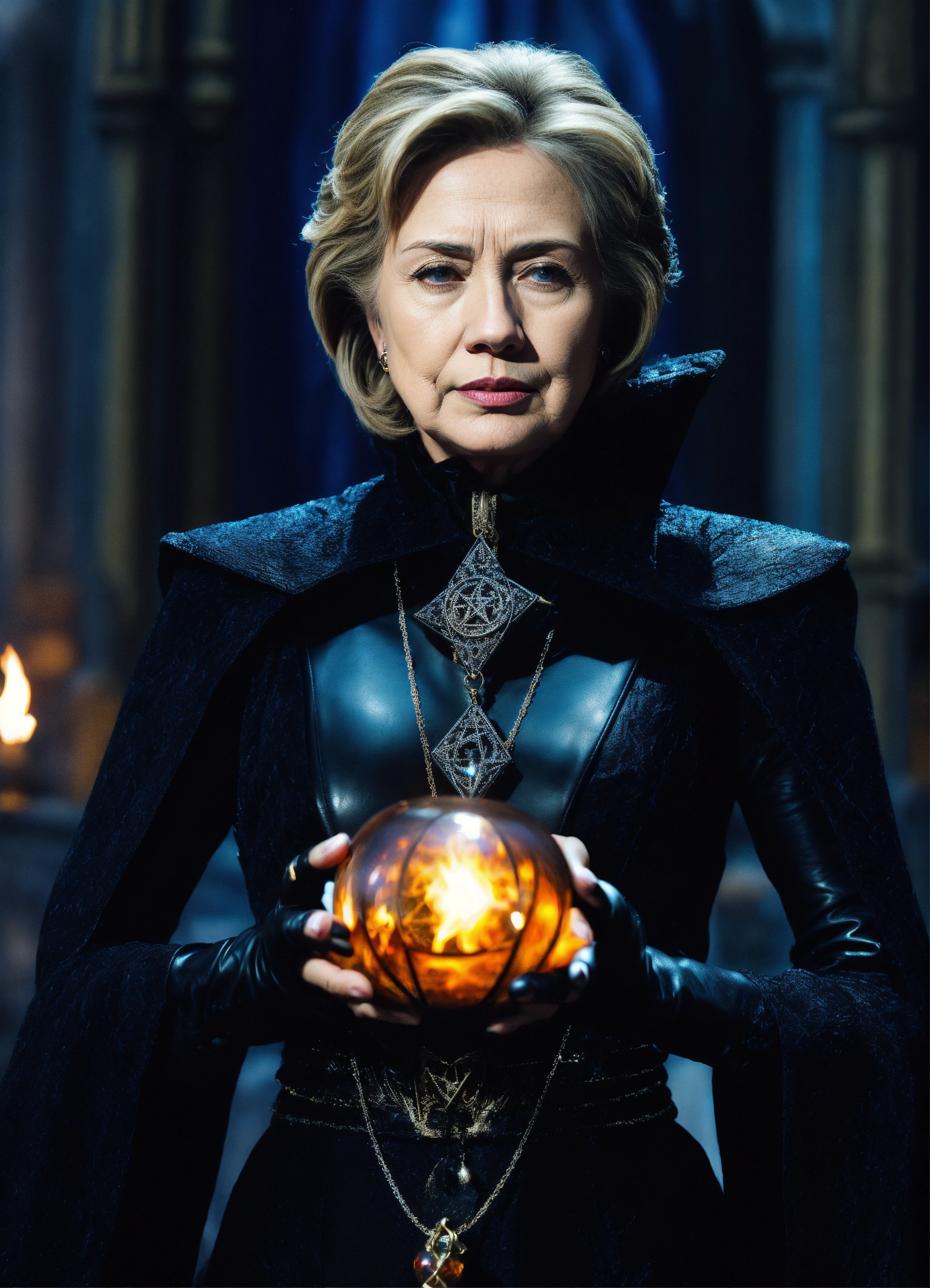 Older hillary clinton, stunning breathtaking "star wars sith enchantress" holding a trance inducing pendant a powerful dark satanic priestess sorceress with supernatural mind control powers, mistress of the dark occult arts, wearing holographic black leather outfit, holographic black leather boots & black leather gloves, 5-point pentacle amulet necklace, casting powerful mesmerizing spell on the masses, the most powerful witch in the world, now casting a spell on me, i feel her power grow, hypnotic hour glass figure, controls every thought in my mind, so powerful overwhelming cant resist i crave to please, gaze weaves dreams & illusions, she conjures a vortex of energy to envelope me, exudes dominating ultimate magical power & energy, goddess can manipulate the fabric of reality with a snap of her fingers, hypnotizing eyes can burn a hole in my soul forever, i am a prisoner under in her evil love spell, hypnotizing hour glass figure
