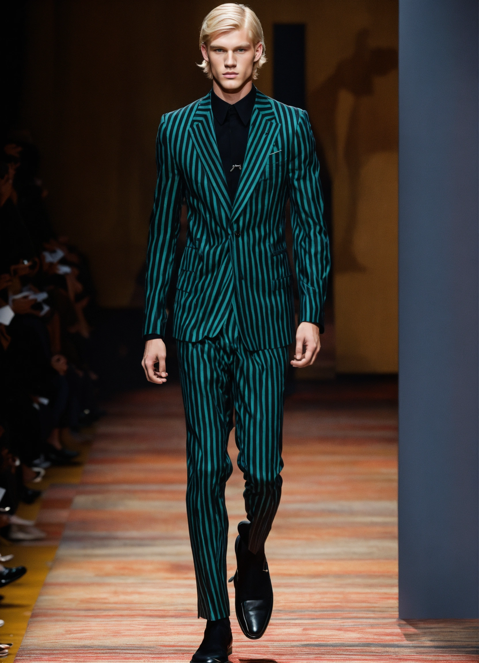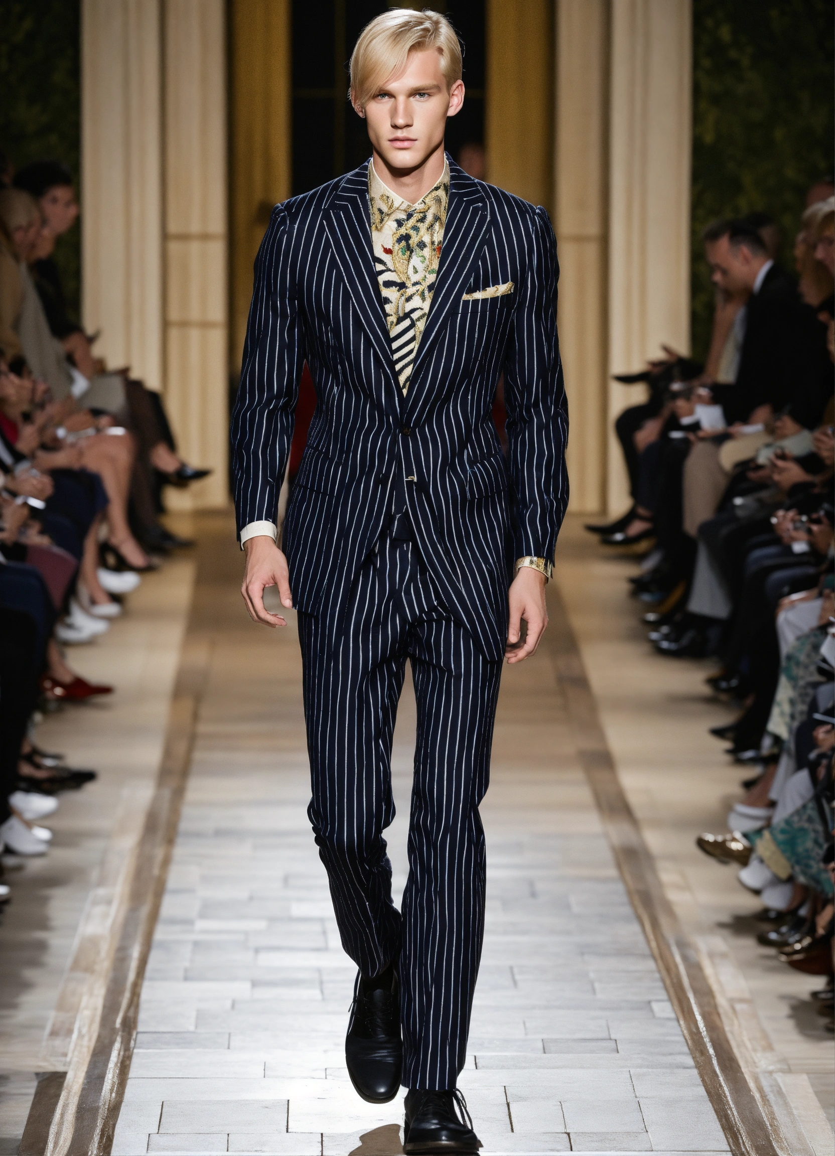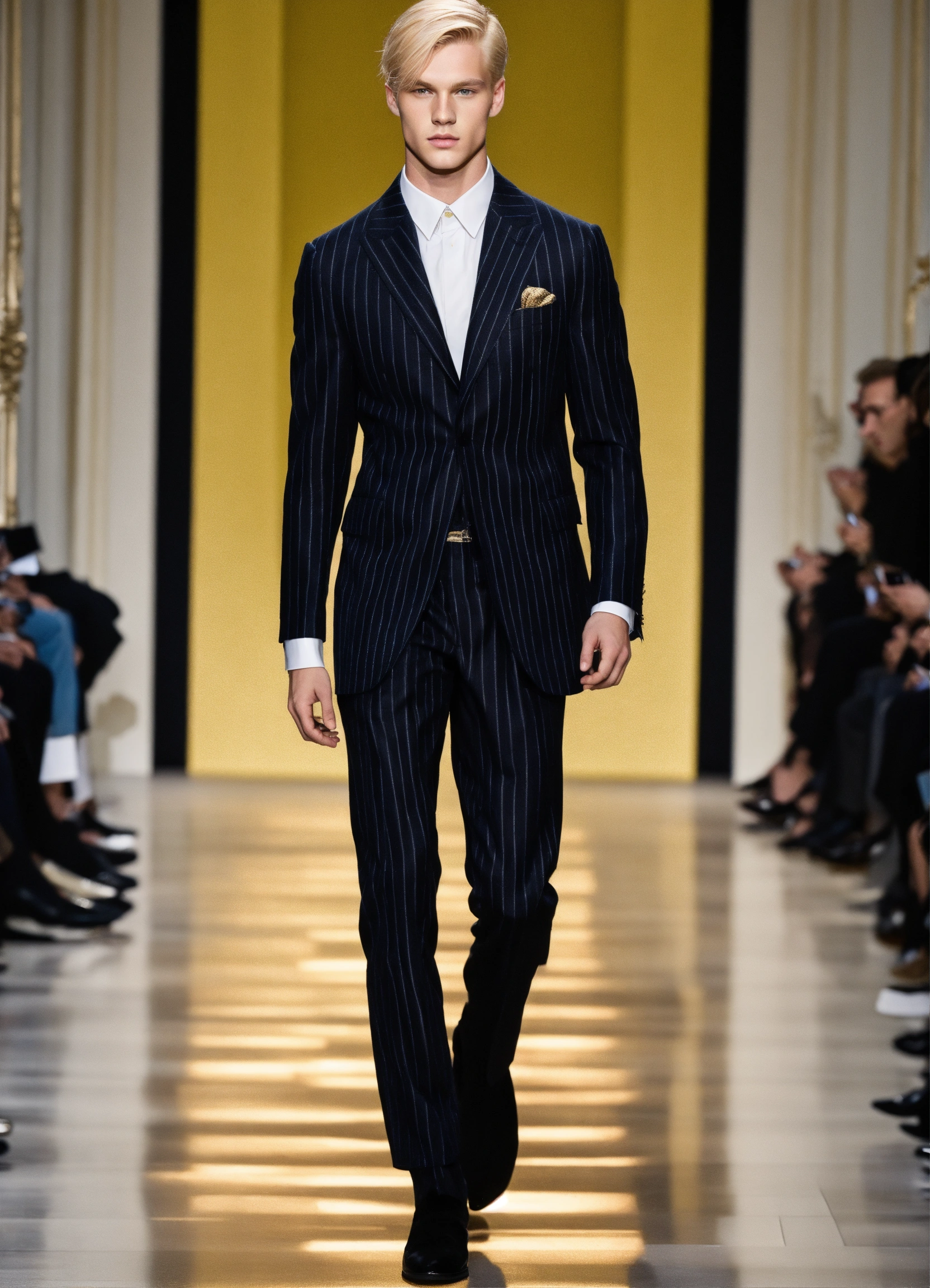 A full-body portrait of a pale blonde young man male fashion model with valentino garavani black striped suit on the catwalk