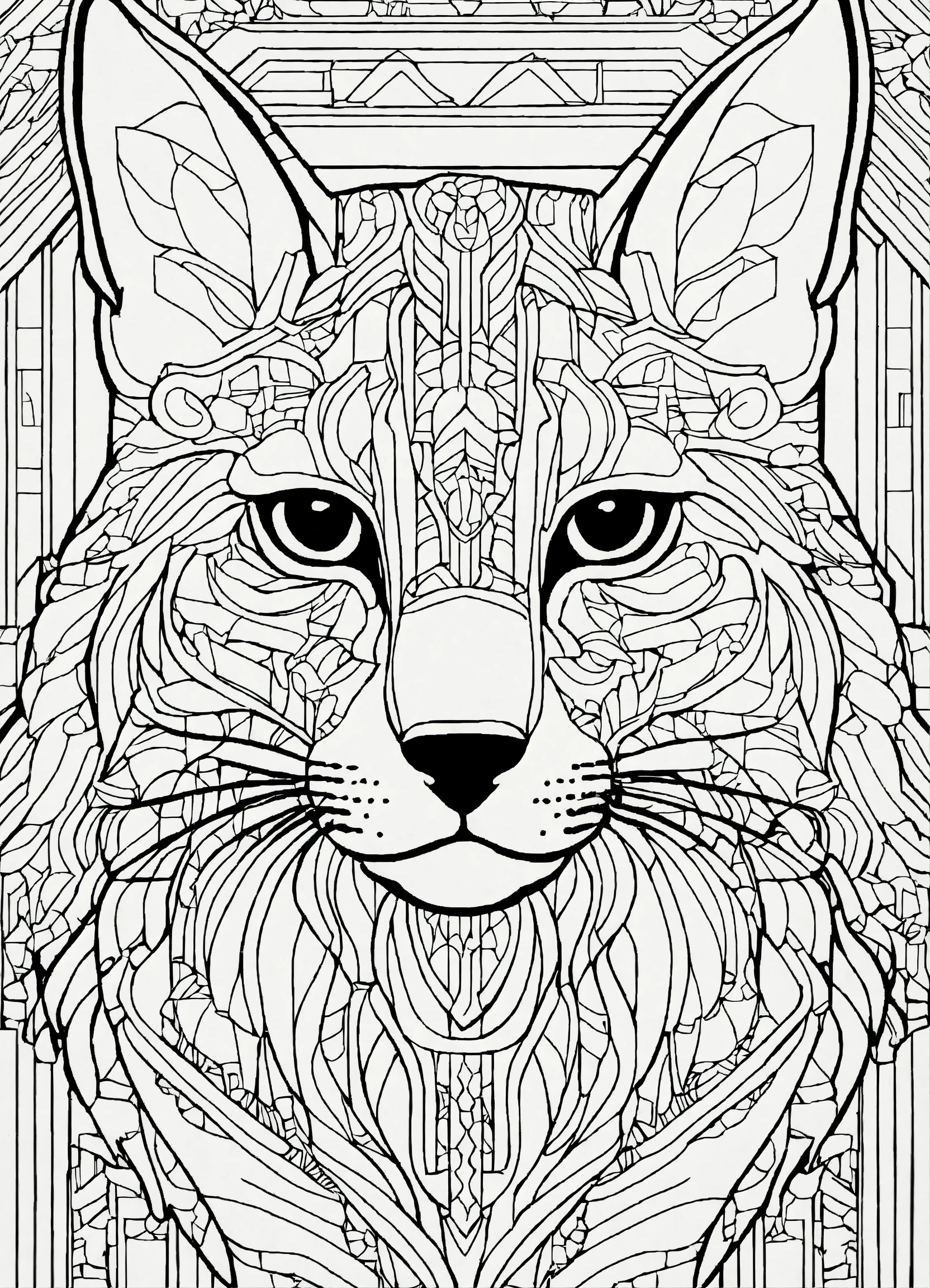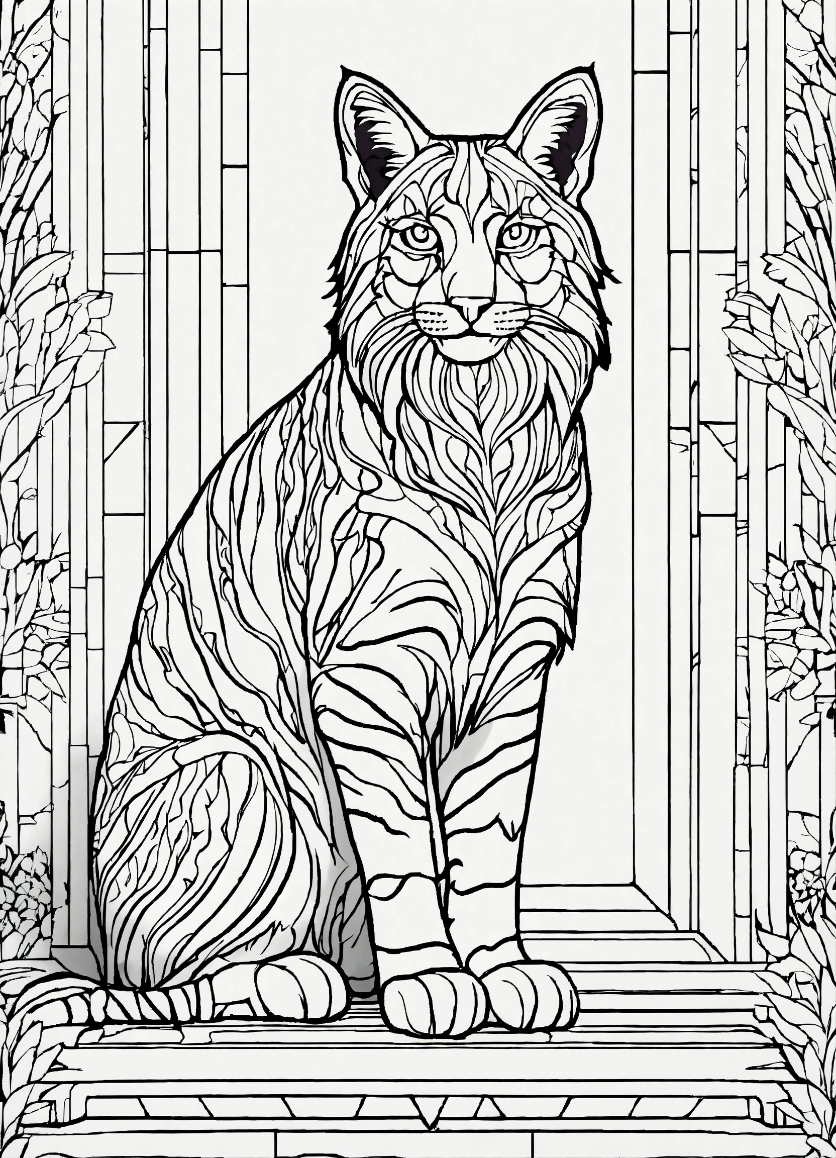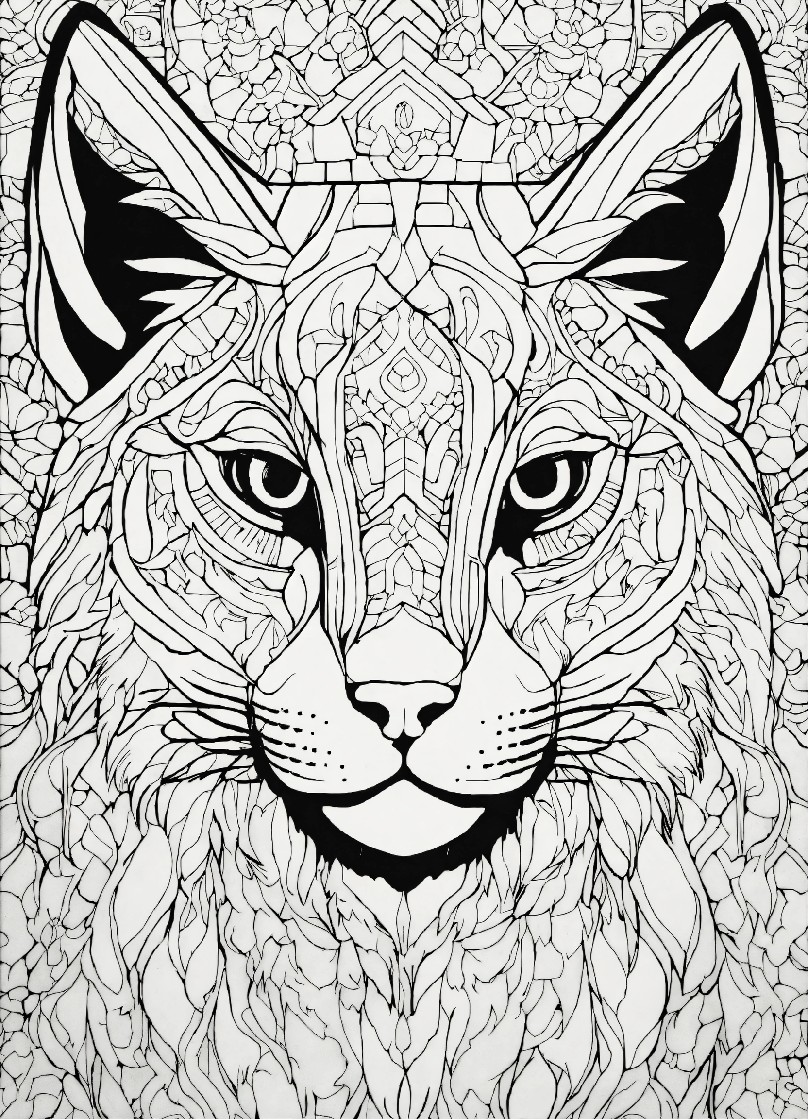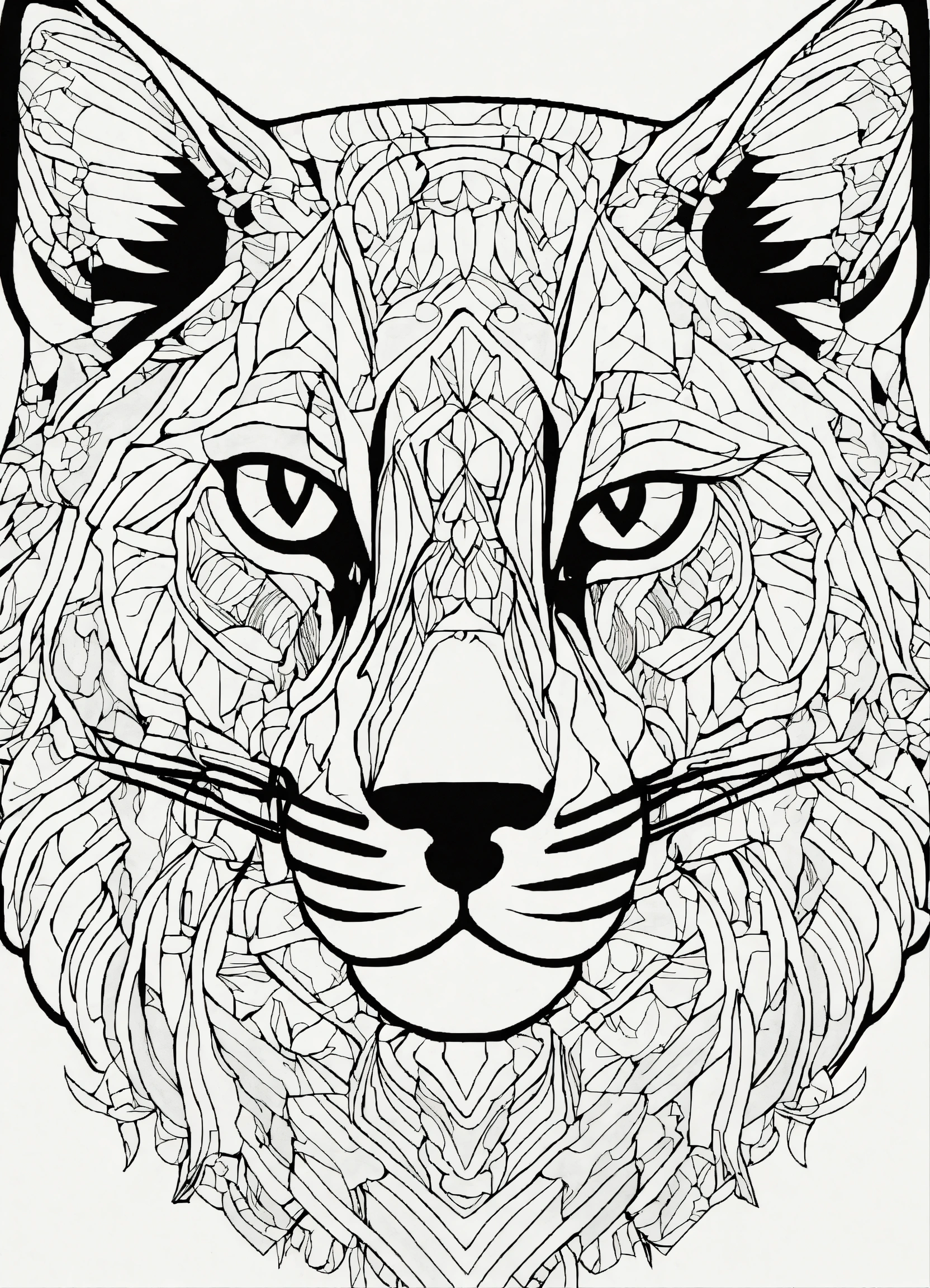 Coloring page for adults, bold lines, dark lines, symmetrical, white background, clean line art, fine line art, bobcat.