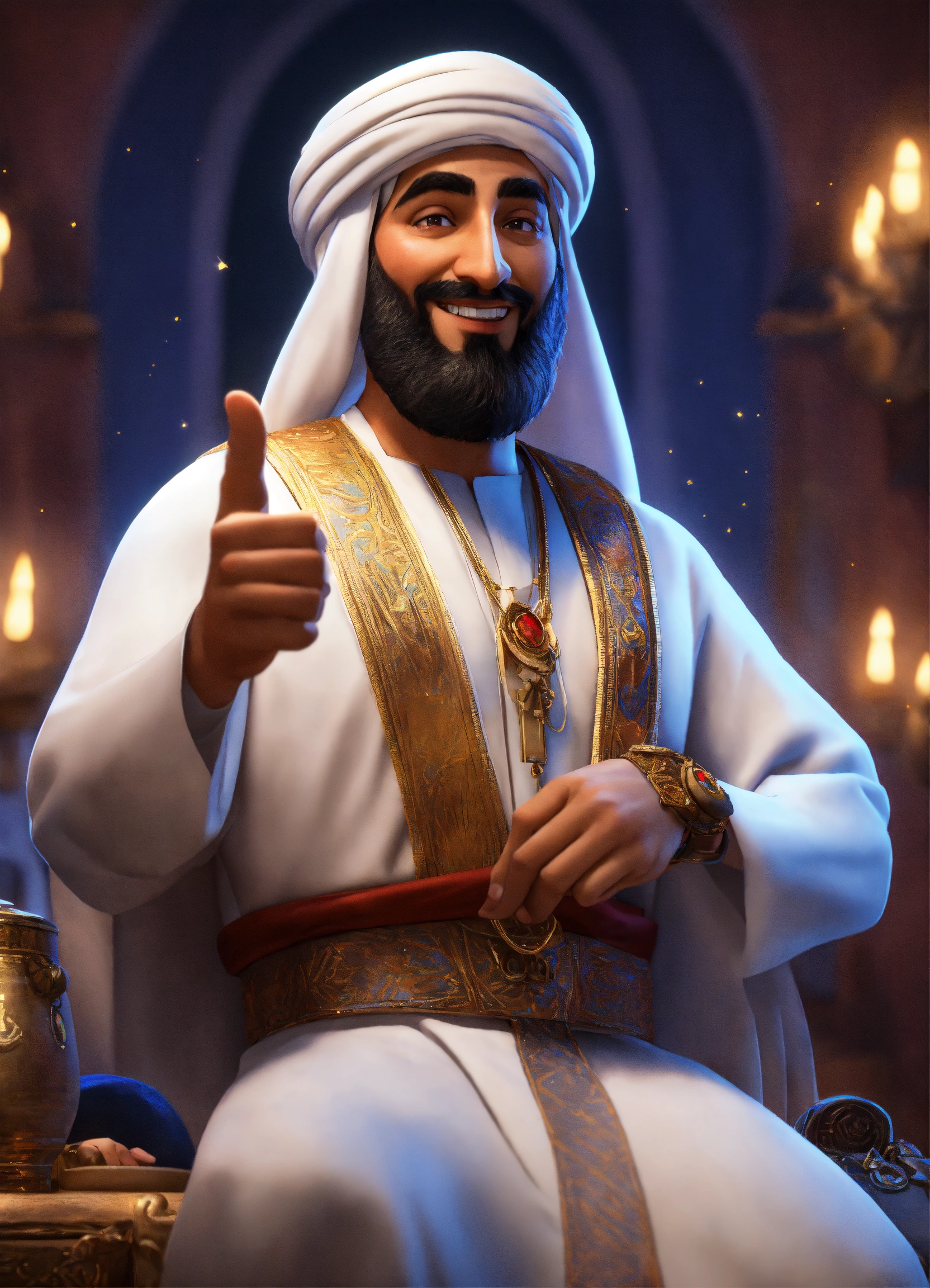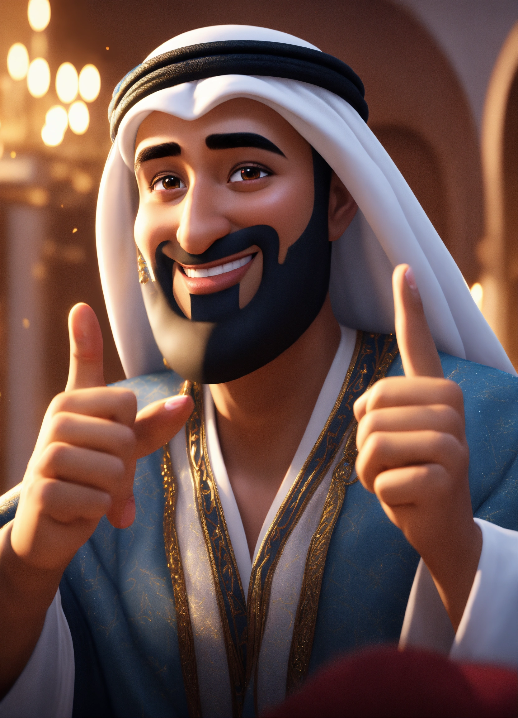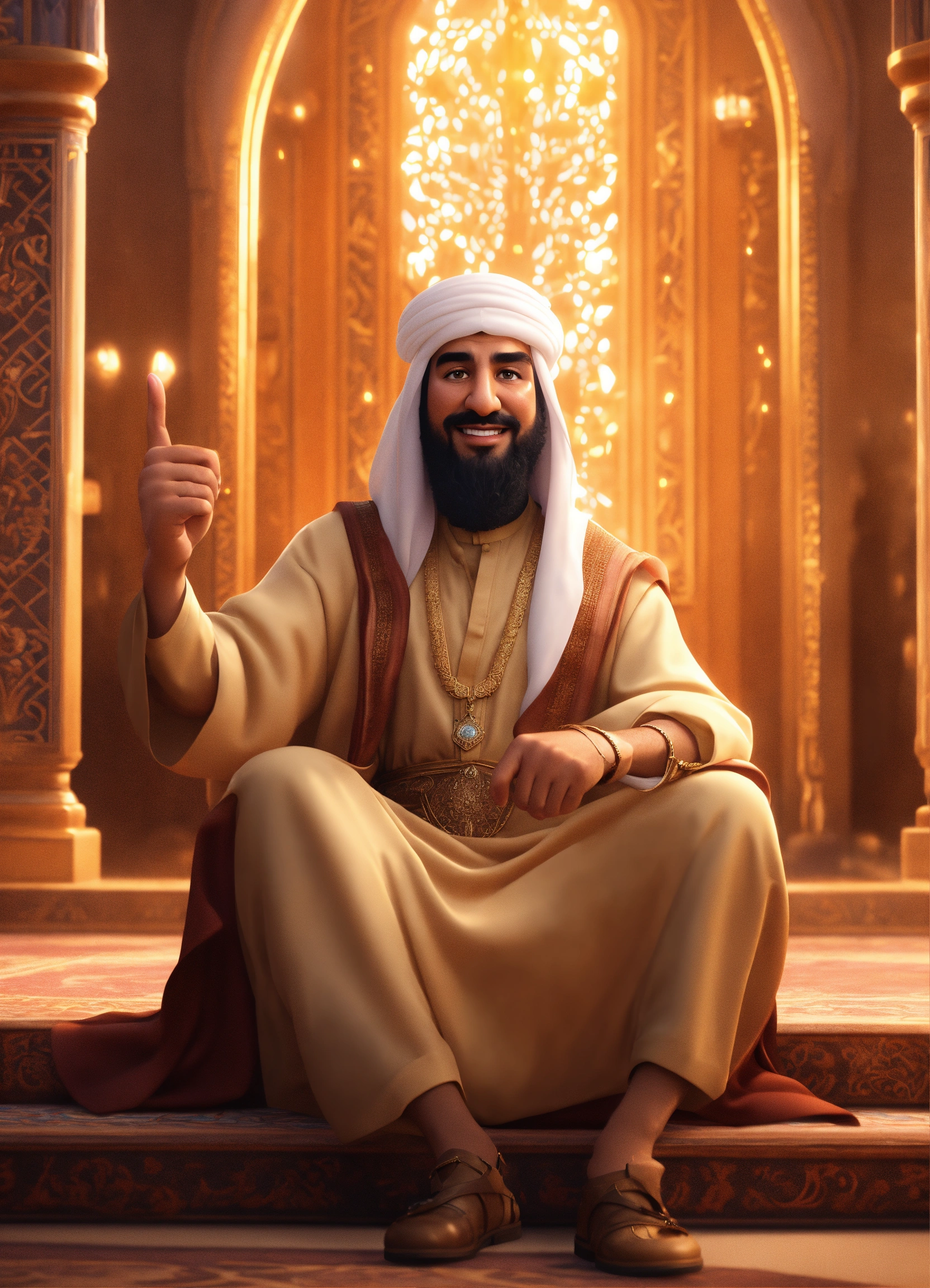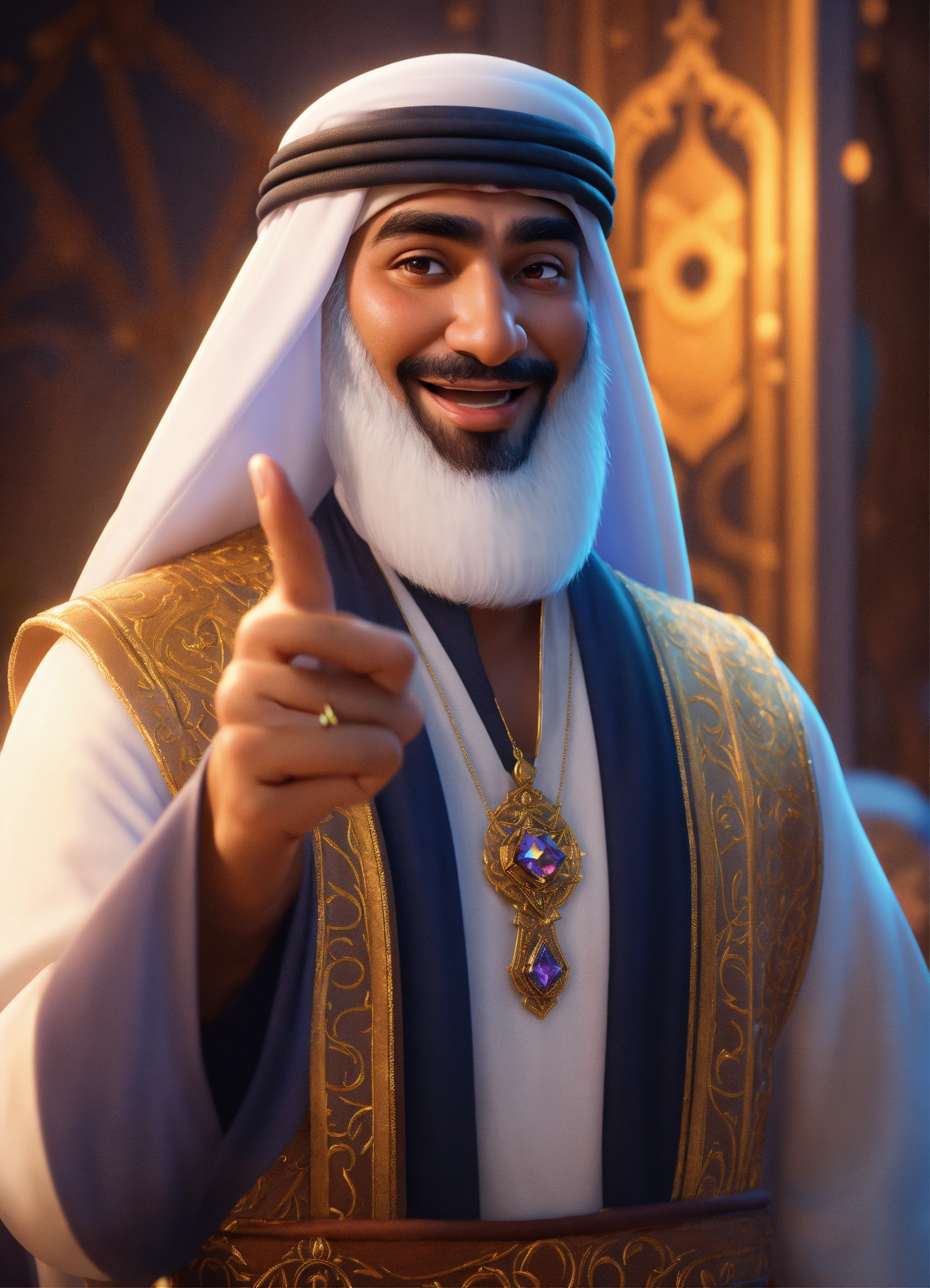 Create a 3d rendering of an arab sheikh showing his index finger up in disney animation style. he points his finger up - he is triumphant - he is delighted - he is joyful (pixar art style)++ highly detailed digital painting, art stations, concept art, soft focus, hard focus, illustrations. cinematic, visual effects, hdr, unreal engine 5, ray tracing, soft light, 8k, high detail, sparkling backlighting, luxury gem, game art, 3d, cartoon, colorful, magical, mysterious