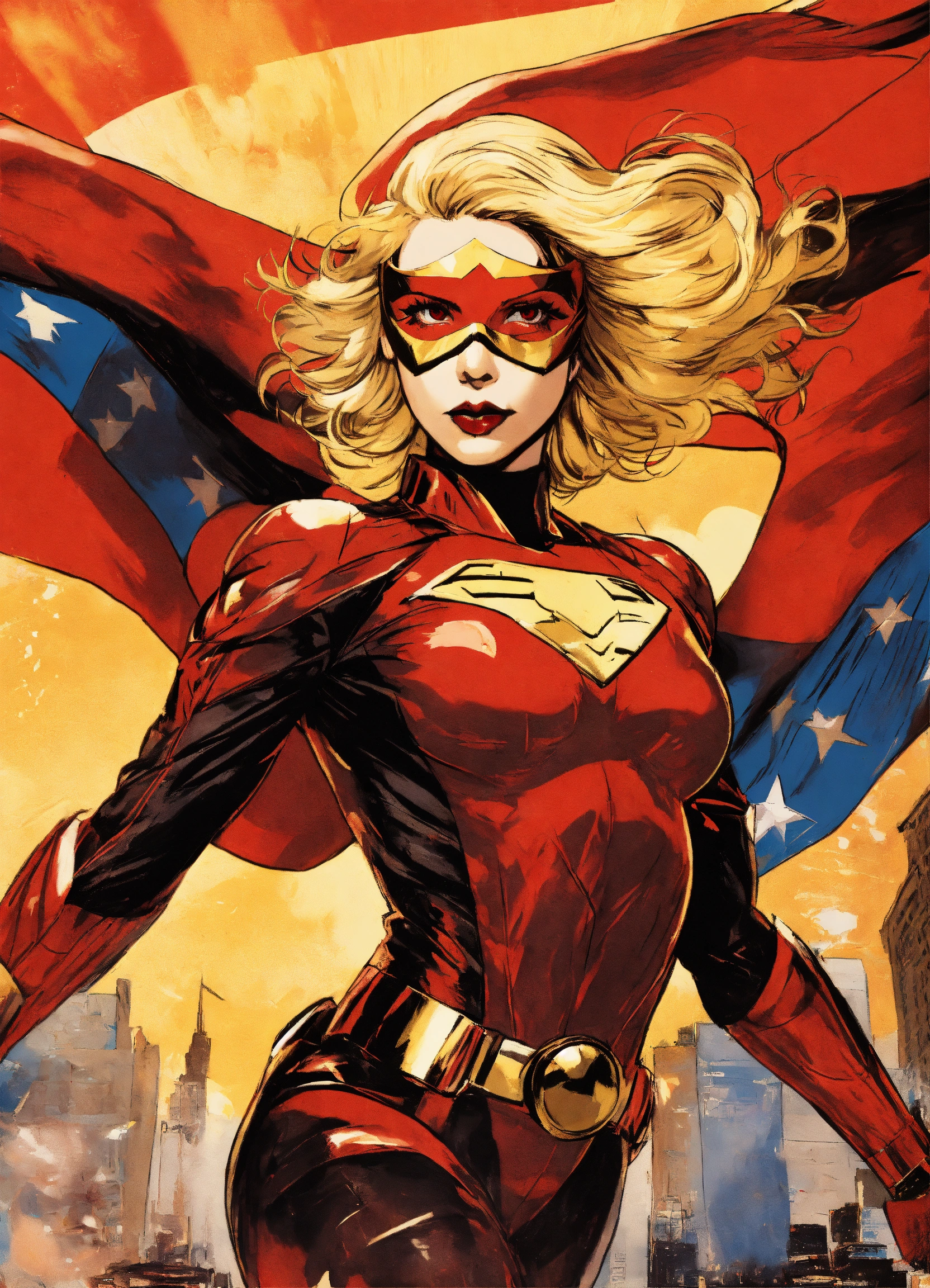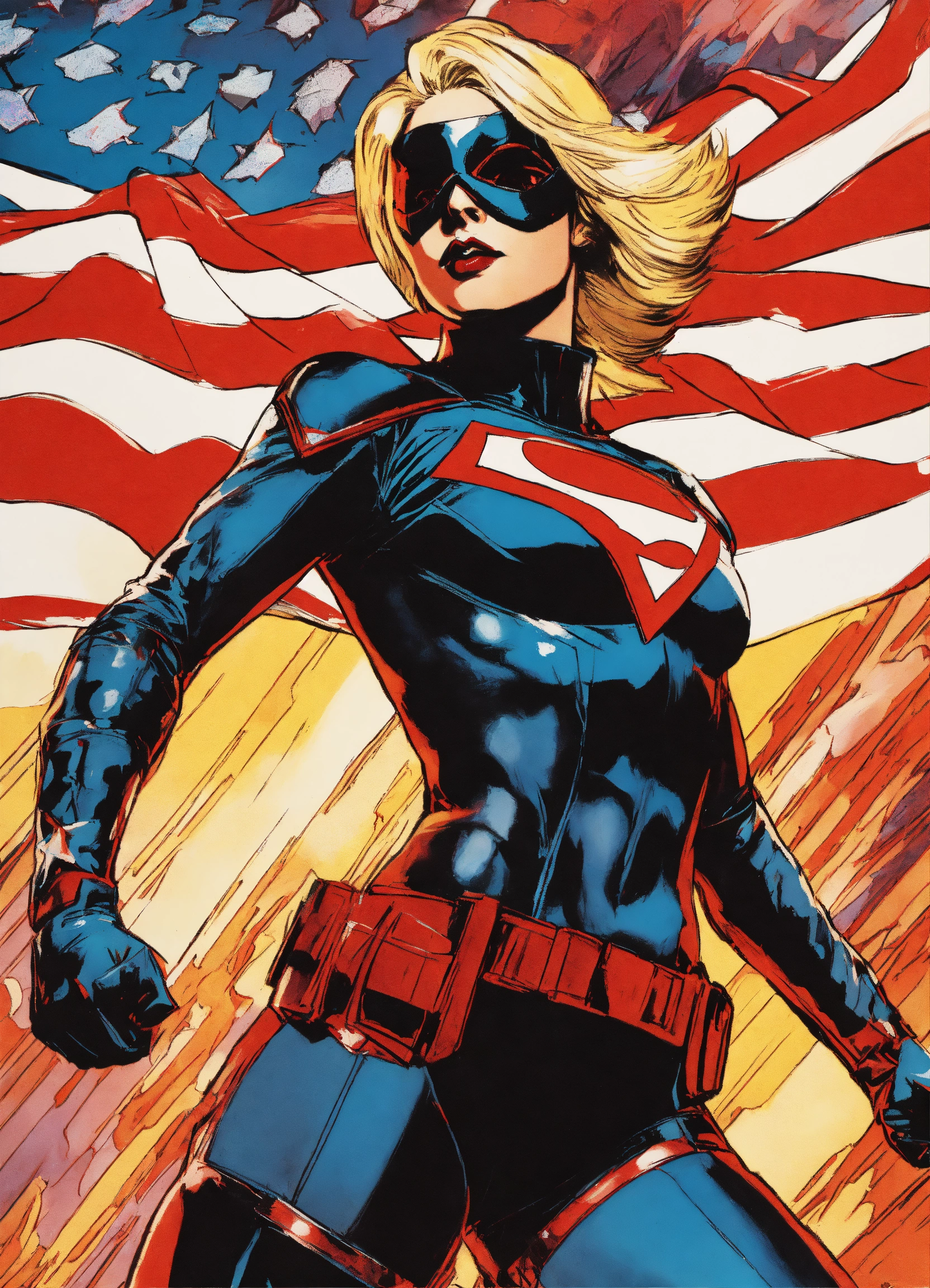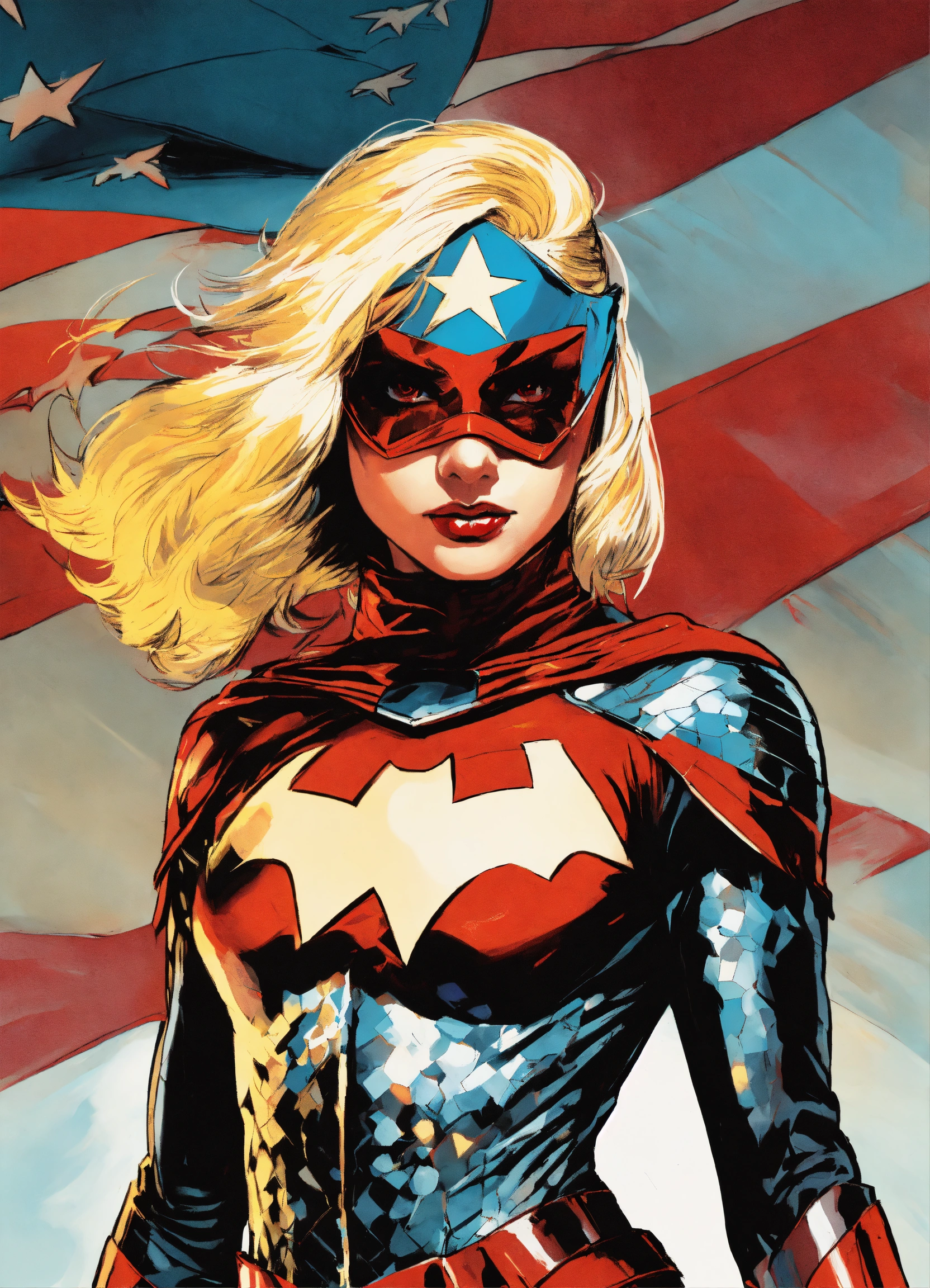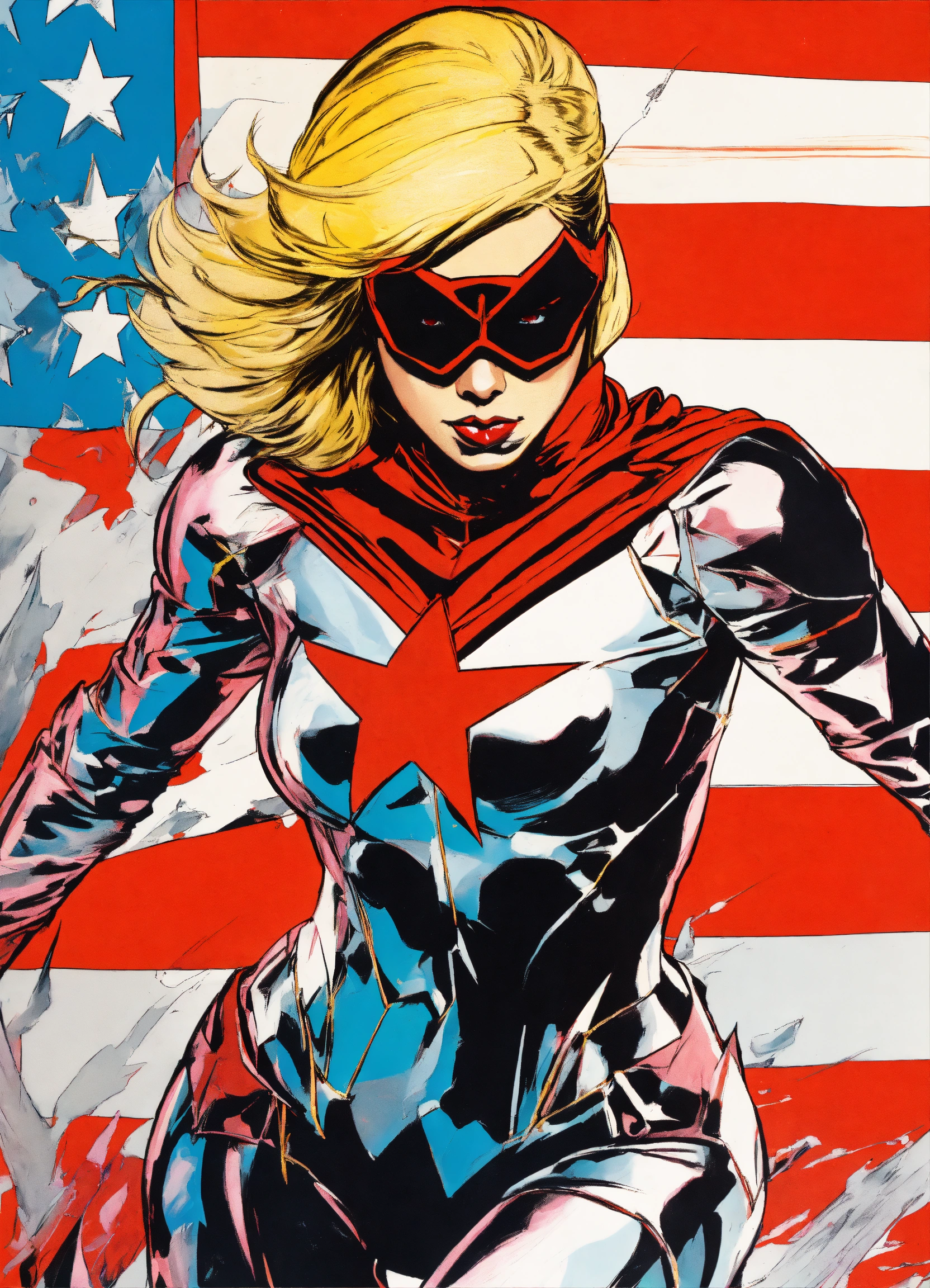 Masked blonde-haired female superhero, flying pose, fiery red eyes, sharp focus, art by andy warhol, wearing crystal four-piece armor, very feminine, powerful, and fierce, surrealism, american flag surrounds her comic book art style.