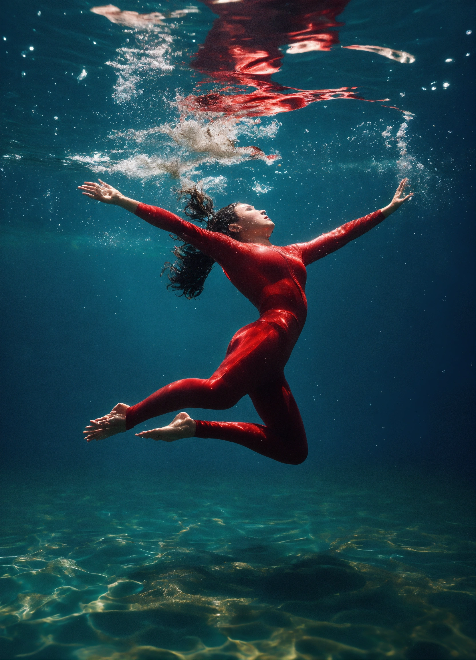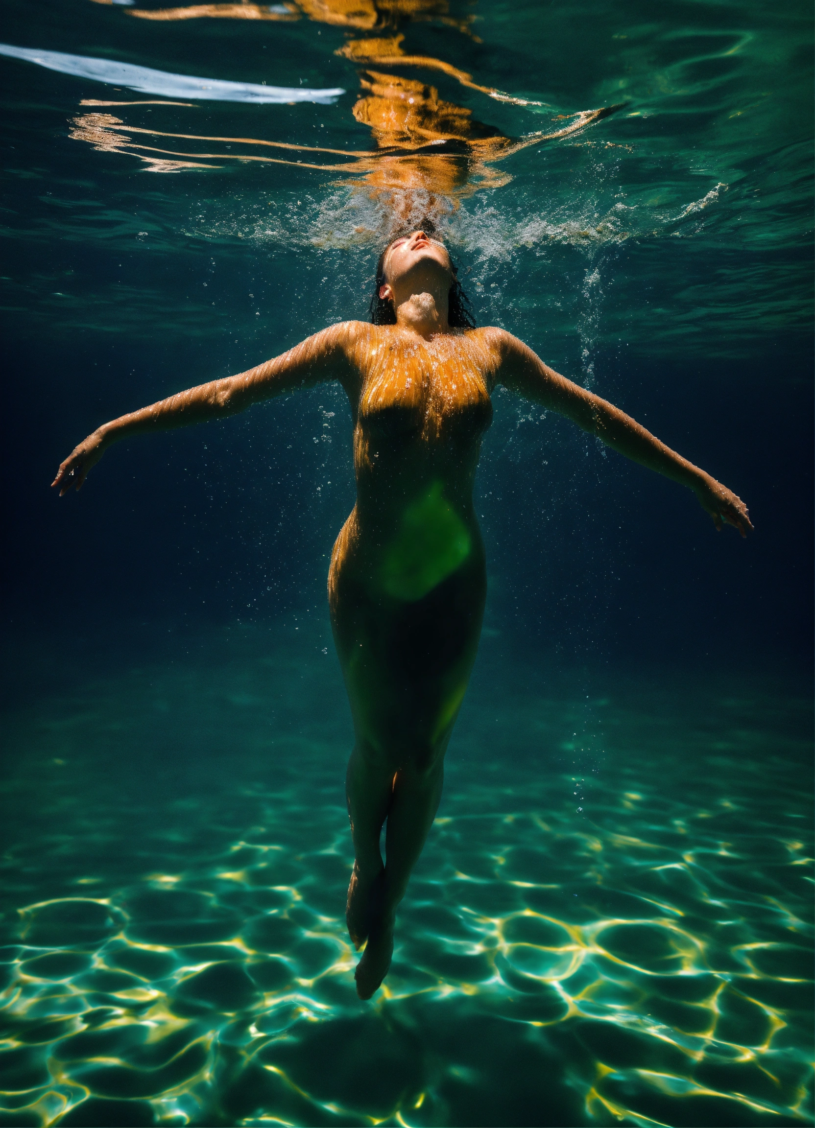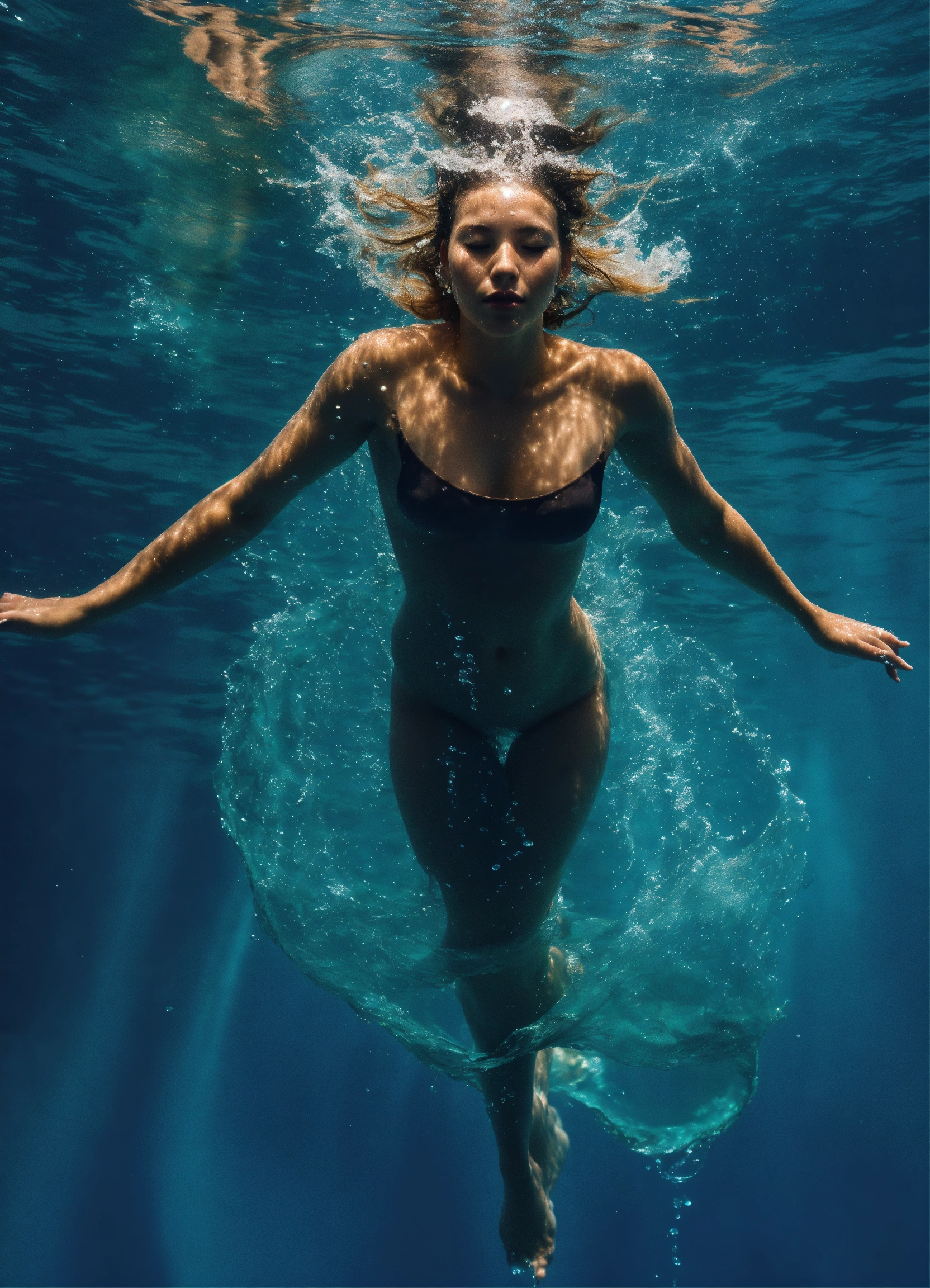 Drop of water dives under the water surface and then morphs into a human figure under the water's surface. accompanied by a mesmerizing dance of swirling ripple and splash, half waterdrop half human figure