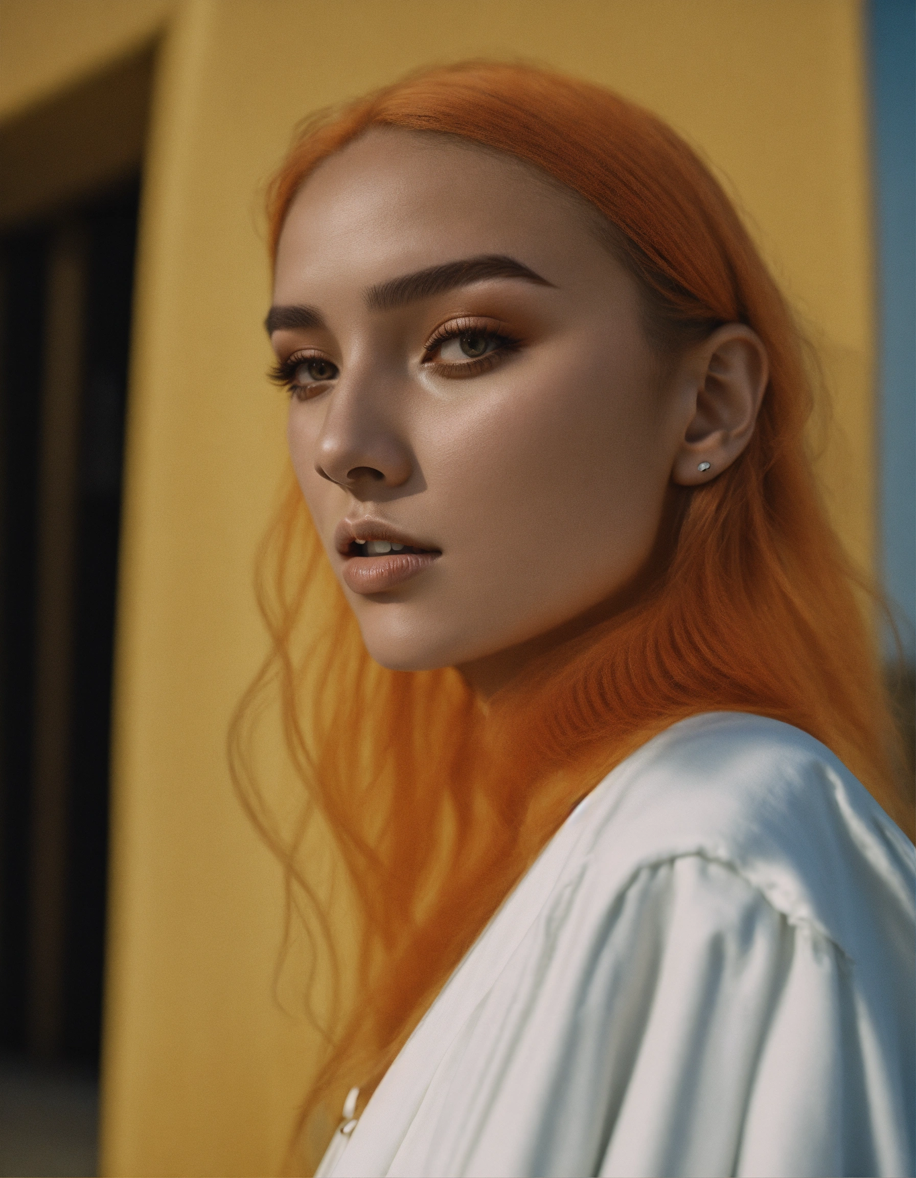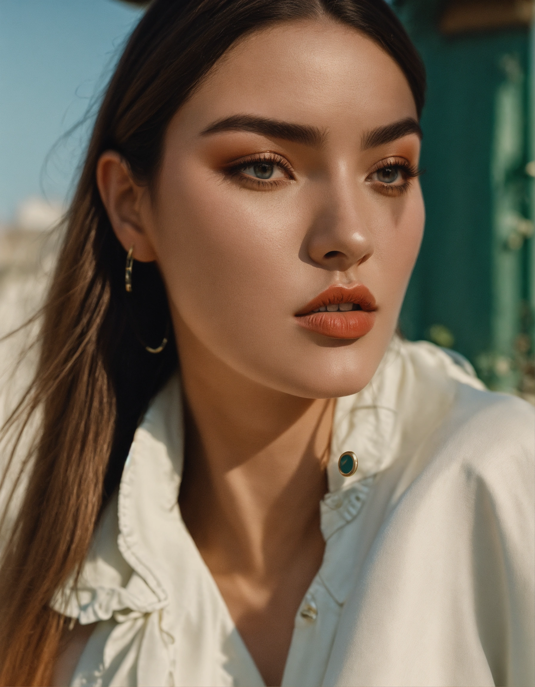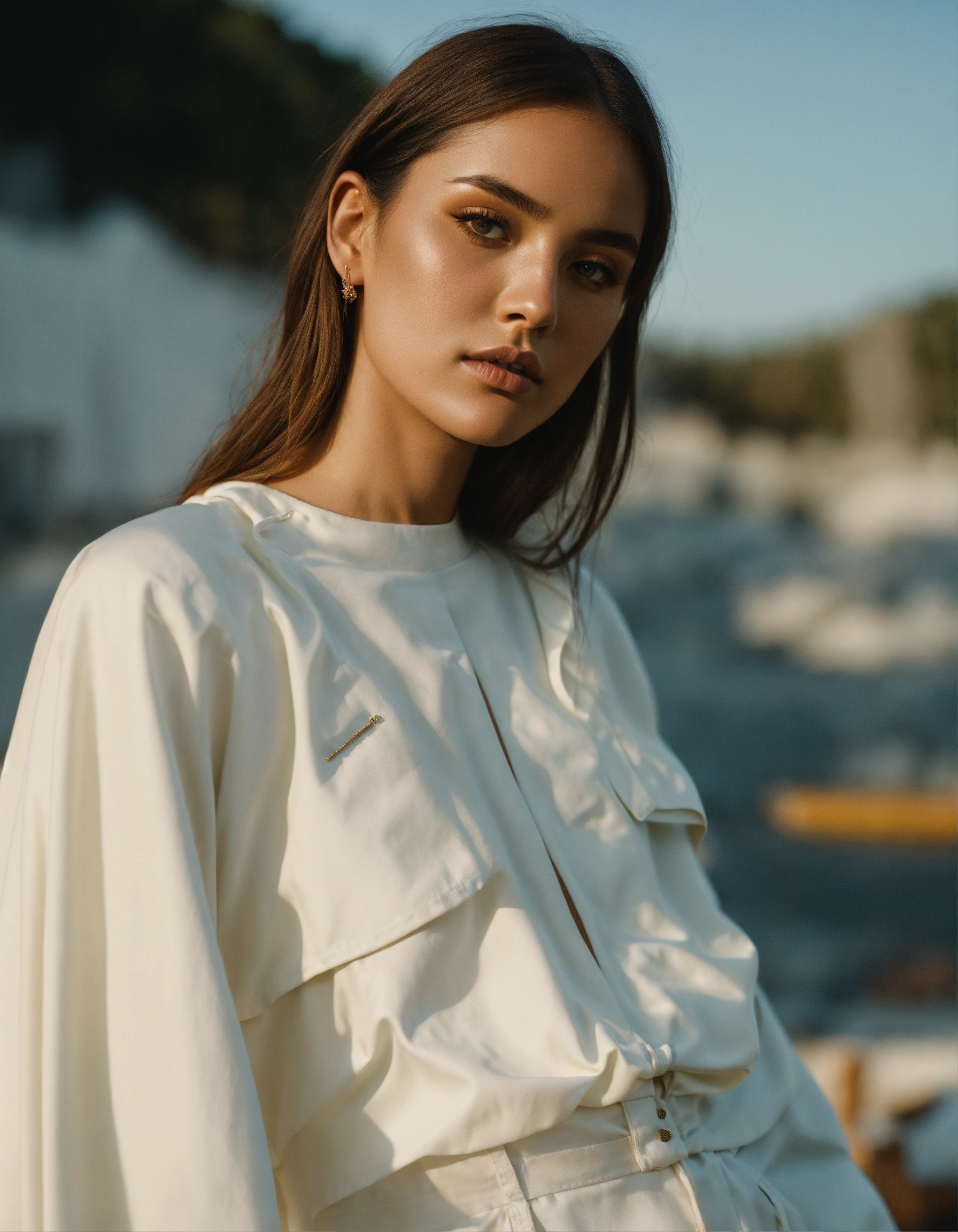 A gorgeous greek female photo, professionally retouched, model, 8k resolution, hyper realistic, day, 35mm film, editorial, high fashion, 2023, off white by virgil abloh