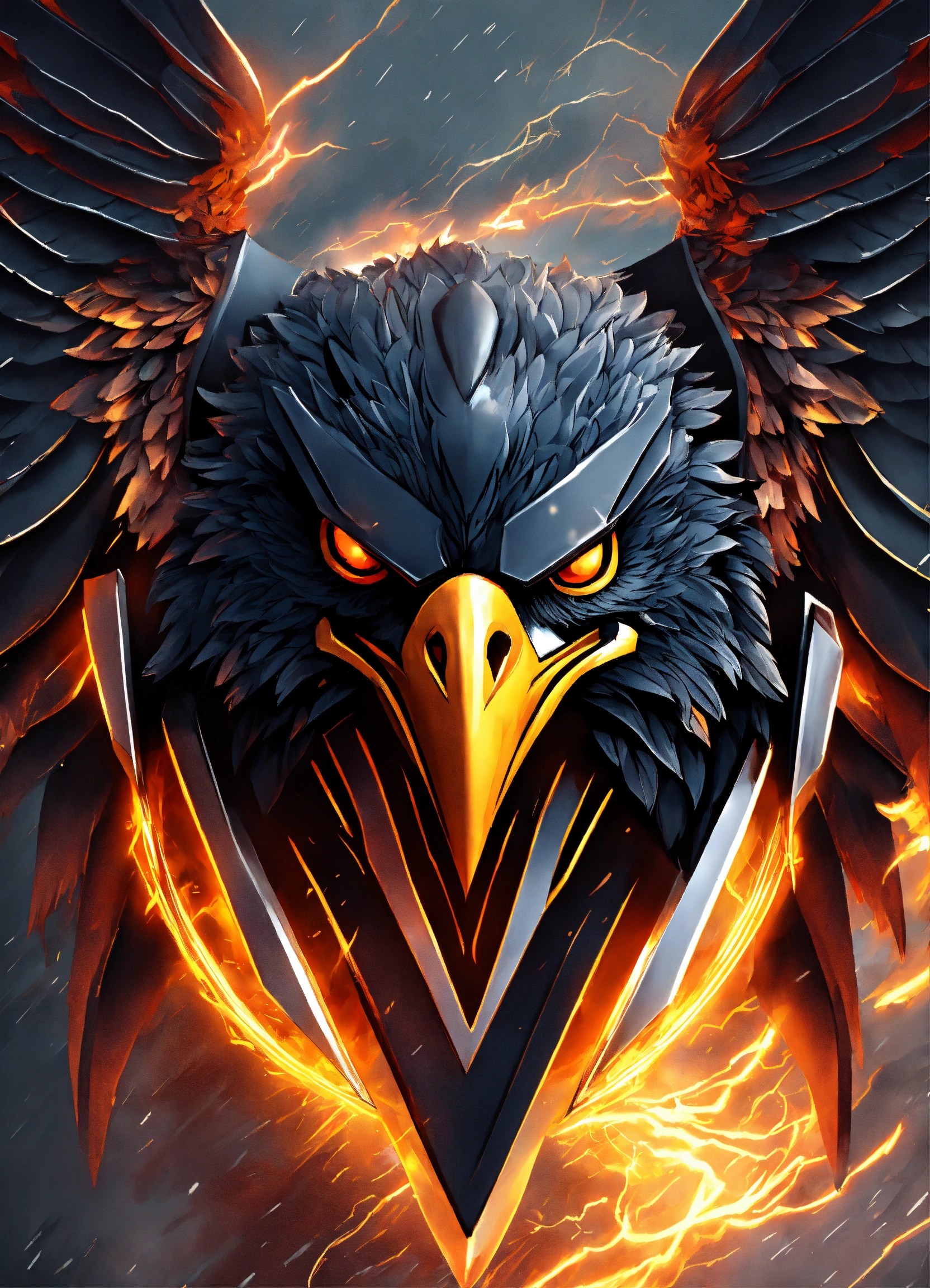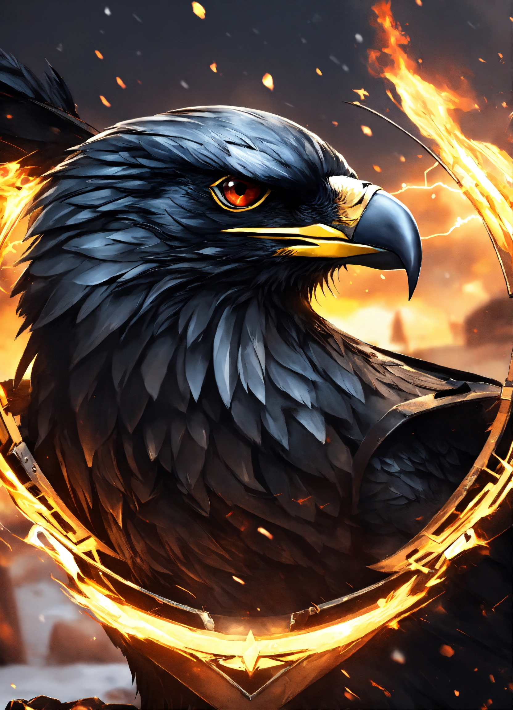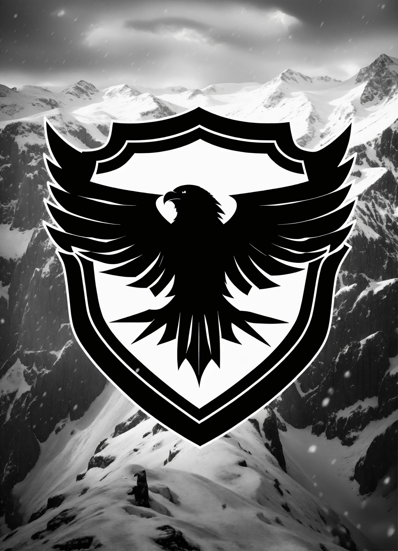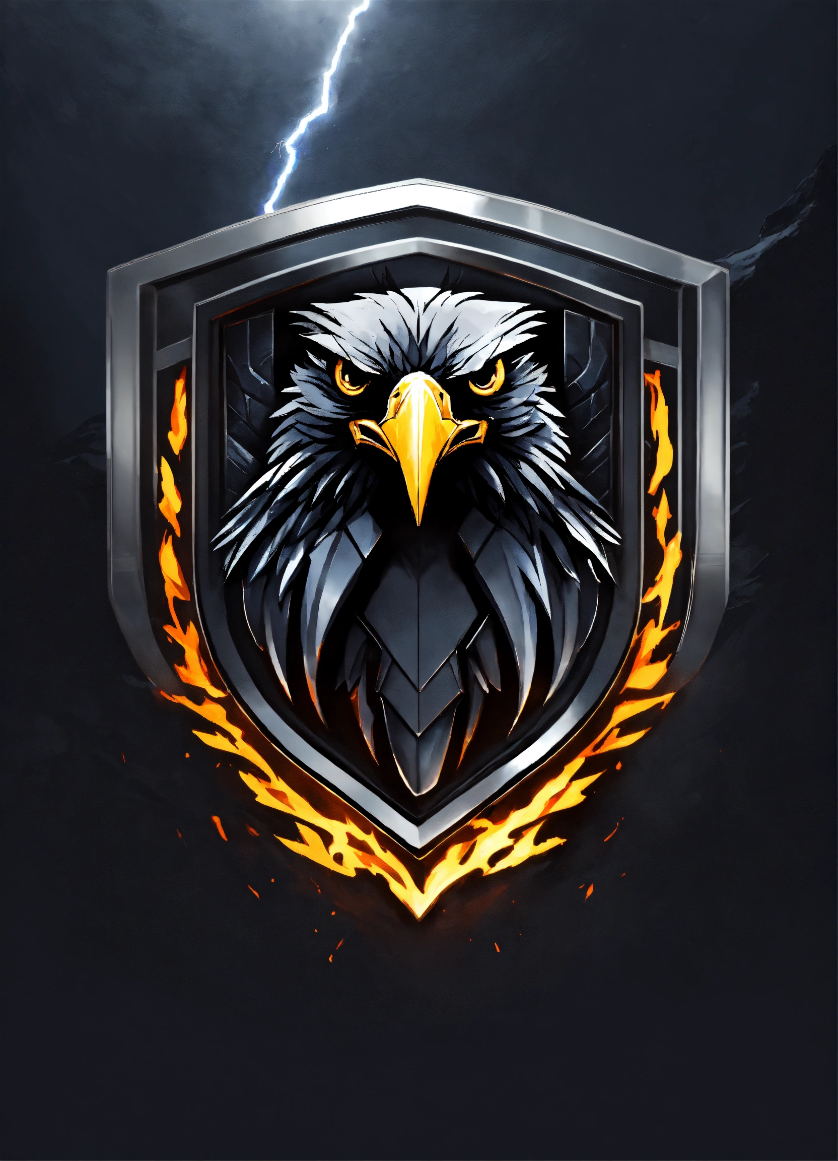 Angry black eagle logo, snow style, futuristic logo, shield with captions "ravens of the north", metal logo, fire, lightning