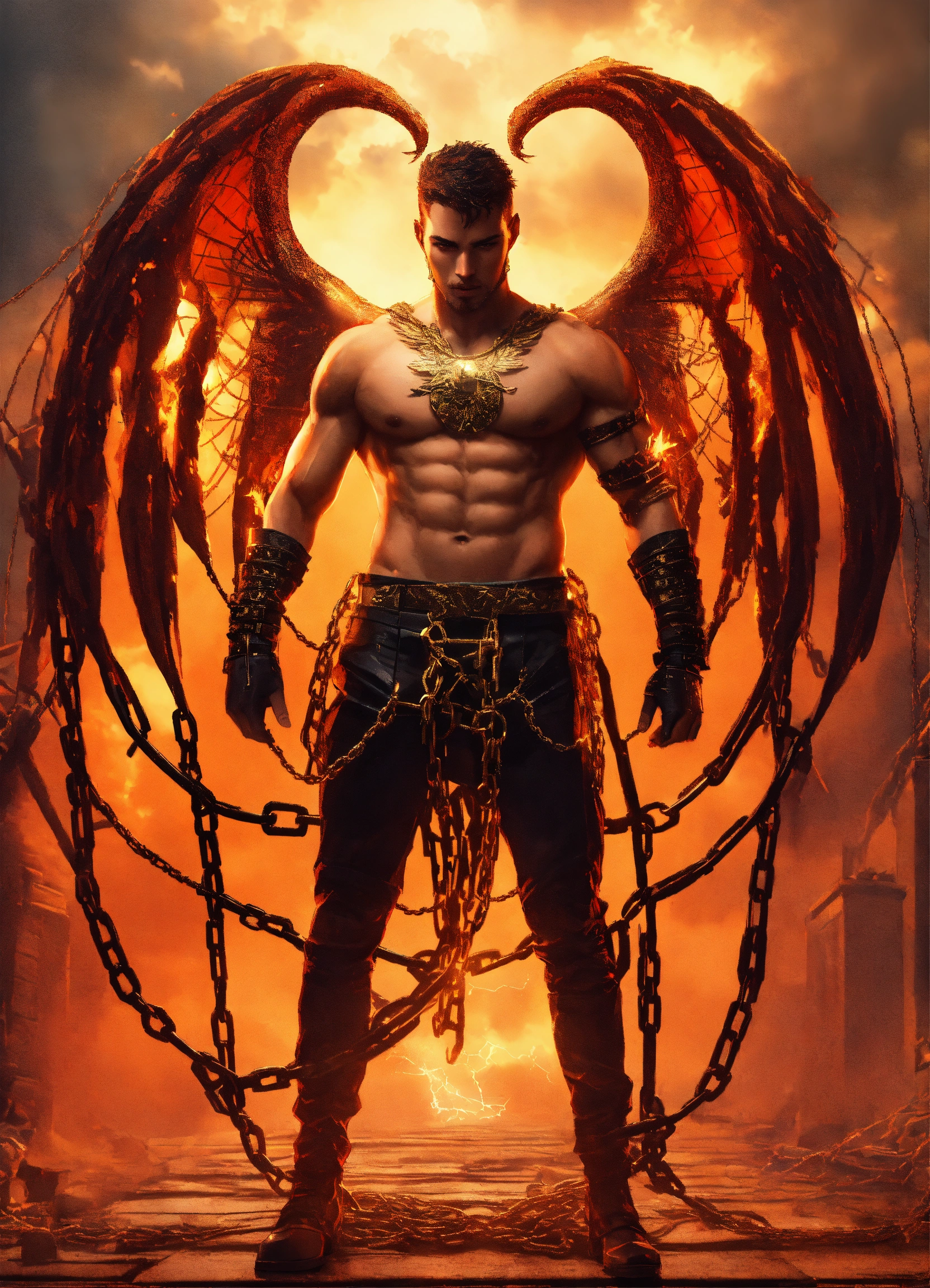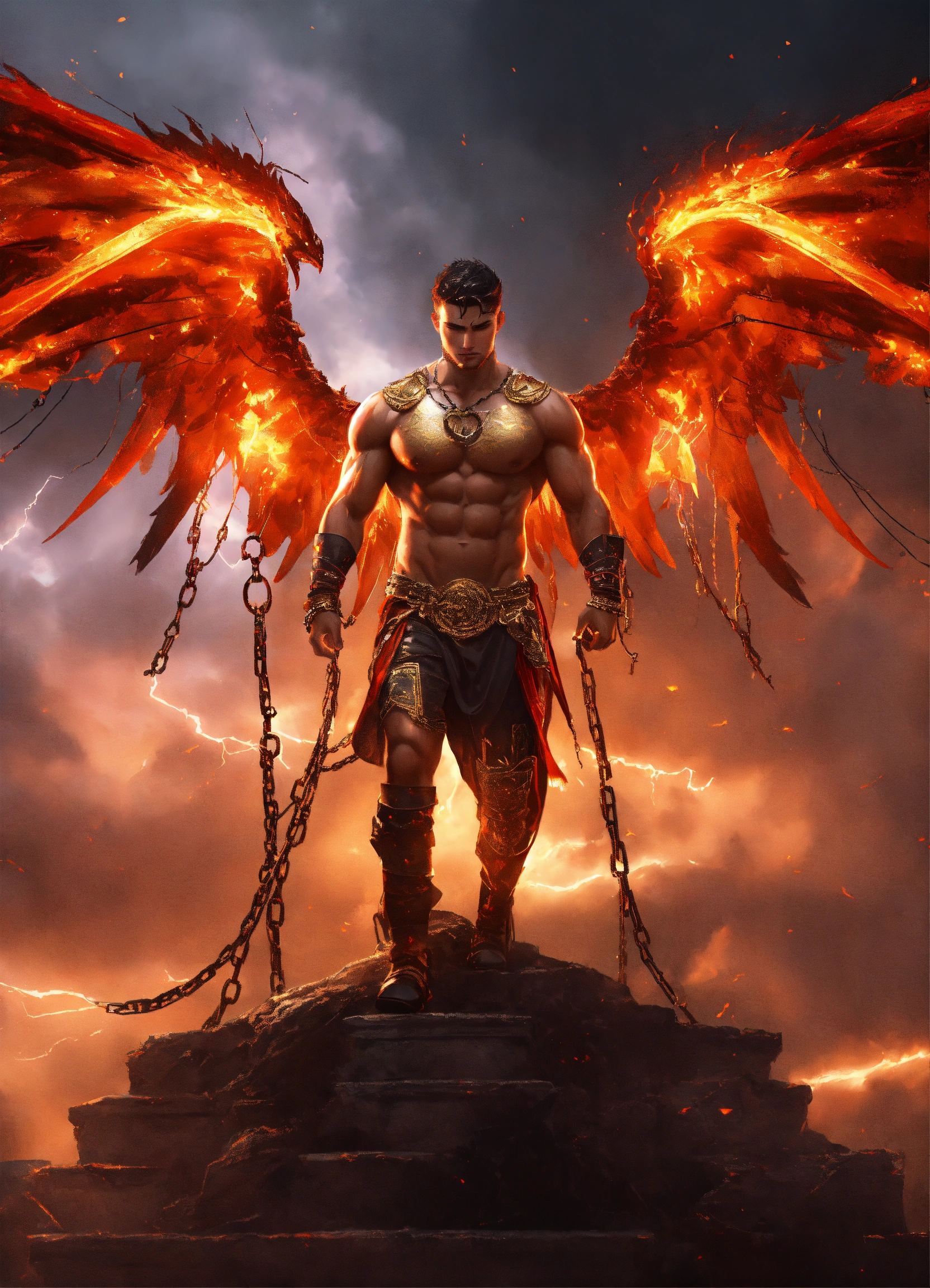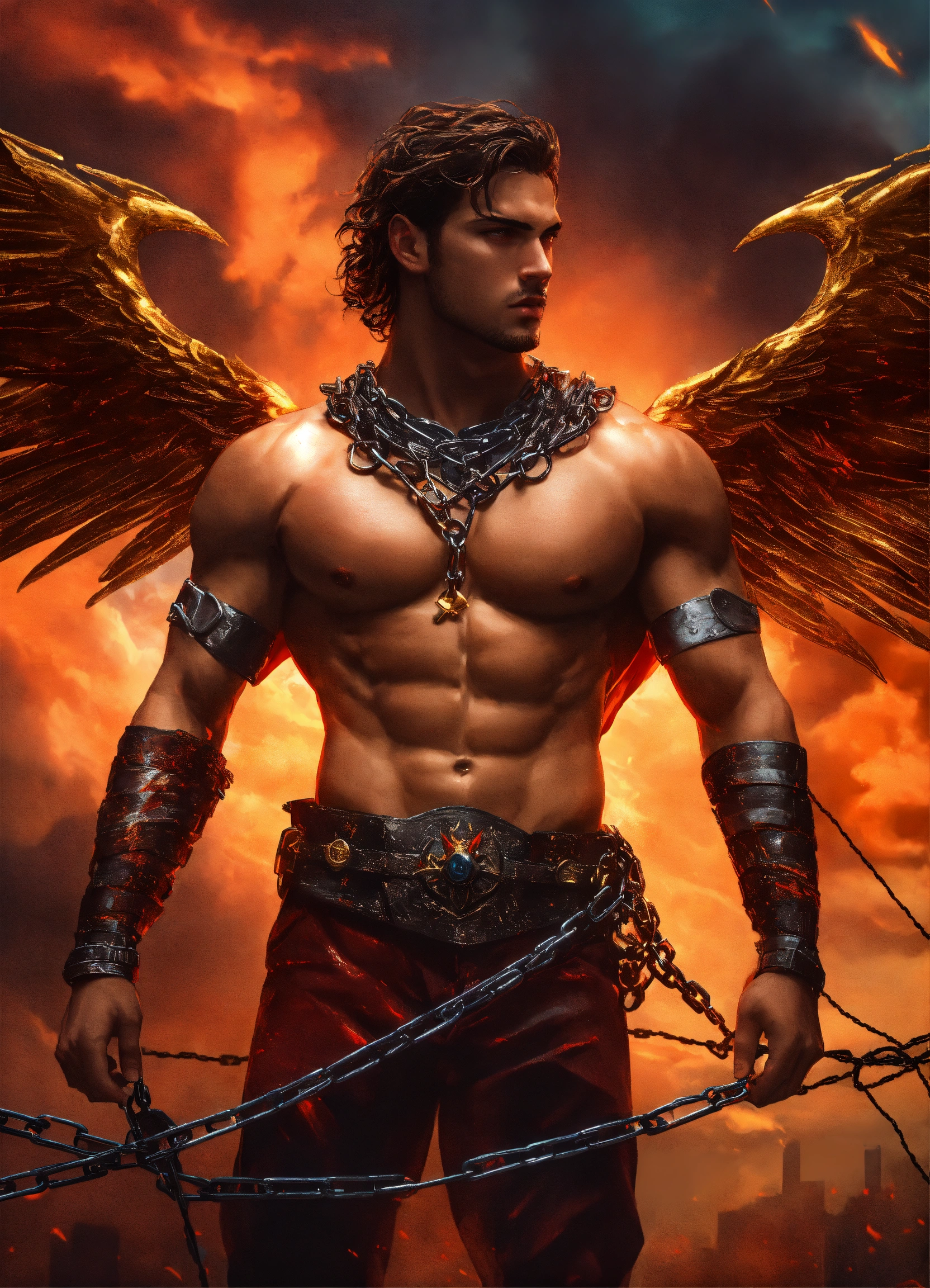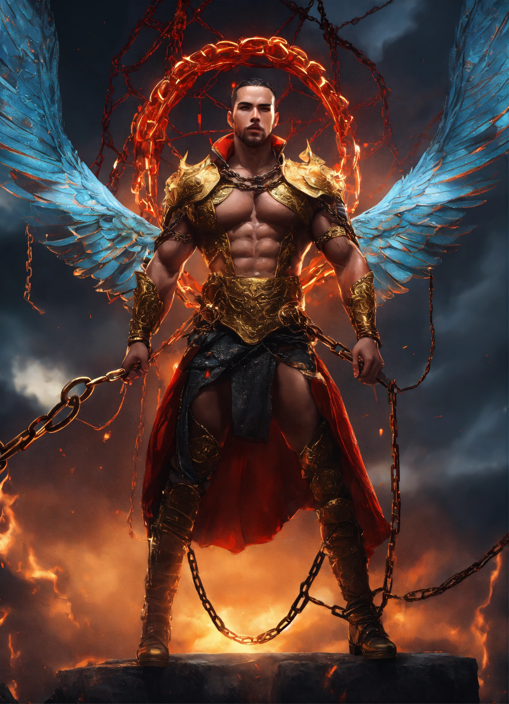 Full body handcuffed futuristic warrior prisoner caught in a web of chains, chained strong handsome futuristic angel warrior man with wings chained to tower spiderweb of chains, handsome face, strong muscular in fiery chains arms chained to his side, fully clothed wearing a gold warrior garb bound in fiery chains, floating in the sky with dark clouds and red lightning behind her, fantasy, high detail, realistic photo, high detail, digital painting, cinematic, stunning, hyper-realistic, sharp focus, high resolution 8k, insanely detailed