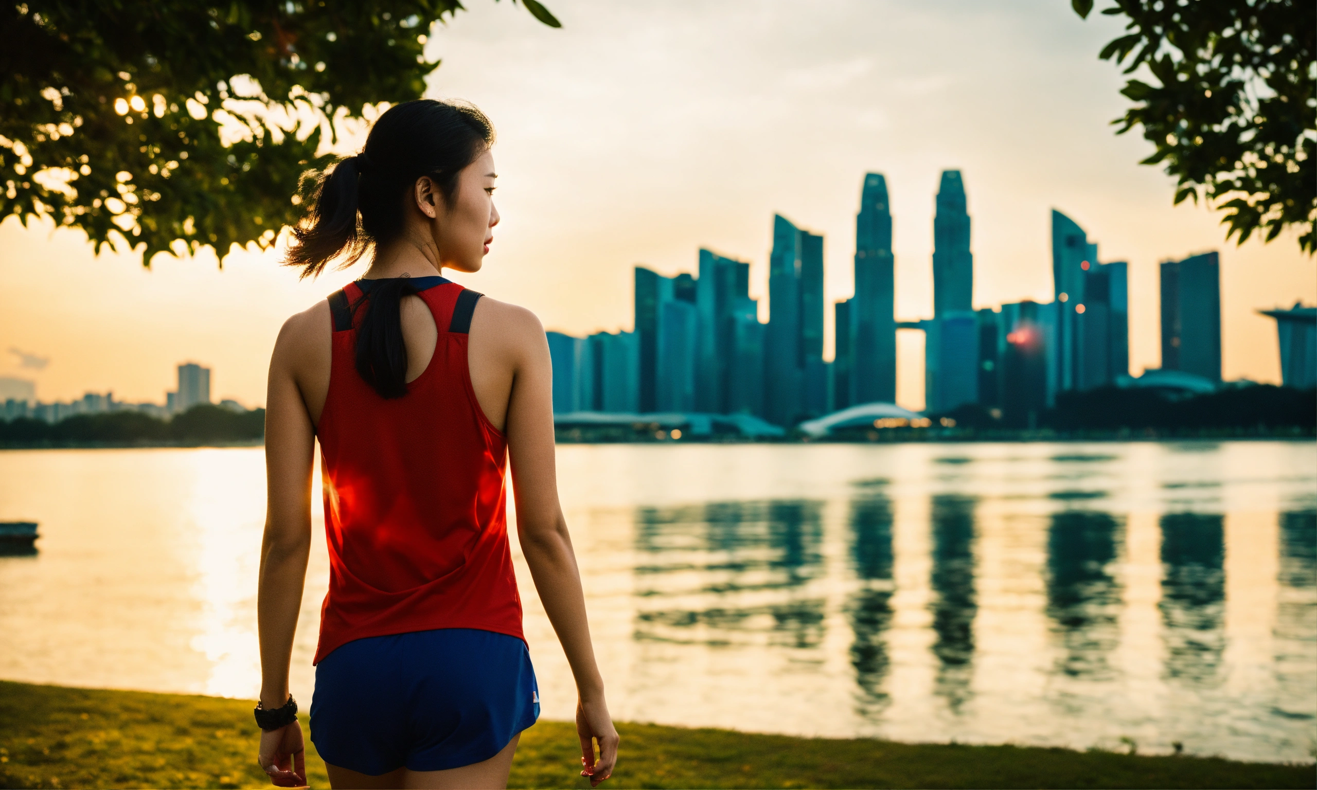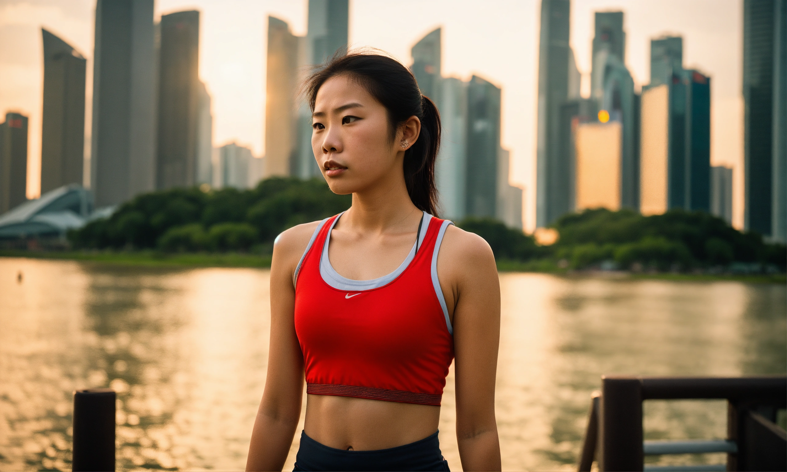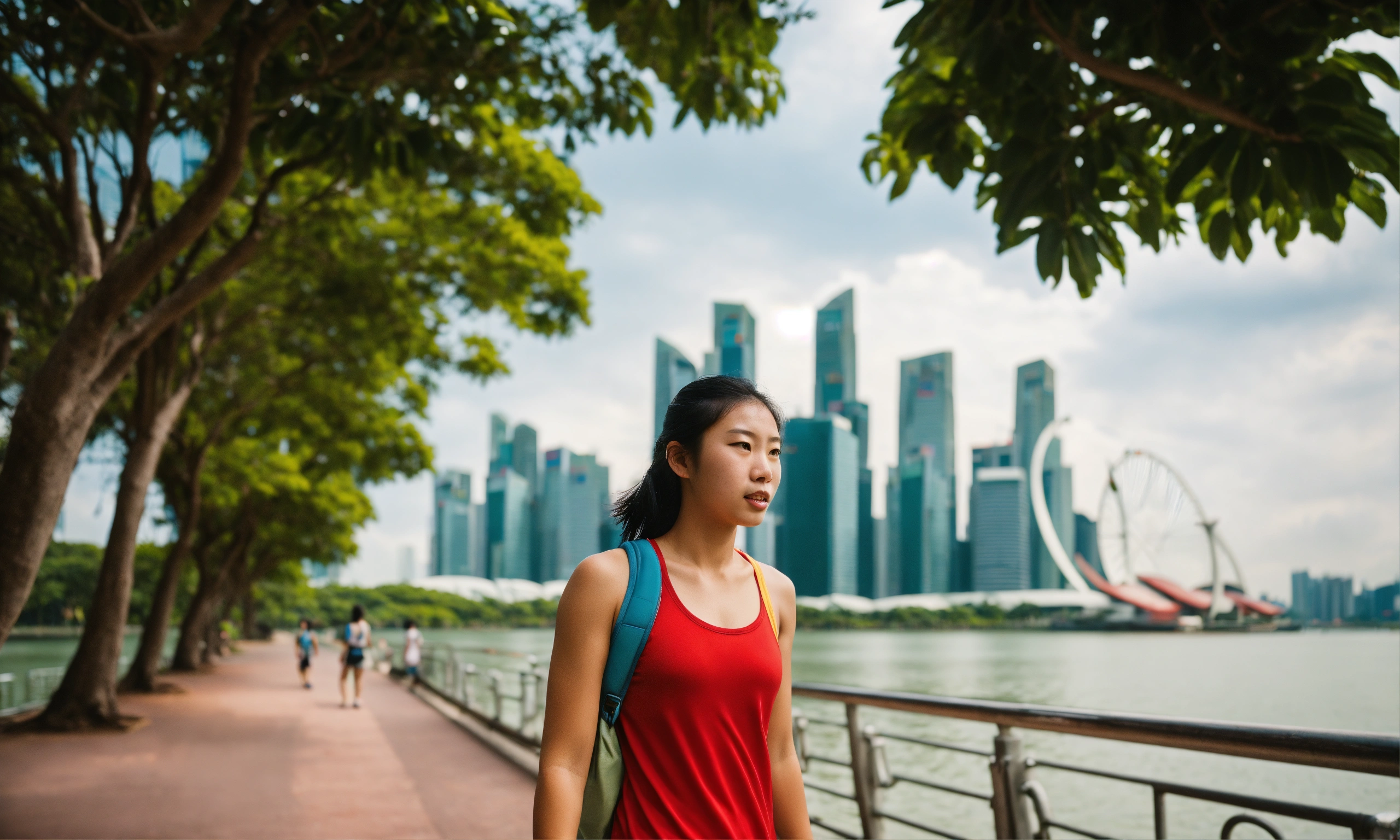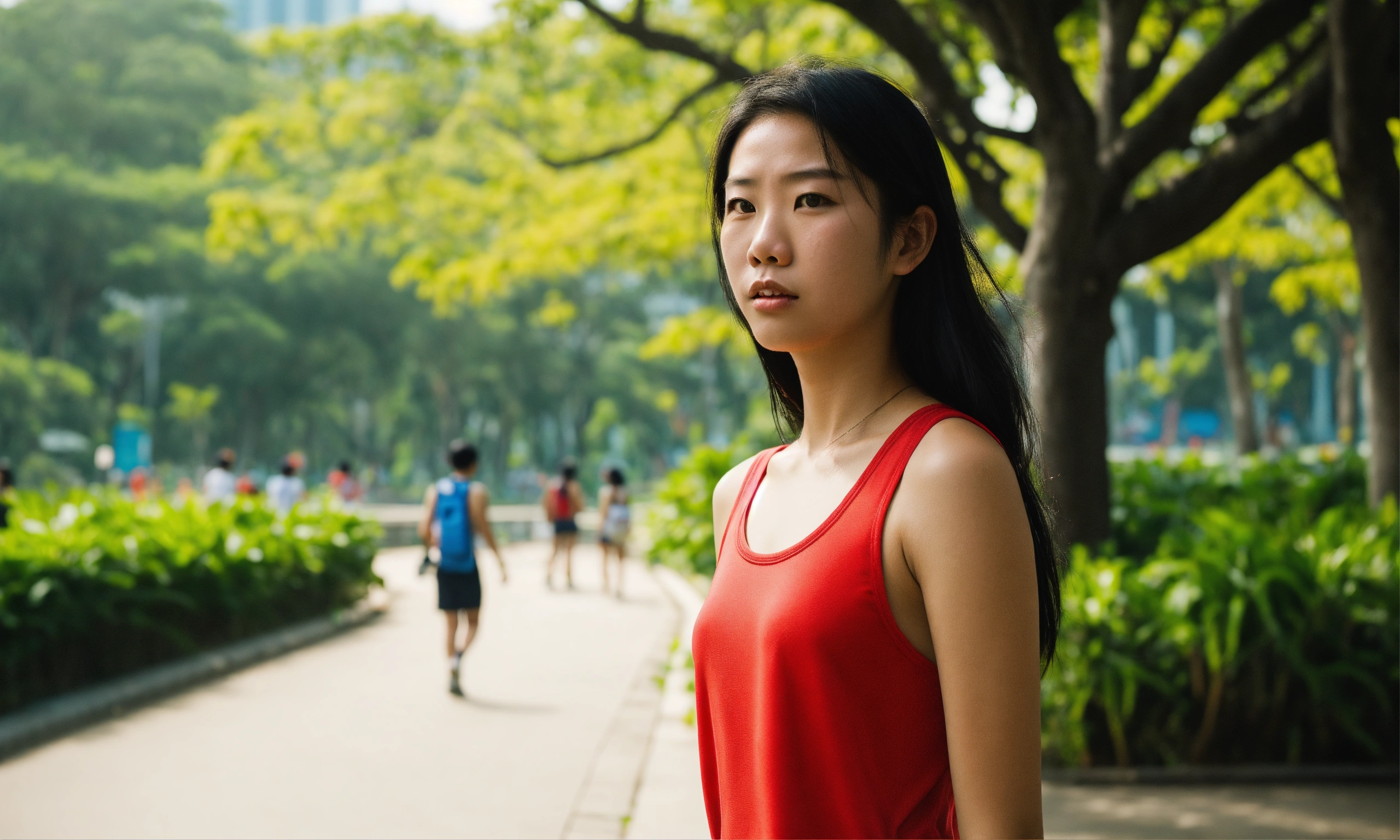 Close up shot of an athletic 18-year-old asian girl walking in singapore's east coast park, a sleeveless plain red singlet, determined and slightly annoyed expression, looking into the water, without backpack, towering trees, backdrop is the iconic singapore cityscape rises with modern skyscrapers and marina barrage, and vibrant attire symbolize the energy of this unique urban park, a leica summicron 35mm f2.0 lens to enhance the colors, shooting with kodak portra 400 film to add cinematic richness.