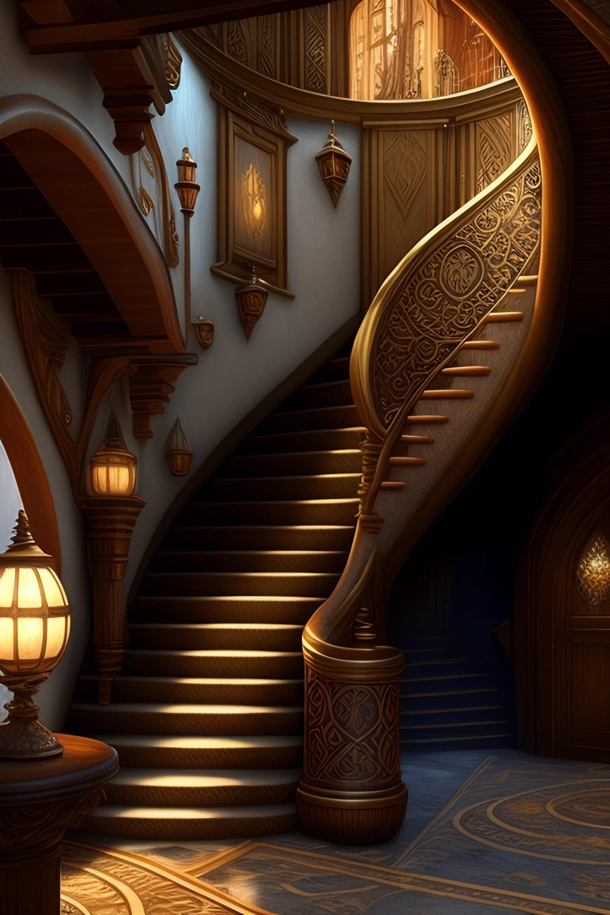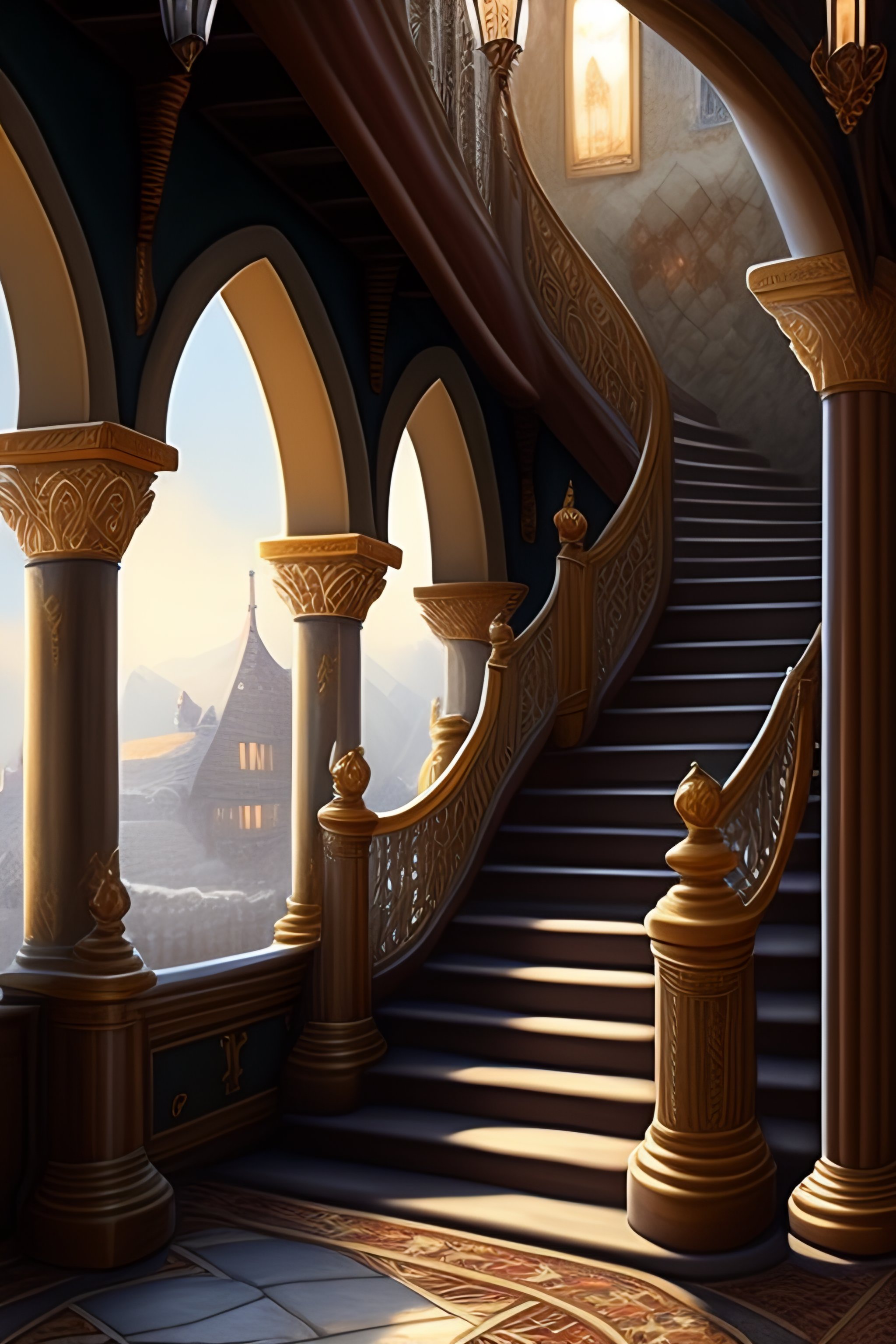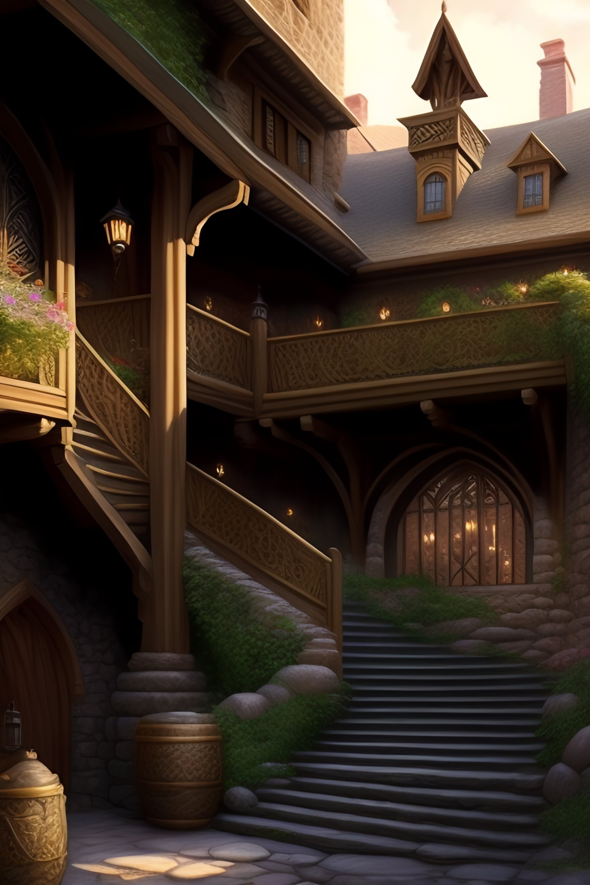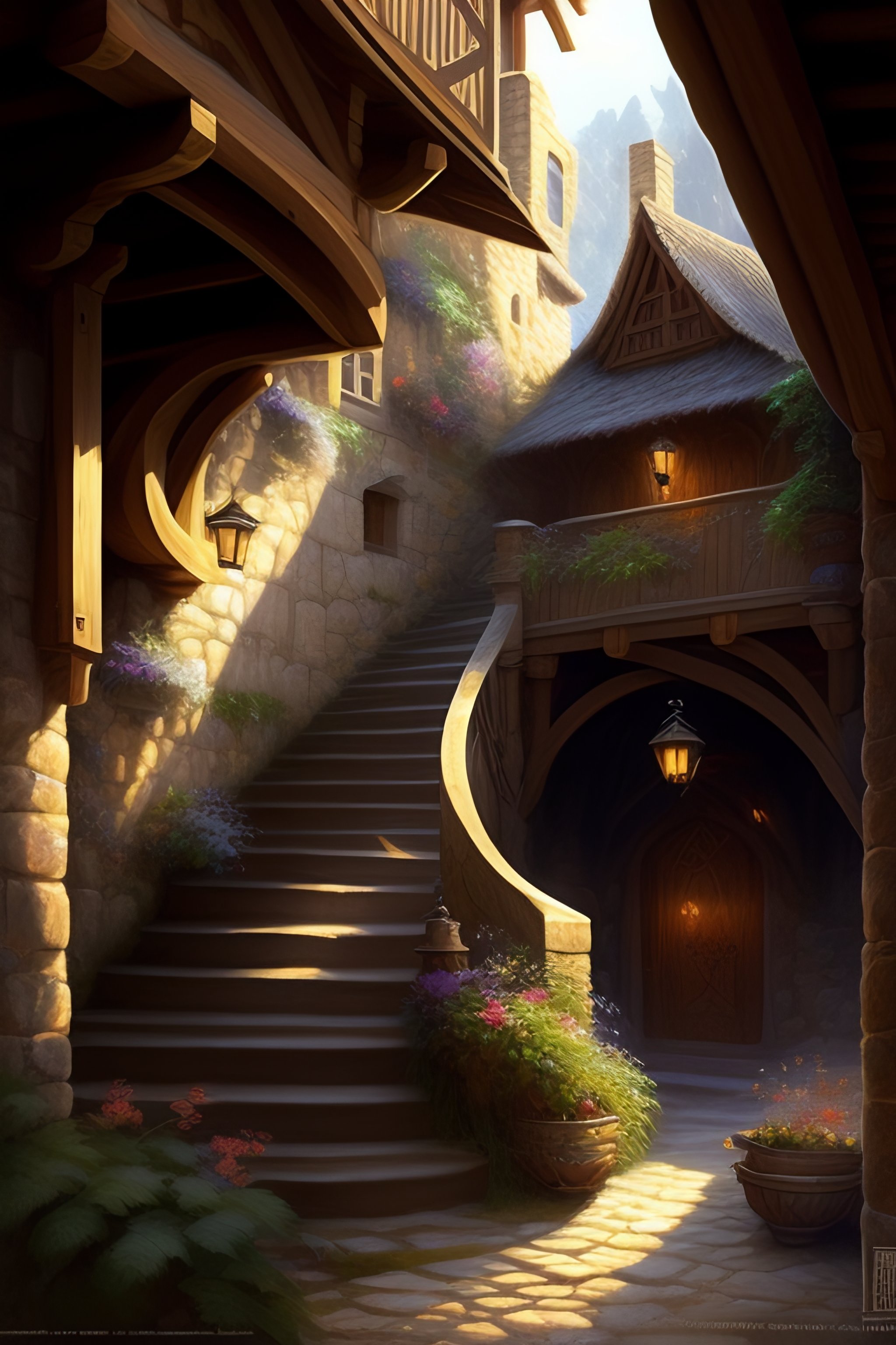 Medieval fantasy inn, stairs, james gurney and artgerm, amazing detail, intricate, stunning inking lines, 4k, character design, concept art