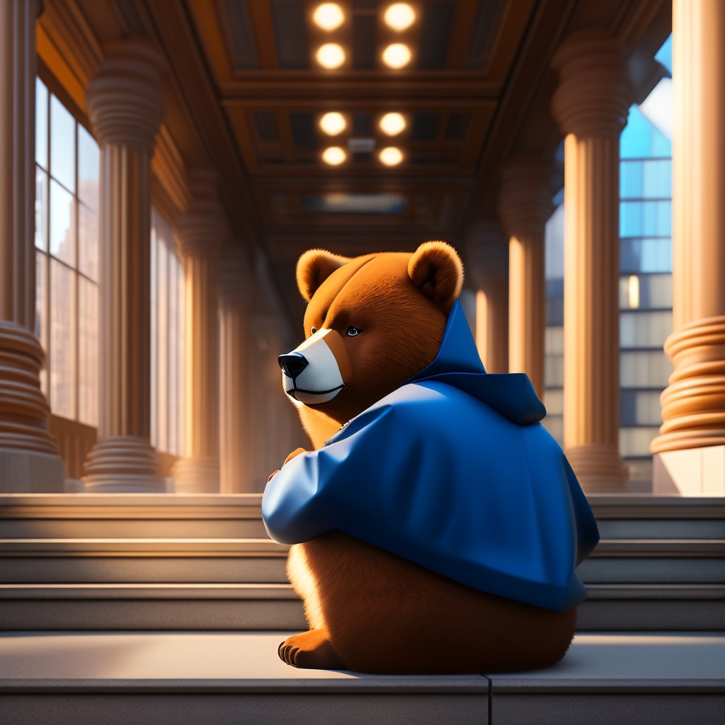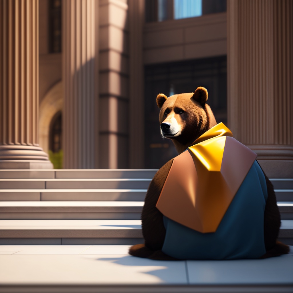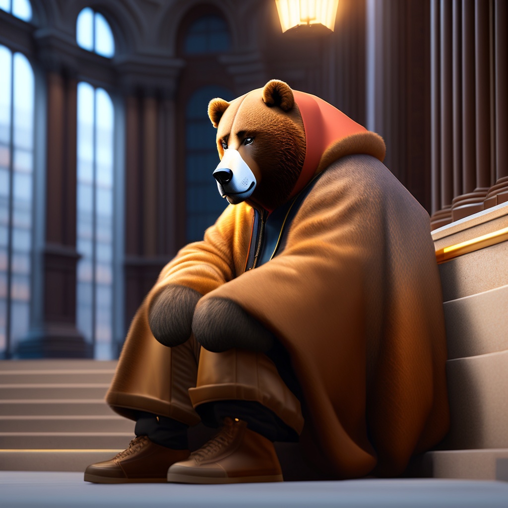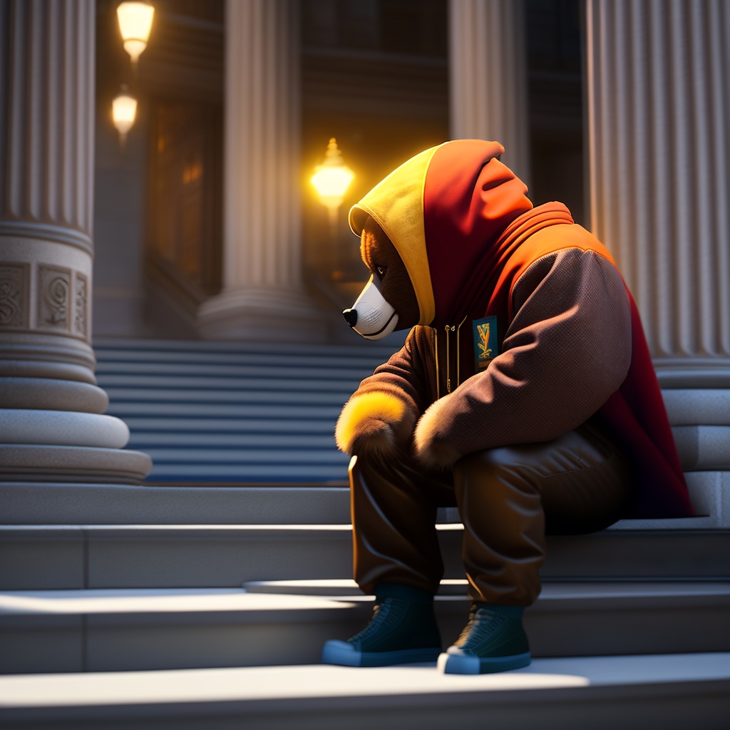 Kanye west's college dropout album cover, student in bear mascot suit sitting on the steps of the library looking off into the distance with bear head off sitting on the floor, in the style of a ed hopper painting, gustav klimt, depth of field, 32k, natural light, ray tracing, elegant, hyper-realistic, outside in street lined with skyscrapers, ray tracing ambient light occlusion, dynamic poses, neon