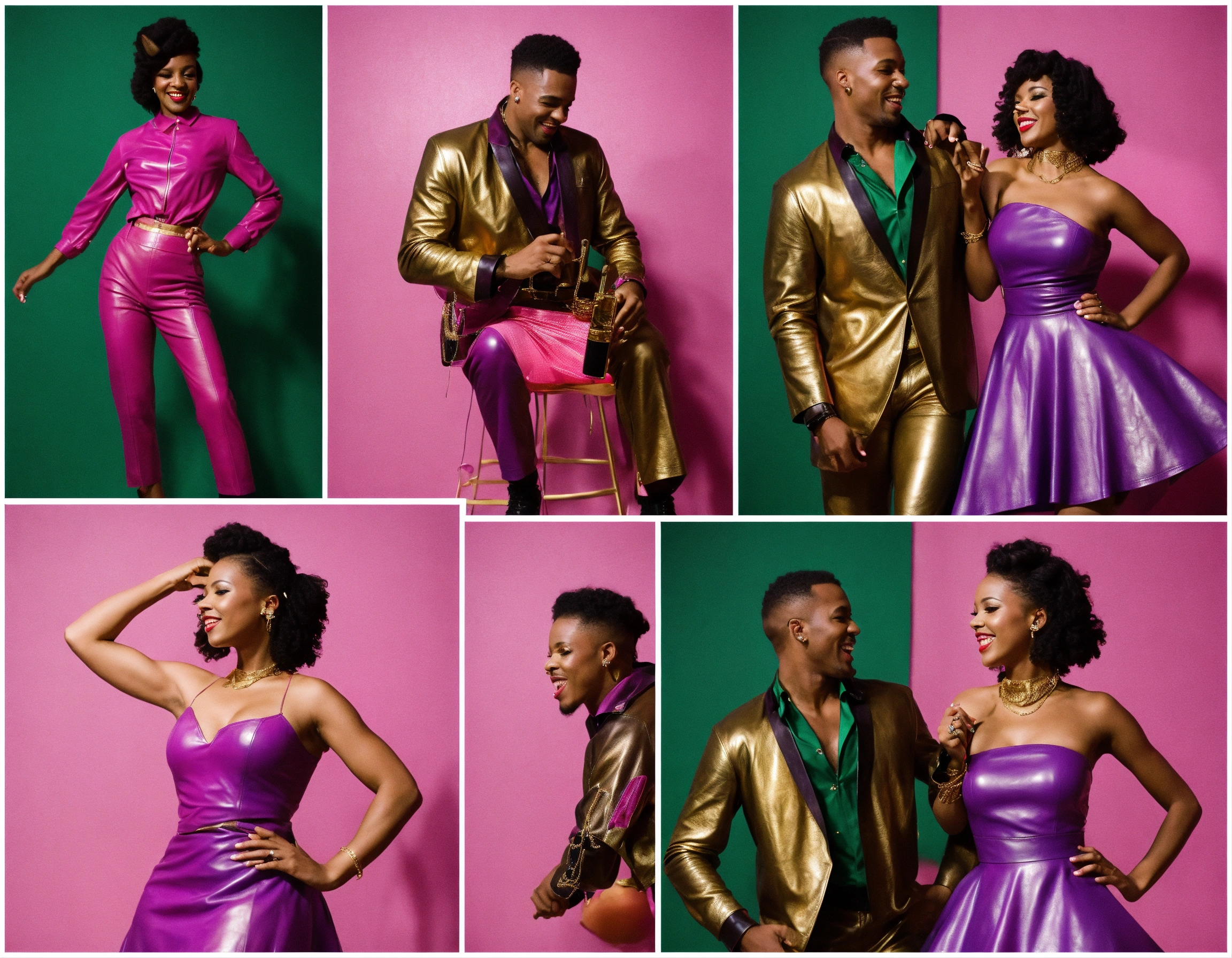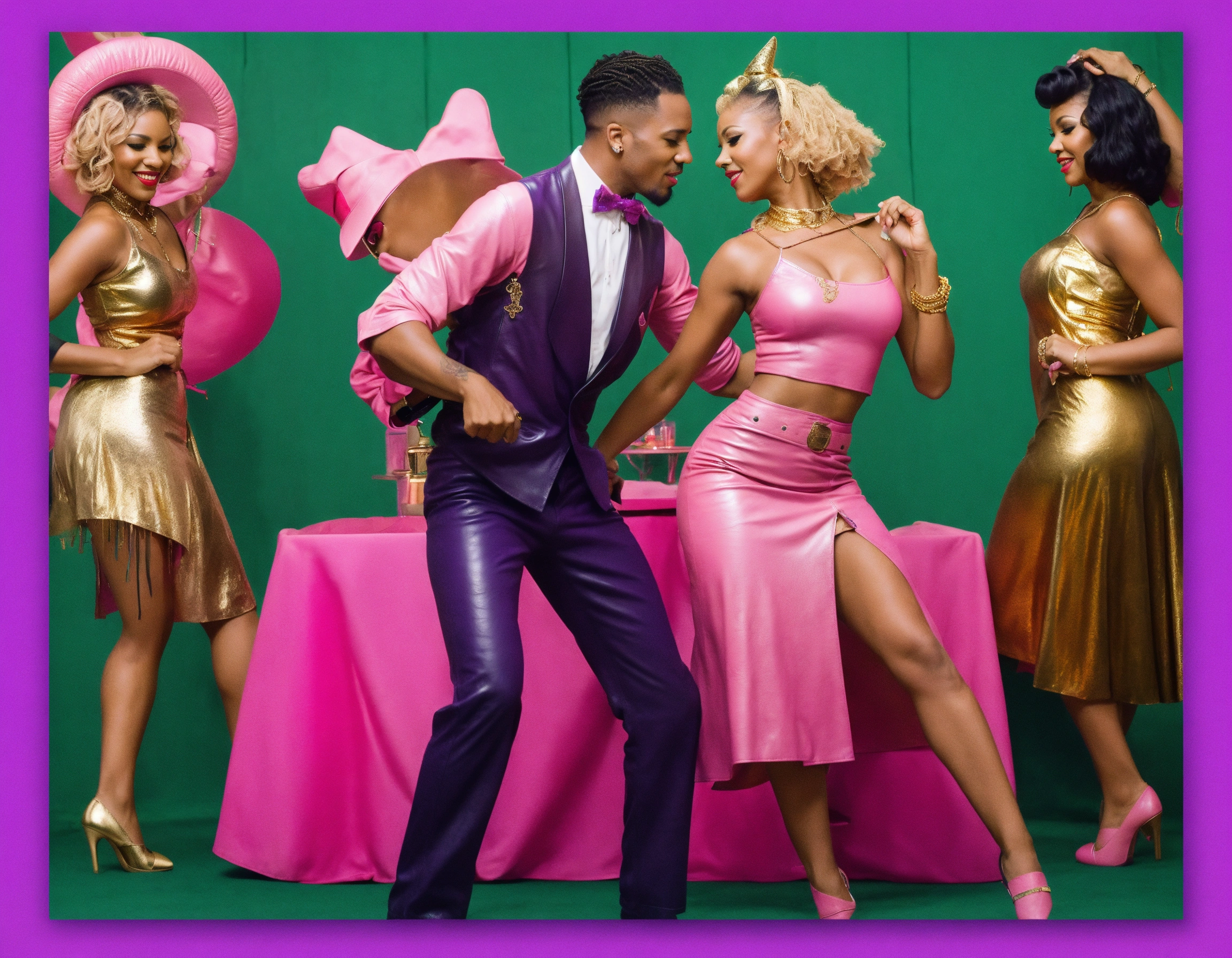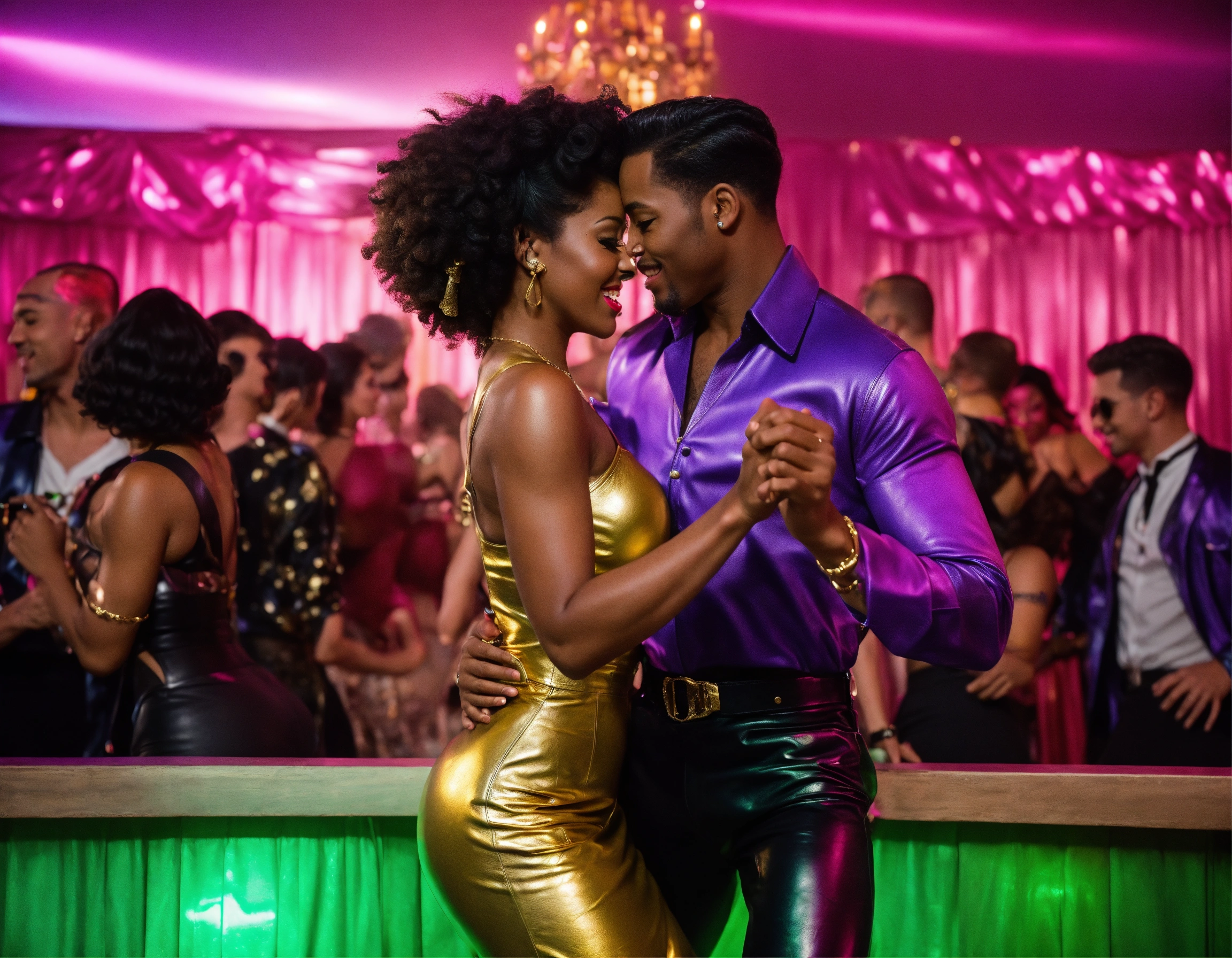 50s jazz & rock 'n' roll party - leather attires - dancehall - euro couples dancing - pink, purple, dark green, gold - 8k resolution