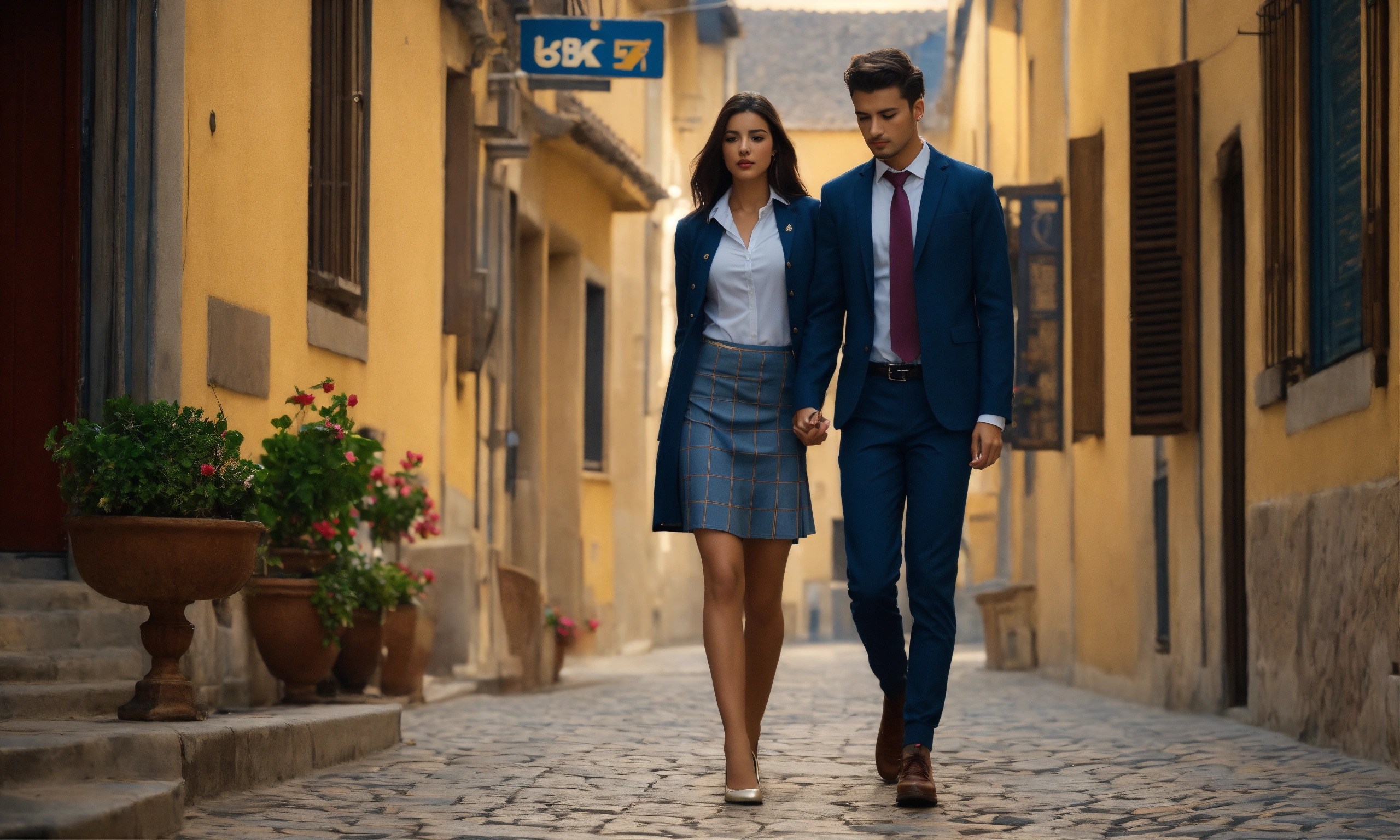 Hot adult woman, spanish girl intimating with a boy, spain, affectionate couple, taking care, schoolgirls in uniform, private school uniform, jacket, tight shirt, skirt, tights, feminine, school scenes, aura of beauty, relaxation, released tie, wide bust, pure spanish woman, sharp focus, 8k high definition, clothes too small and thin, undersized shirt and prominent body, shot on lo-fi], cinematic, 8k, masterpiece, xf iq 4, 1 5 0 mp, 5 0 mm, iso 2 0 0, 1 / 1 6 0 s, realistic, natural light, octane render, adobe lightroom, rule of thirds, symmetrical balance, depth layering, polarizing filter, sense of depth, ai enhanced, tailored shirt, tight-fitting