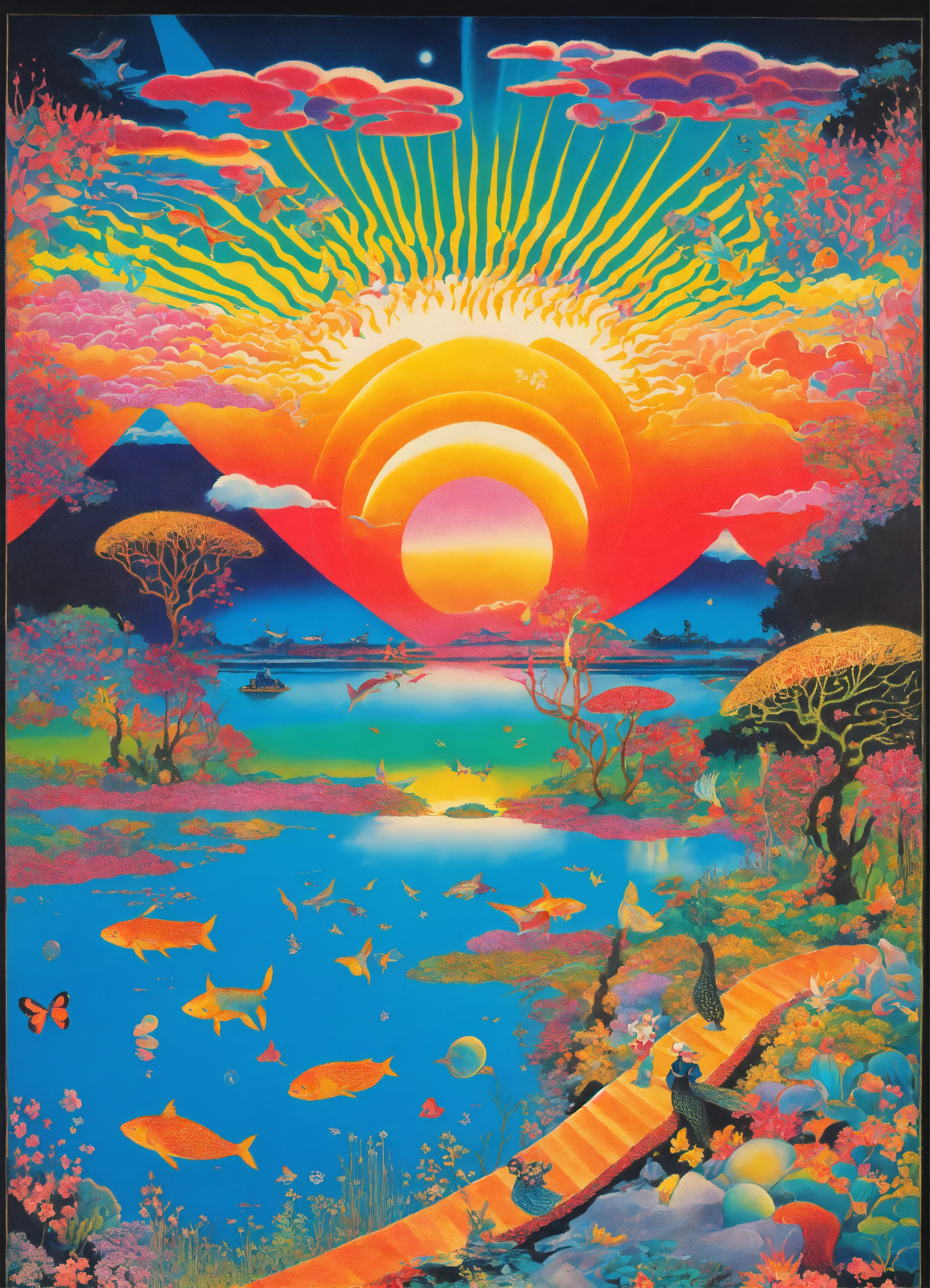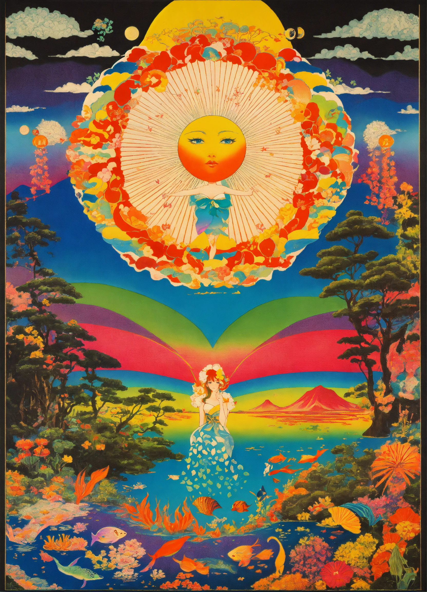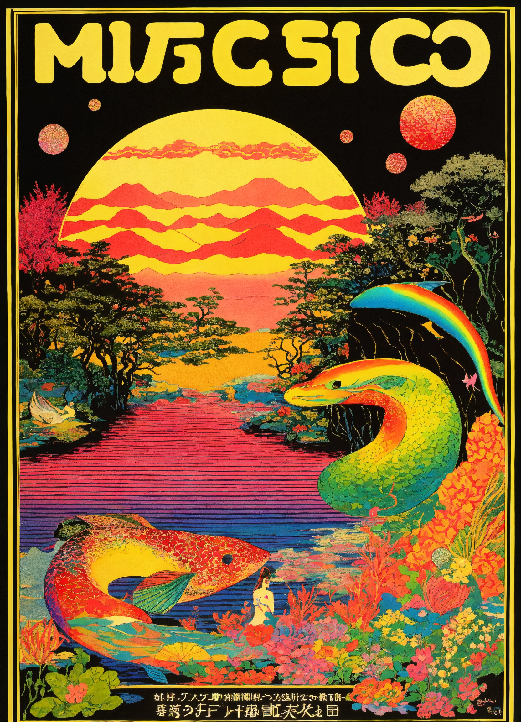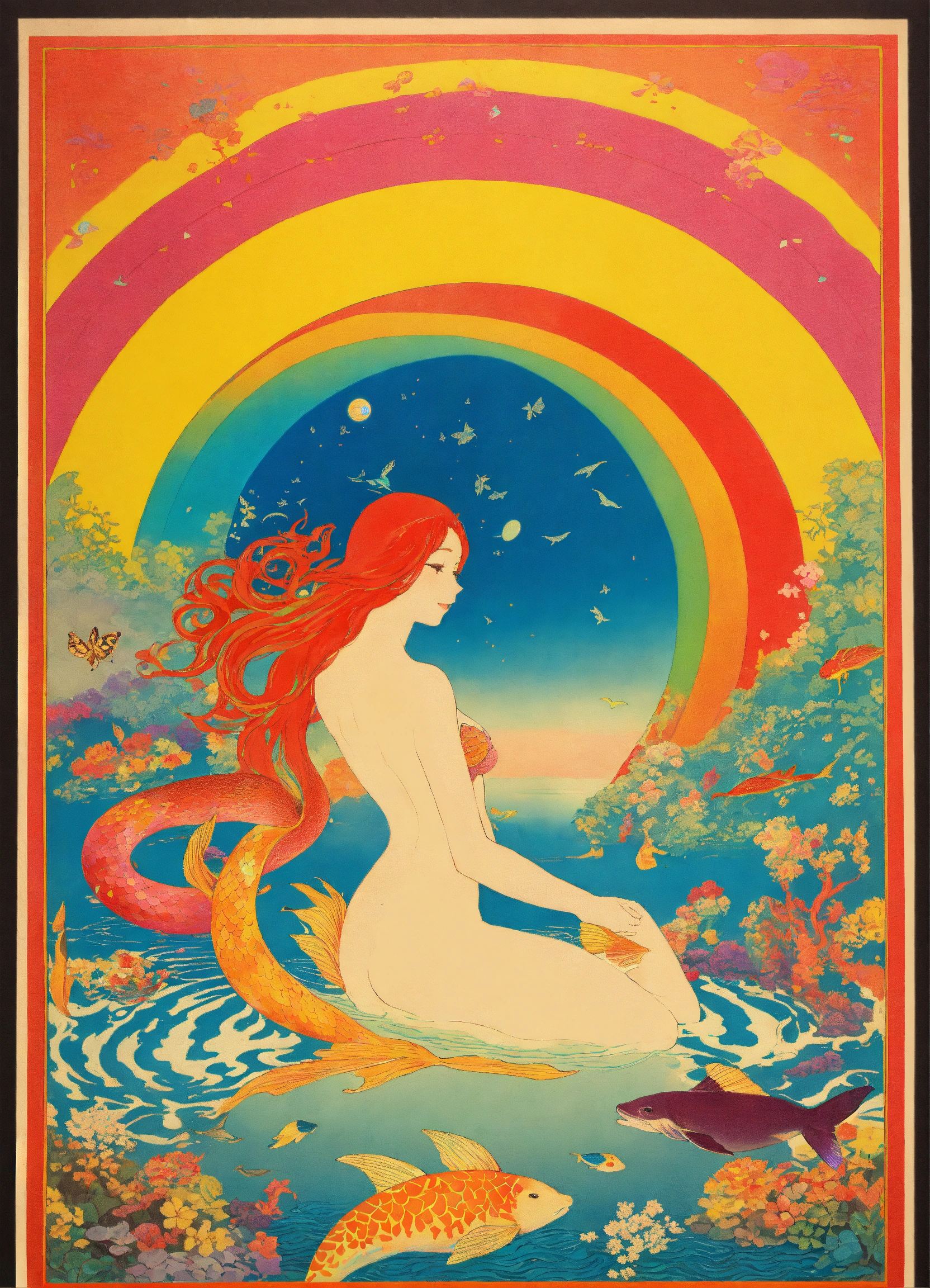 Japanese vintage poster, magica mermaid, mermaid, mind-bending illusions, dream dimension meets zen garden, neon dolphins, black and white, rainbow butterflies, zigzag sun, by victor moscoso