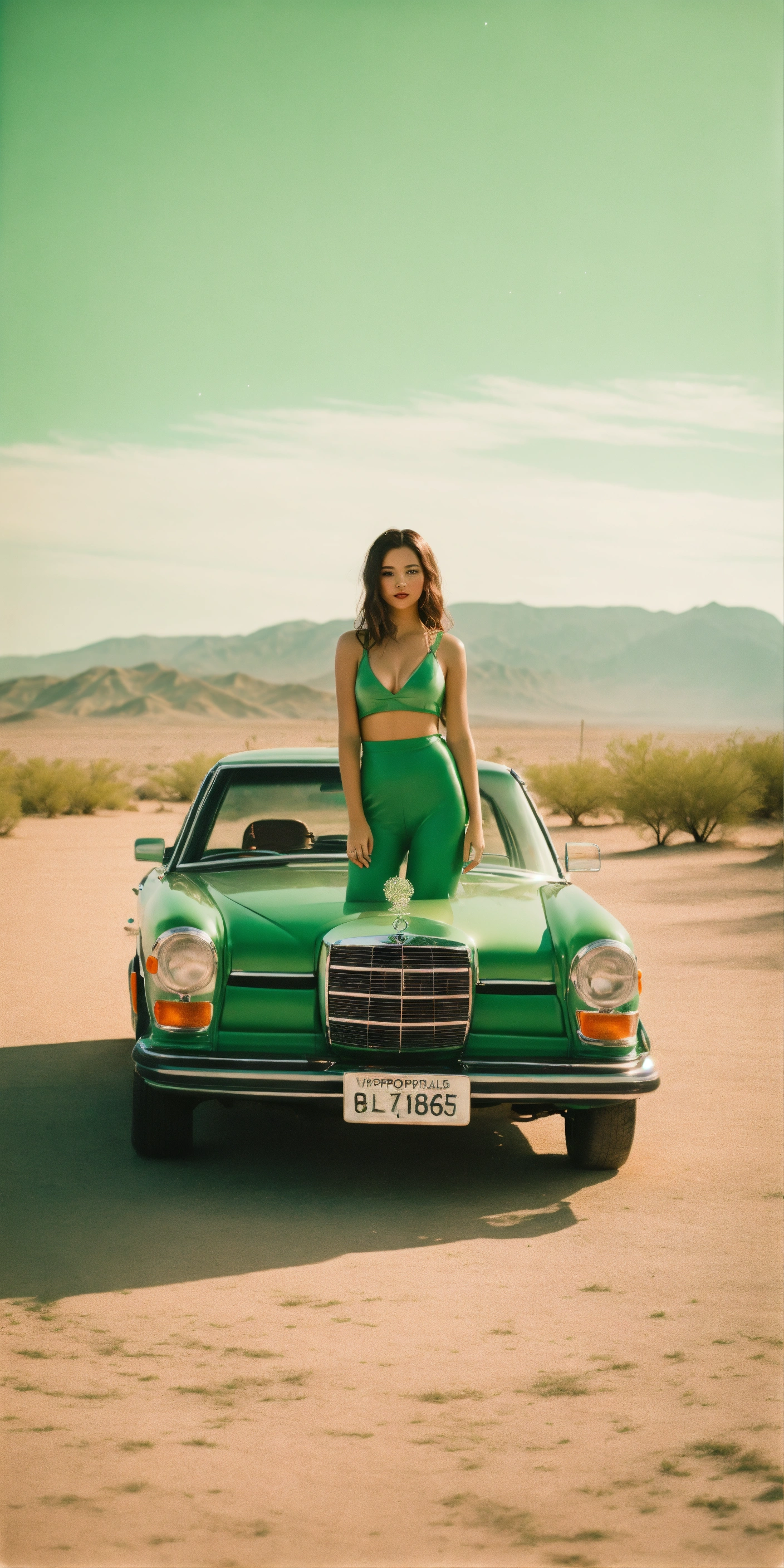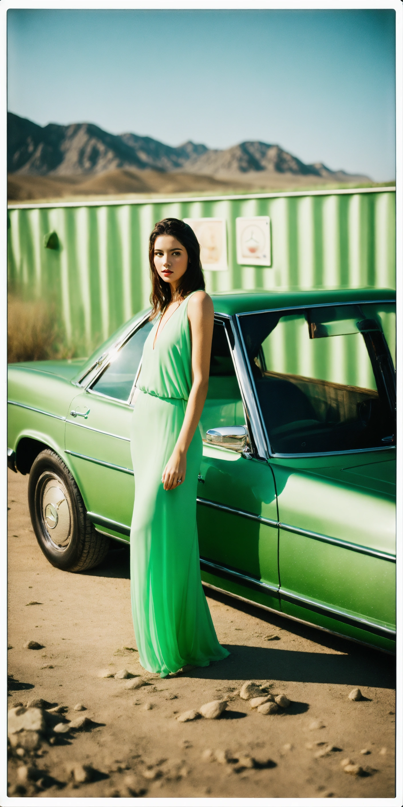 A hyper-realistic polaroid photo of a super cute aphrodite standing in front of a vintage green mercedes, high-speed photography, crisp colors, barren desert, cinematic lighting