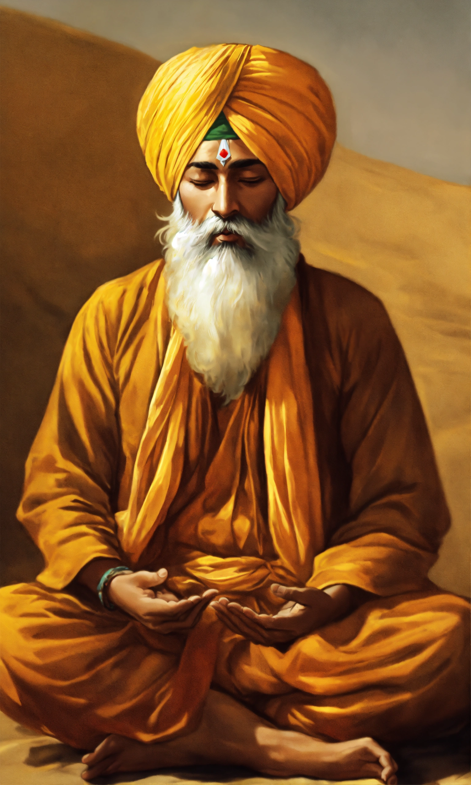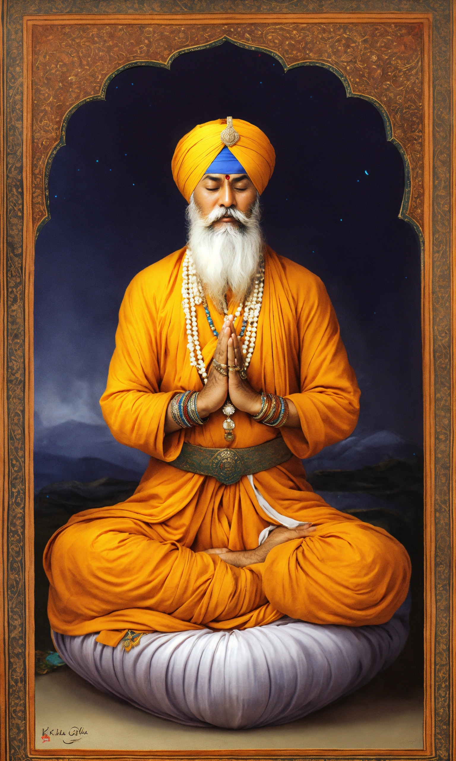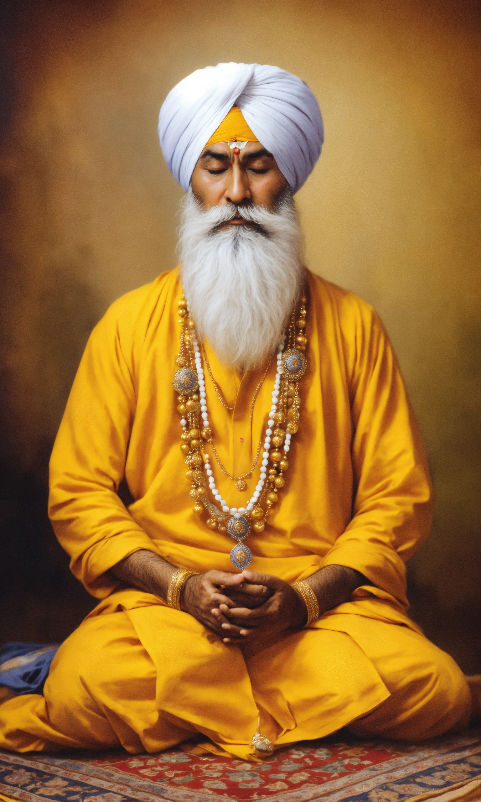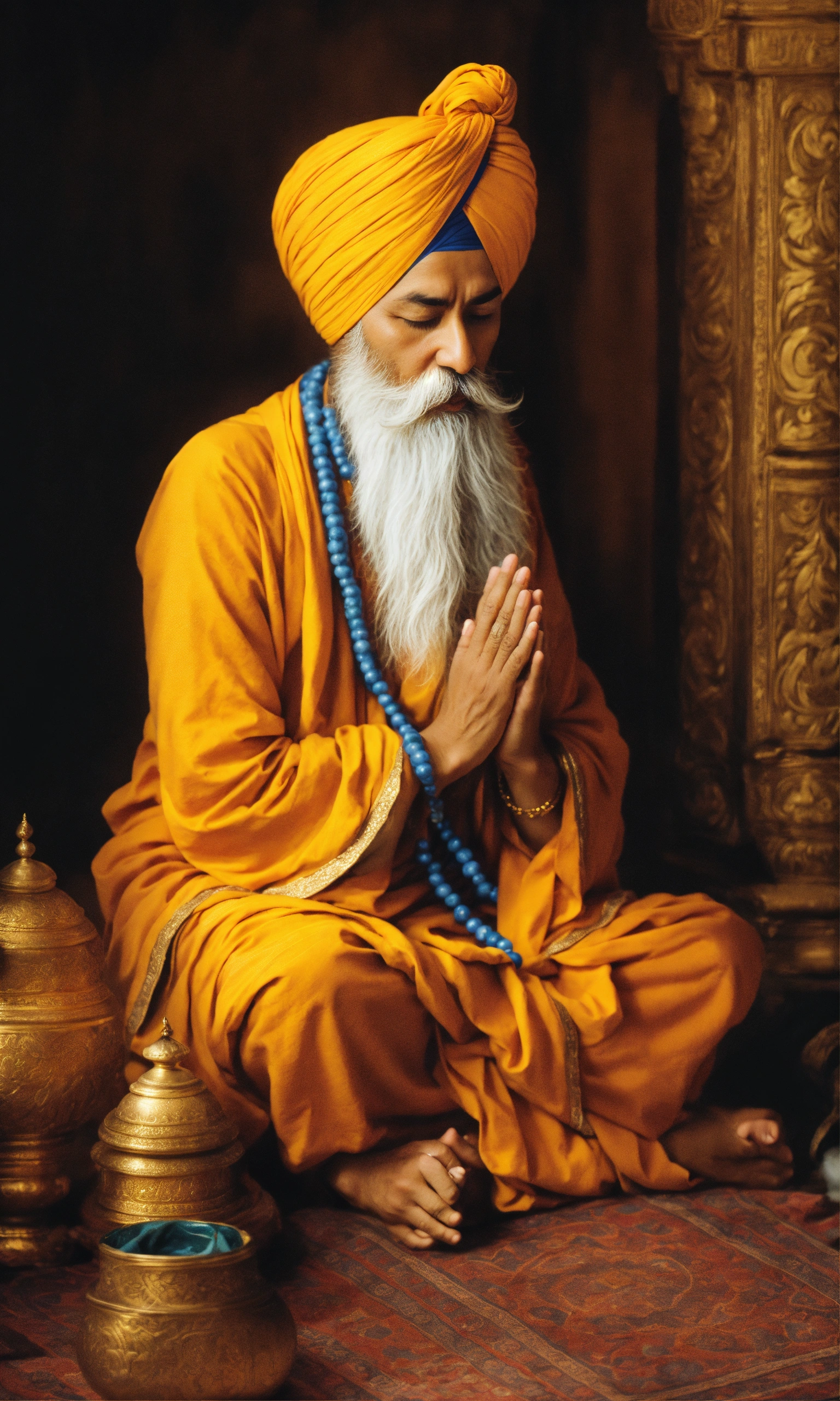 Gur sikh, khalsa, not wearing any ornaments- no ornaments, without -decoration, not wearing any thing on finger, not wearing any thing on wrist, not wearing any thing on finger, wrist, forehead, wrist, turbaned sikh guru praying, folded hands, closed eyes