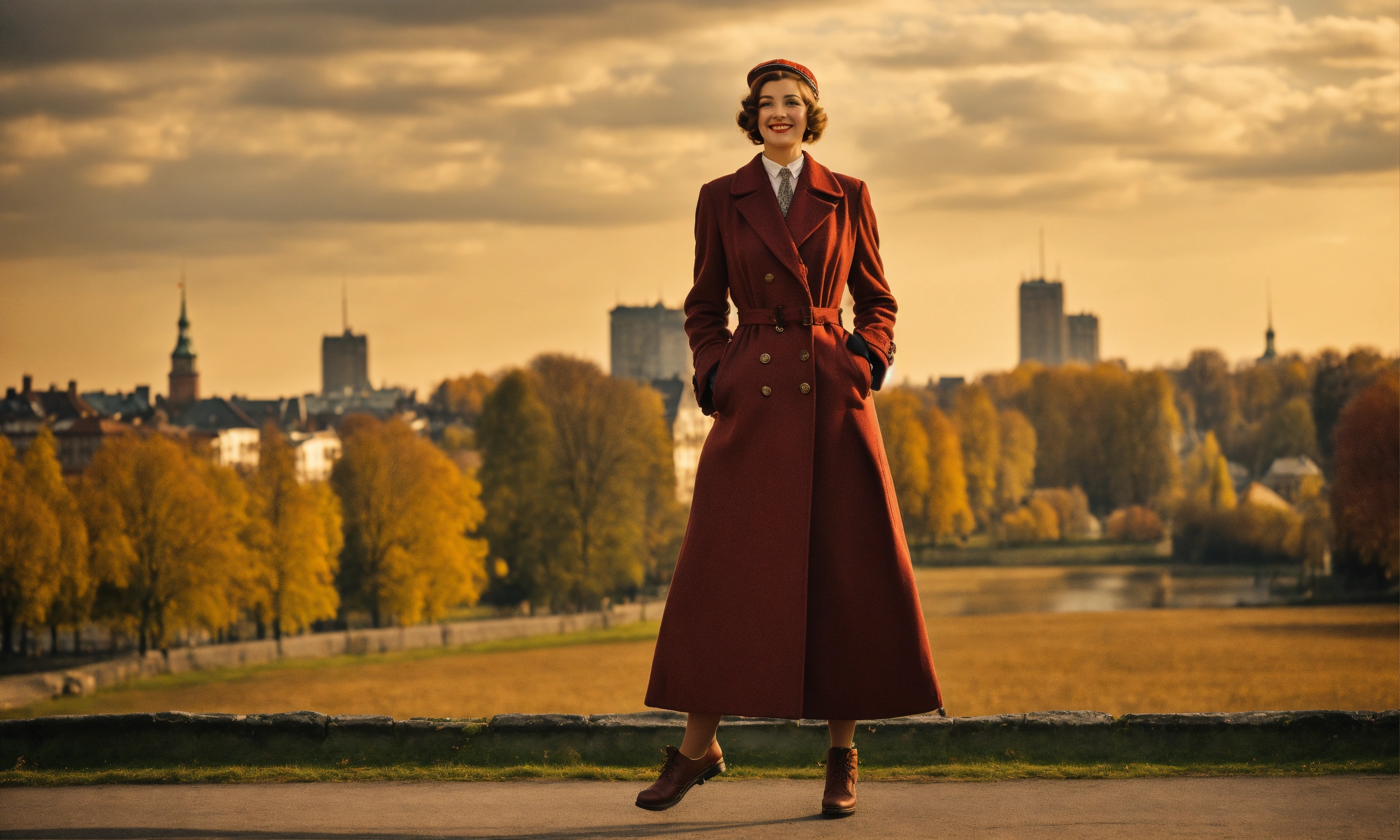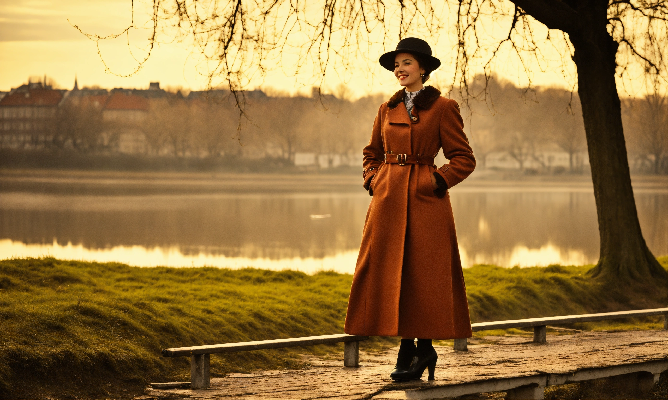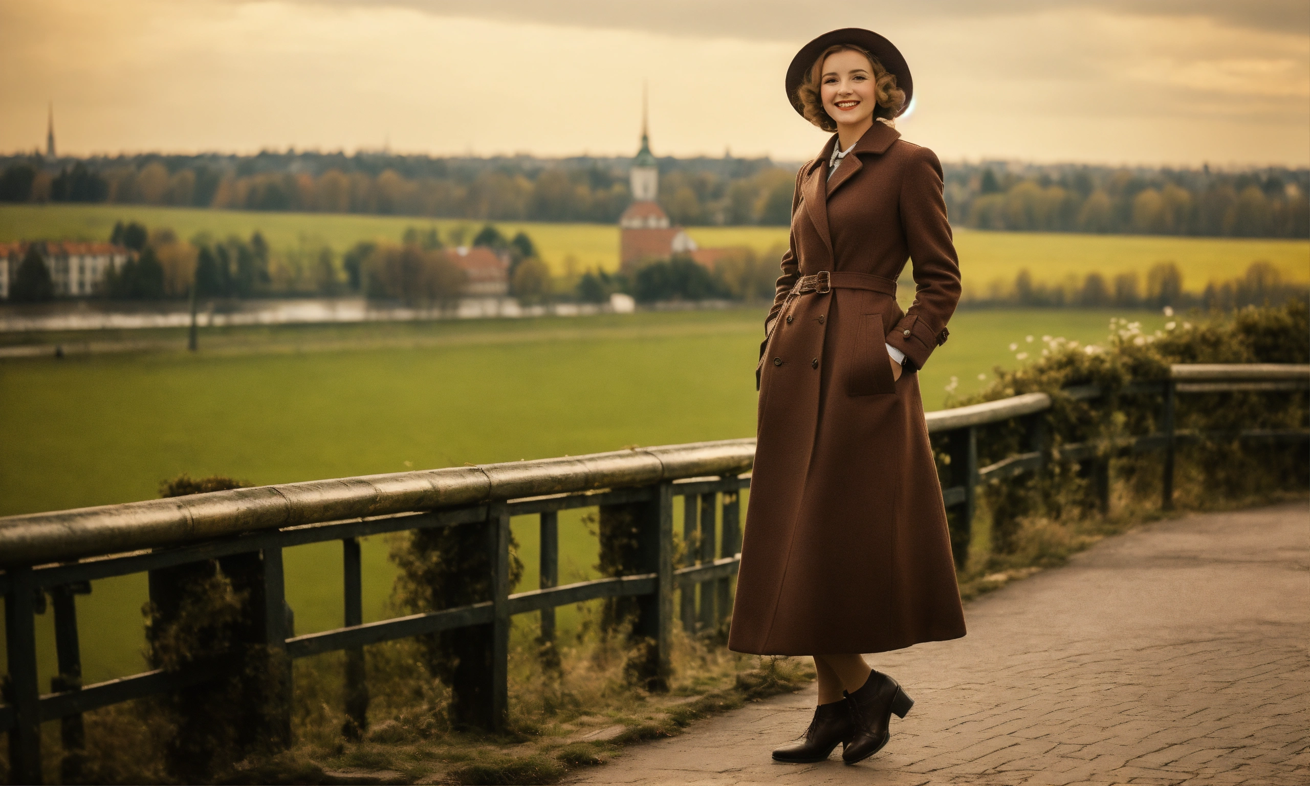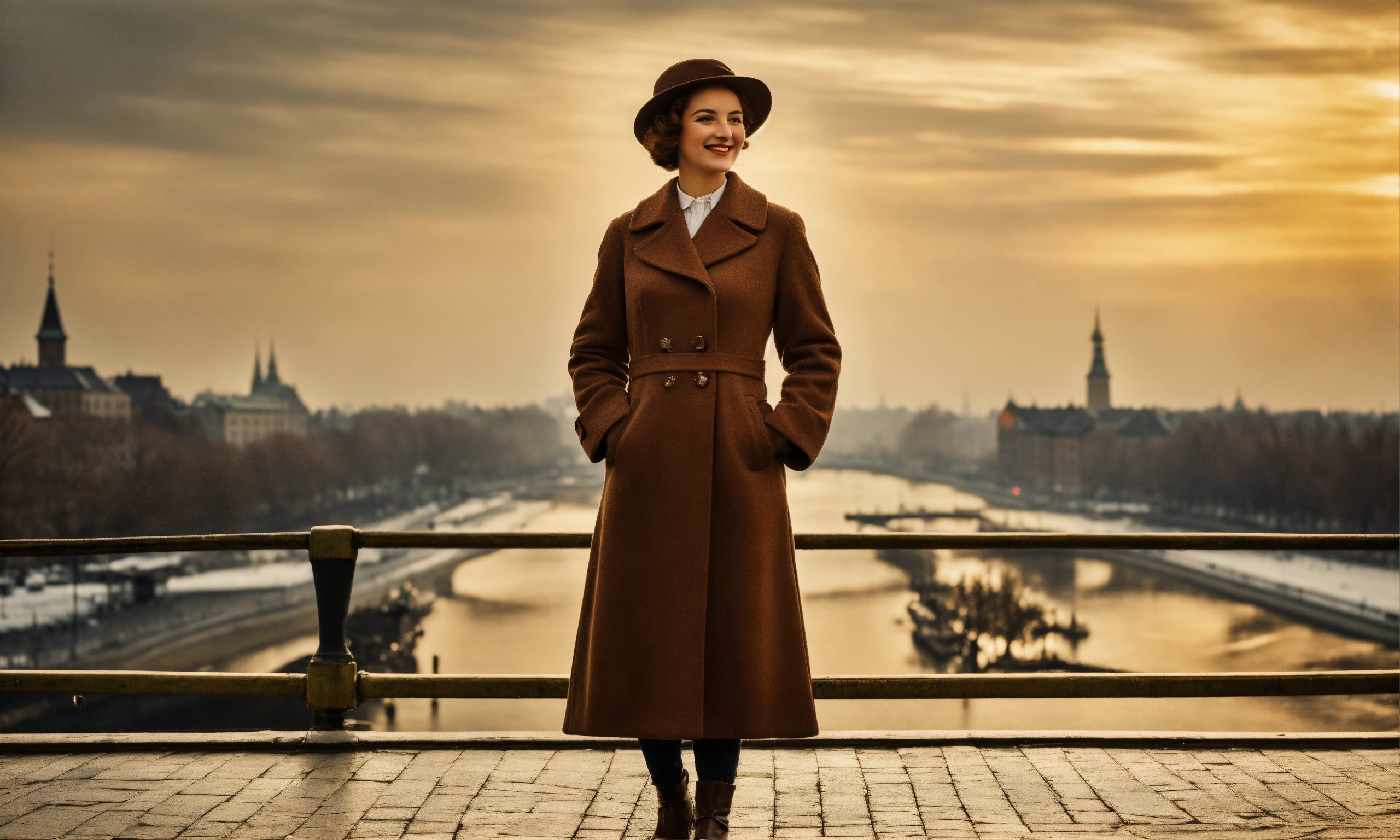 Full height woman, retro warszawa 1920-1930, woman, on top of a rievier, looks at the camera at full height, retro style, .focus in face. with small beard. retro style clothing long coat. smiling