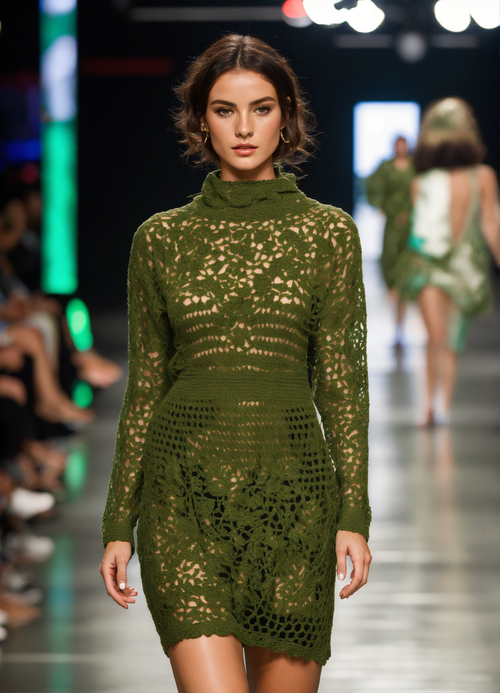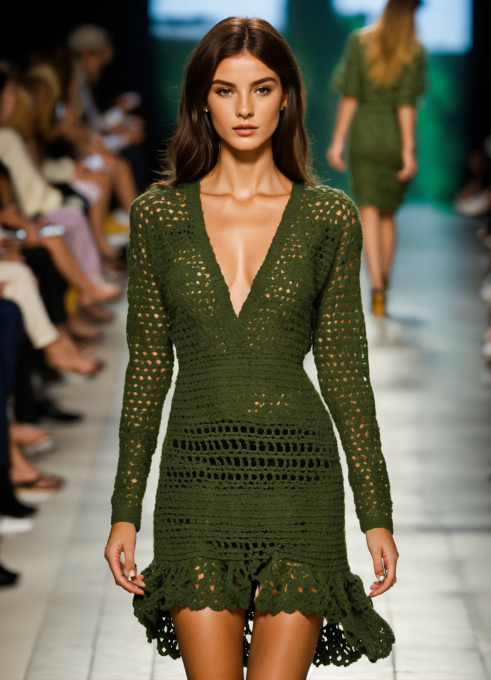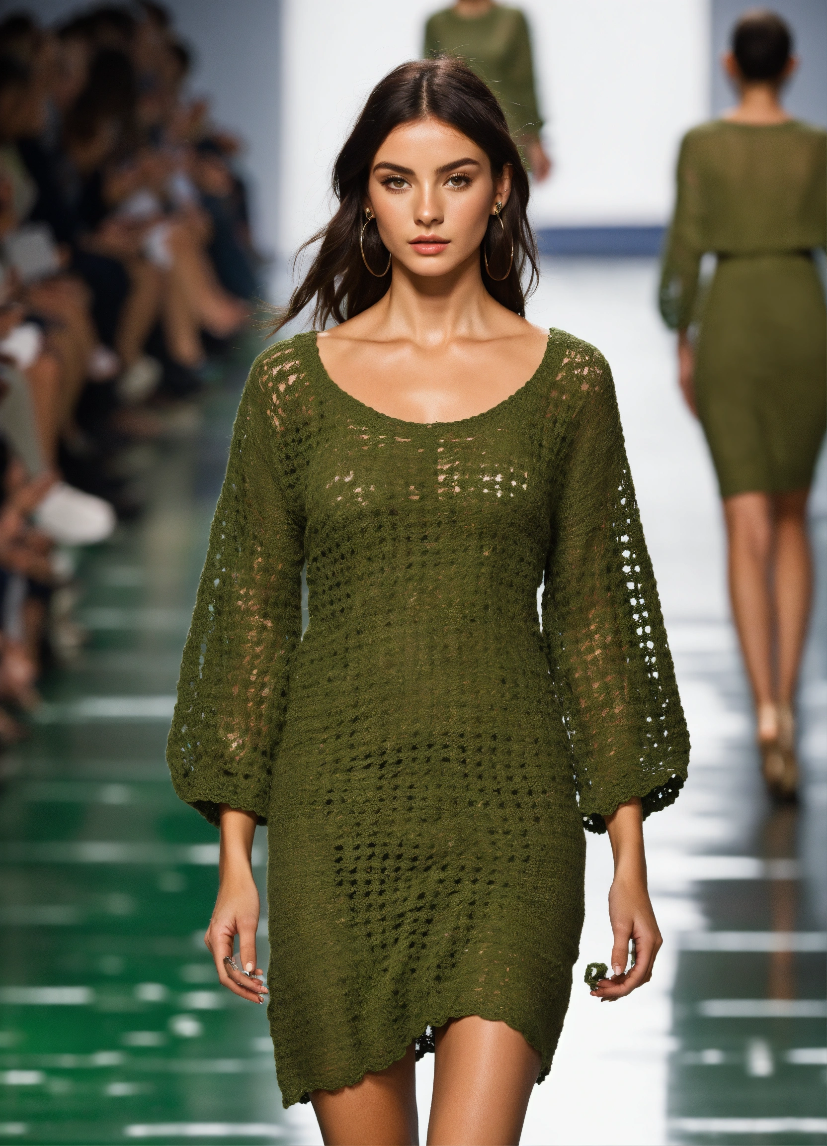 Ultra realistic full body photo of petite italian female model modeling cute army green crochet knee length dress with dolman sleeve outfit walking runway